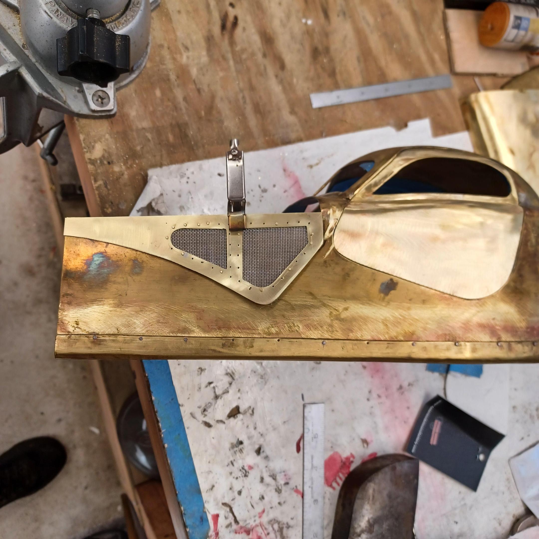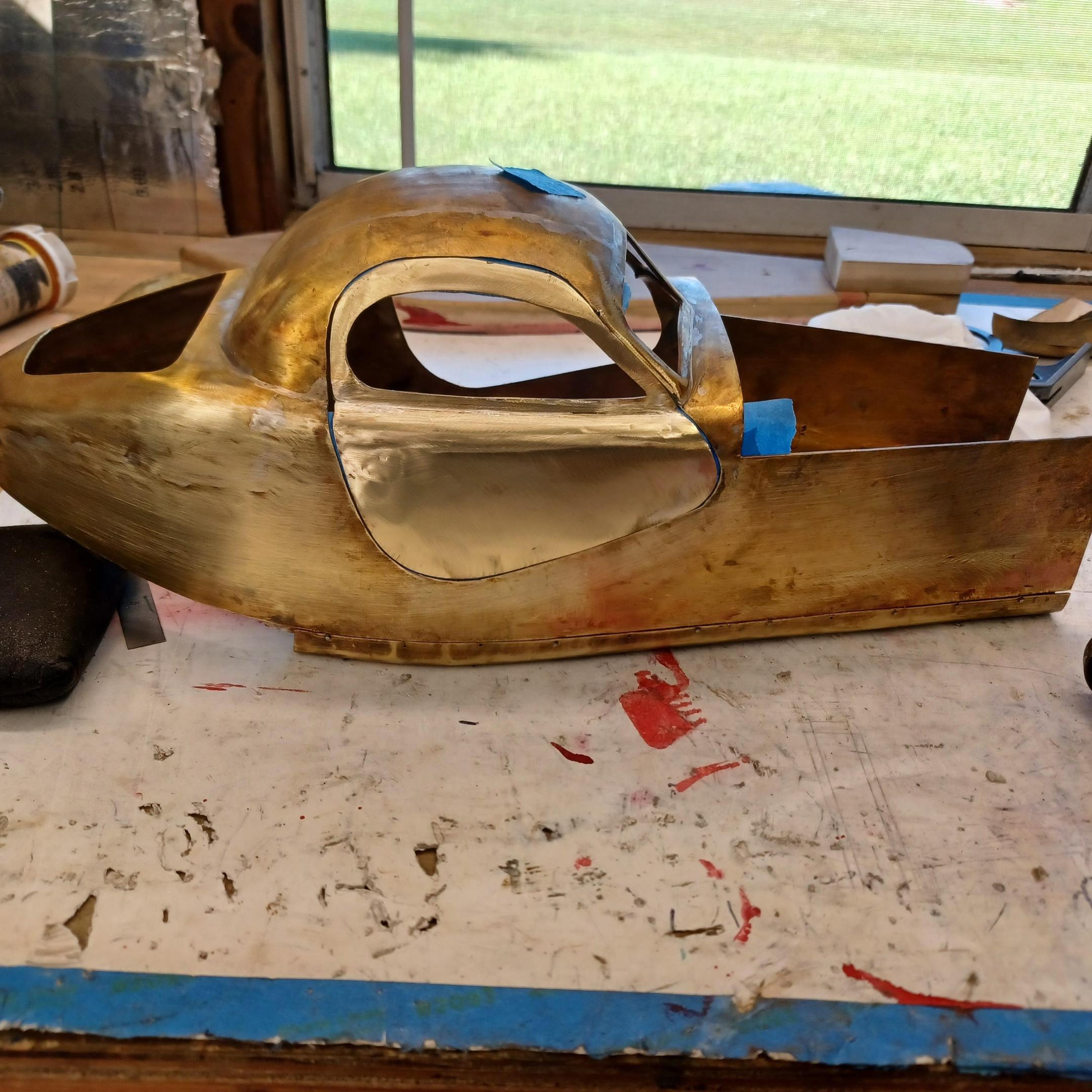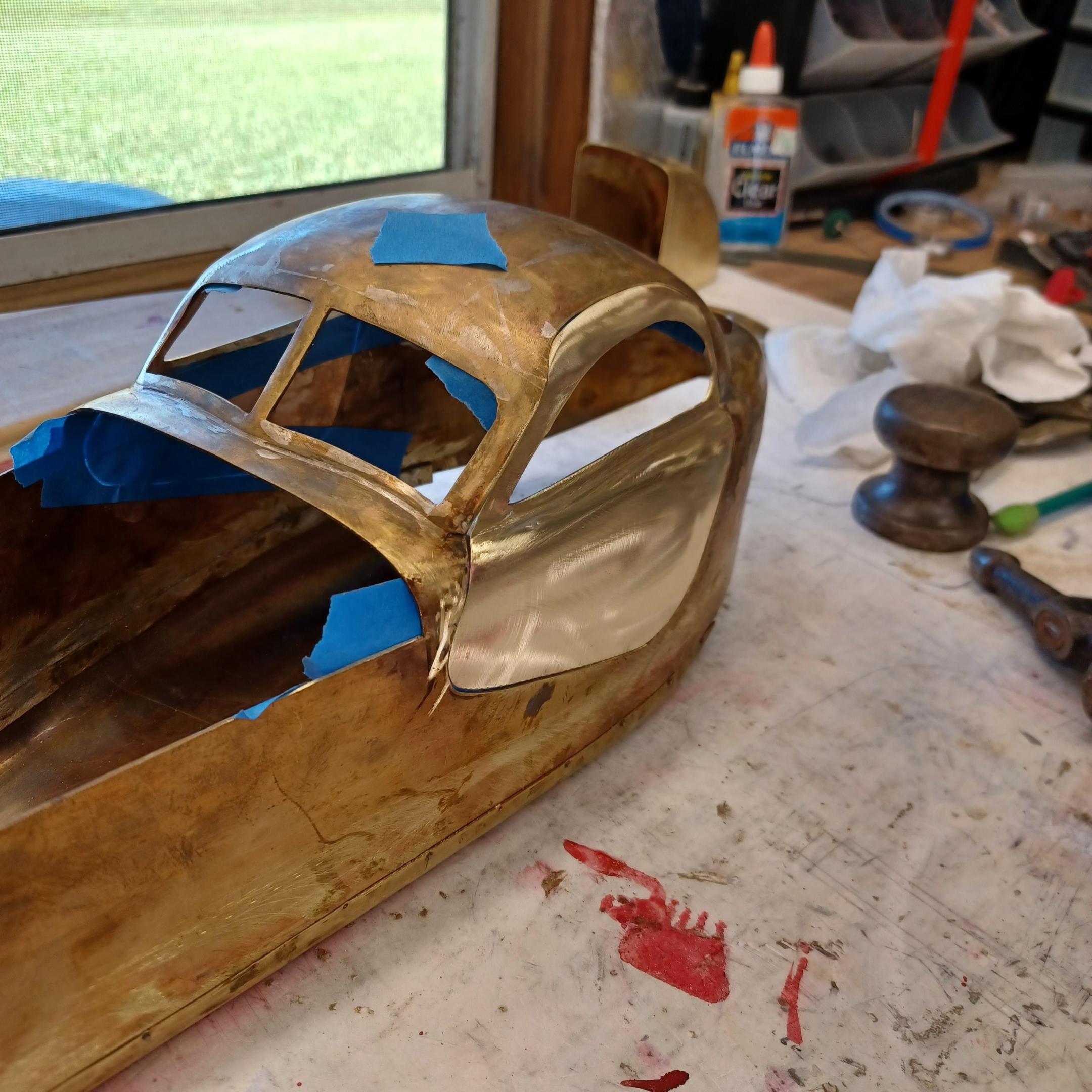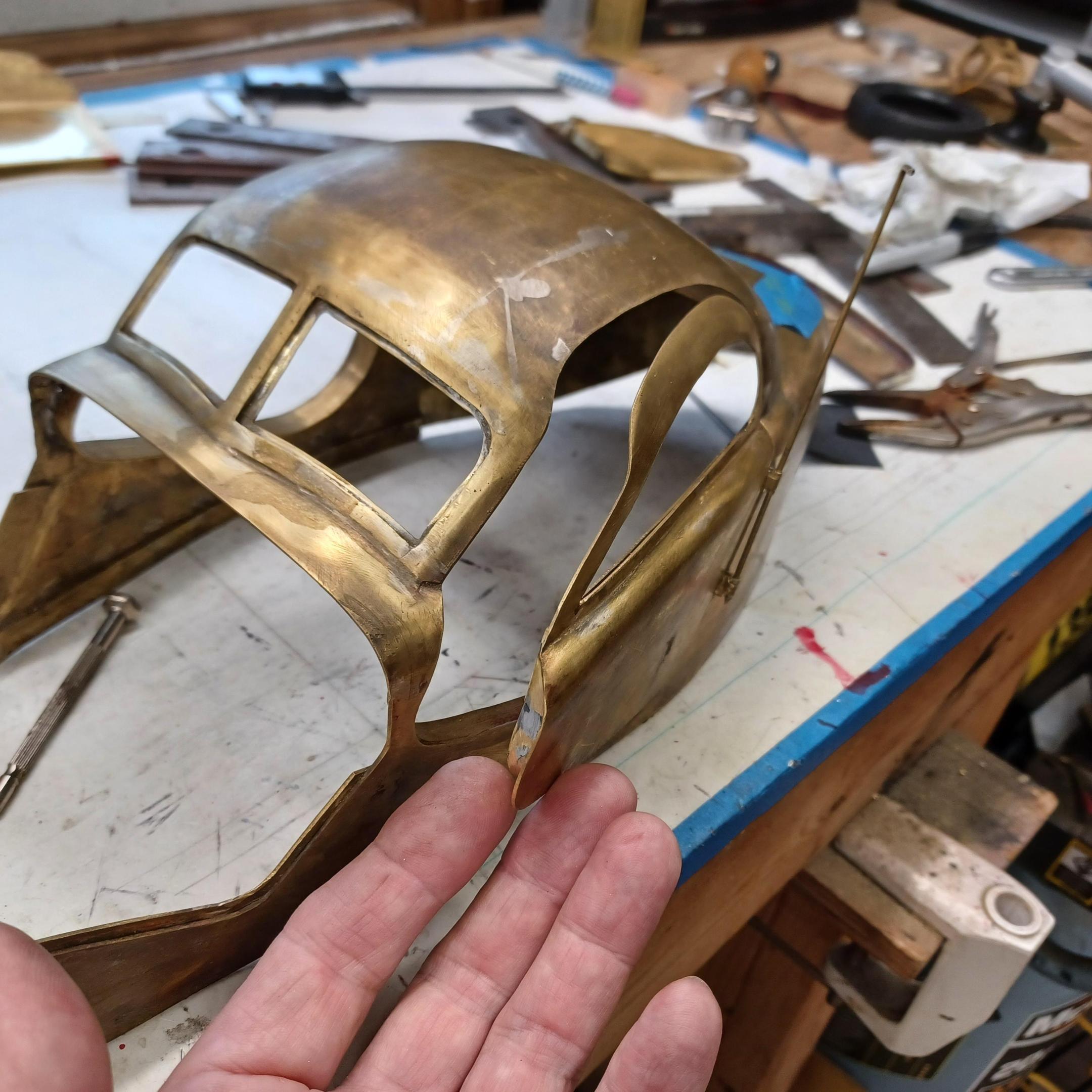 hi everybody, nice to hear from all of you. thanks you for all the comments. the english wheel seems to be working well but the aluminum wheels are not going to last very long. i will have to make steel ones. the upper wheel my friend carl recommended using a bearing of the correct size in place of the wheel. i have made some progress on the main part of the body. alot of silver soldering, filing and sanding. iam going to cut the rear window and solder the roof on. i think the doors ,hinges and latches will take forever. have not made a final decision on how i will do that. I'll come up with something. pictures of the hammerform for the belly pan. got the doors cut and hood sides marked out . i will spend the next few days finishing the roof and windshield frame. hi francis very happy to hear from you. it must be getting cold in Canada. -