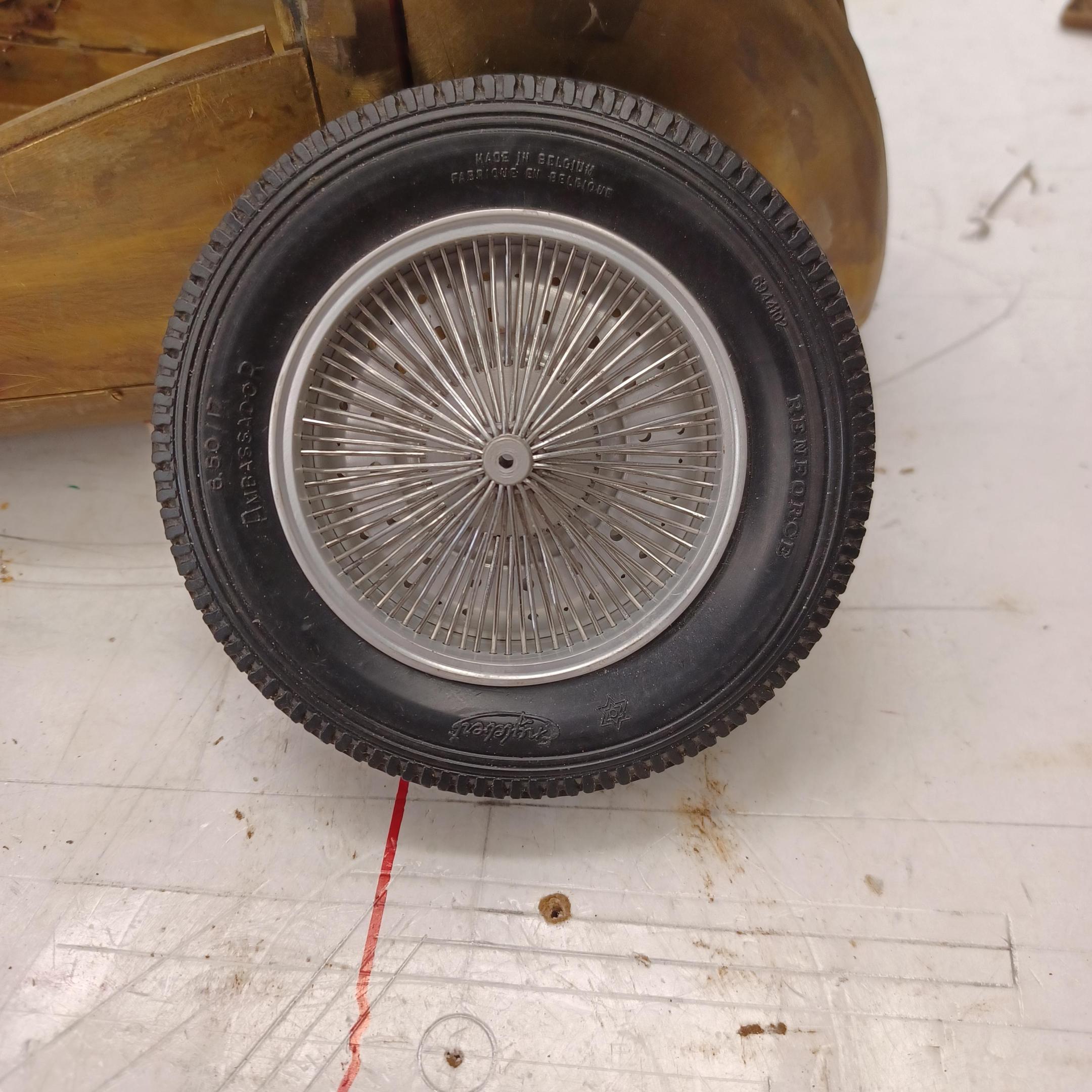 hi francis and randy, still working on fenders . will start on the forth one tomorrow. it takes a few days. i think the tire size is perfect the wheels fit the style of the car well. i am trying to get as close to the pictures as i can. thinking about colors now. got to decide on the engine and transmission and what the front suspension will be. i need the engine and transmission to build the firewall. more pictures when i finish the other fender -