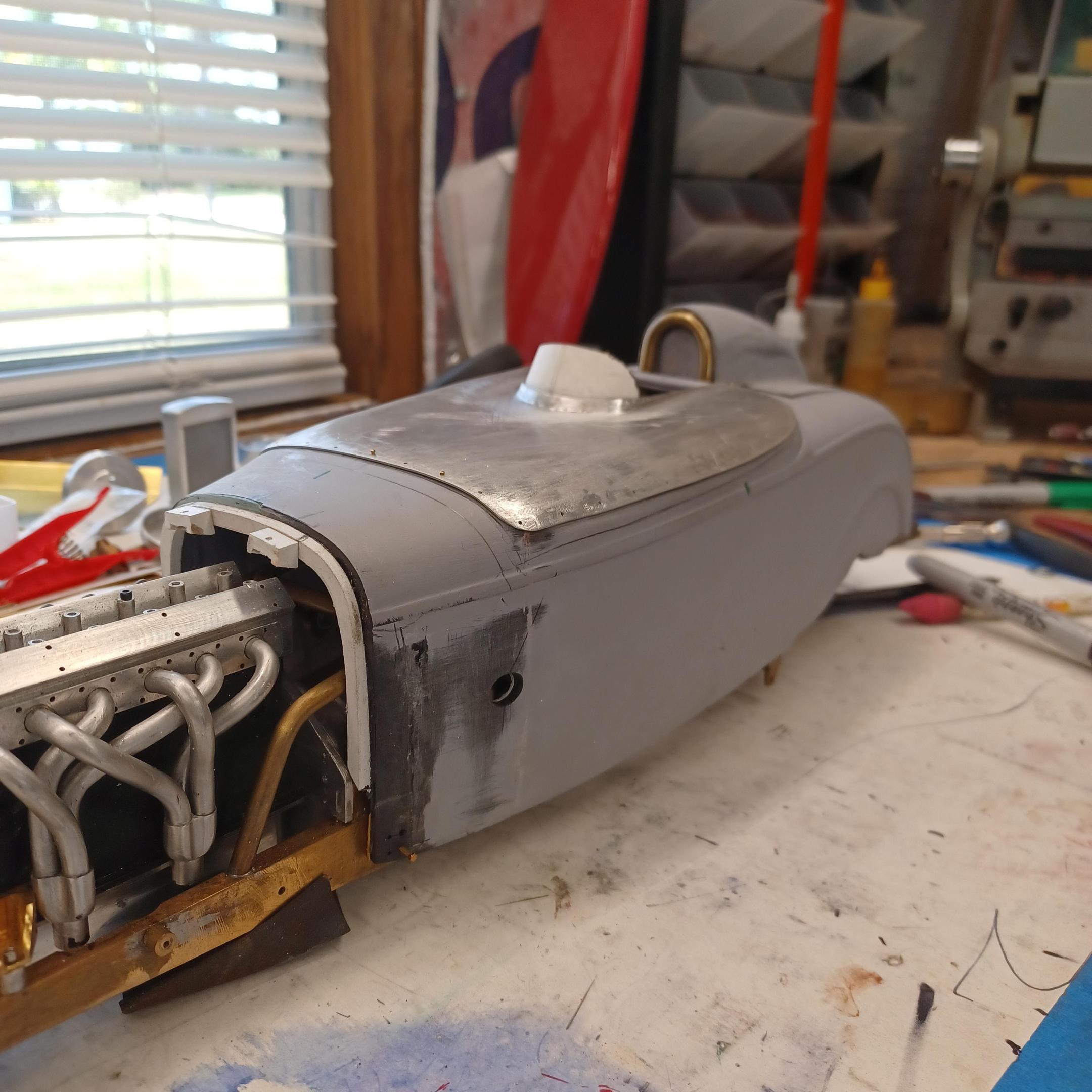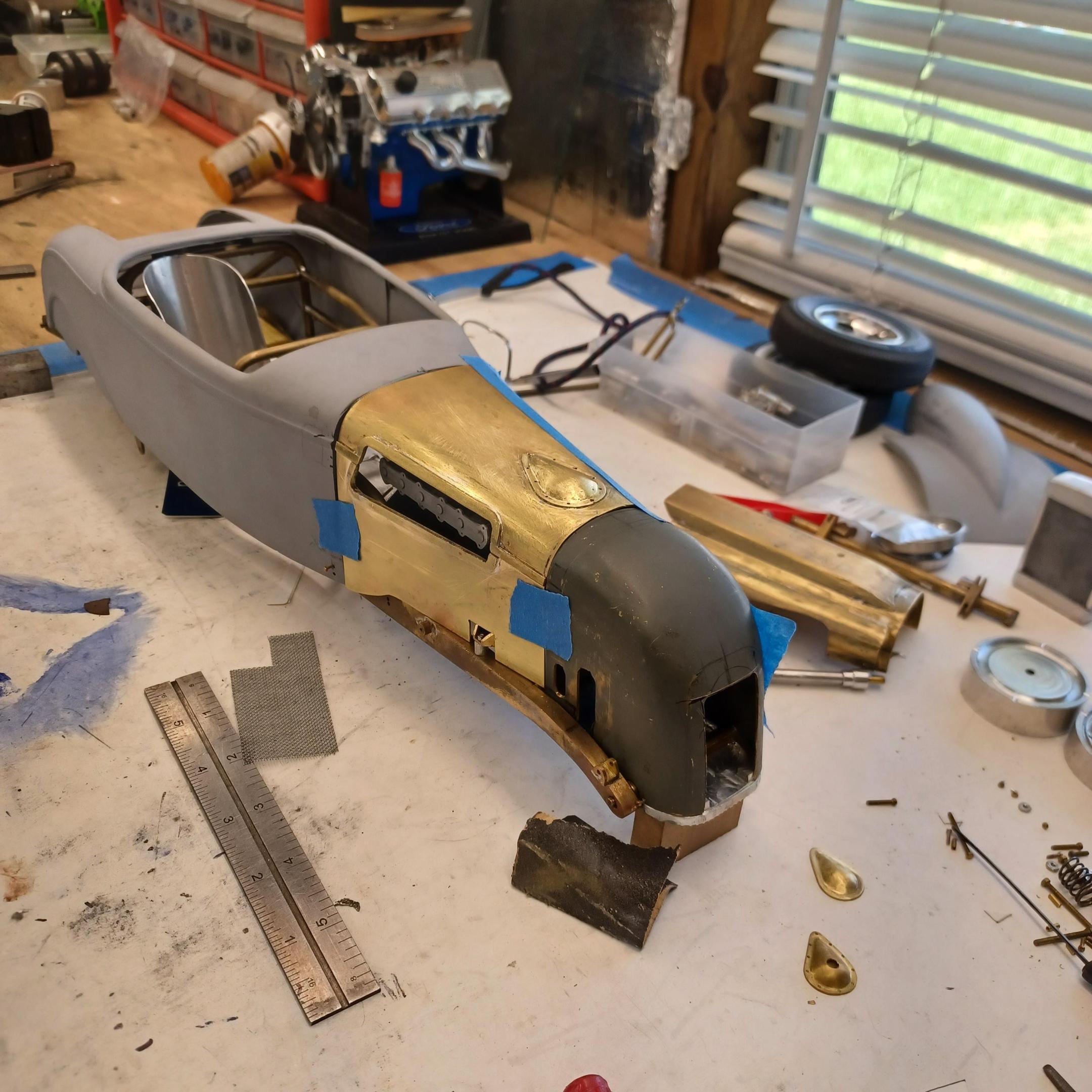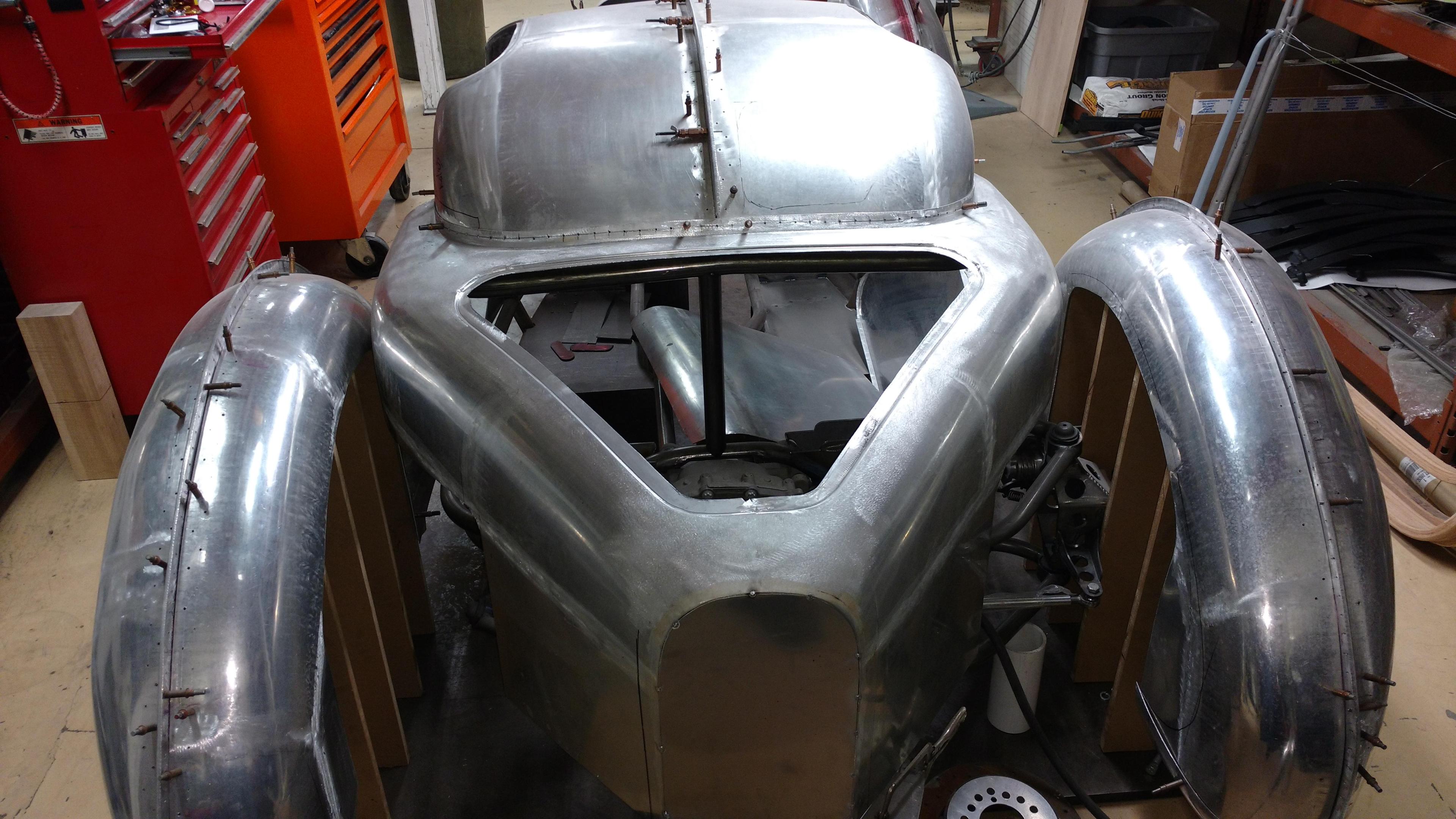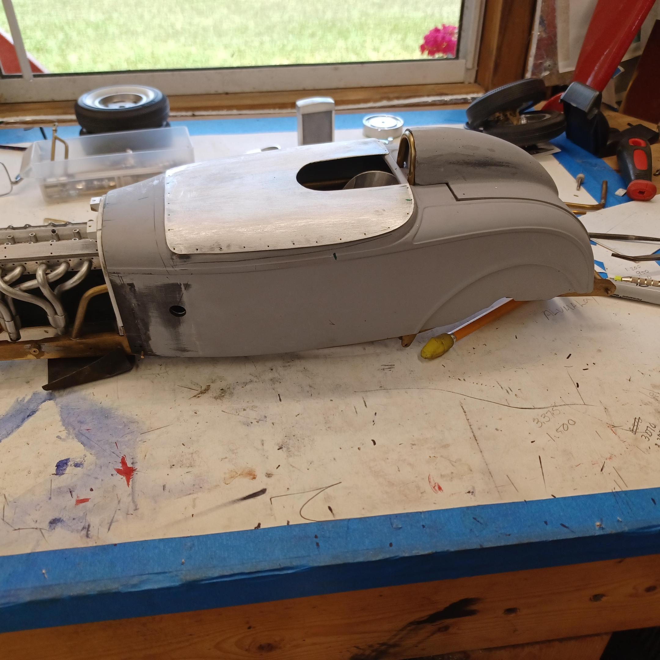 andrew they changed the date and location for the nnl show,but you probably know. thank you claude and donato for looking and your comments. continued assembly. got almost all the wiring done,finished the radiator hoses. put the entire body on mostly to make sure it all fit right. i found a major problem with hood. i am in the process of fixing that,it will take awhile. fuel lines and fuel filter are in. clutch line and reservoir are on. i haven't finished sanding and polishing the main body maybe tomorrow or sat. getting close but the hood will hold me up for a few weeks. then the english wheel,still drawing and thinking.thank you all -