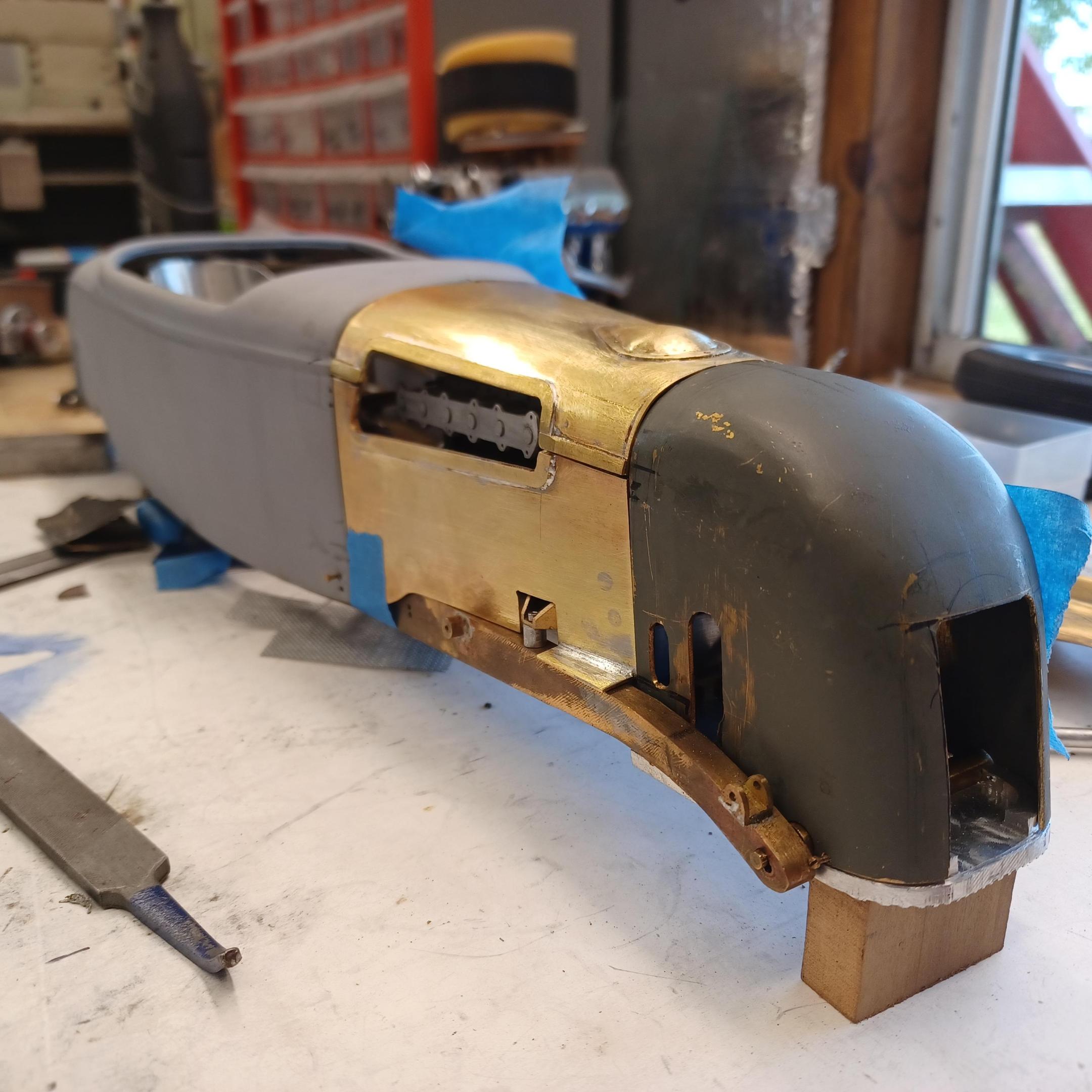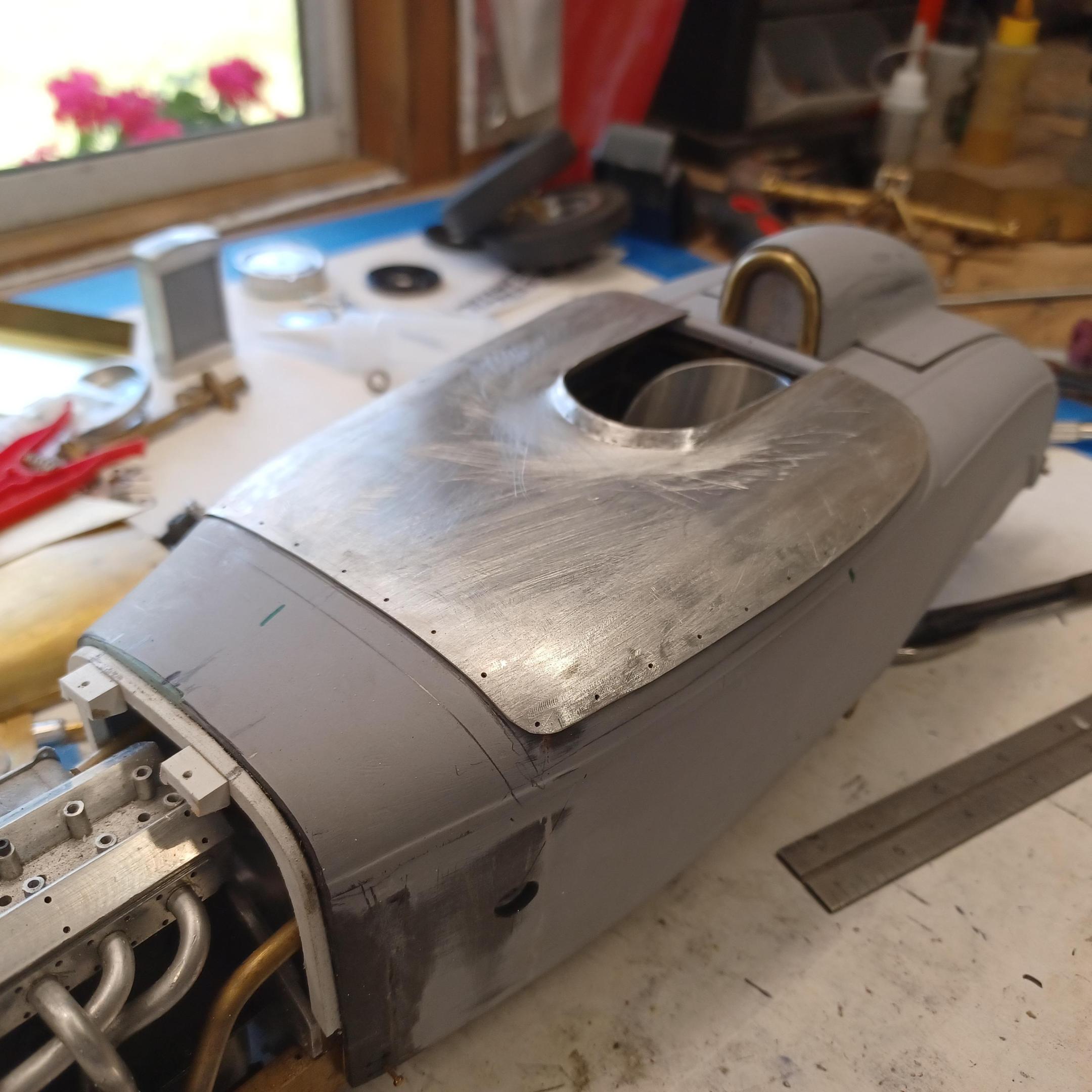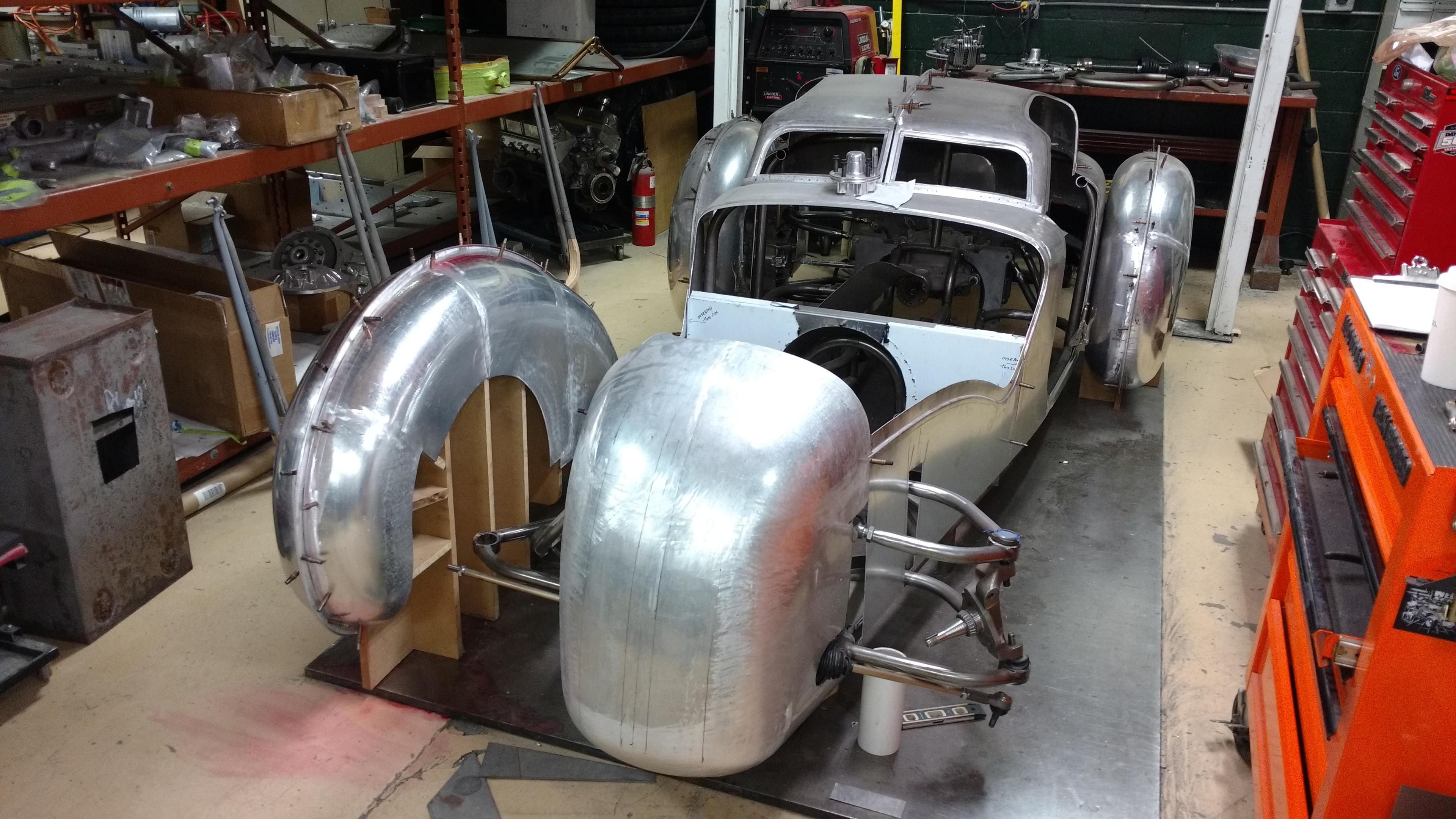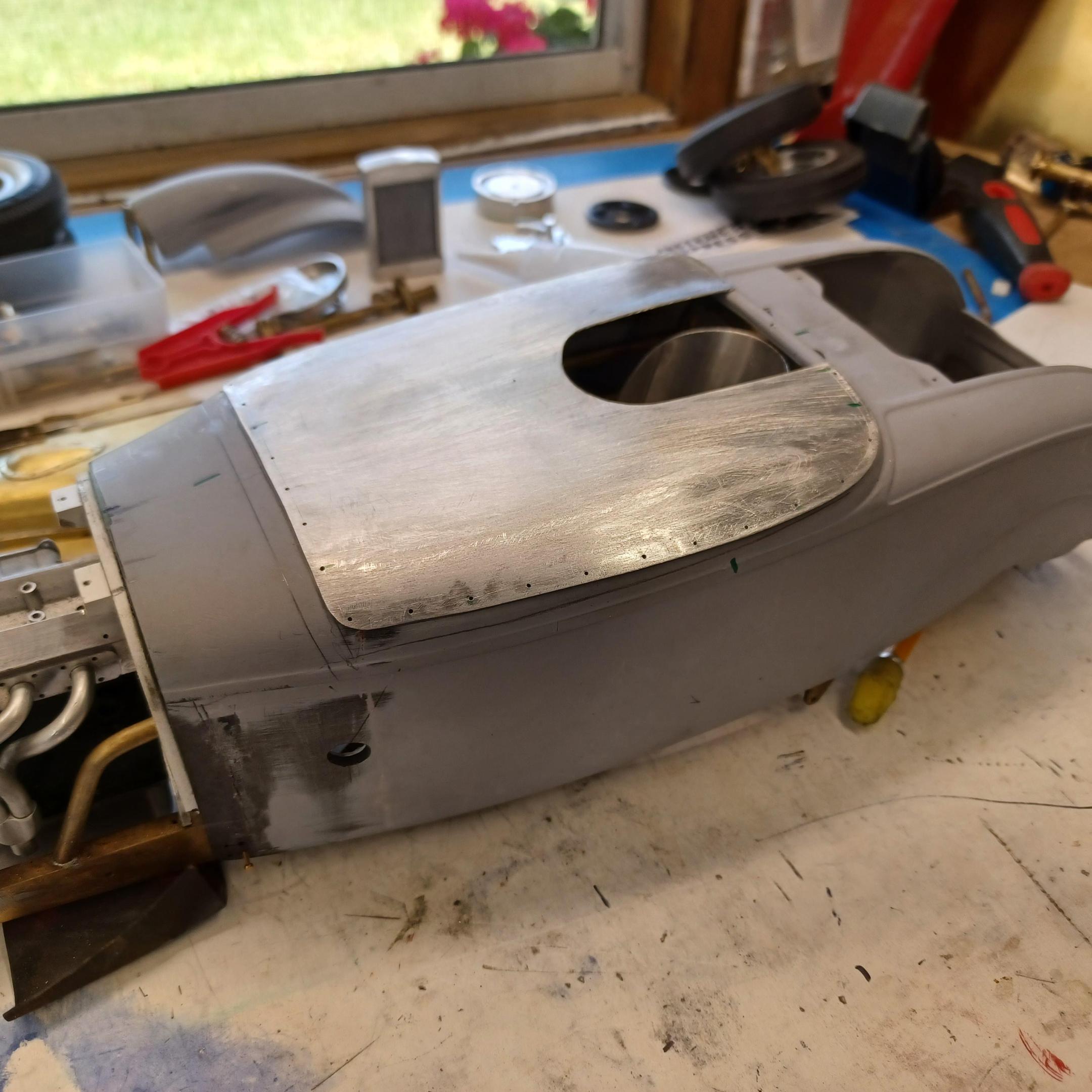 andrew they changed the date and location for the nnl show,but you probably know. thank you claude and donato for looking and your comments. continued assembly. got almost all the wiring done,finished the radiator hoses. put the entire body on mostly to make sure it all fit right. i found a major problem with hood. i am in the process of fixing that,it will take awhile. fuel lines and fuel filter are in. clutch line and reservoir are on. i haven't finished sanding and polishing the main body maybe tomorrow or sat. getting close but the hood will hold me up for a few weeks. then the english wheel,still drawing and thinking.thank you all -