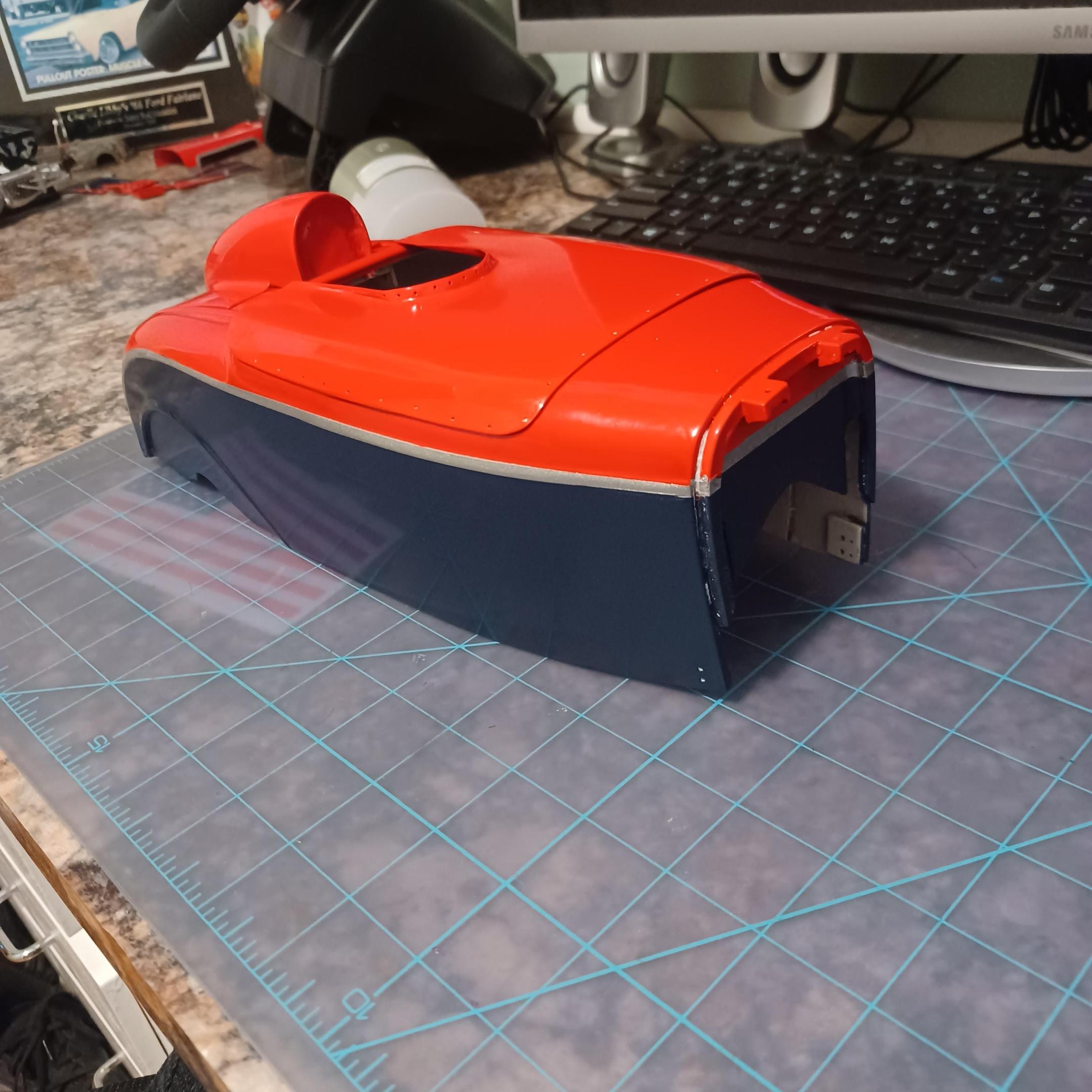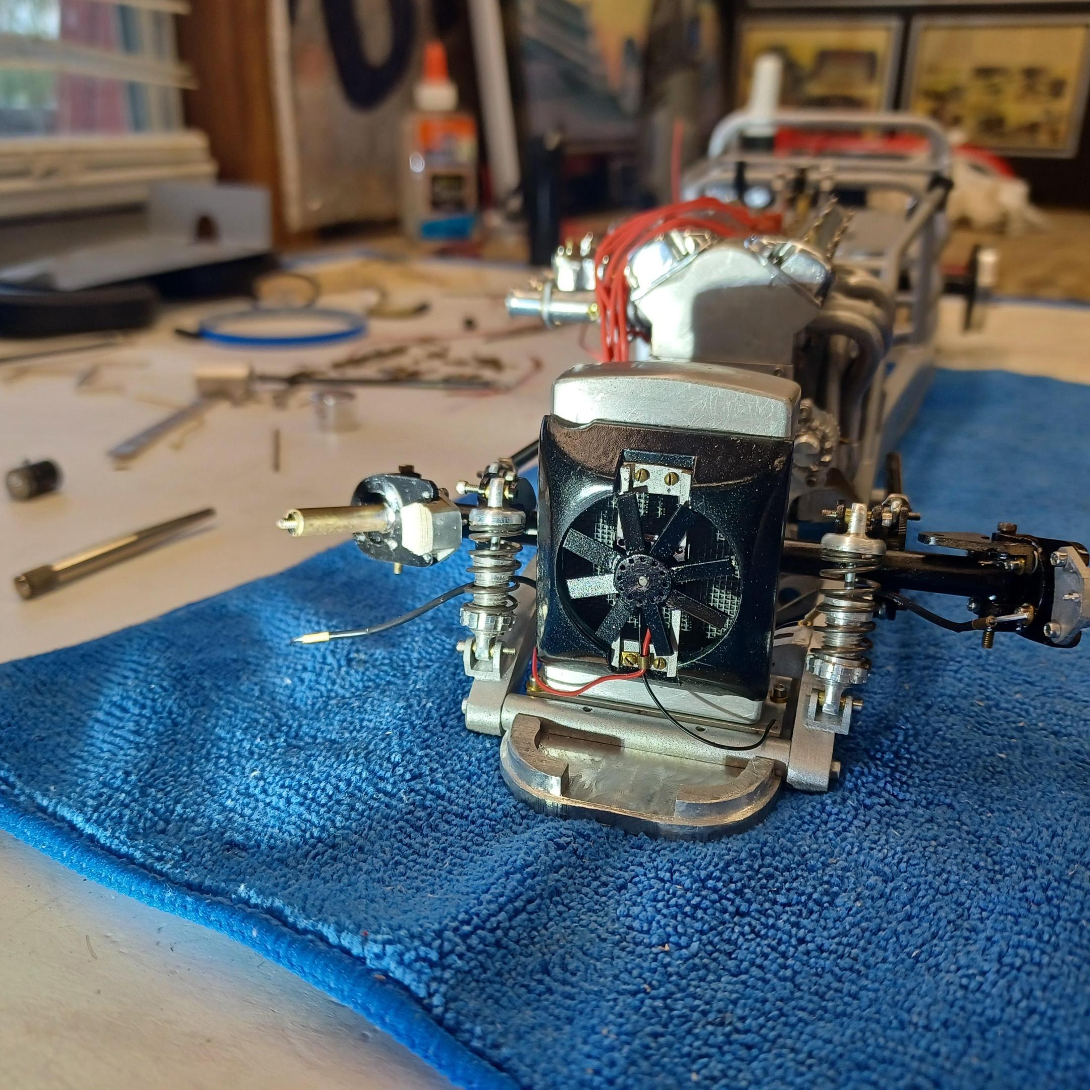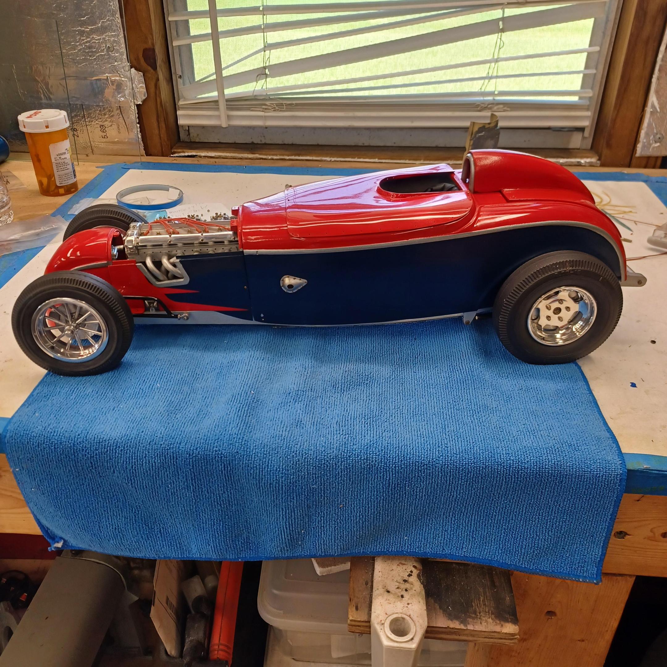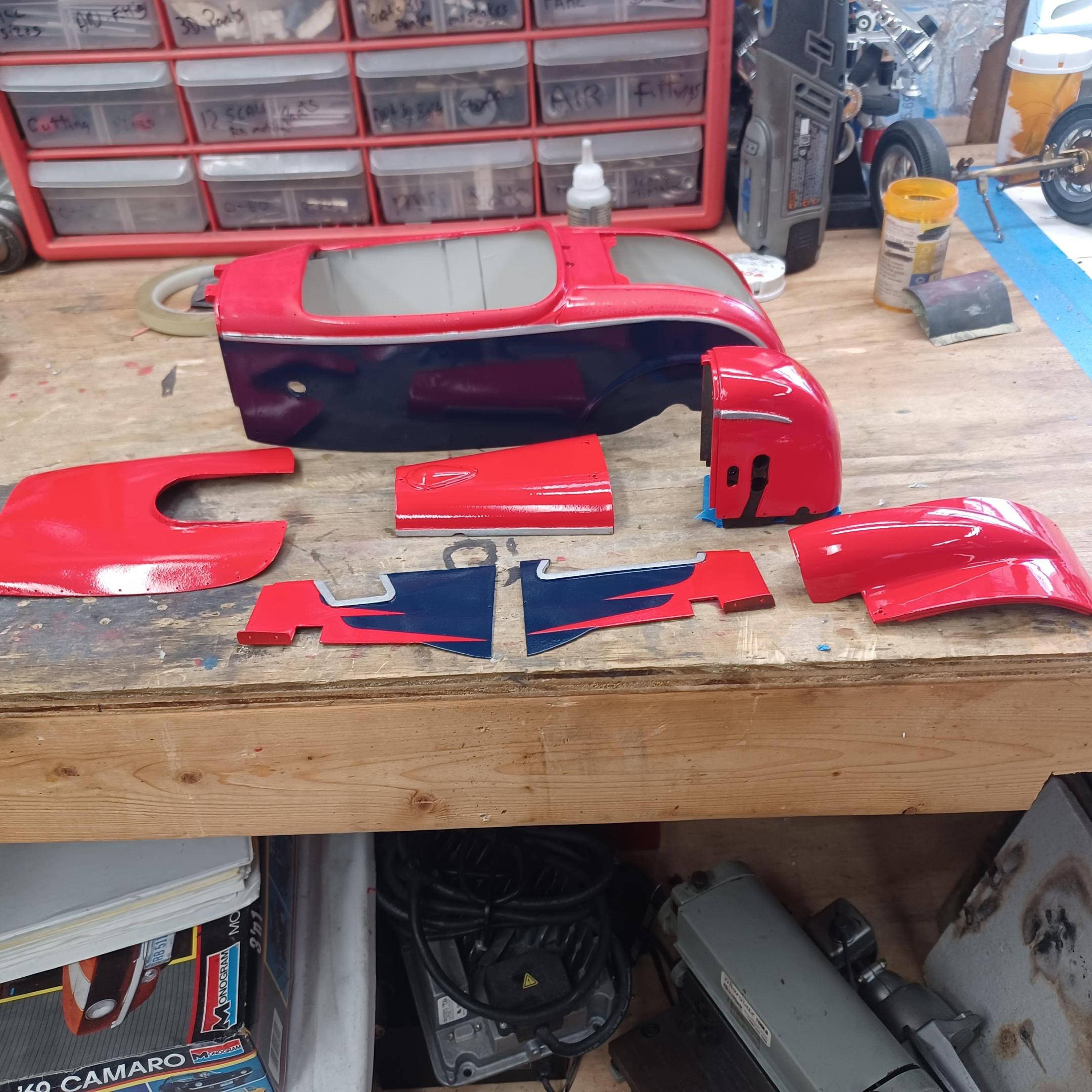 got a little behind on updates.working alot on the hydreds of details,also on the paint. the top above the body line is as you can see bright red,a silver stripe at the body line and dark navy blue below the line.i am waiting for the red to make sure the tape wont affect it.later this week will be 7 days,that should be enough. made the drive shaft and electric radiator fan and shroud. i think the red came out well,a little wet sanding after all the colors are on and 3 coats of clear. i have the carb linkage all most done thanks to RB motions hiem joints. thanks for looking and thank you for your nice comments. -