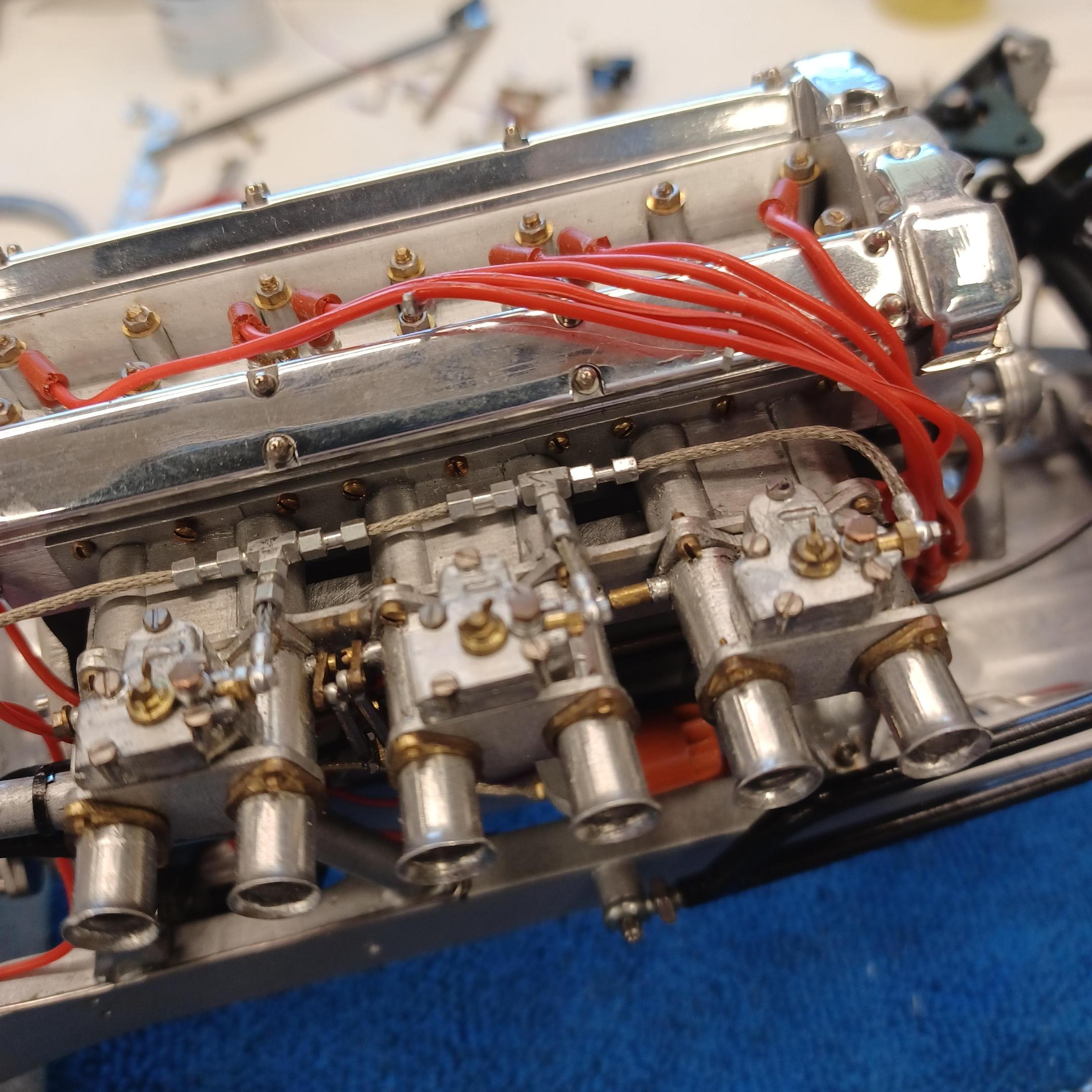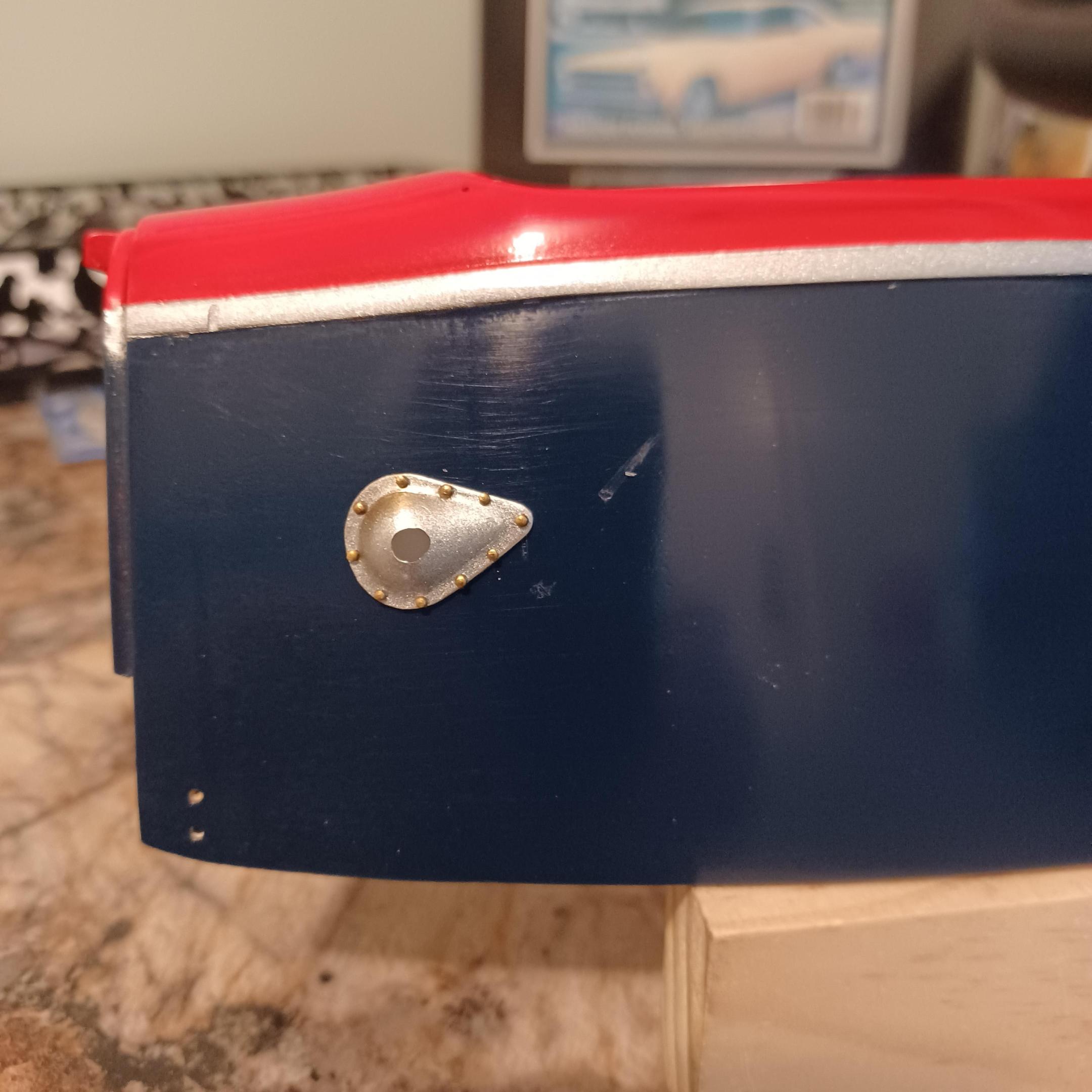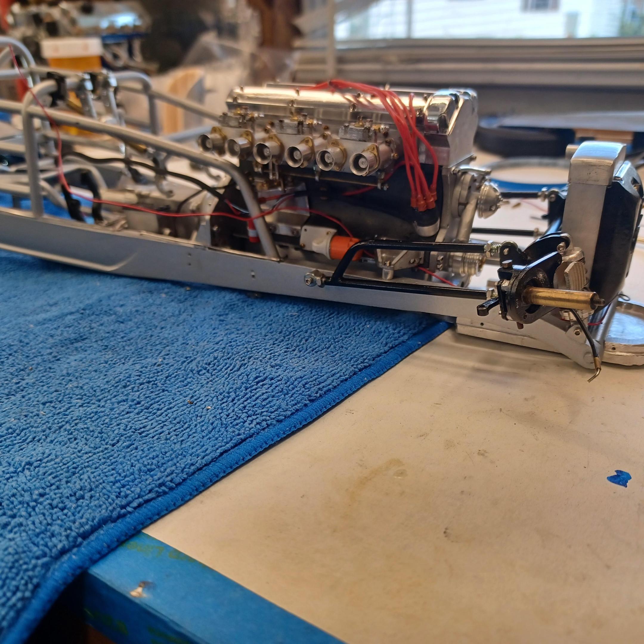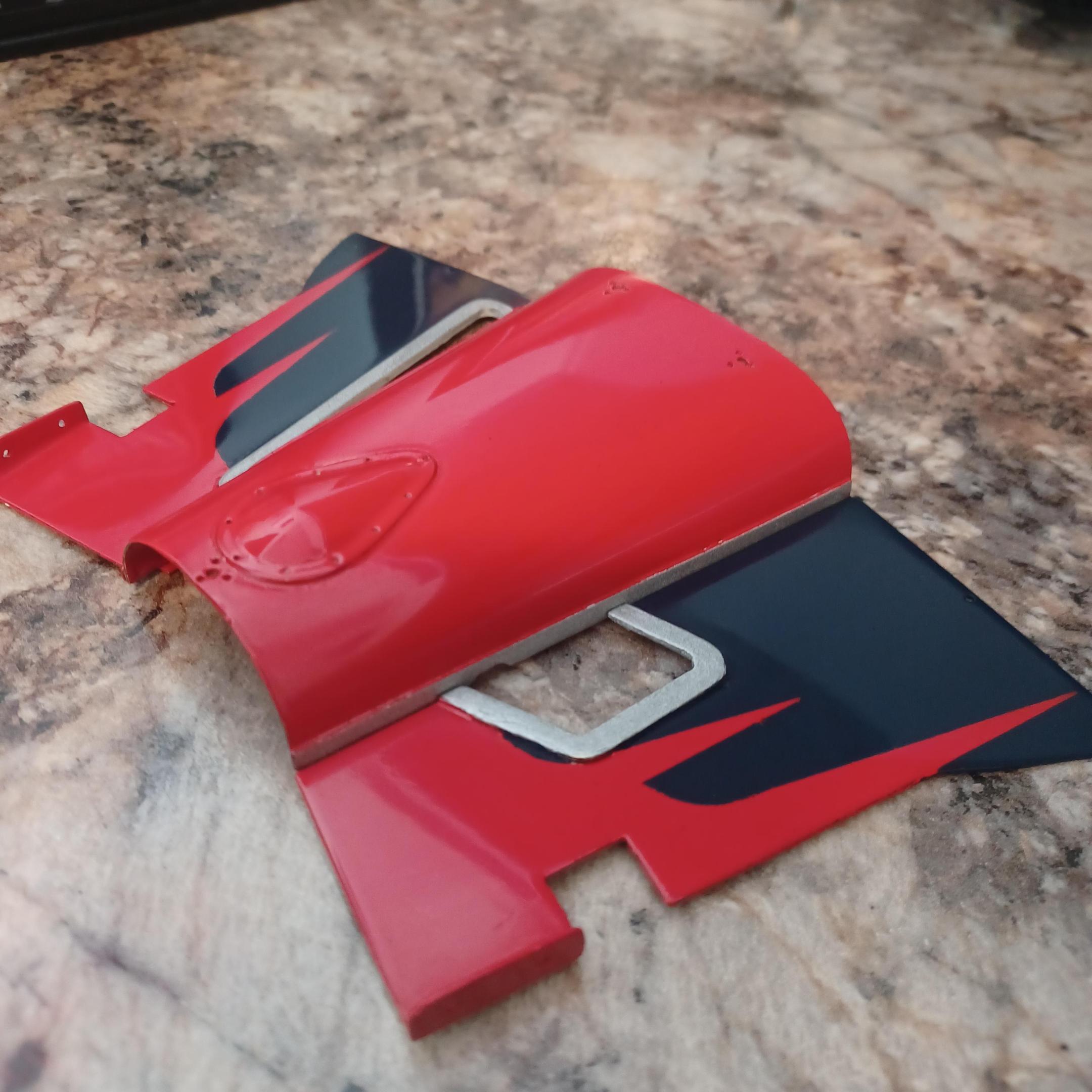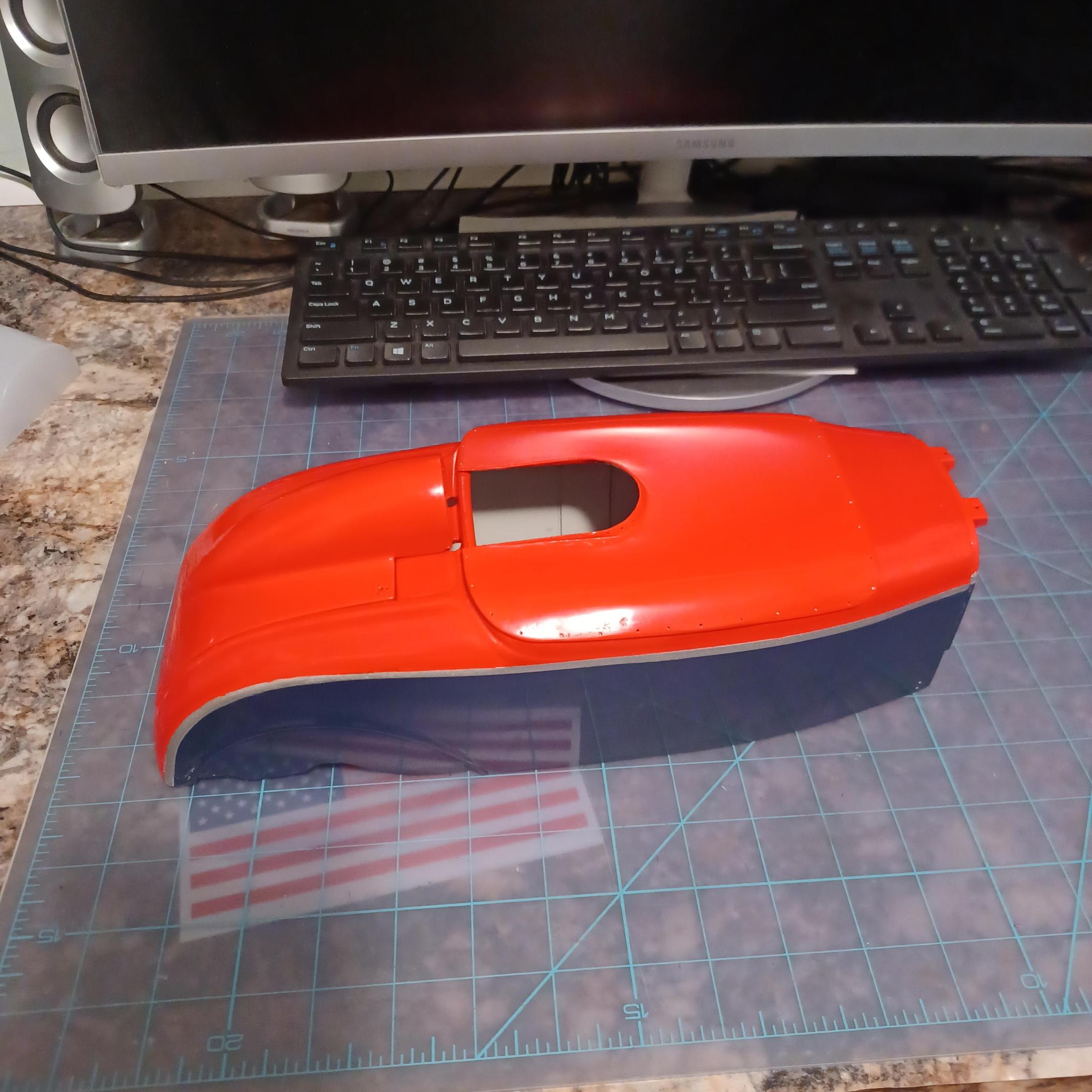 got a little behind on updates.working alot on the hydreds of details,also on the paint. the top above the body line is as you can see bright red,a silver stripe at the body line and dark navy blue below the line.i am waiting for the red to make sure the tape wont affect it.later this week will be 7 days,that should be enough. made the drive shaft and electric radiator fan and shroud. i think the red came out well,a little wet sanding after all the colors are on and 3 coats of clear. i have the carb linkage all most done thanks to RB motions hiem joints. thanks for looking and thank you for your nice comments. -