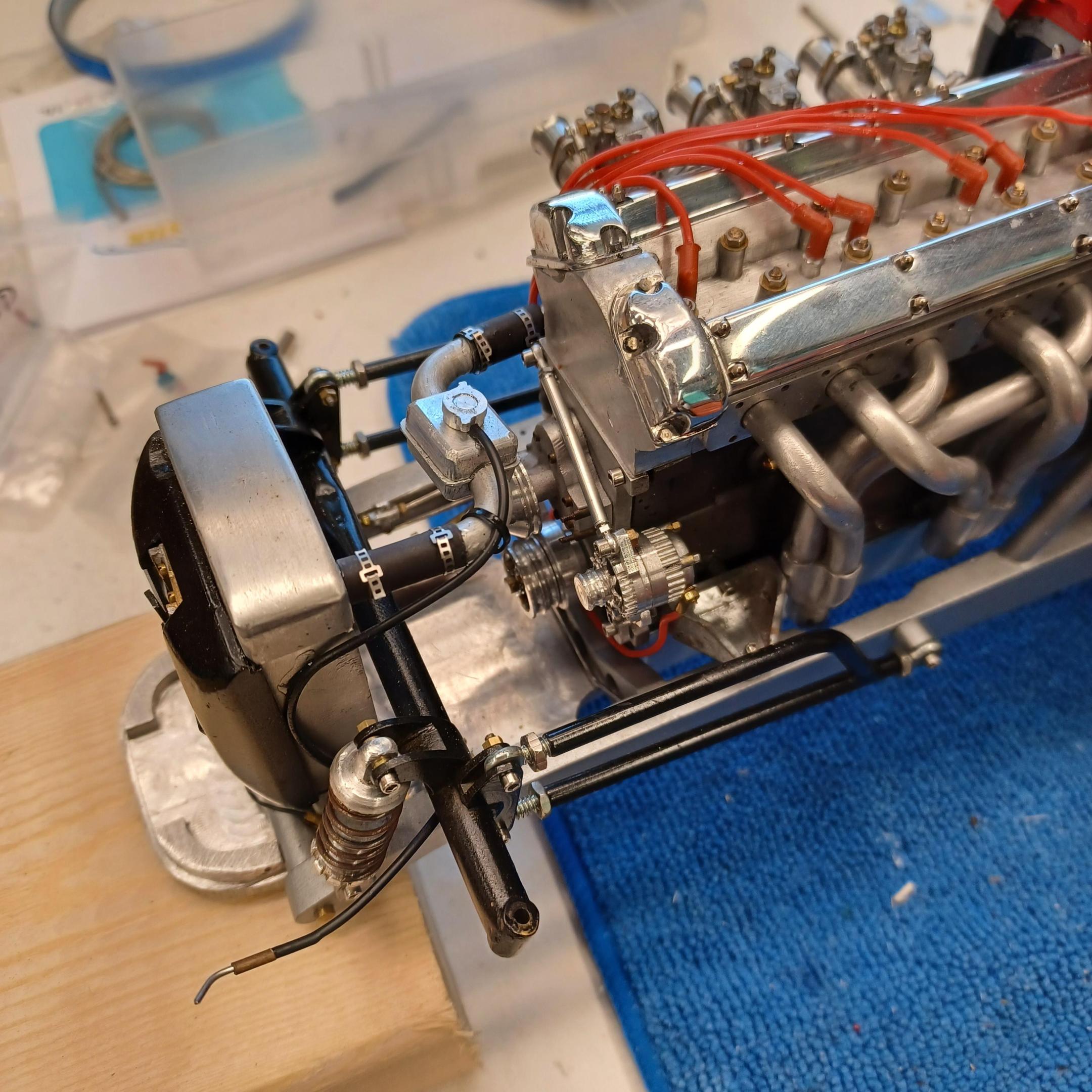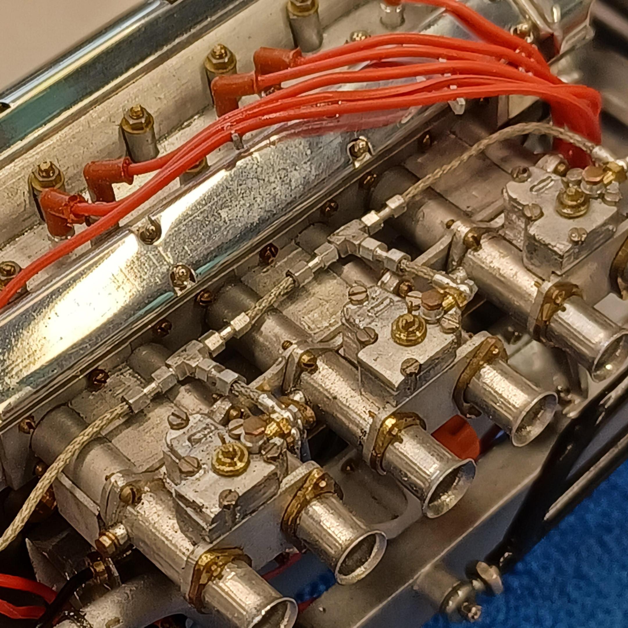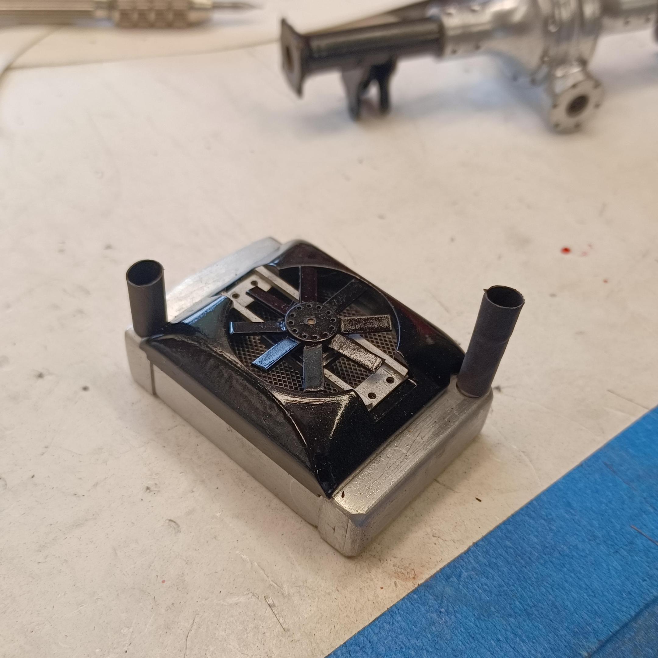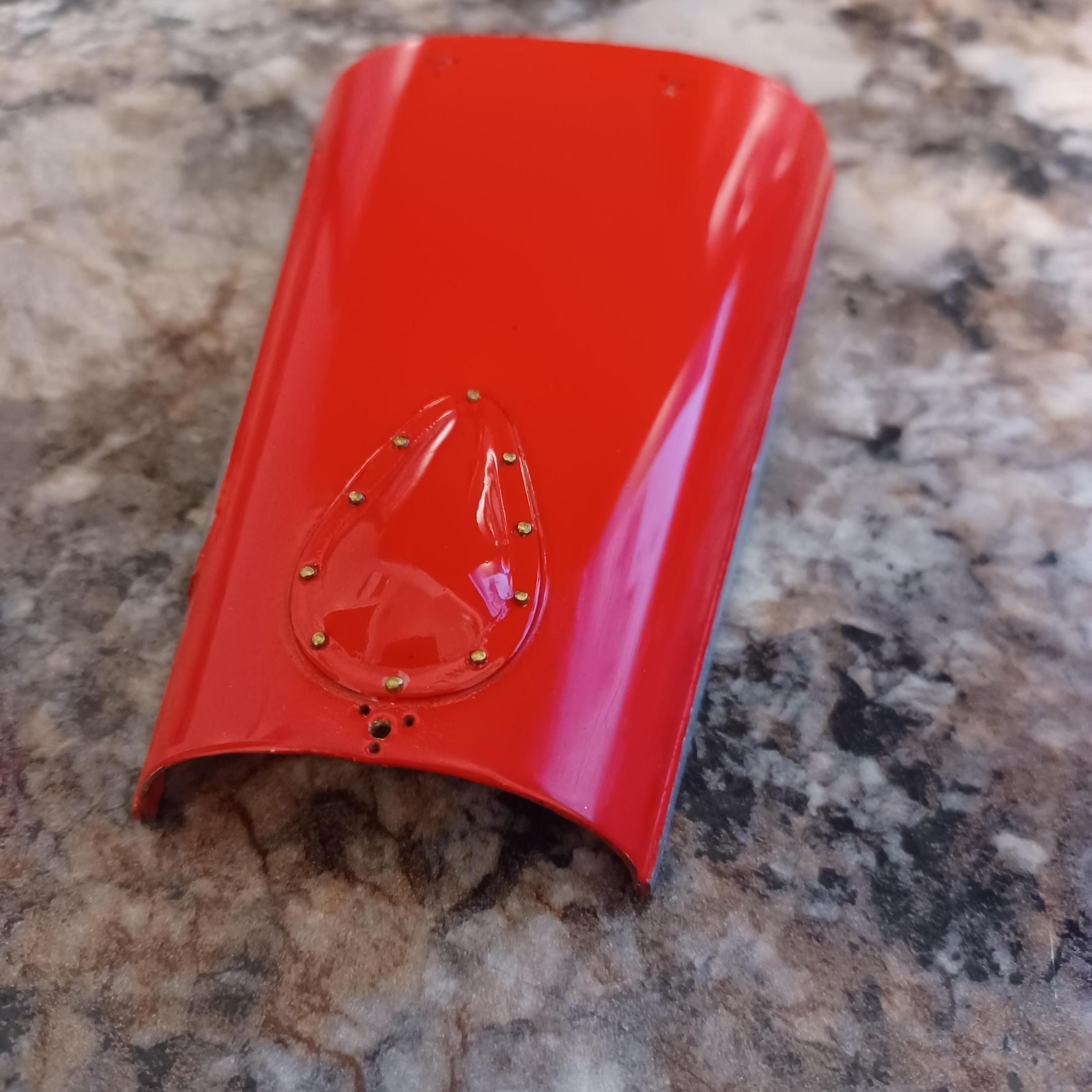 got a little behind on updates.working alot on the hydreds of details,also on the paint. the top above the body line is as you can see bright red,a silver stripe at the body line and dark navy blue below the line.i am waiting for the red to make sure the tape wont affect it.later this week will be 7 days,that should be enough. made the drive shaft and electric radiator fan and shroud. i think the red came out well,a little wet sanding after all the colors are on and 3 coats of clear. i have the carb linkage all most done thanks to RB motions hiem joints. thanks for looking and thank you for your nice comments. -