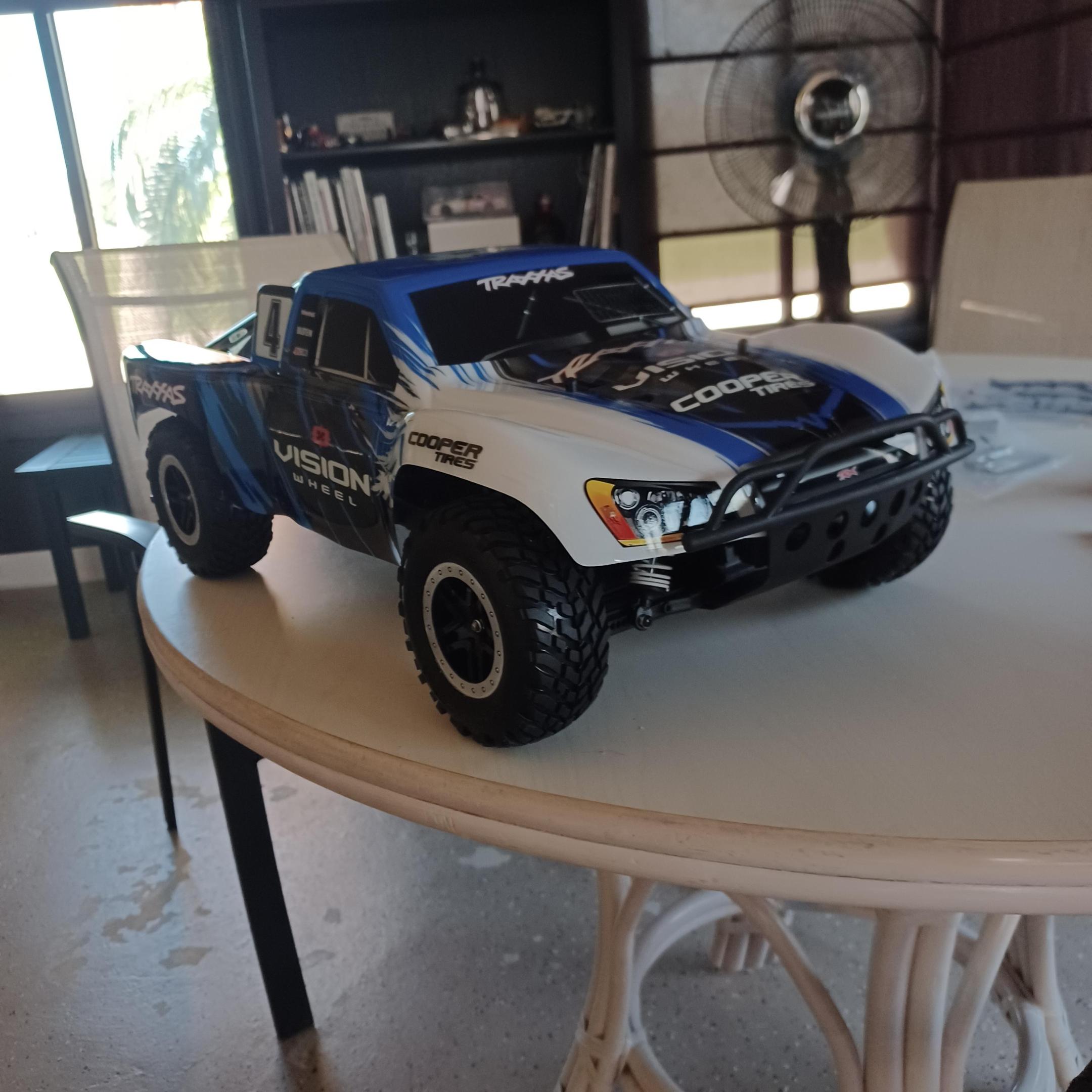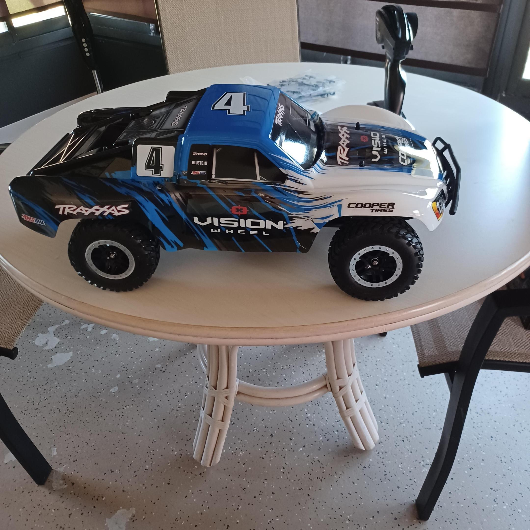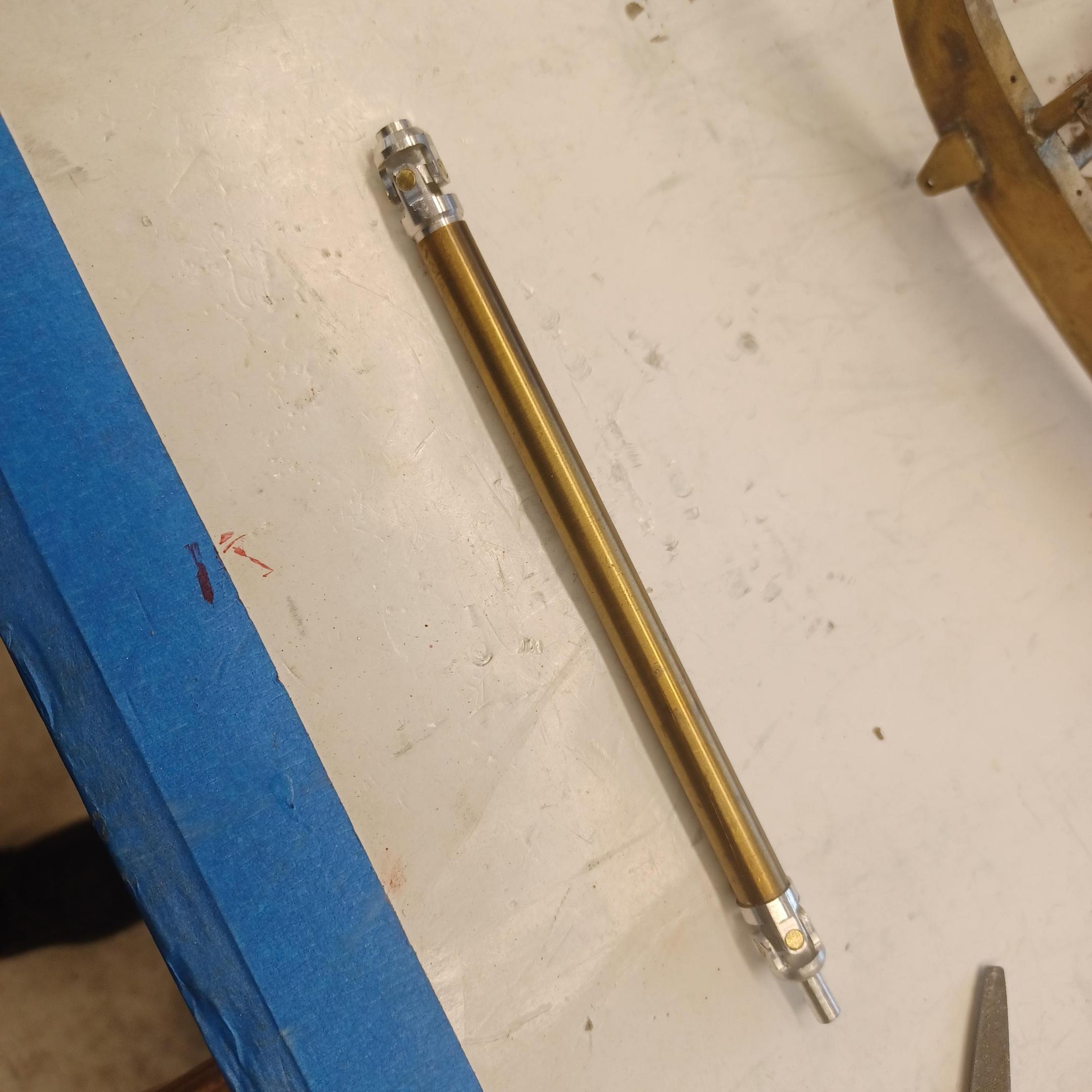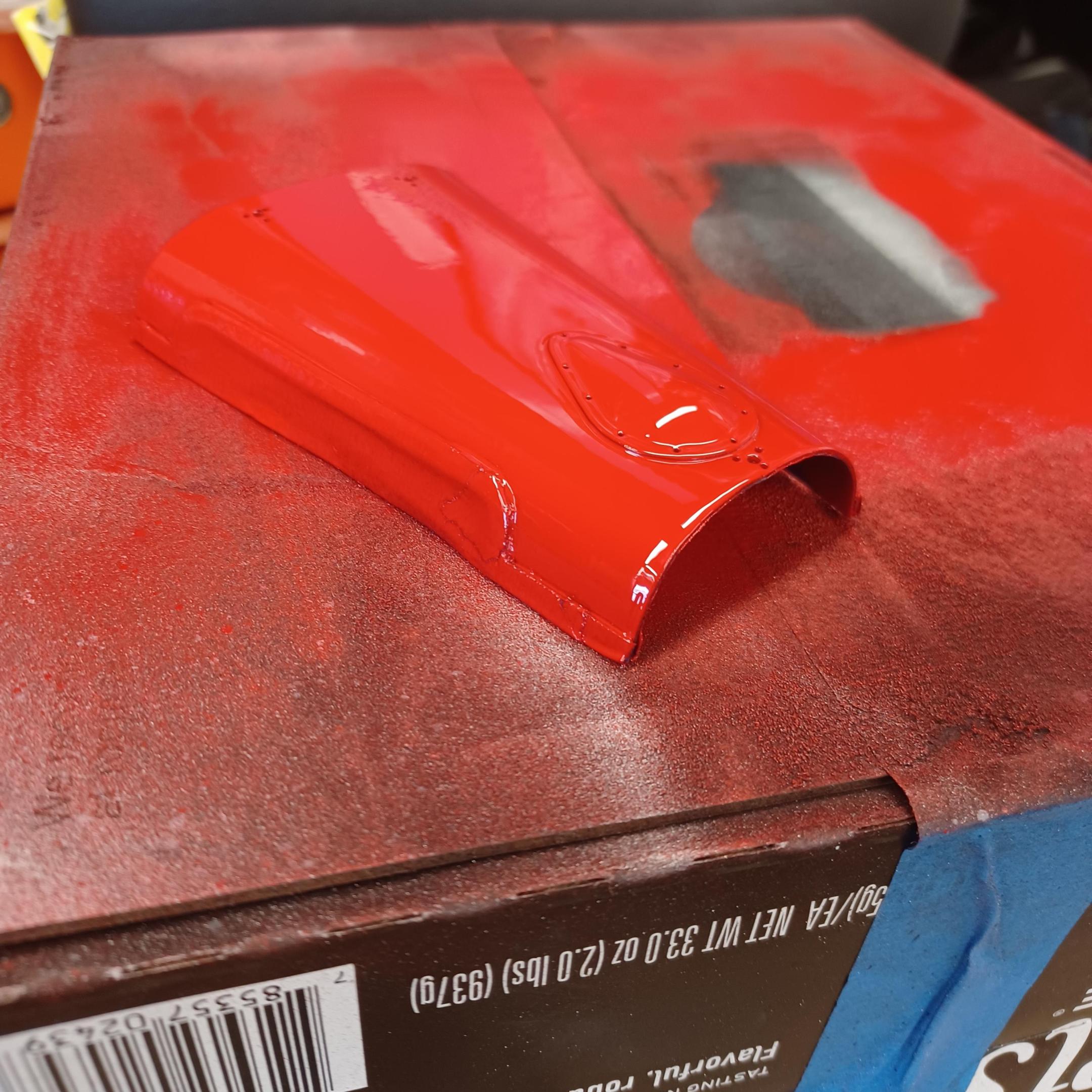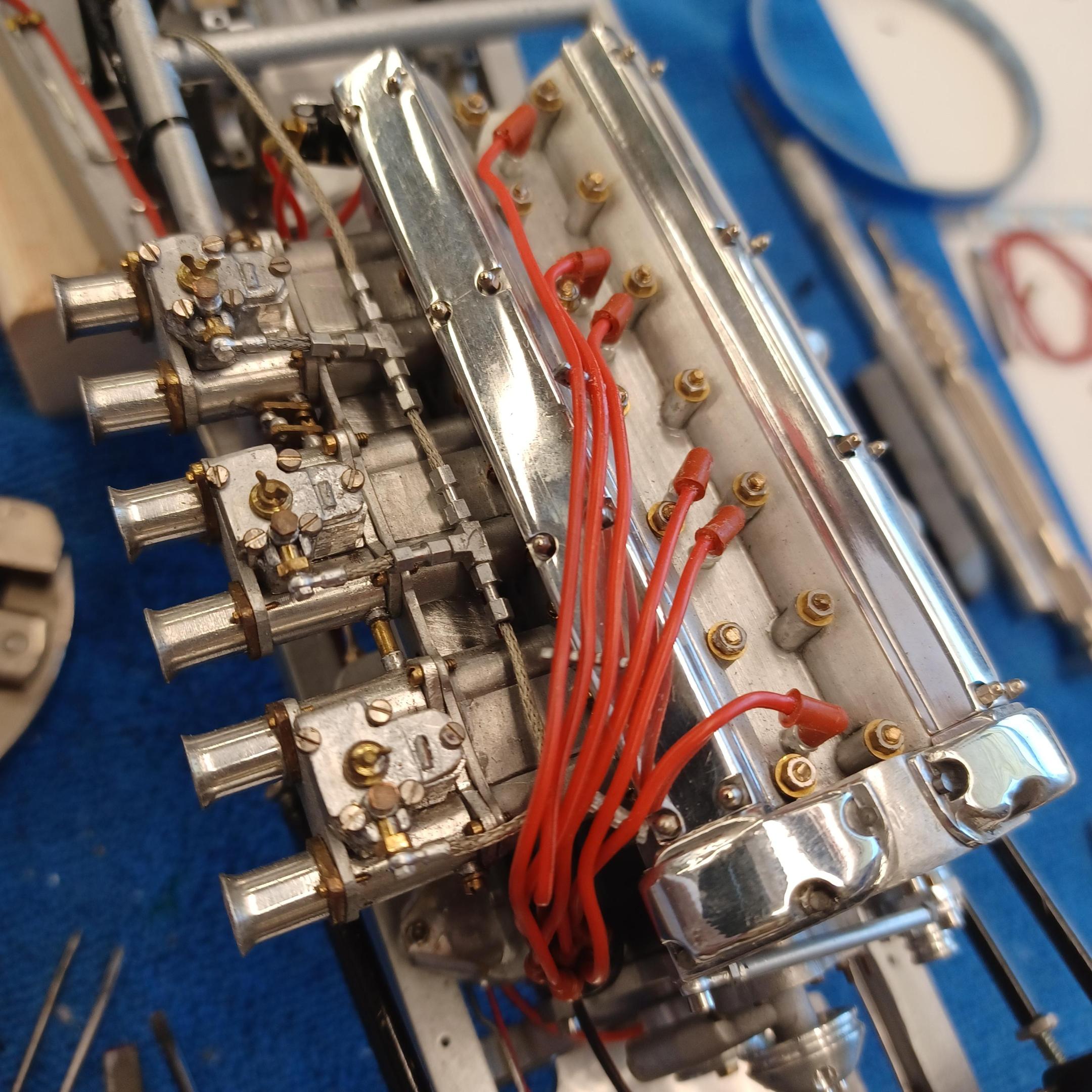 got a little behind on updates.working alot on the hydreds of details,also on the paint. the top above the body line is as you can see bright red,a silver stripe at the body line and dark navy blue below the line.i am waiting for the red to make sure the tape wont affect it.later this week will be 7 days,that should be enough. made the drive shaft and electric radiator fan and shroud. i think the red came out well,a little wet sanding after all the colors are on and 3 coats of clear. i have the carb linkage all most done thanks to RB motions hiem joints. thanks for looking and thank you for your nice comments. -
