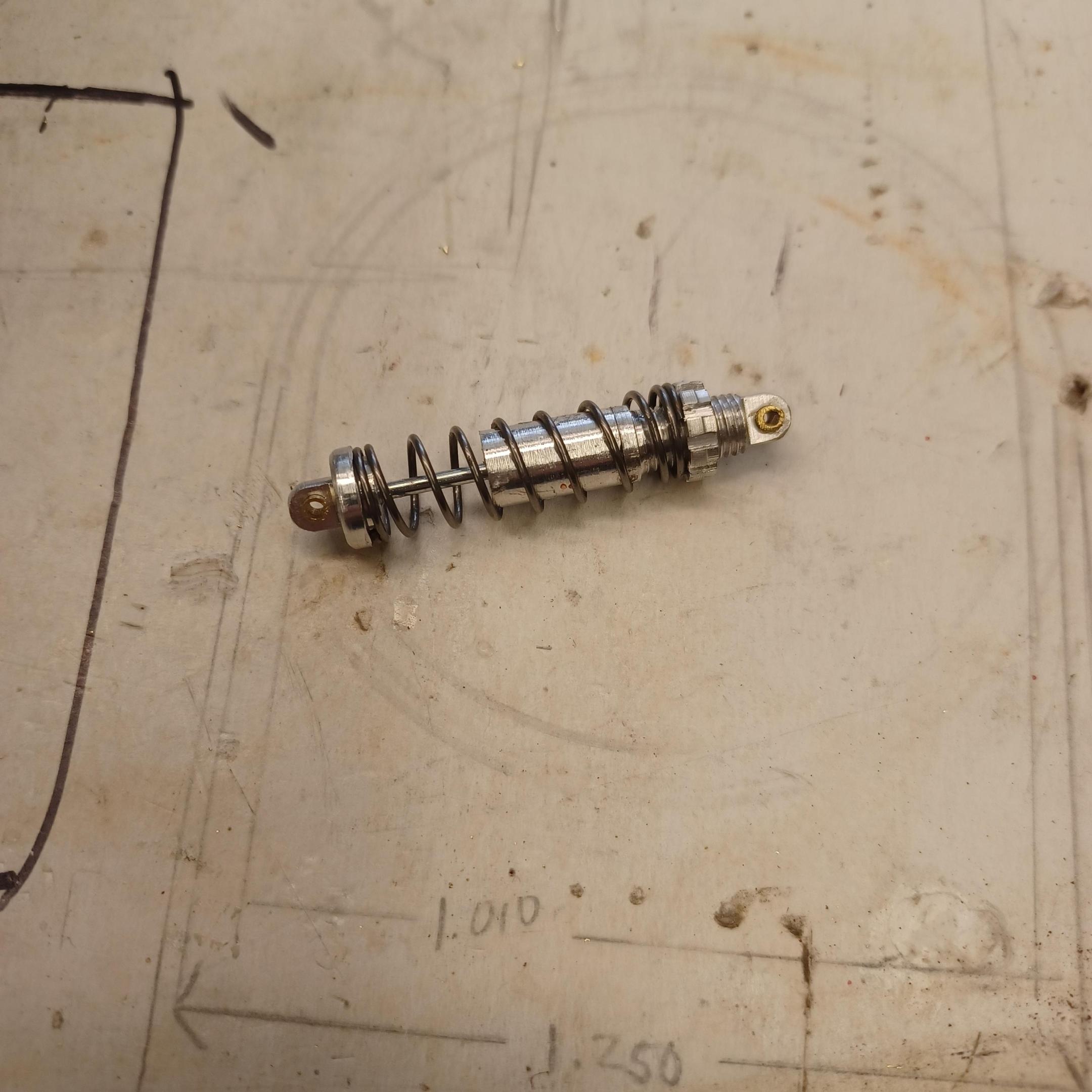 nice to here from you ian i have been following your current build . hello jim thanks for looking and commenting. pictures of the shocks almost finished,a little detail and anodizing. continuing on the hood. so many engine parts in the way. but its getting closer. leaving the weber out there in the open.this is more work than a 1 to 1 car. -