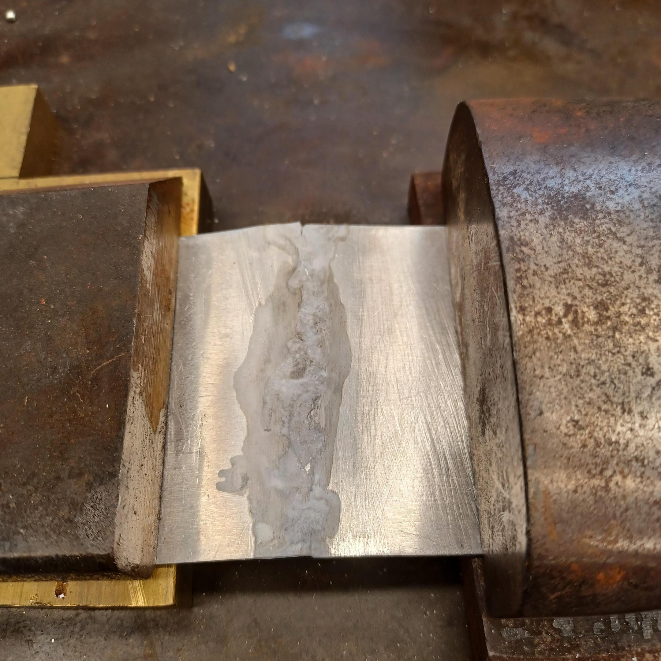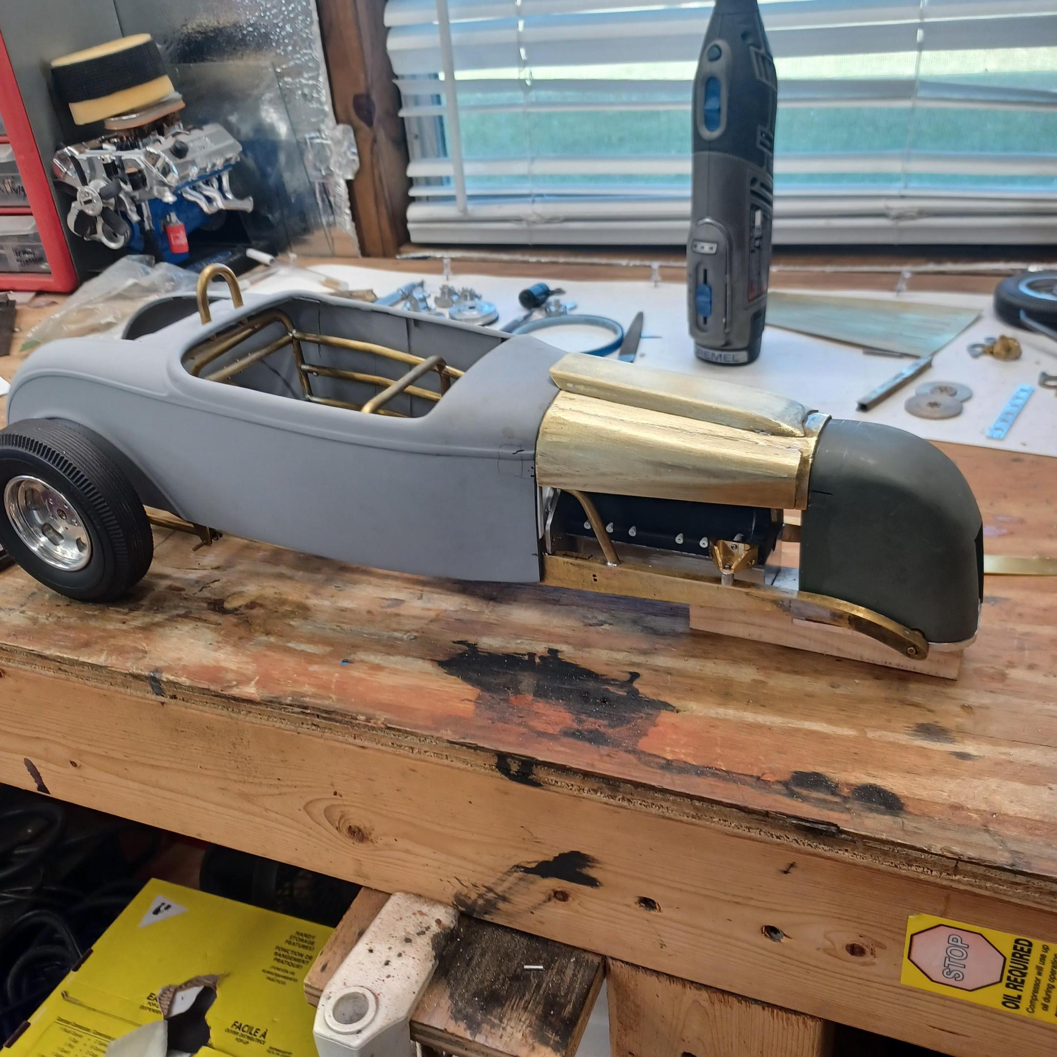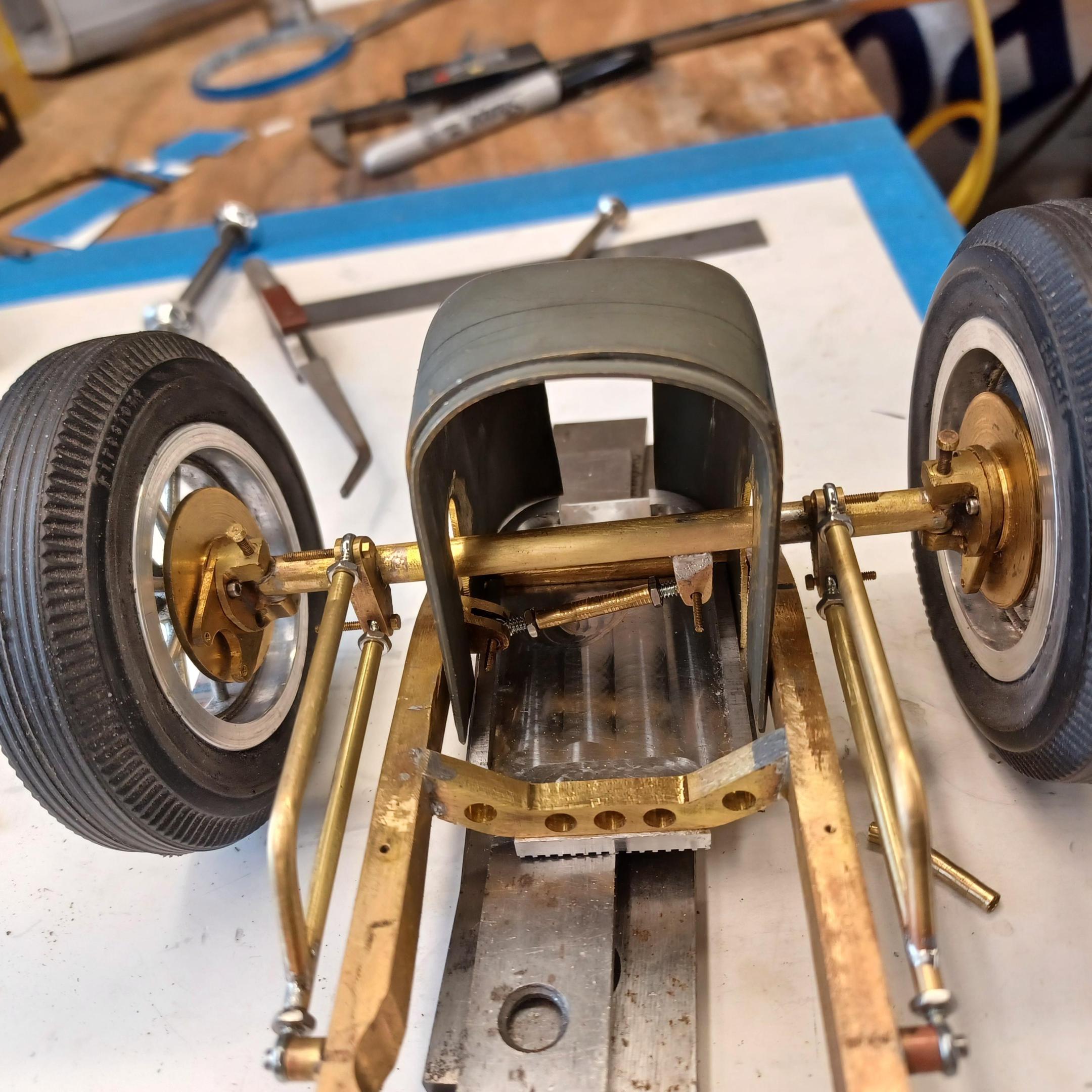 hi bob ,great to hear from you. tim ,not polite to laugh at other peoples work. just kiddin. nice to hear from you how are you doing. any progress on your neck ? this getting old thing is tough. daniel, i have finally got the aluminum solder and tried it on .025 aluminum.that is what i want to use to do an aluminum body. i am very happy with th results.it solder very nice. it is realy strong. i filed and hammered the solder to the .o25 ,same as the material and it was just as strong as the the base metal.as you can see i bent and rolled the material on the solder and it was as strong and as flexable as the the rest of it.great stuff . cant wait to finish the 32 and start on some practice body parts. i have spent many hours tig welding and gas welding aluminum . i think when you solder this you should be sure not to cool the material after solder in any way. dont even let air from a fan blow on it. if you let it cool on its own it will anneal the material and it will be softer and more flexible. i hope this will help you .i rolled the piece and then flattened it out with no problem. also i have been working on the front suspension, its coming along well. hope i have enough room for a radiator. -