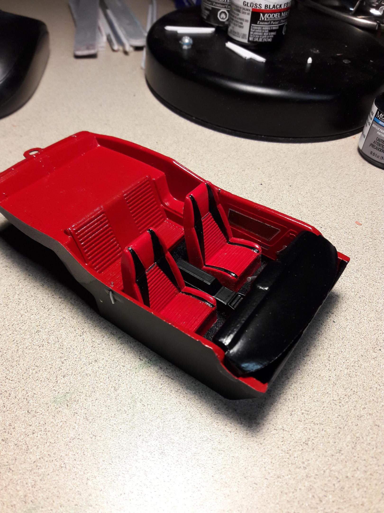 Tamiya Red (X-7) with a semigloss black for the bottom and engine bay. But then last night I mussed it up by masking the window trim off before it had fully cured....so into the magic dip it went and will be respraying in a few days. Same colors but will be more patient on cure time and then use a clear coat before applying any masking.