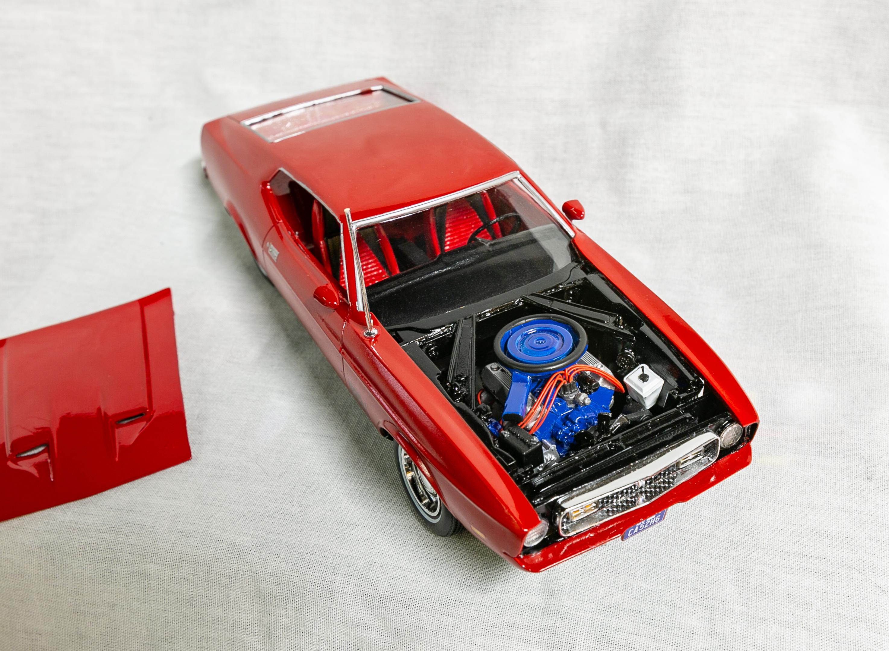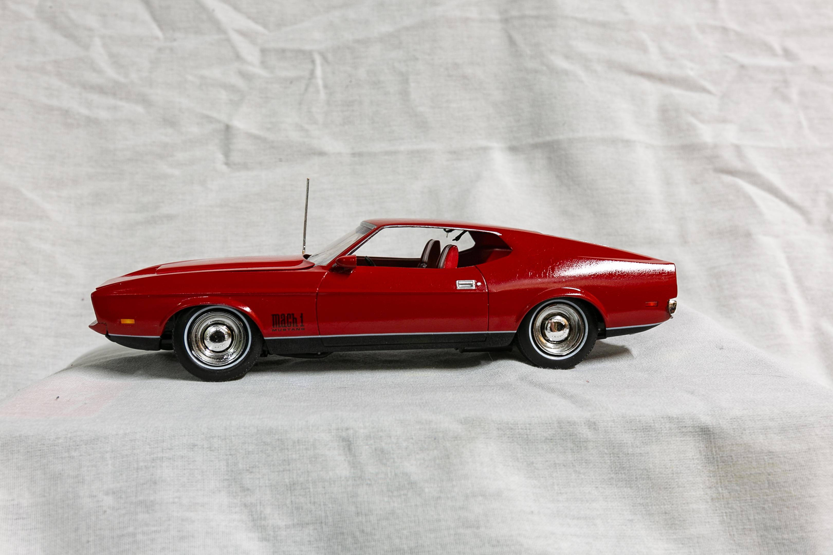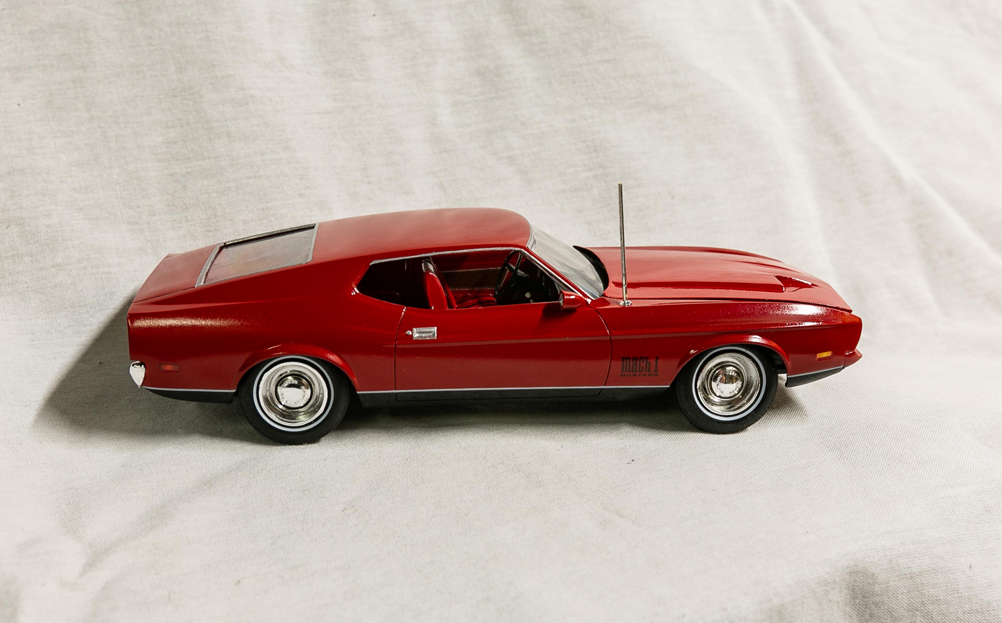 Did what I could with a very VERY disappointing kit. Lots of custom work on this build. This is AMTs "new" 007 James Bond 1971 Mustang Mach One kit. Lots of inaccuracies and issues with the kit but wont get into that here. Engine bay and front chassis/steering/suspension taken from a '70 Boss 429 kit. Rear 1/2 of chassis is from the AMT Bond Kit. Scratch built engine bay braces Correct 429 Cobra Jet engine/transmission from a Gran Torino kit Added reservoir tank, battery, plug wires, ignition relay to detail the engine bay Dual exhaust from Torino kit Added seatbelts, if you look close you can see them hanging down from the roof as they do in the movie Photo etch detail handles on interior tub and flock carpeting Opened the two hood scoops Filled in the cowl grill on the hood Lowered the rear view mirrors so more accurate Added the radio antenna License plates are movie accurate and came with the kit (one of the few good things about the kit!) My clear coating crazed a little so please pardon that And I never found the correct 1971 2-spoke steering wheel so its still the '73 three spoke style Enjoy and happy building!