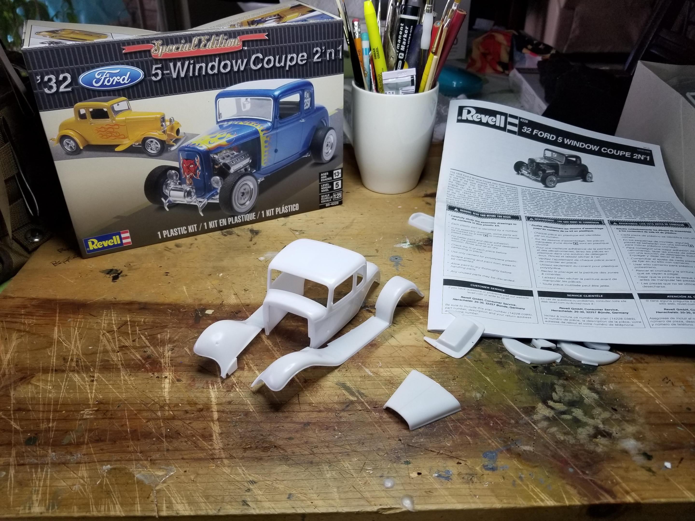 Ciao everyone! My next project will be the 1932 5-window coupe from Revell. My only problem is that I can't build it straight stock. I don't have the parts box sufficient to replace the engine and wheels. However, I will build it as modestly as possible. AND, I am taking baby-steps into detailing by opening the door on the driver side, which will mean that I will have to detail the door with at least a latch and post. I told you, "baby steps." Check it out and any suggestions or comments are welcome. Hopefully, I won't install anything upside down.