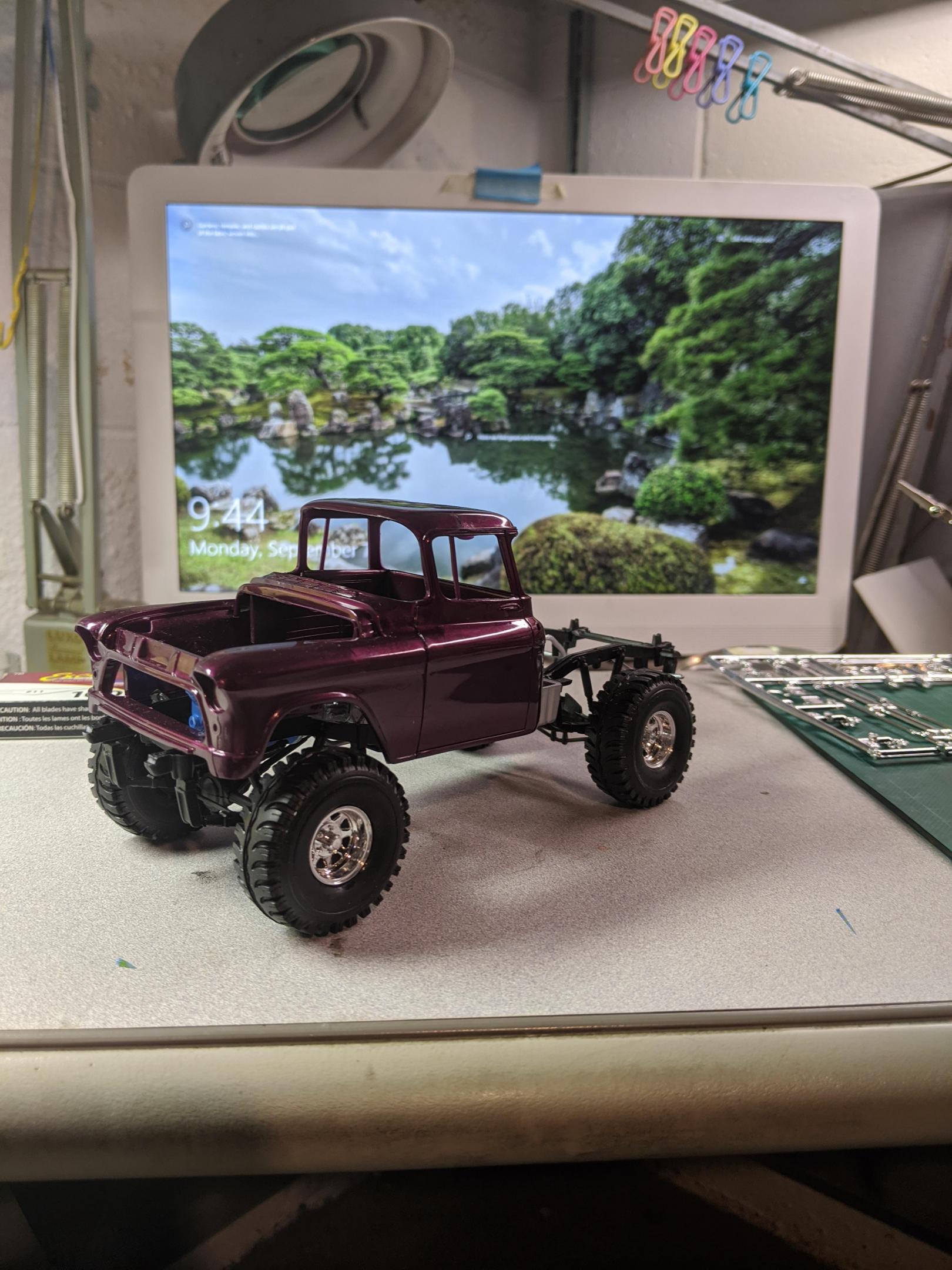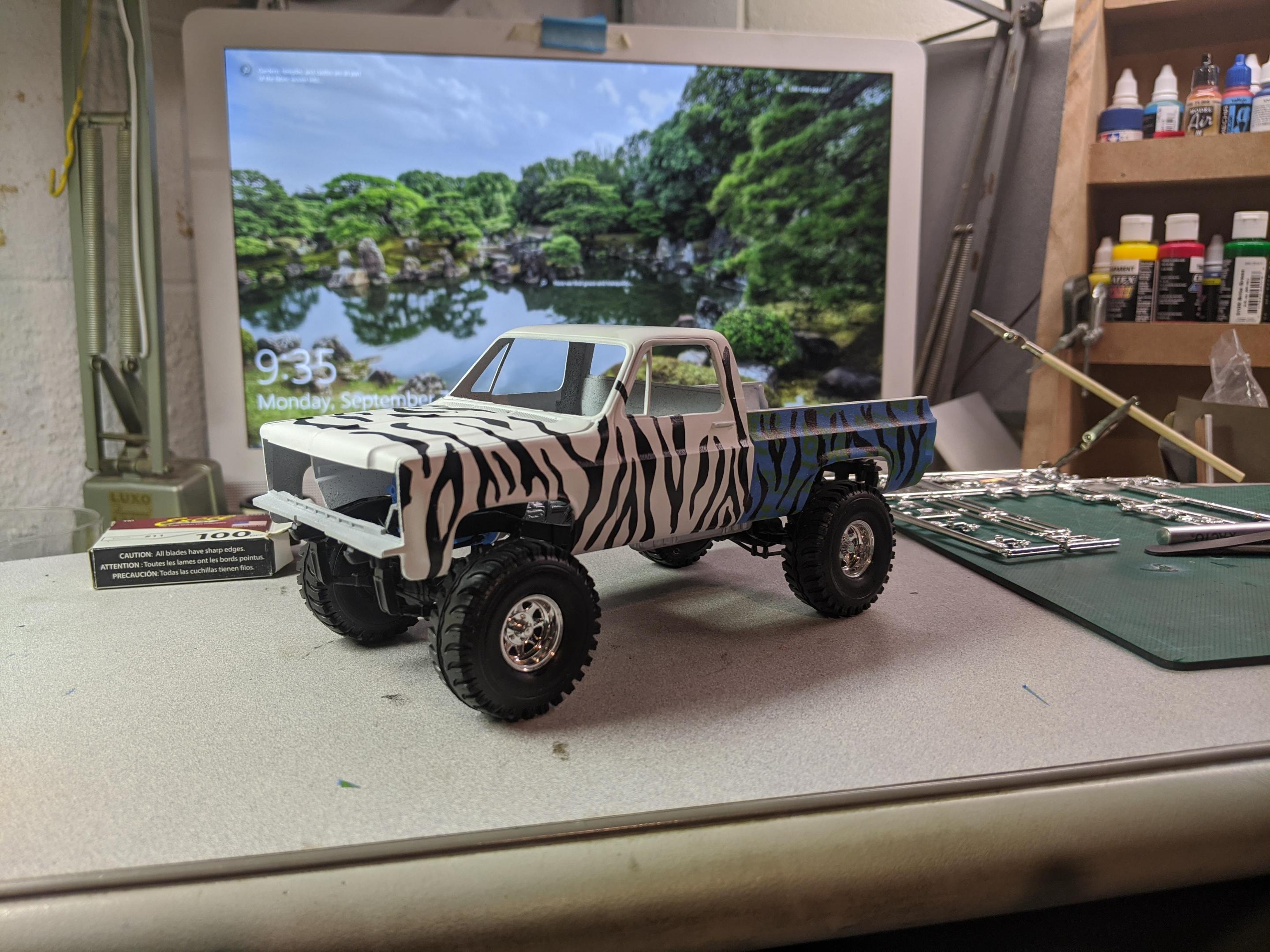 Being that I finally had a couple days off I wanted to do a real quick, low detail build. Just a day or so, something to look at and smile. I thought a safari Zebra paint job with tan interior would be cool. It's turning out ok, gonna need some touchups to make it look decent. Once the trim is done, it's cleared and dirtied up a little I think it'll look nice. I'm still very much trying to get the hang of using an airbrush. I love the look of this kit, I think I'm going to buy another and put a 55 Stepside Street Machine body on it...maybe. There's a lot of possibilities for some ridiculous things using that chassis.
