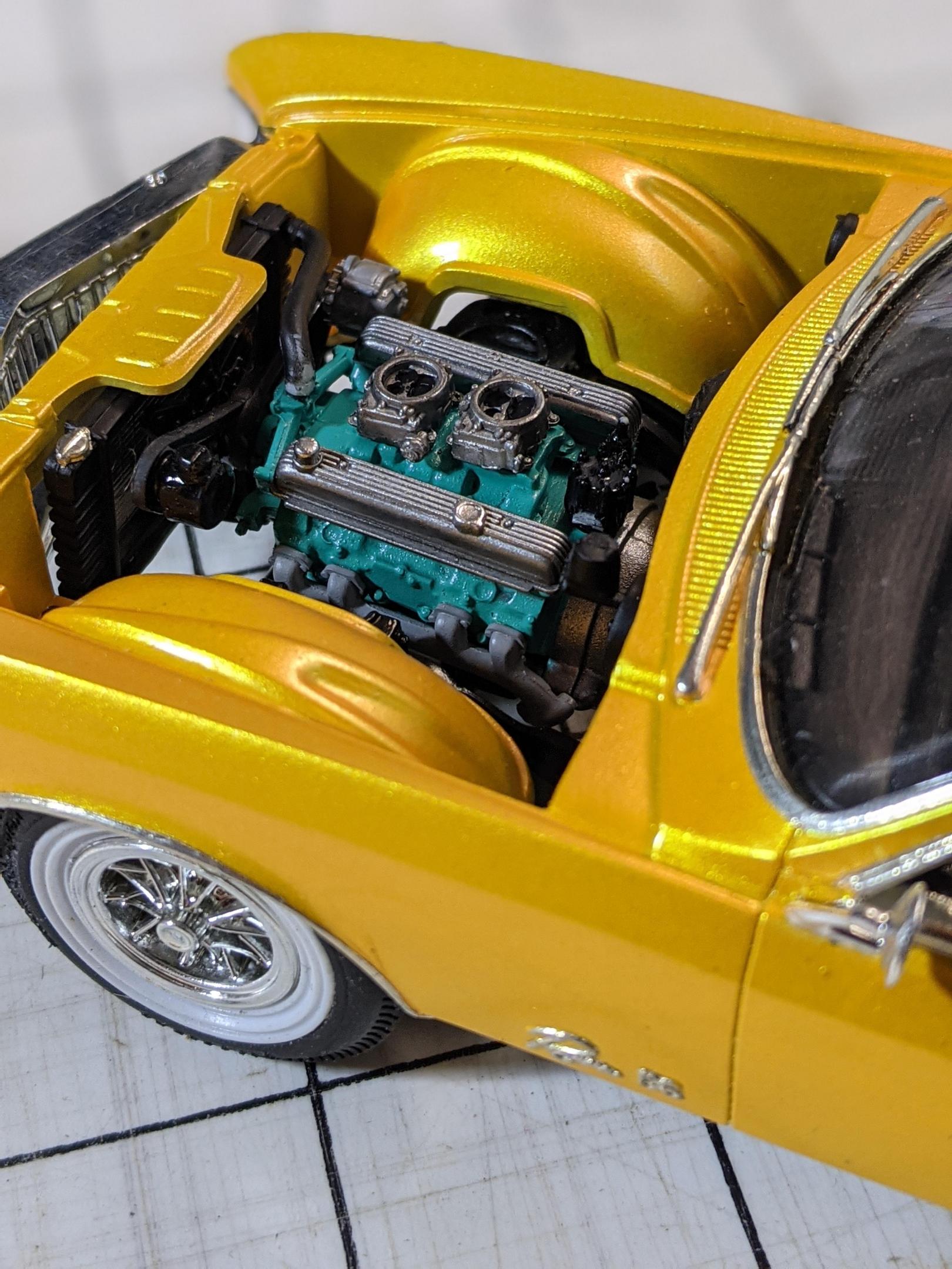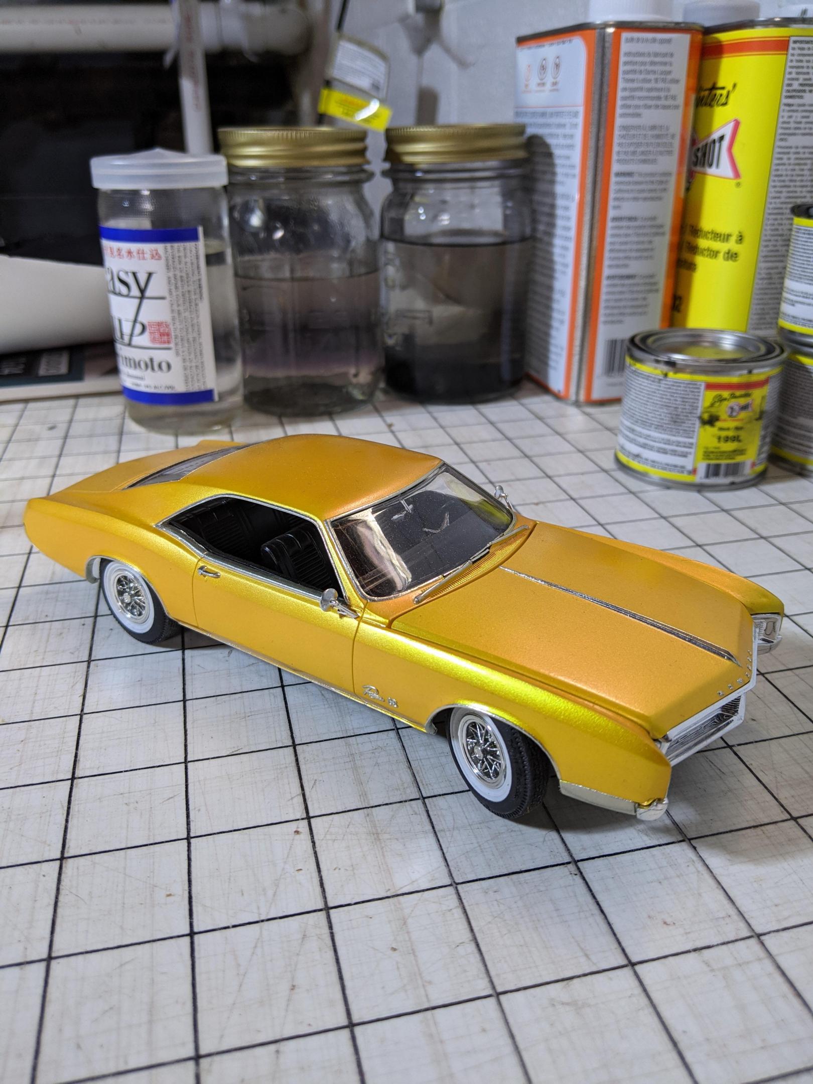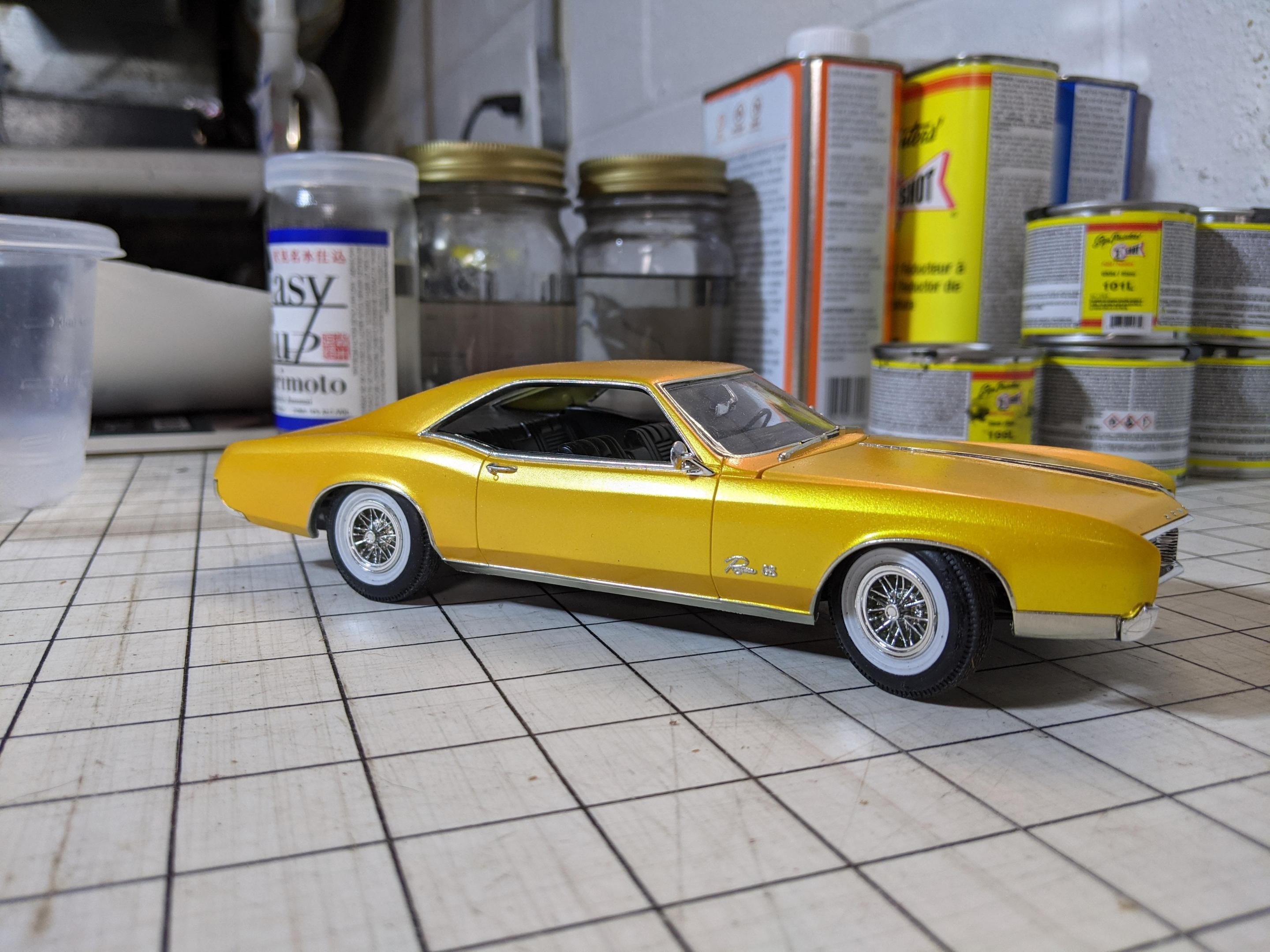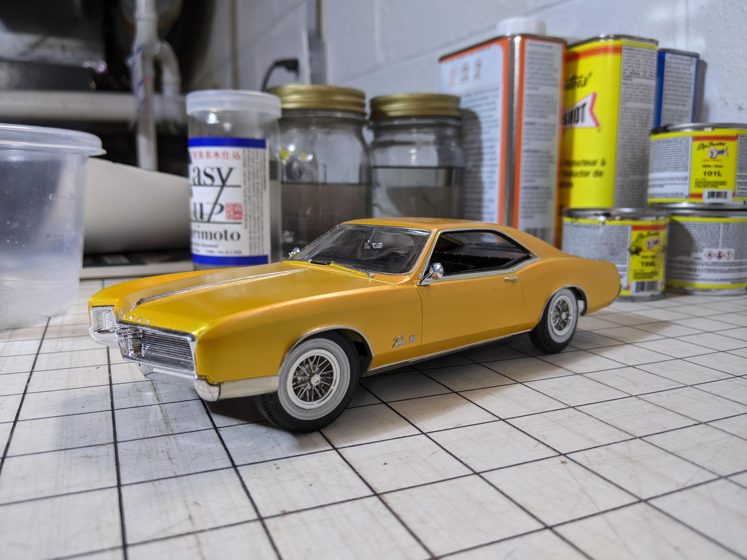 AMT 66 Riviera. I really like this kit. This was my first time using foil. I hated the stock wheels so I copped these from a Corvette kit and made them fit as best as I could. My wife wanted it to be gold , the paint is a Vallejo color shift green but on white primer it does this pearl gold thing. I didn't clear the body and once I did the foil I didn't want everything to have the same sheen so it is what it is now. I did the engine in that color just because I had a 54 Buick with a nailhead years ago and I liked the teal. Exhaust and little detail work and I'm going to call it done. I'm learning and I see a lot of flaws but I feel like every one I do is better than the last.