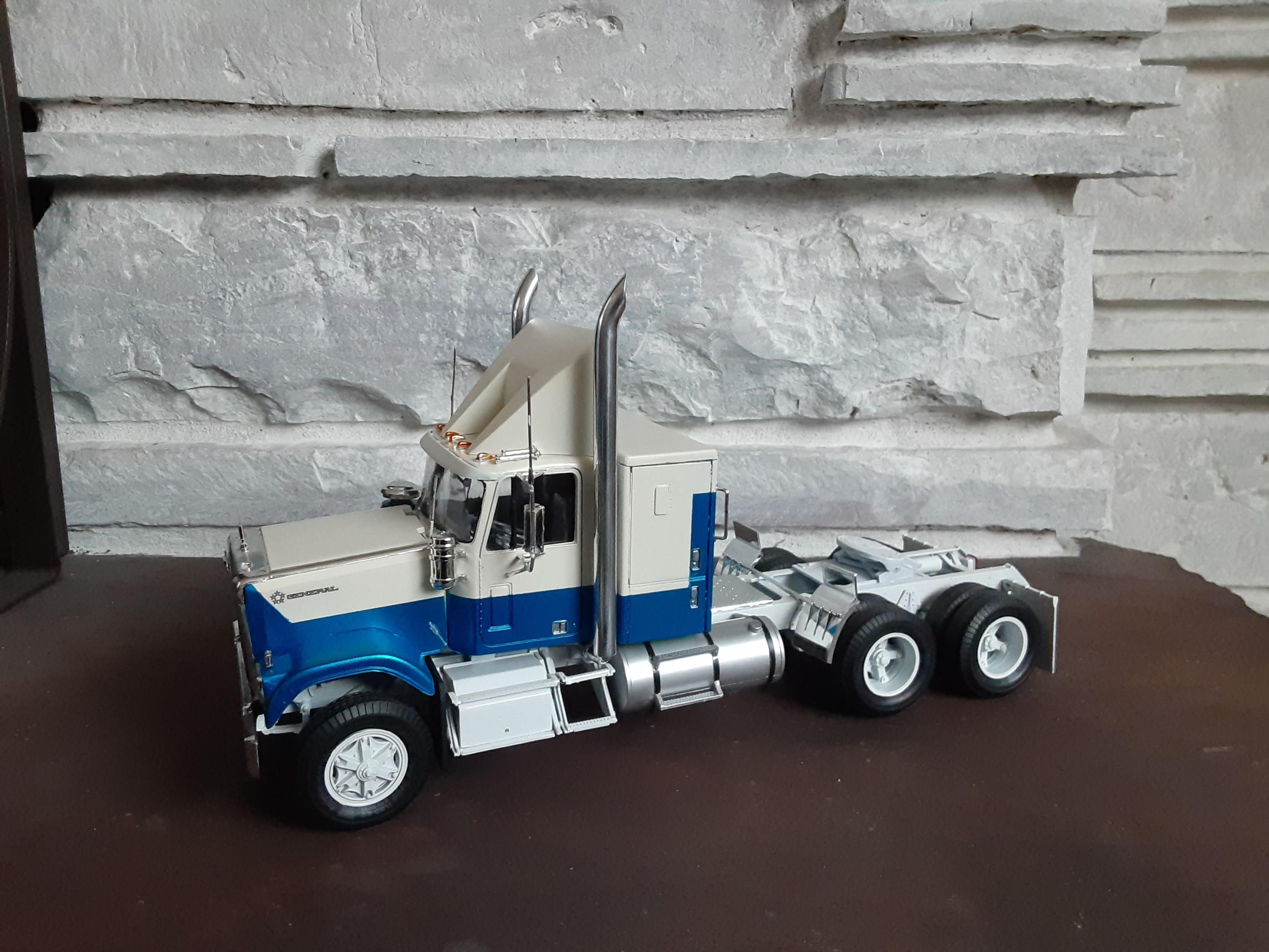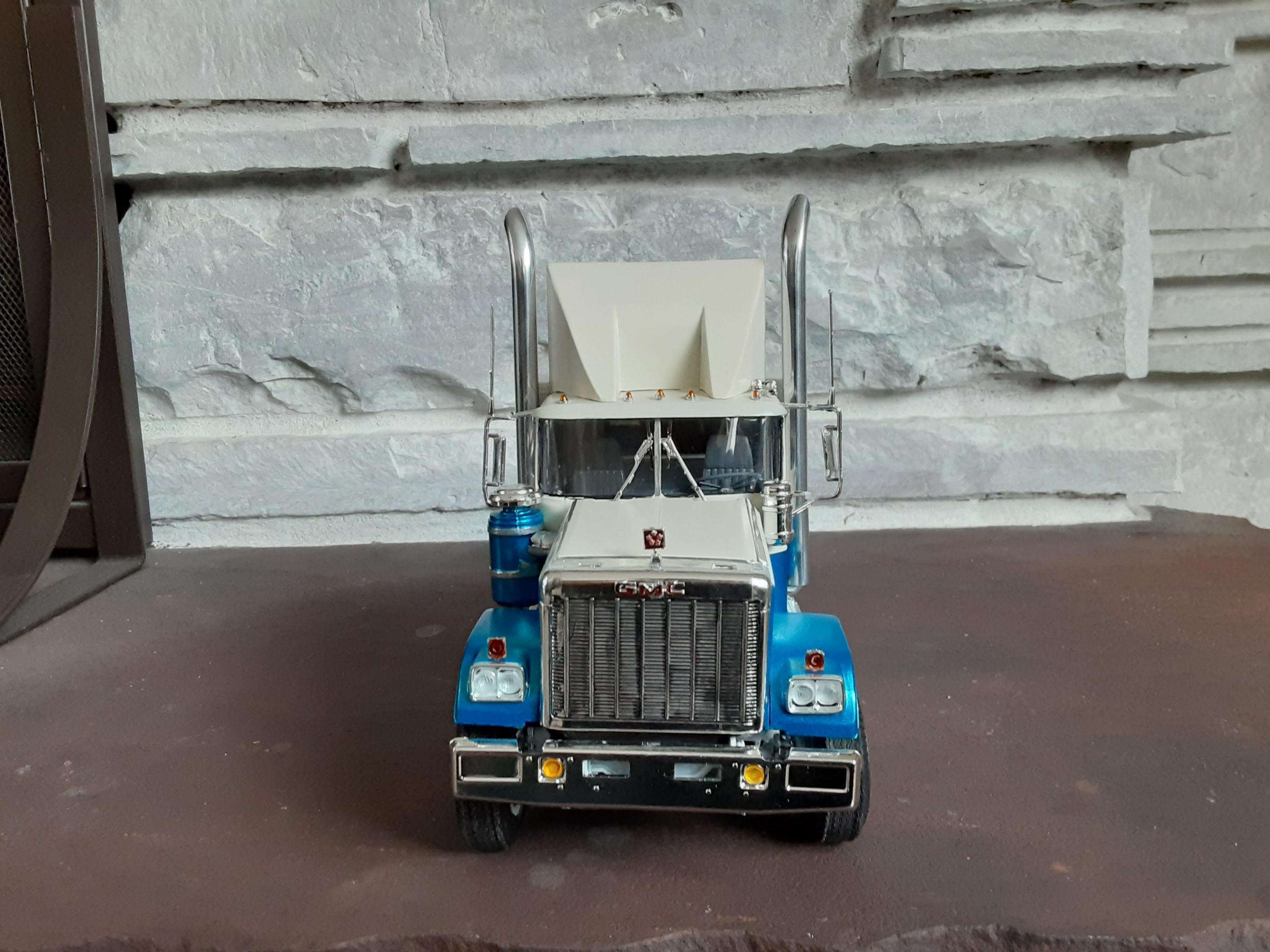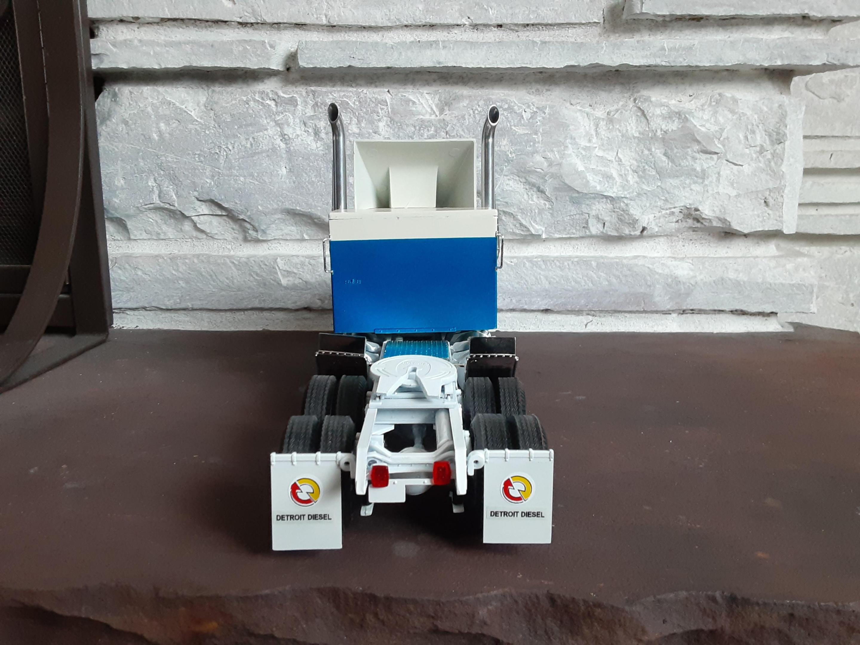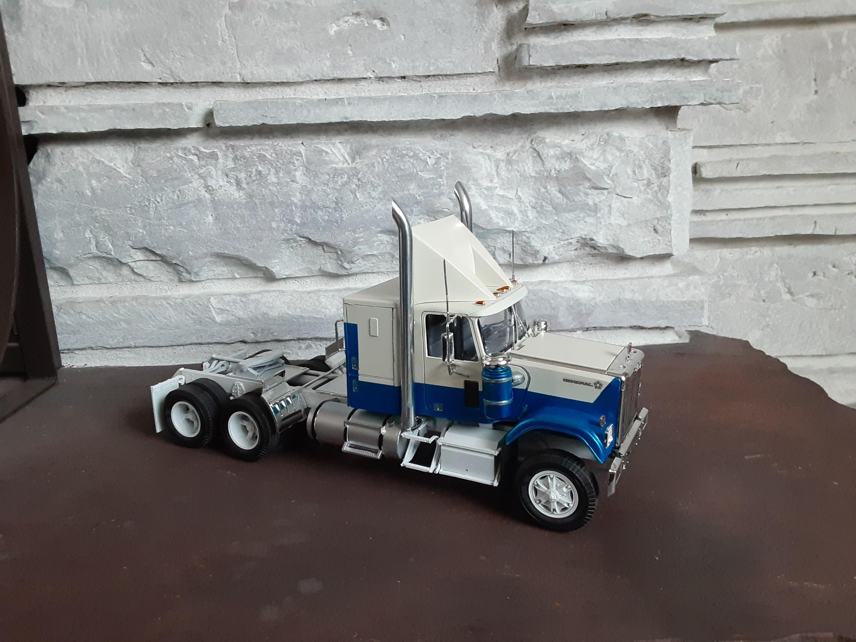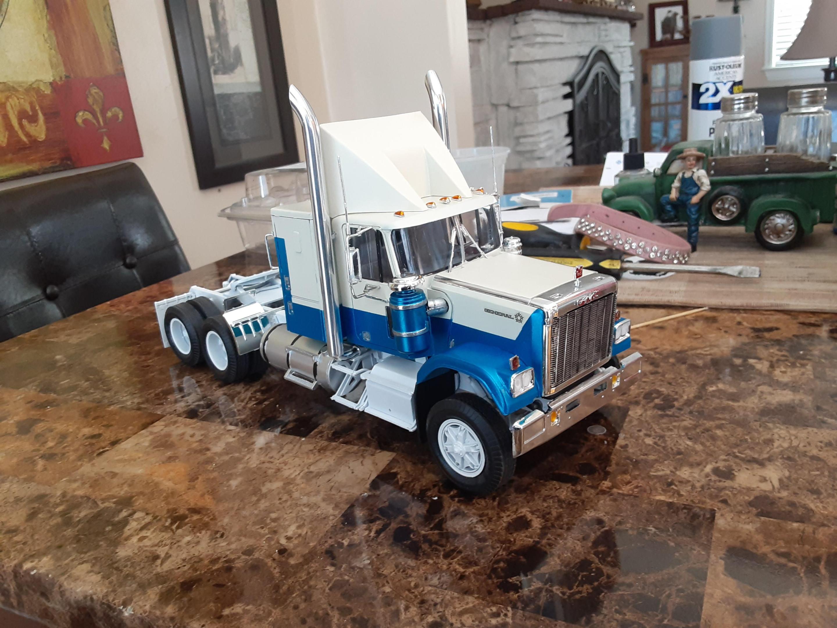 Finally wrapped this this guy up. Amt GMC General, diamond REO wheels and tires to replace the small kit ones. Added some big chrome stacks and mud flap decals, other than that right out of the box. This thing was super warped and fought me the whole way so im glad it turned out as well as it did. The frame is gloss white. Mud flaps are a nissan white. The body is ford Wimbledon white and gm Bahama metallic blue. Interior is primer that i clear coated.