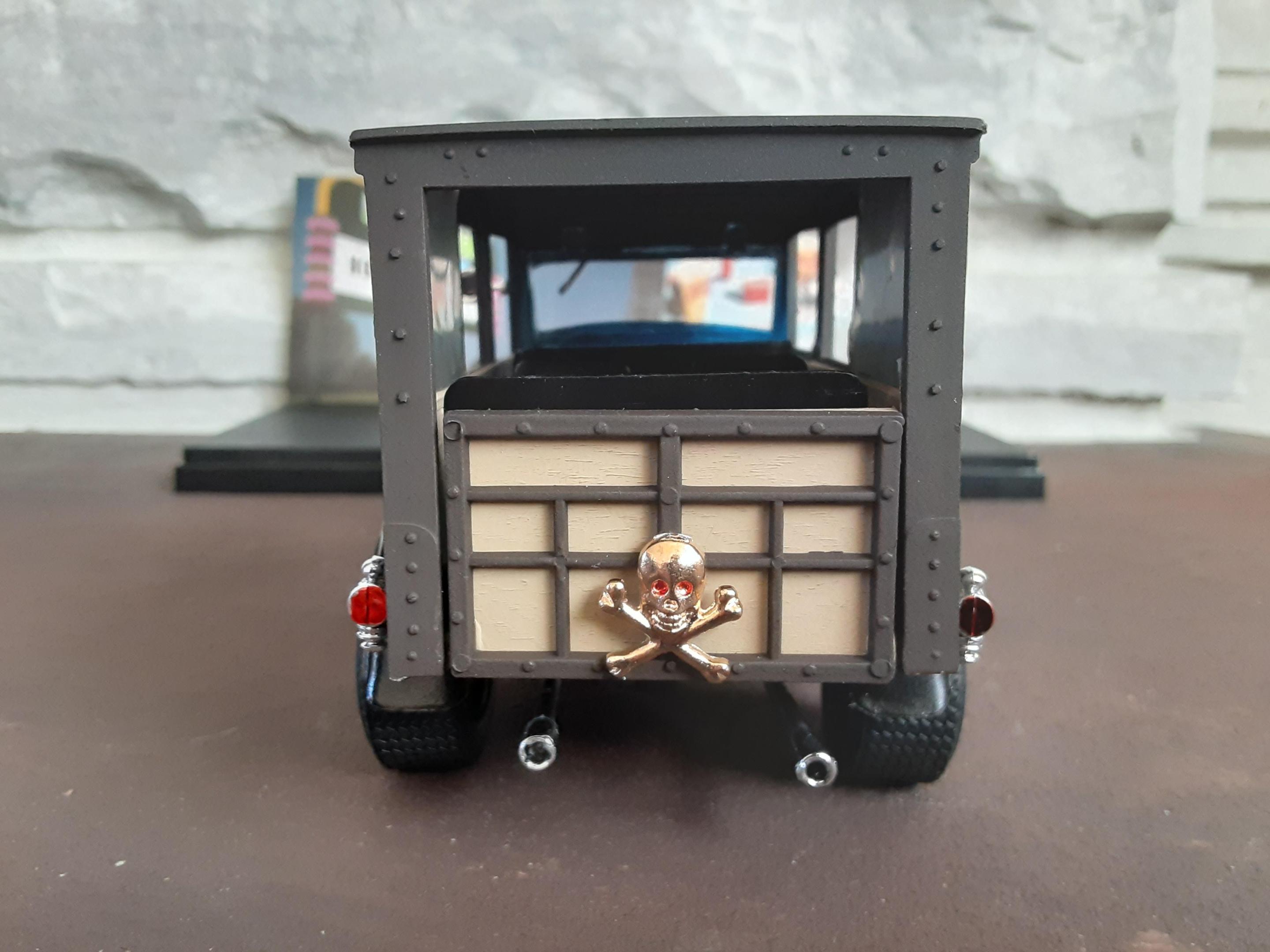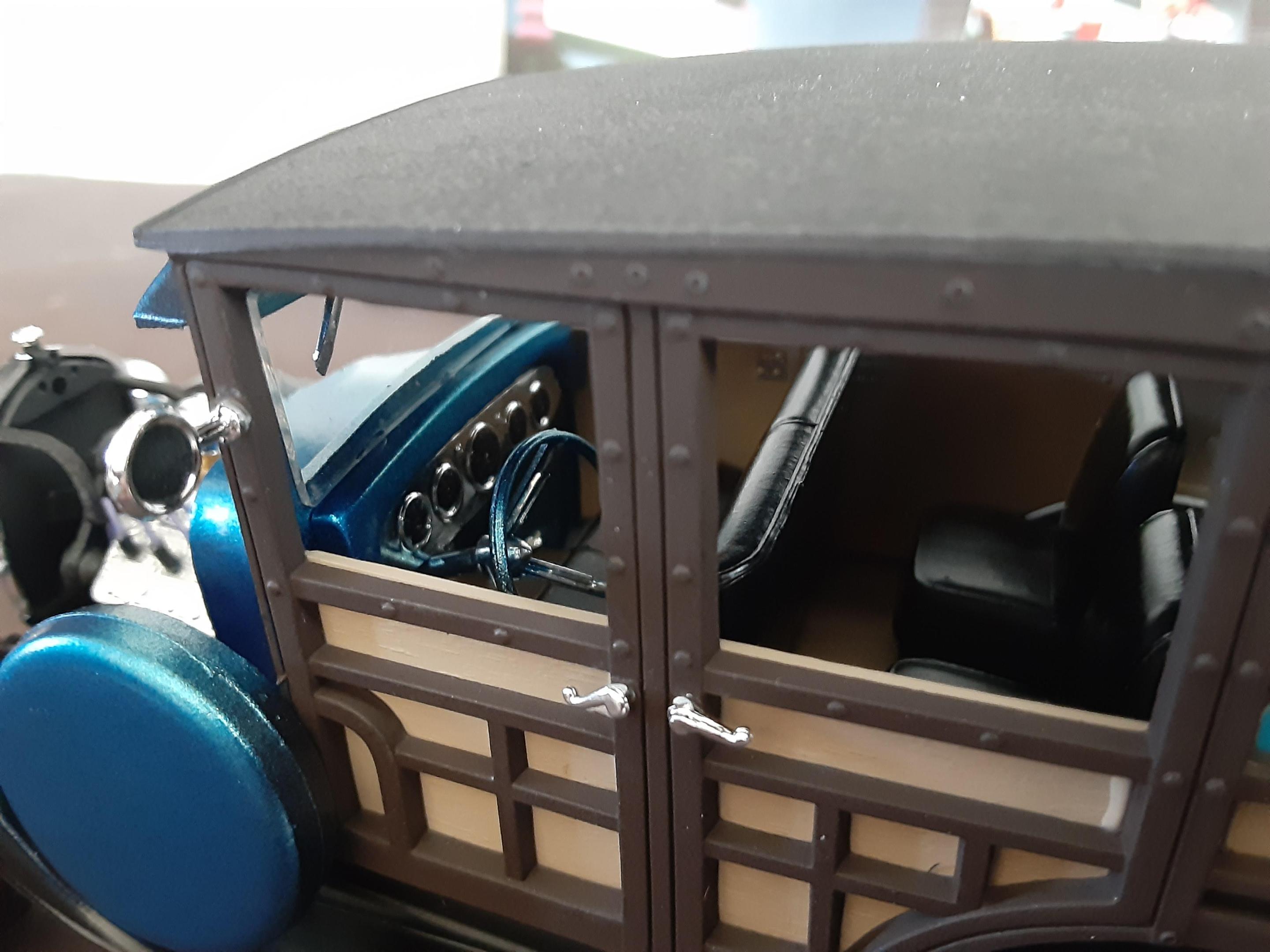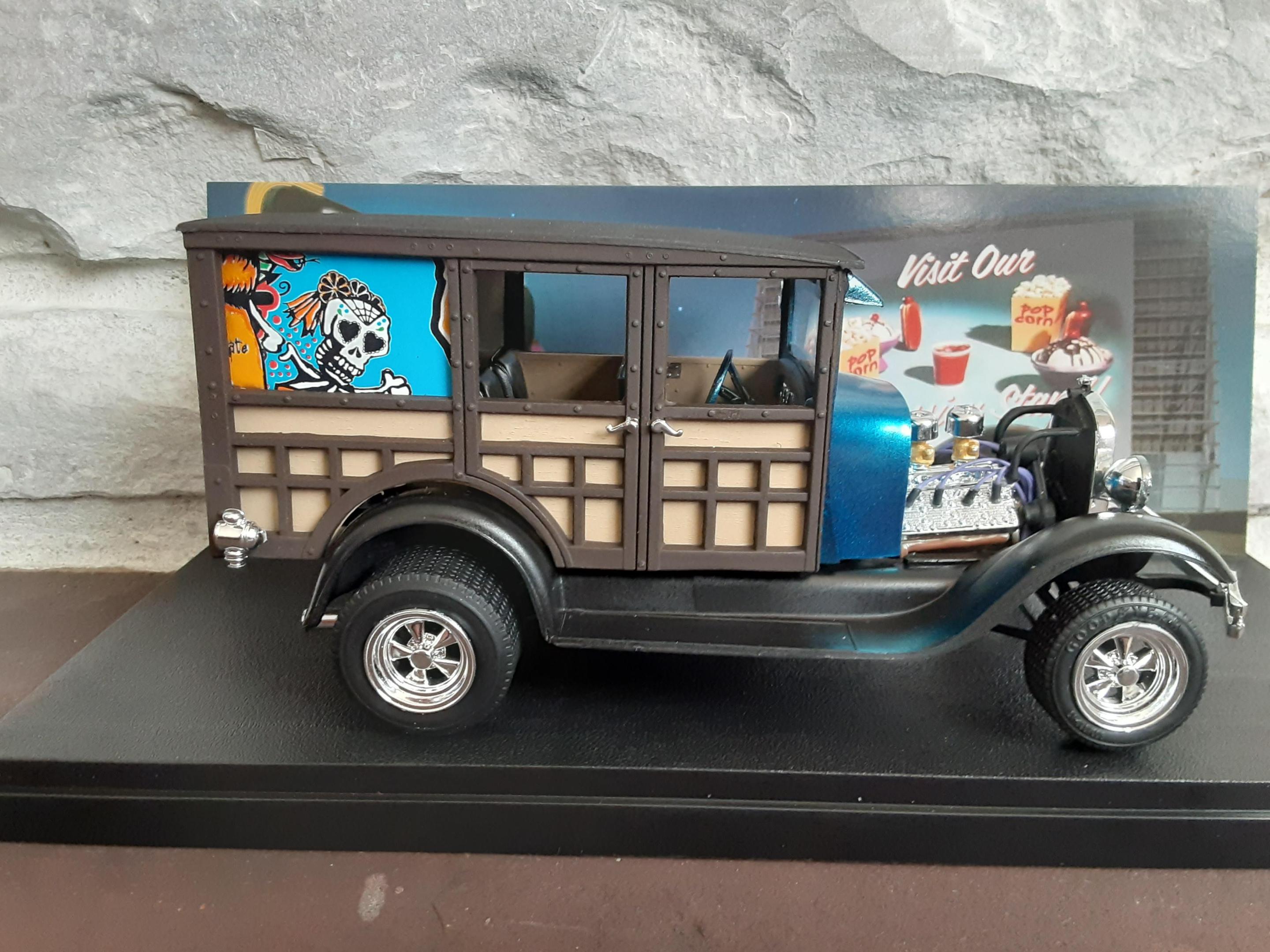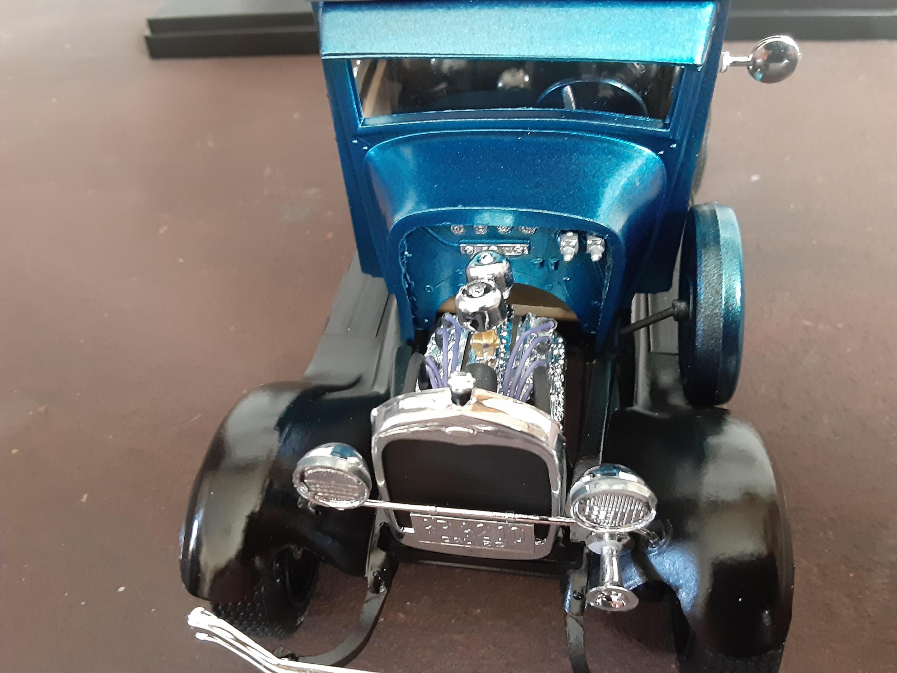 Just got this one finished, i ordered all the pieces i needed to build the 2 in 1 woody/pickup kit from my trog build. I modified an optional firewall i had from the '32 phaeton kit and recessed it to clear the v8. The grill, headlights, and radiator are from a revell 29 ford rat rod kit. The spare tire also came from the 32 ford phaeton kit. The tail lights are from the model T 2in1 kit. The rear window panels are from a monster energy drink that i dusted with a blue-purple paint so itll sparkle in the sun like the cowl and spare tire. The skull and cross bones is a modified charm. The blue is gm metallic bahama blue, the brown and tan are camo paint, the roof is primer black, and the fenders are gloss. Also added plug wires to the engine.