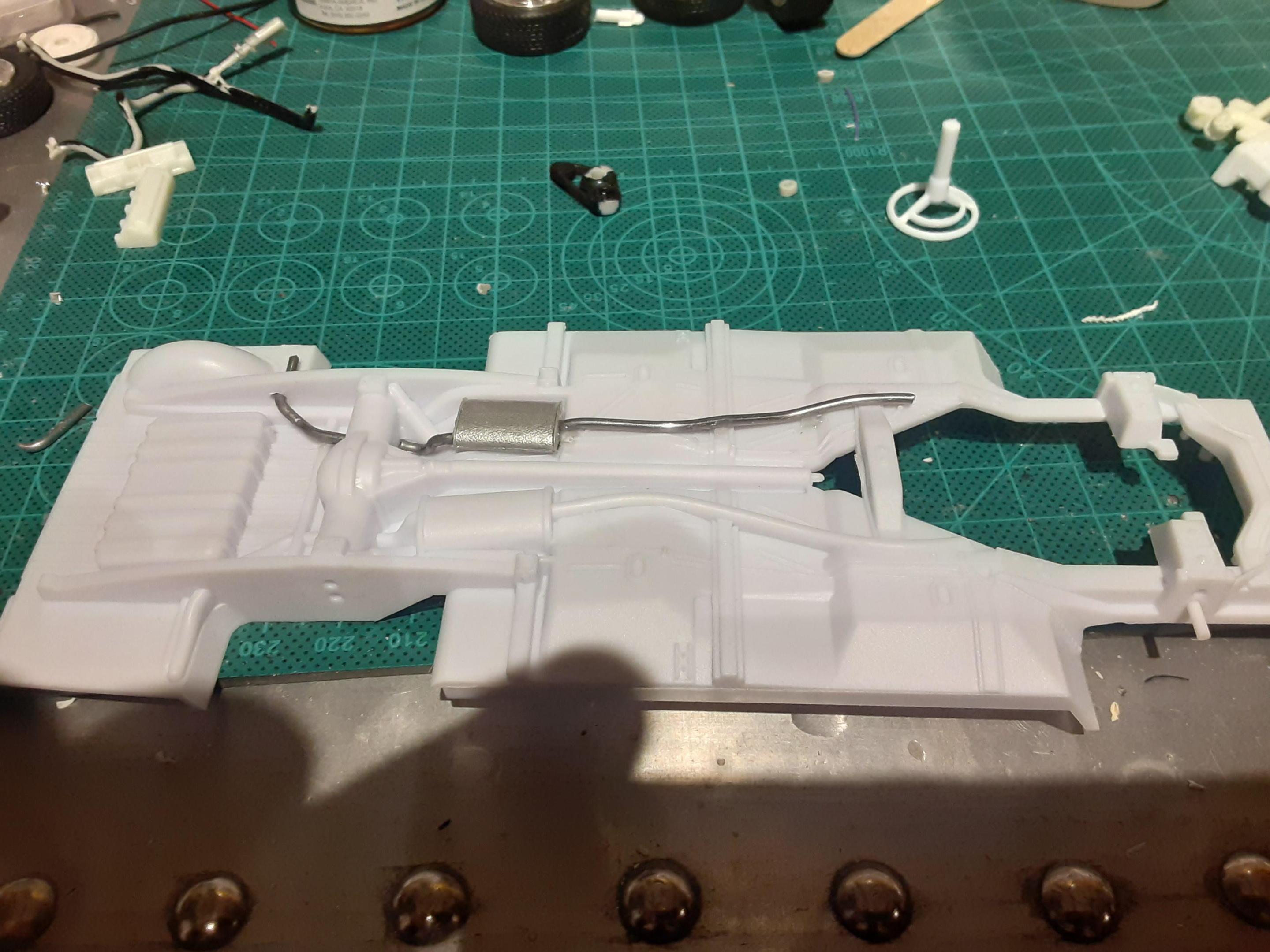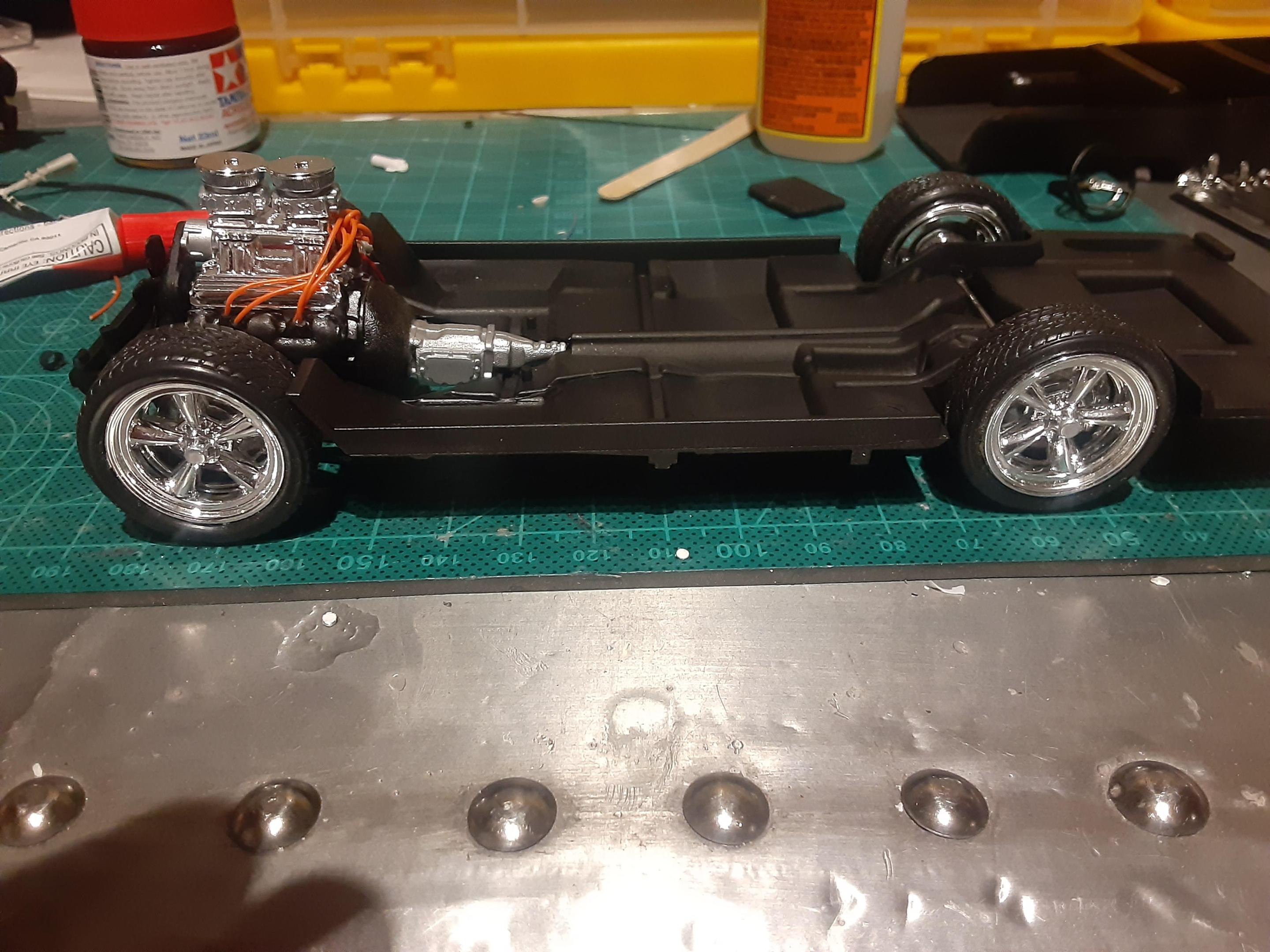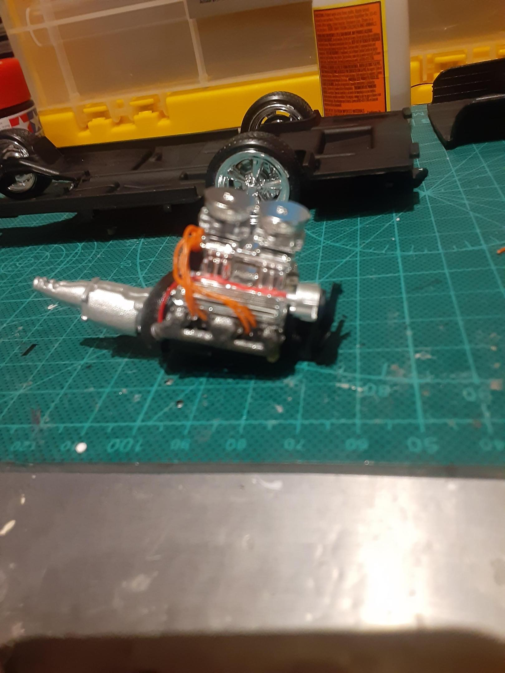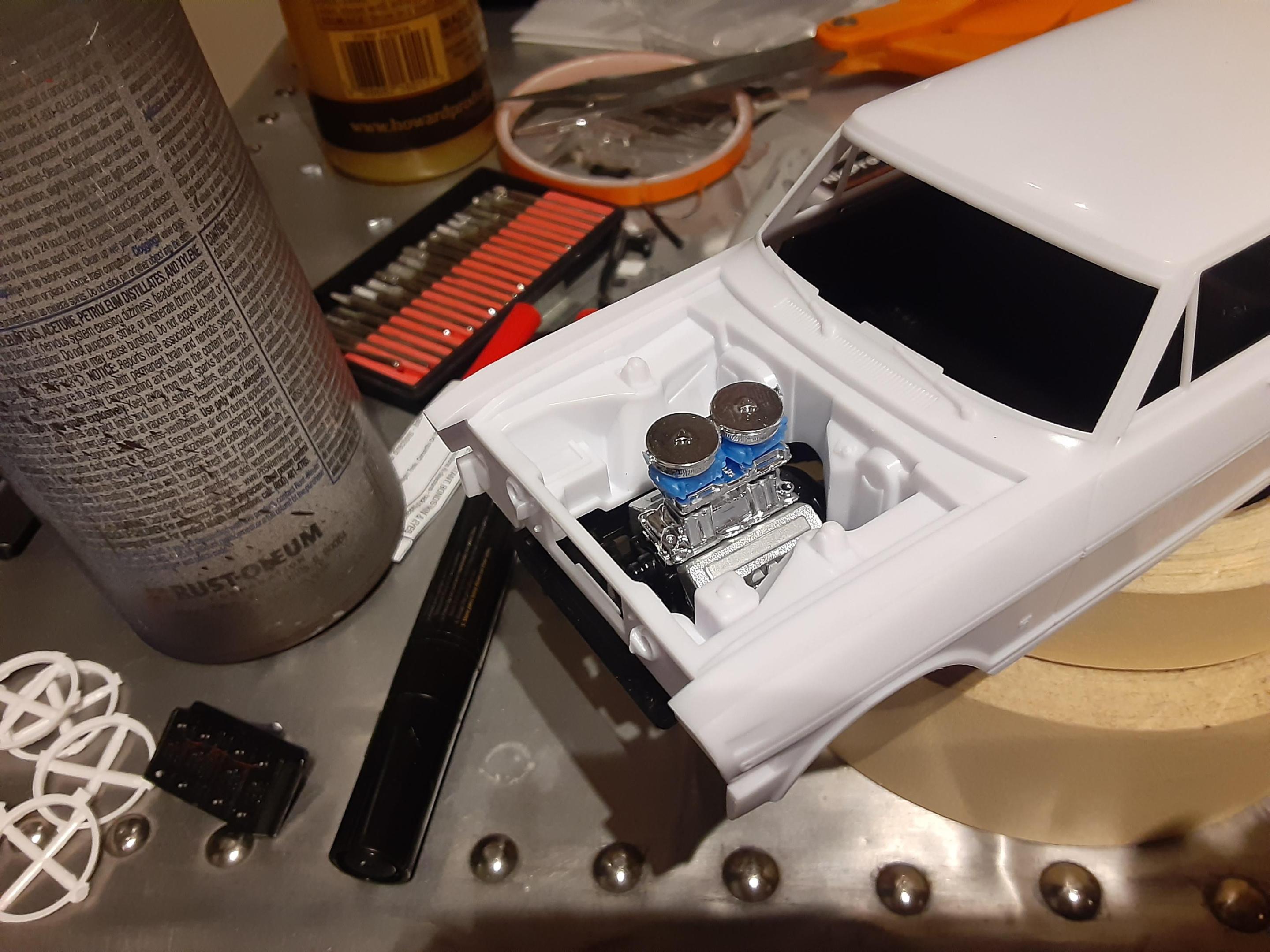 Building this one for a friend. I used the nova wagon that donated its drivetrain to my camaro project, and used the sbc from the camaro in the nova. I swapped the intake for a weiand high rise i had from a 66 nova, parts box pulley and belts. I ended up adding a second exhaust pipe since the chassis had one molded in it for the 6cyl. The 20inch torque thrust wheels are modified ones from a revell pickup kit.