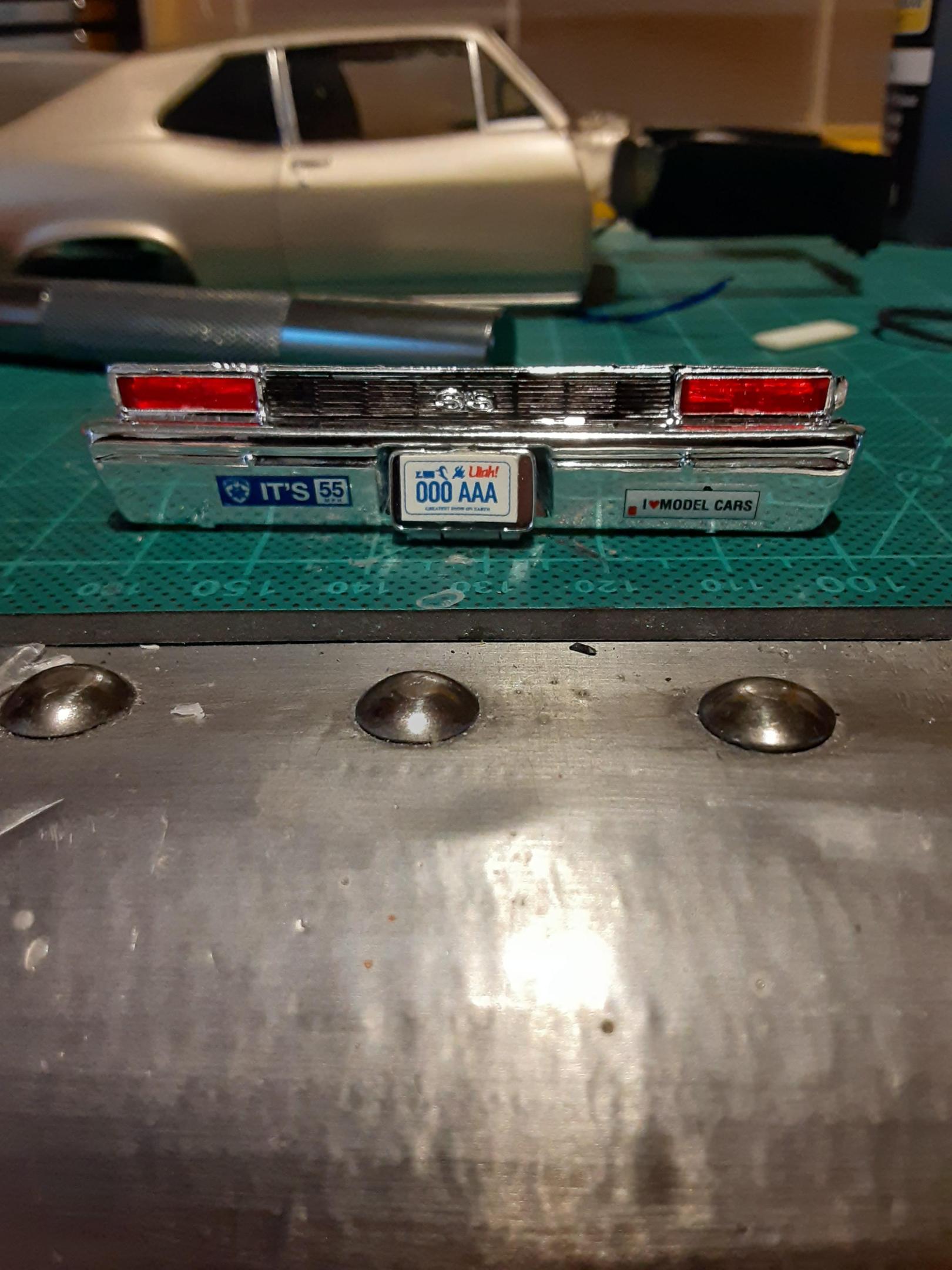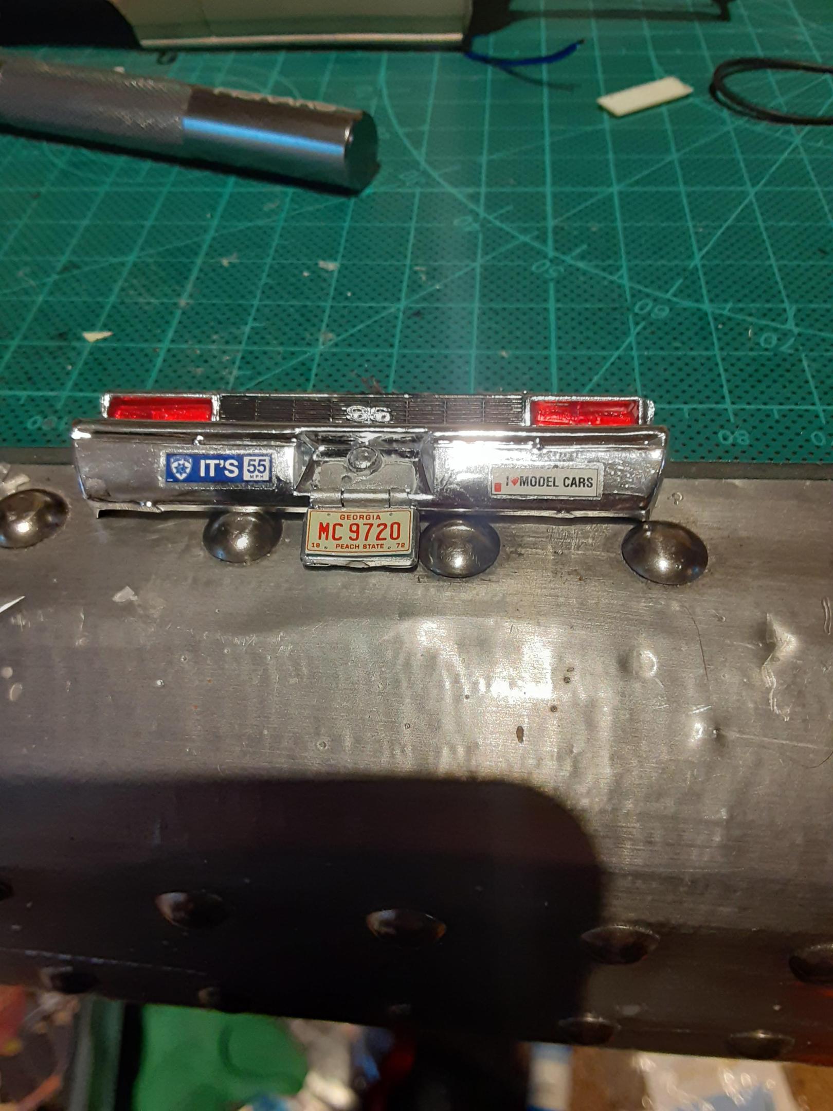 Got the rear bumper done. Parts box bumper stickers,( the ITS 55 sticker is fitting because the cannonball was started in protest of the 55mph speed limit). Made the flip down license plate bracket and fuel cap. Utah plates because thats where i live. I borrowed an idea from the moon shiners of the 40s and added the second plate when the brackets flipped all the way down