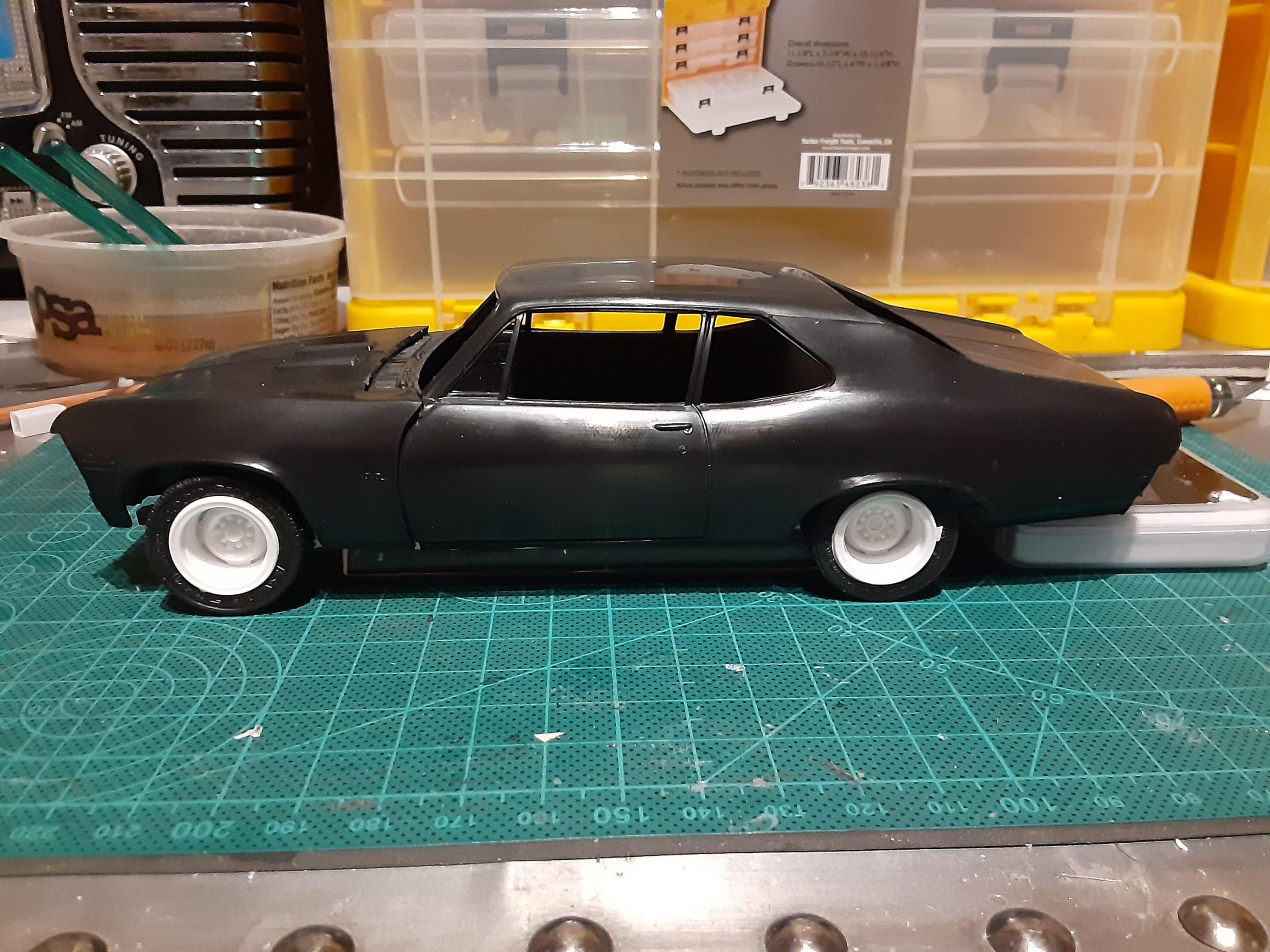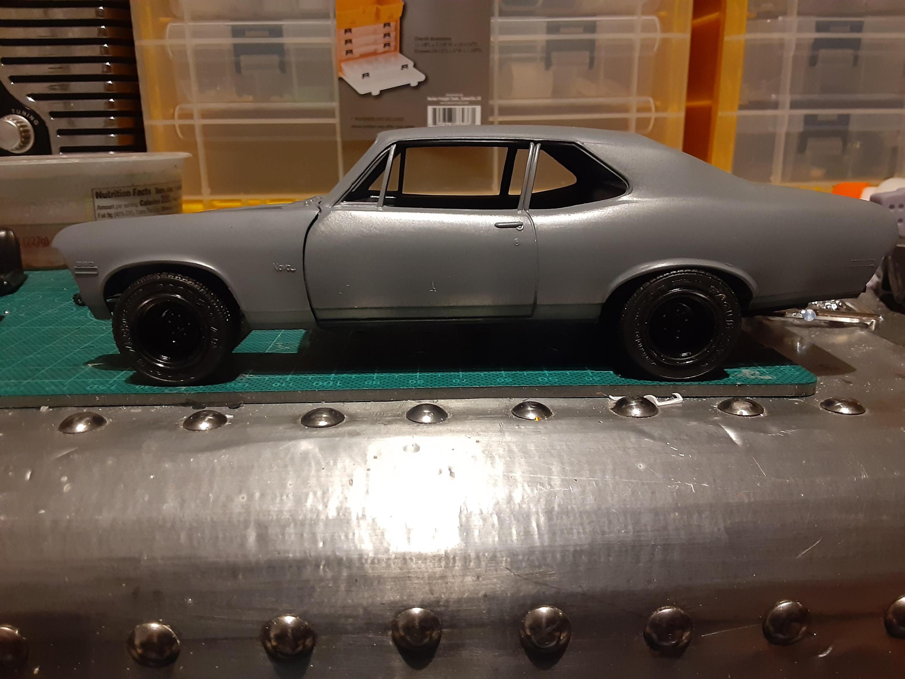 Decided to enter my first community build off with this nova. Decided to build the car as if it was a real cannonball car so gonna try to build it some what sleeperish. Started mocking up the car to decide the wheel and tire option