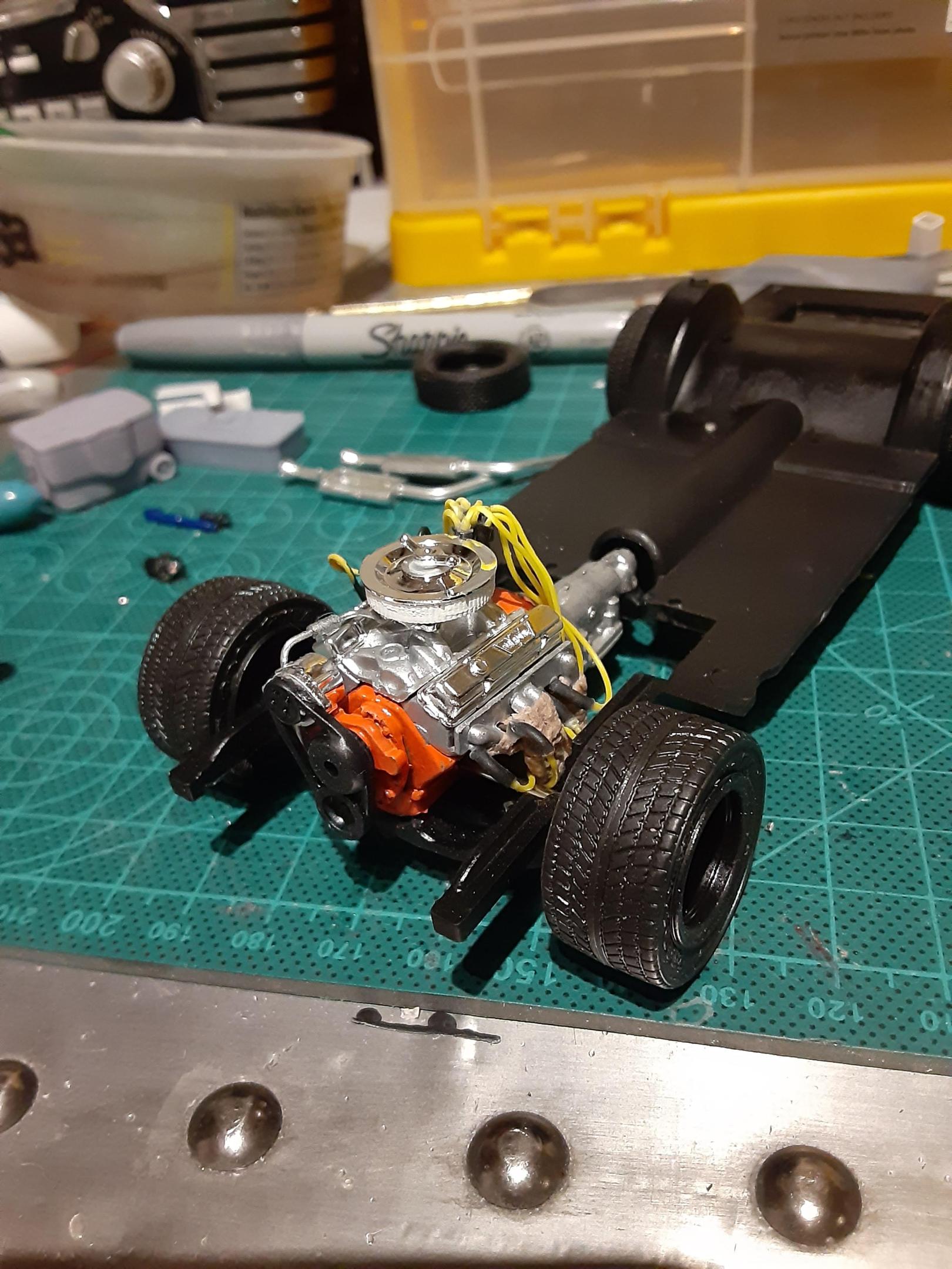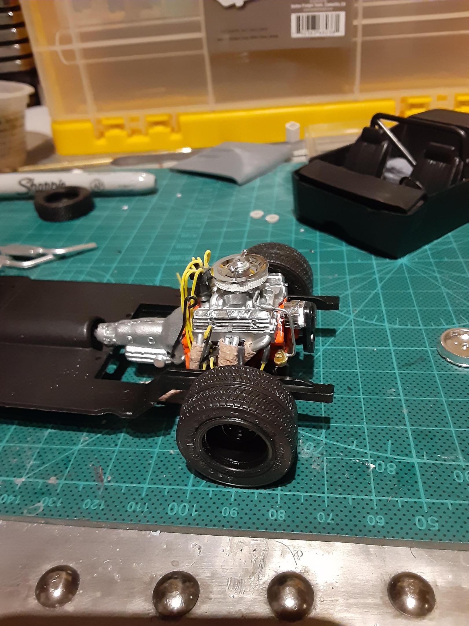 Got the engine built. Parts box headers i wrapped, parts box valve covers, High rise intake, and carb. Also added wiring, fuel line, and dip sticks.