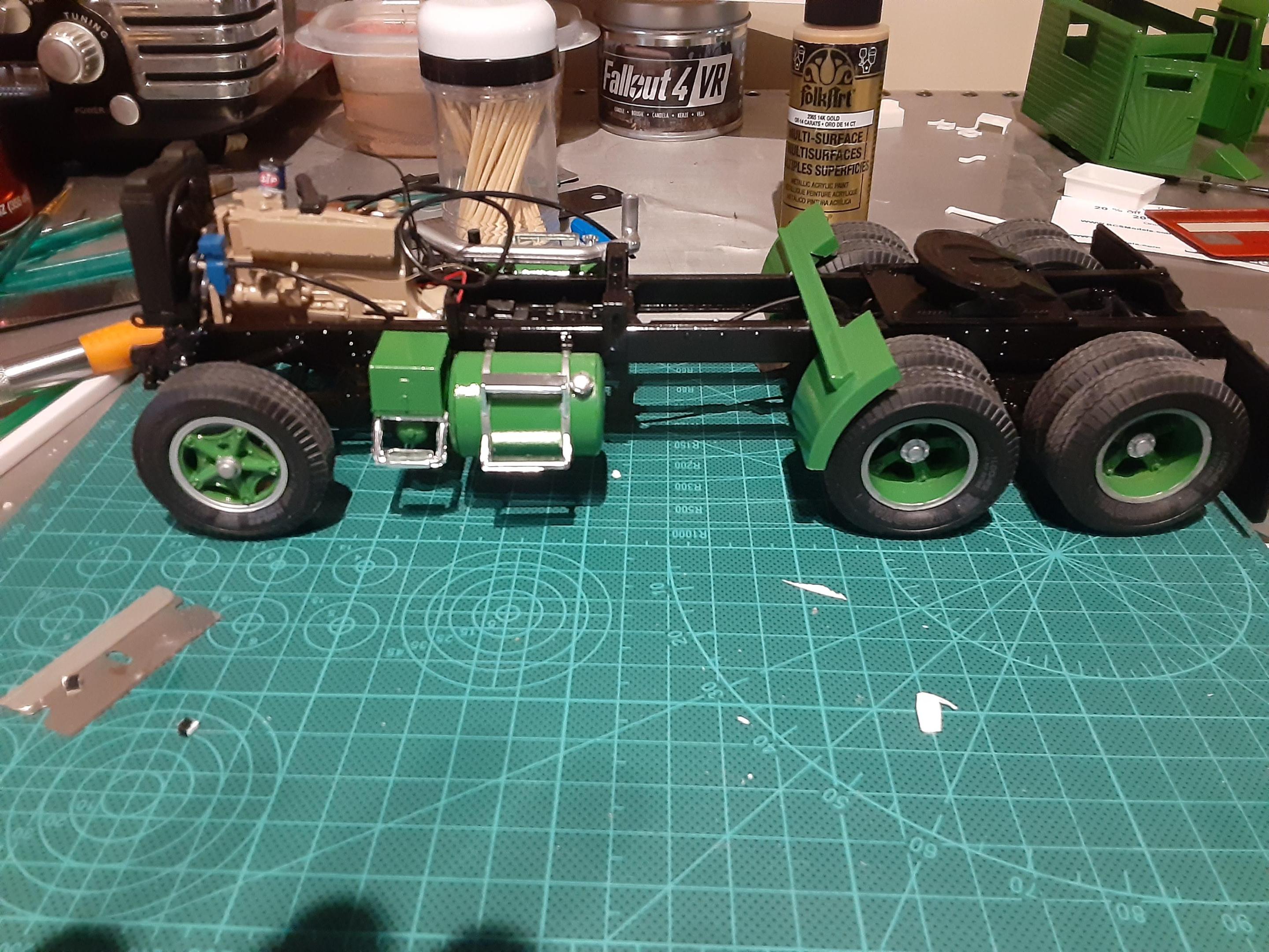 Had a busy weekend. Got the cab, hood and sleeper painted, ill let them sit for a few days before i put the decals on and clear coat. Chassis is all put together as well.