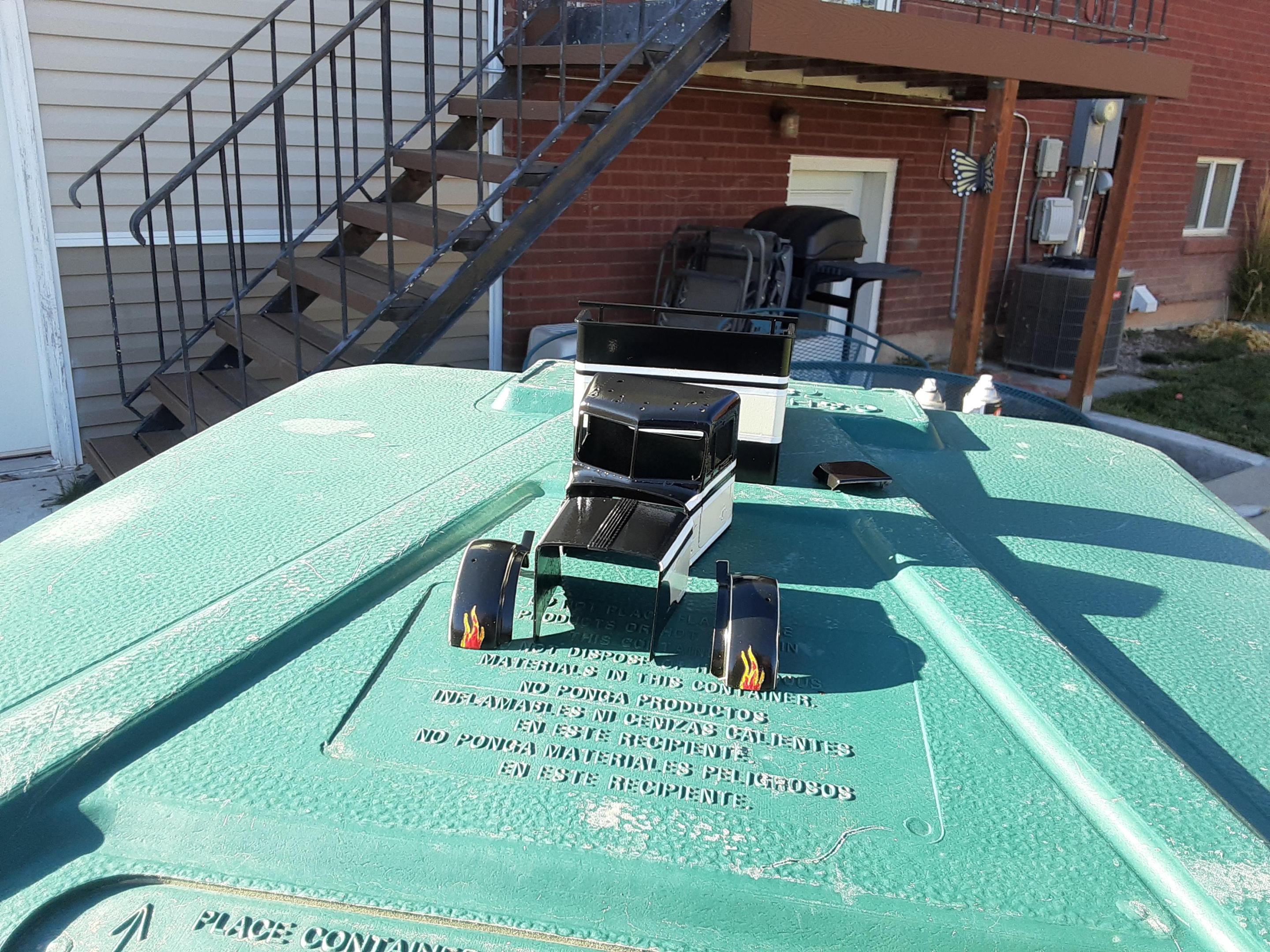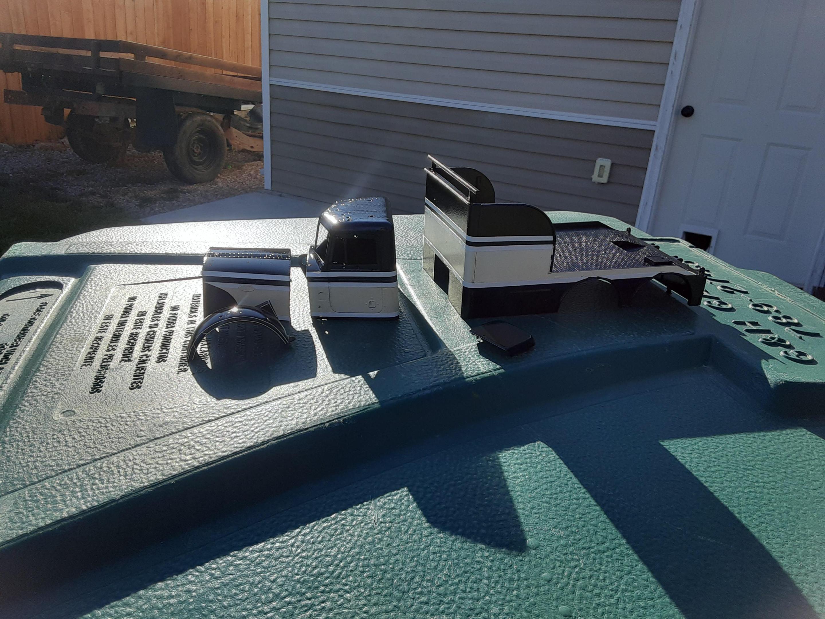 After finding some instructions online, i discovered the wrecker bed was complete and decided to build the truck as such. Luckily the original builder had started on the bed and painted the beige part first. After carefully removing the old tape adhesive. I retaped the bed,cab, and hood sprayed the black,added the white pinstripes and cleared it. -