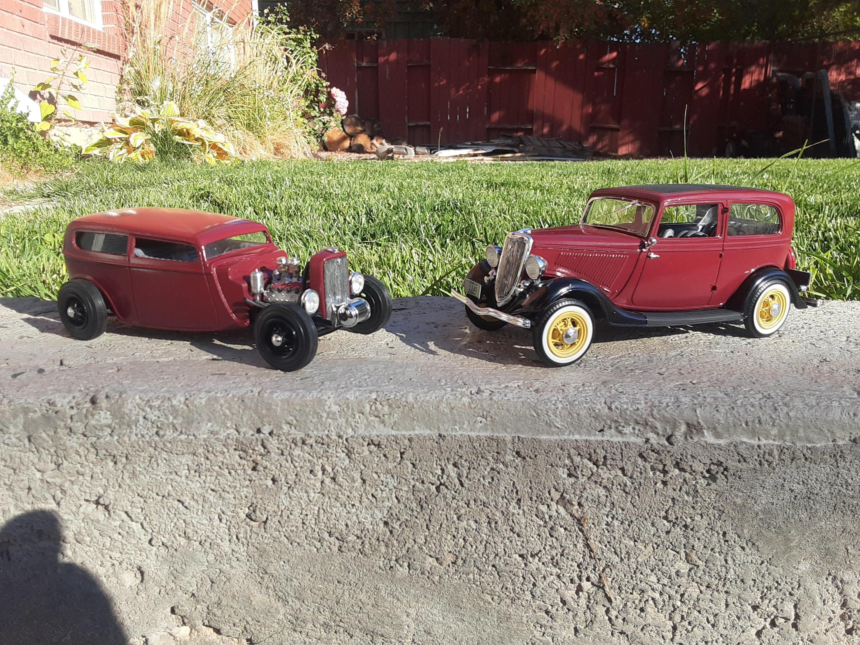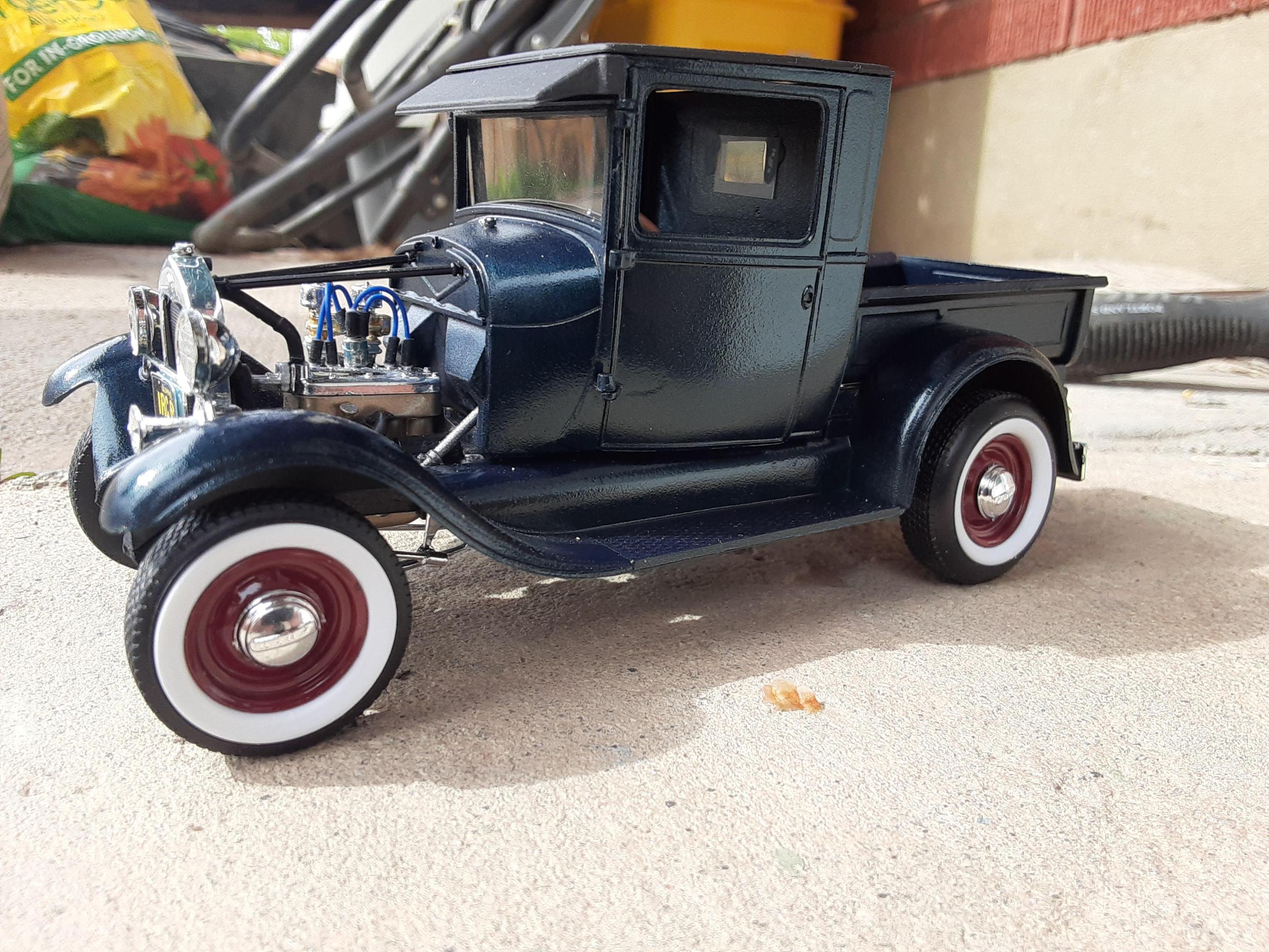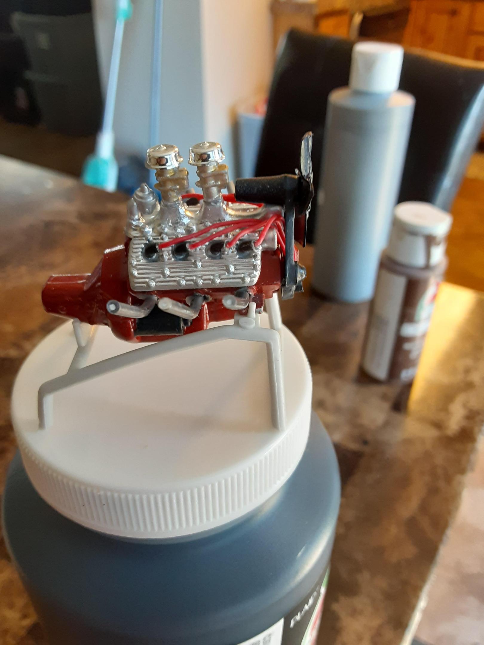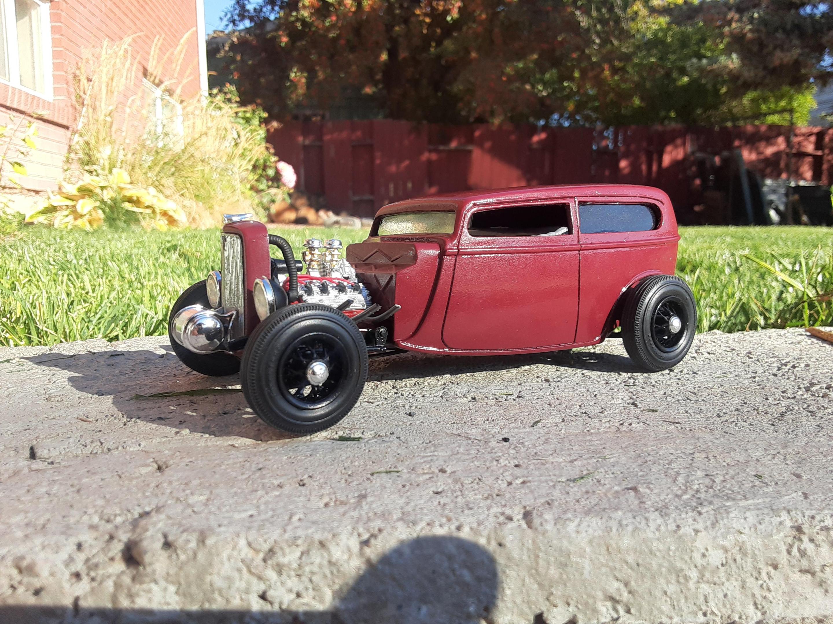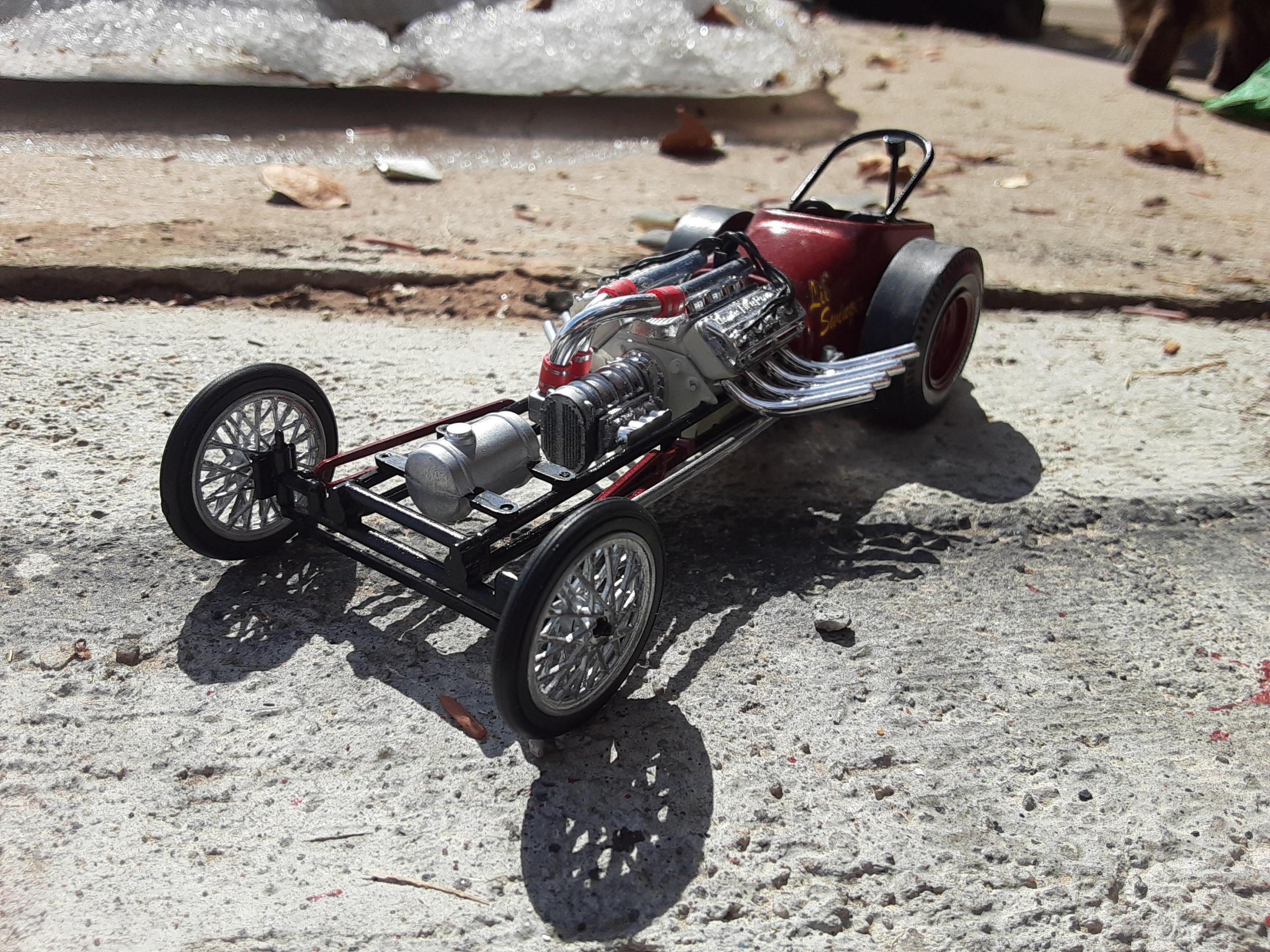 Decided to build a flathead v8 as well. I found a '34 ford kit at an antique store for under 4 bucks, aside from a few pieces being painted it was complete. The engine is from a different revell kit, the heads and intake from the parts box, home made headers. The body is a jimmy flinstone 34 ford i had intended for a different project but didn't use. An iceman quick change rear, the rear cross member and buggy spring are from a 29 ford donor kit. -