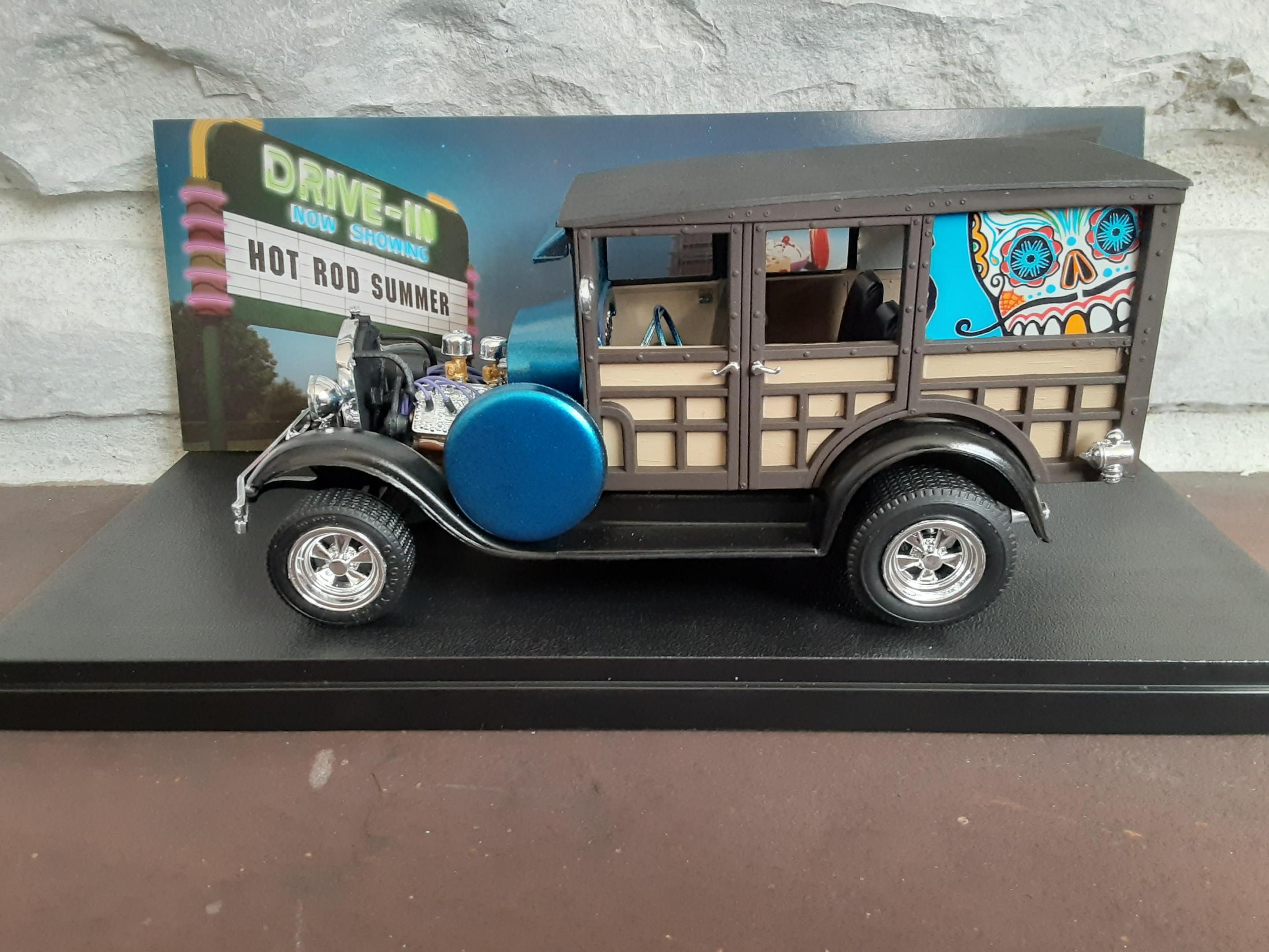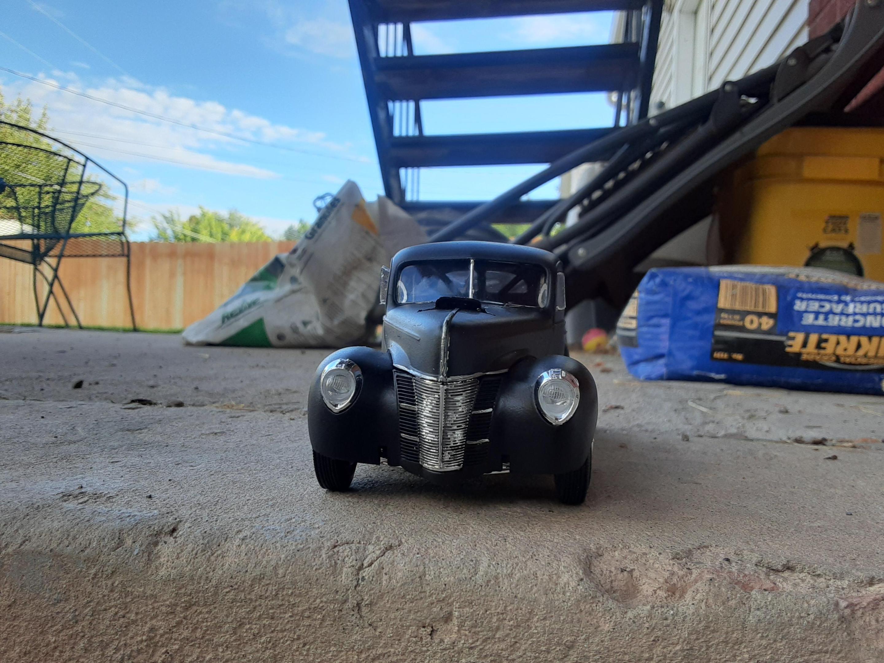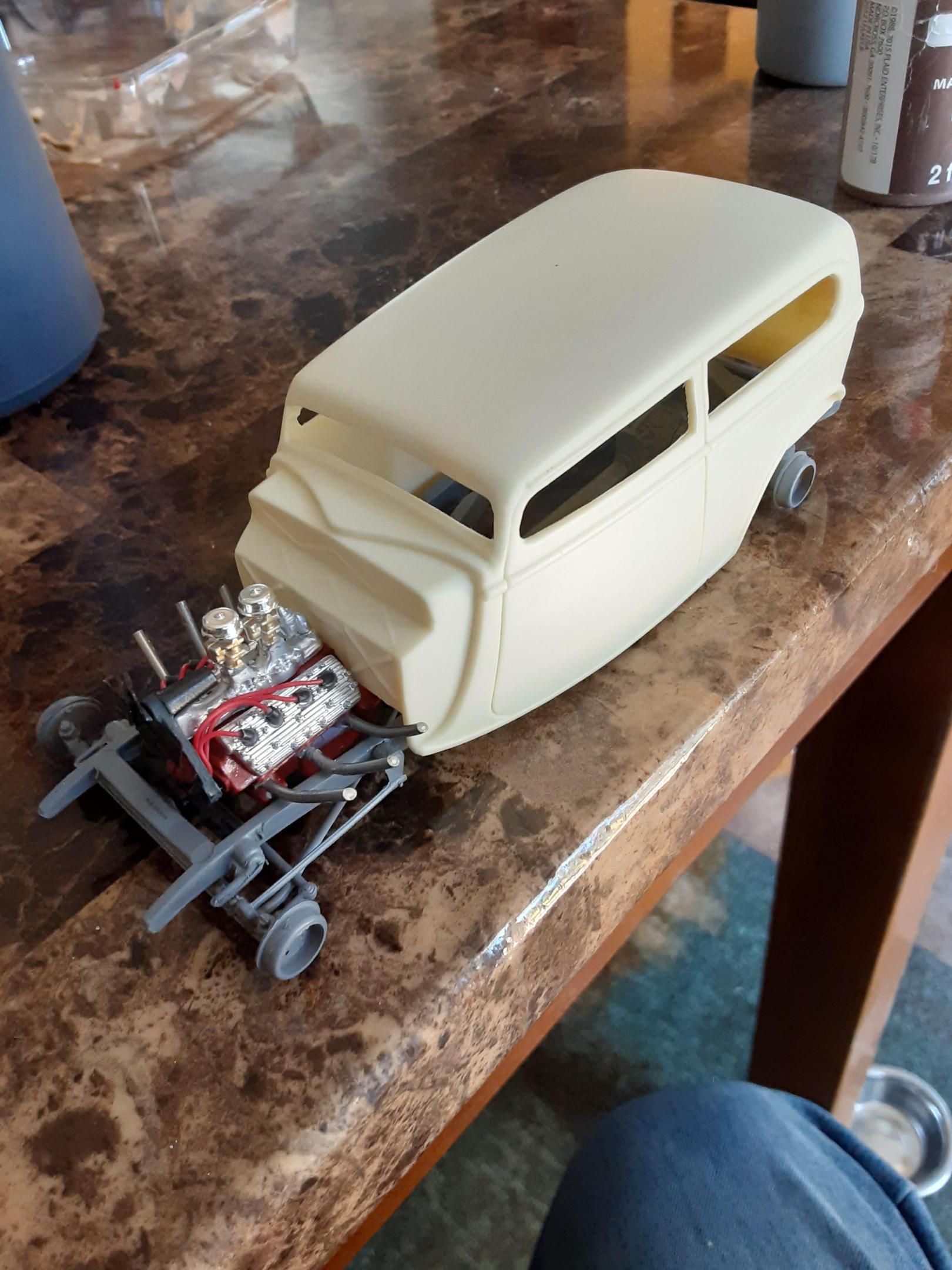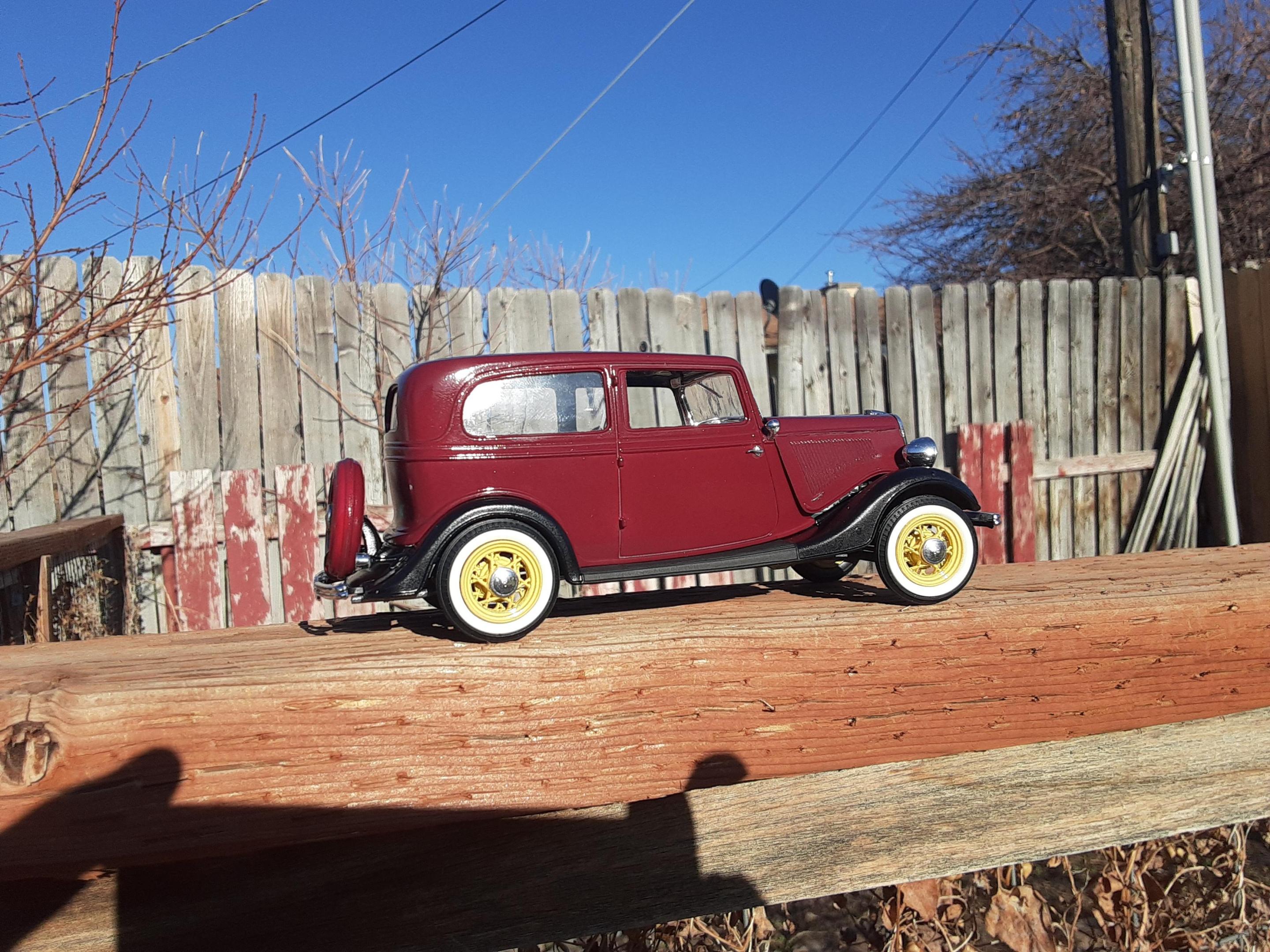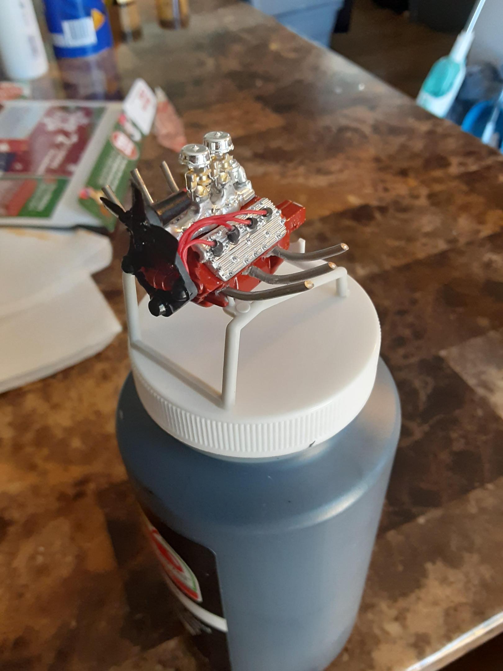 Decided to build a flathead v8 as well. I found a '34 ford kit at an antique store for under 4 bucks, aside from a few pieces being painted it was complete. The engine is from a different revell kit, the heads and intake from the parts box, home made headers. The body is a jimmy flinstone 34 ford i had intended for a different project but didn't use. An iceman quick change rear, the rear cross member and buggy spring are from a 29 ford donor kit. -