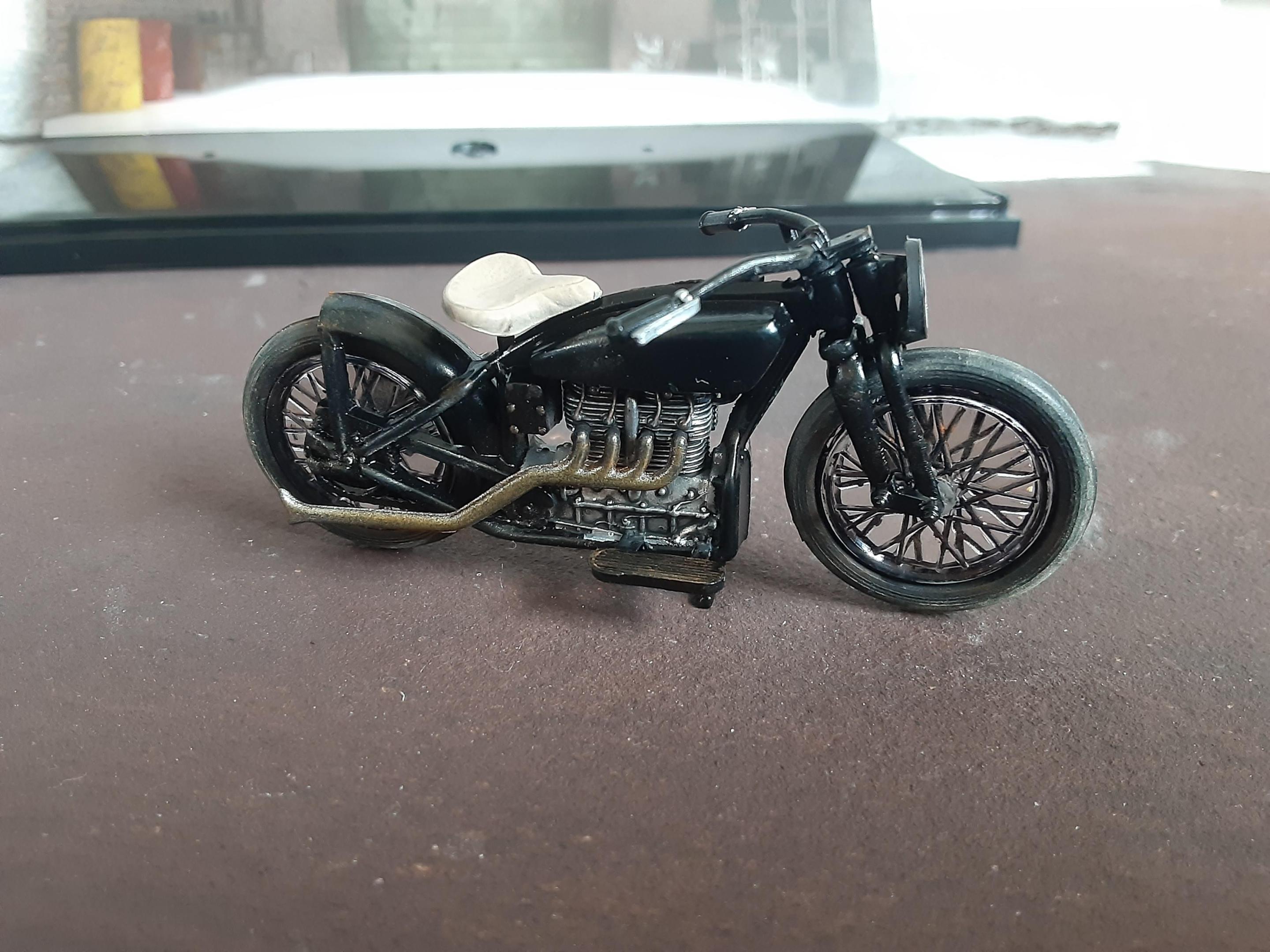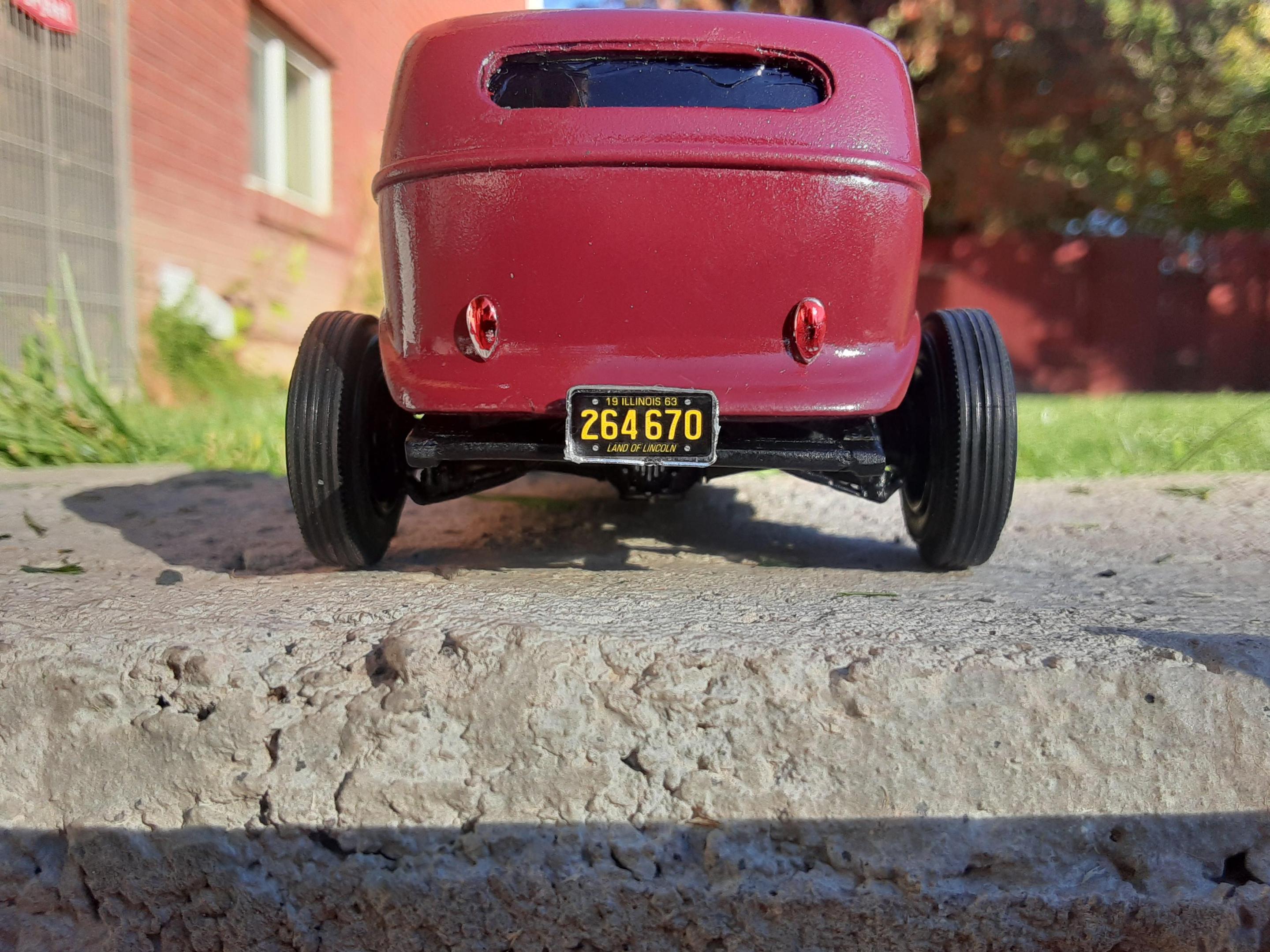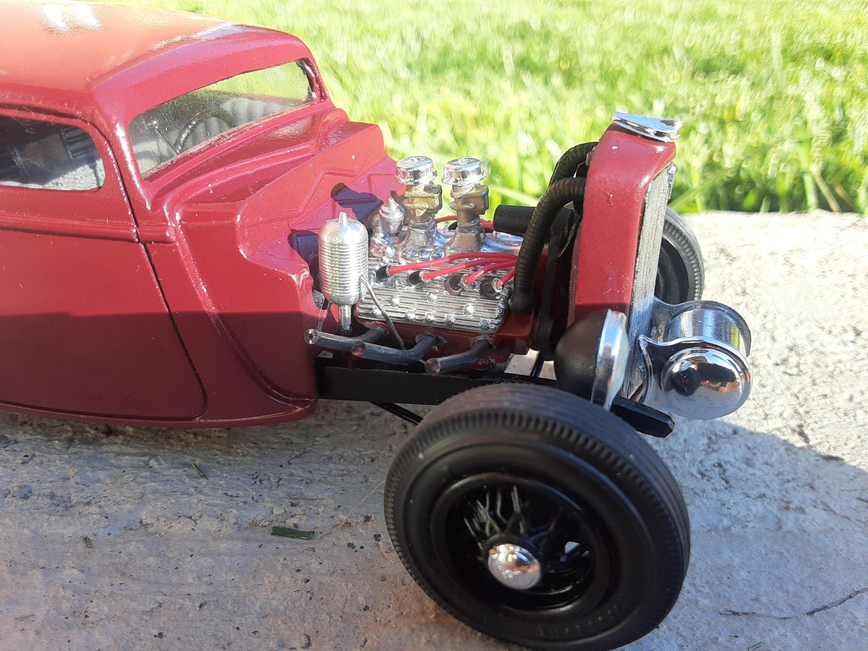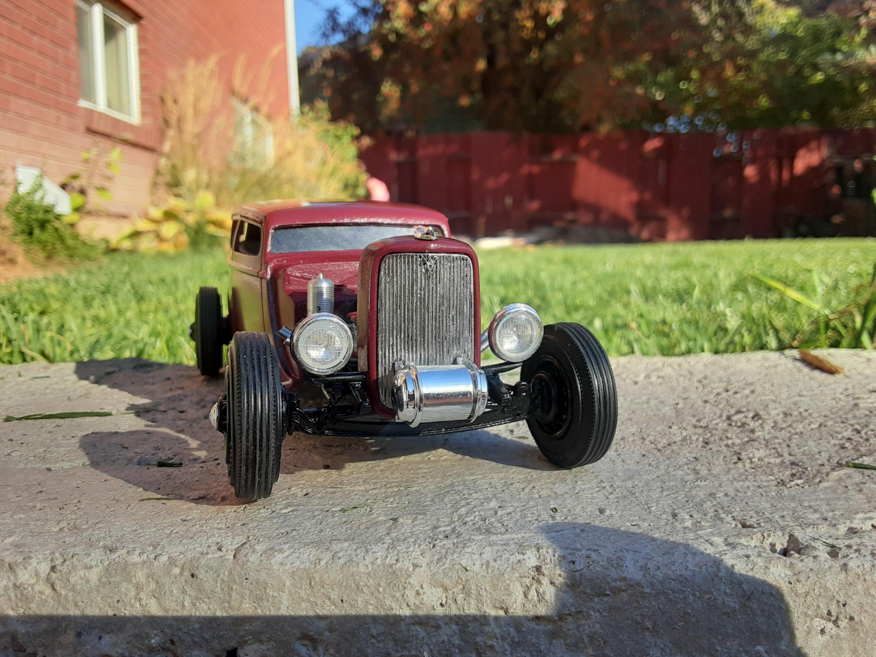 Got this one finished this morning. The frame frame and wheels are from a lindberg '34 ford pickup. Used the optional lowering front axel. The rear axel is an iceman quick-change. I used the buggy spring and rear frame cross member from a revell '29 ford ratrod kit. The engine is a parts box special, wired up with "parts by parks" oil filter. The headers are solder wire. Scratch built interior tub, the door panels are made from a t-bucket tub, seats from the 29 ford rat rod kit, 34 pickup dash, and a '39 ford steering wheel. Tear drop tail-lights, '34 ford truck grill and headlights, moon tank, jimmy flinstone body -