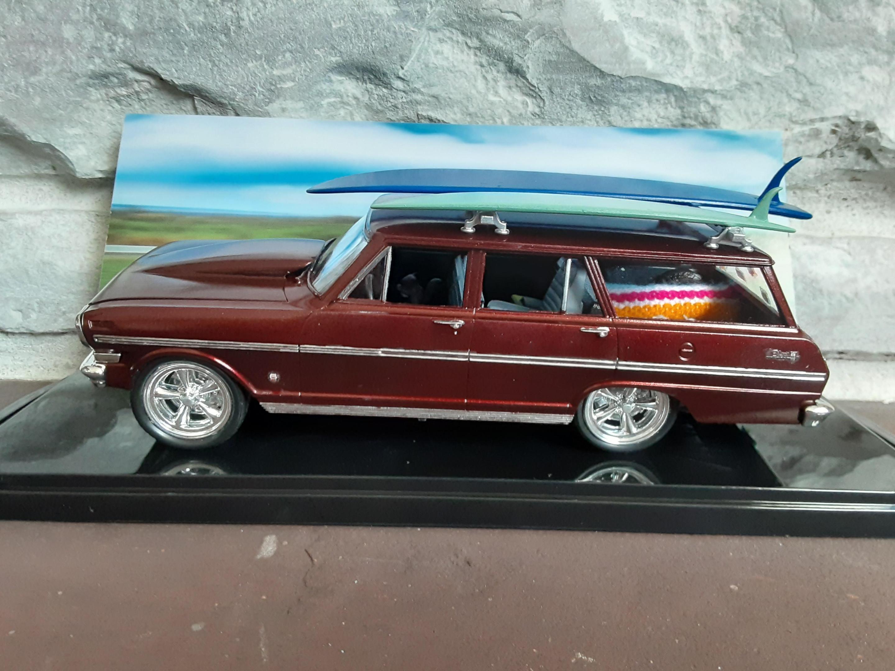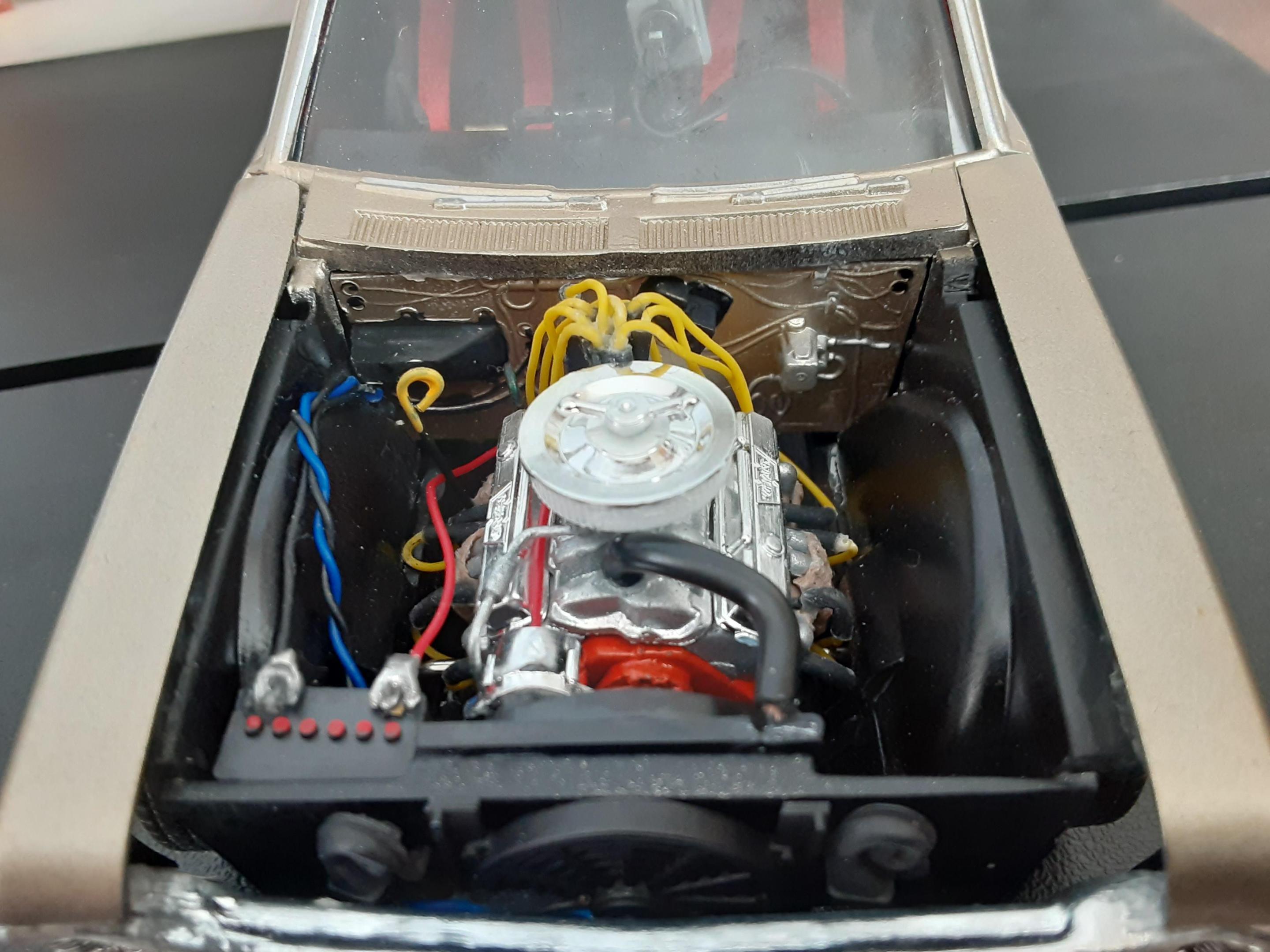 72 nova ss. I decided to run the optional small block (i figured it could represent a 383)for a little bit better fuel mileage. I used a high-rise intake, carb, air filter, headers, and valve covers from my parts box. Also added an electric fan, wiring, fuel line, and dip-stick. The chassis is mostly stock, i did add traction bars to the rear. I tried to emulate old school nascar style with the shorty side exit exhaust and wide steel wheels at all four corners. On the exterior i added a lift off cowl hood from ebay. The chin and deck spoilers i made. The rear license plate flips down like on the real cars to expose the stock fuel neck. Theres also a "fake" license plate to hopefully throw off pursuing officers. The drivers quarter window houses the fuel cell filler neck. I didnt want a "loud" color, so i went with toyota metallic beige. The interior is where i put in the most work. On the dash i scratch built a radar detector, gps, switch panels to switch between fuel tanks, tail light killswitch,cb radio, and the flip down plate. The stock front seats were swapped with generic racing seats and harnesses. On the passenger seat is a lap top for the passenger to help avoid the cops and any traffic jams. I used the kits roll bar behind the front seats. In place of the rear seat is a fuel cell i modified to straddle the drive shaft tunnel. Also added a fire extinguisher, coffee cups and a "pee bottle" to avoid extra stops lol. -