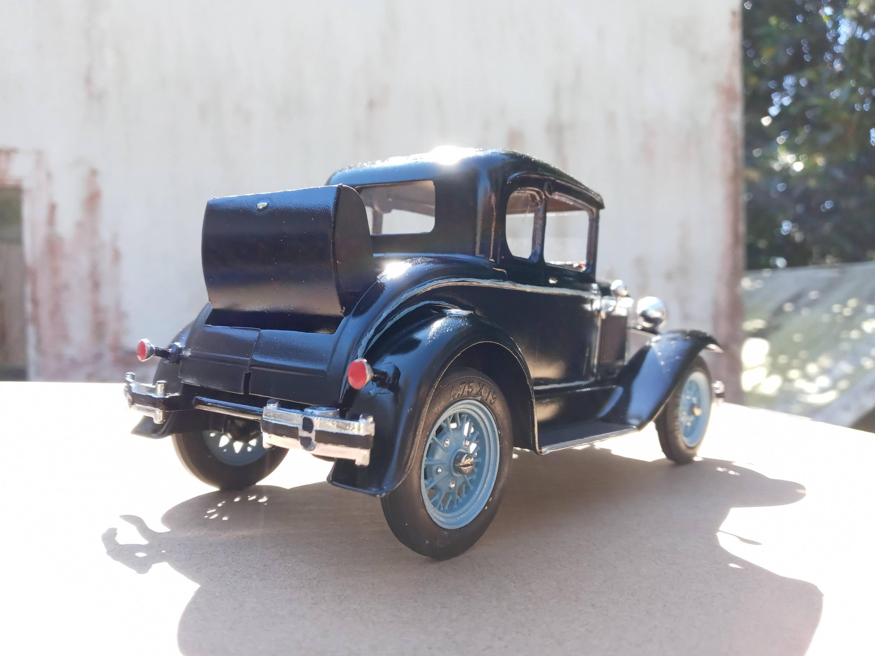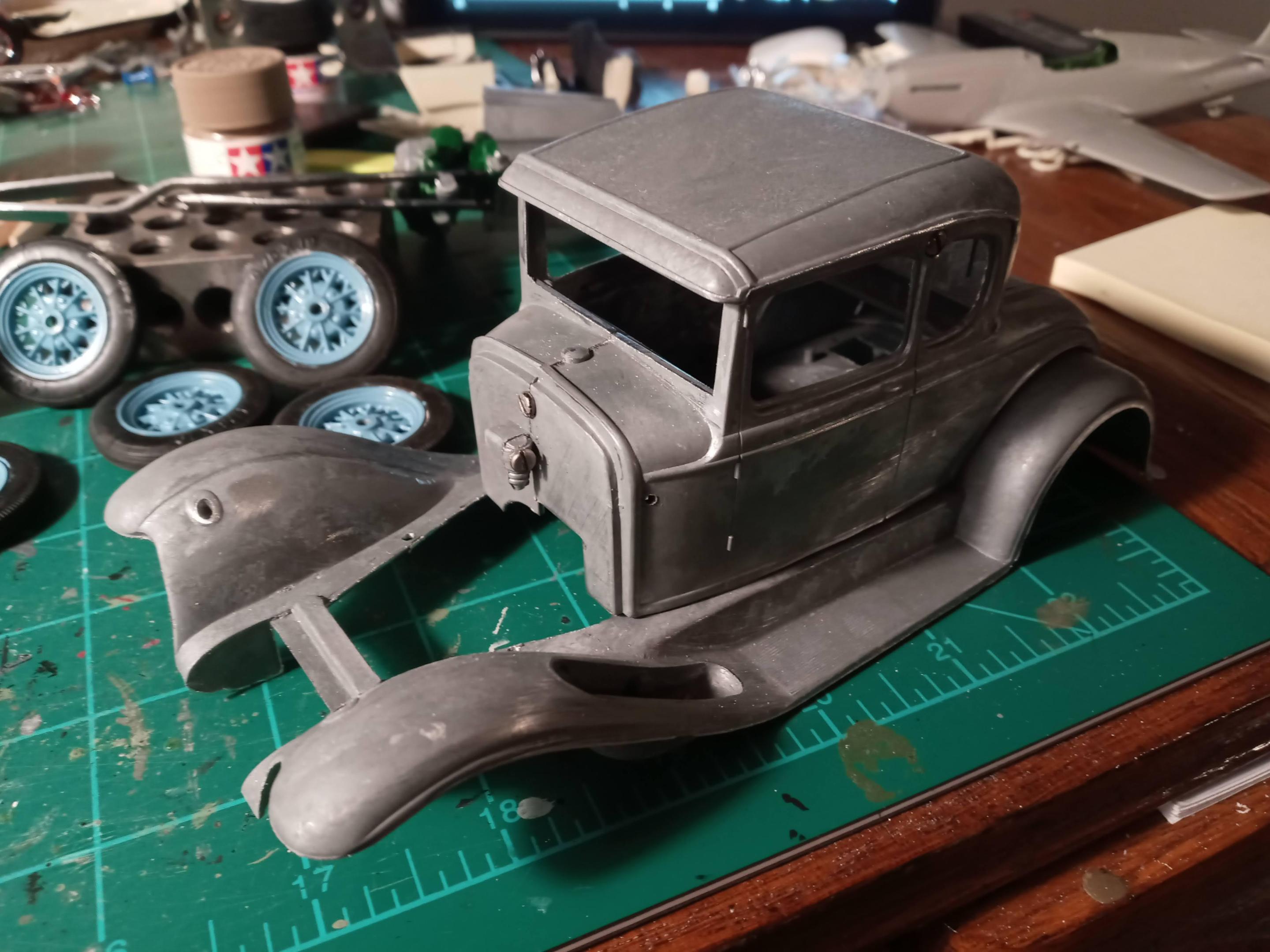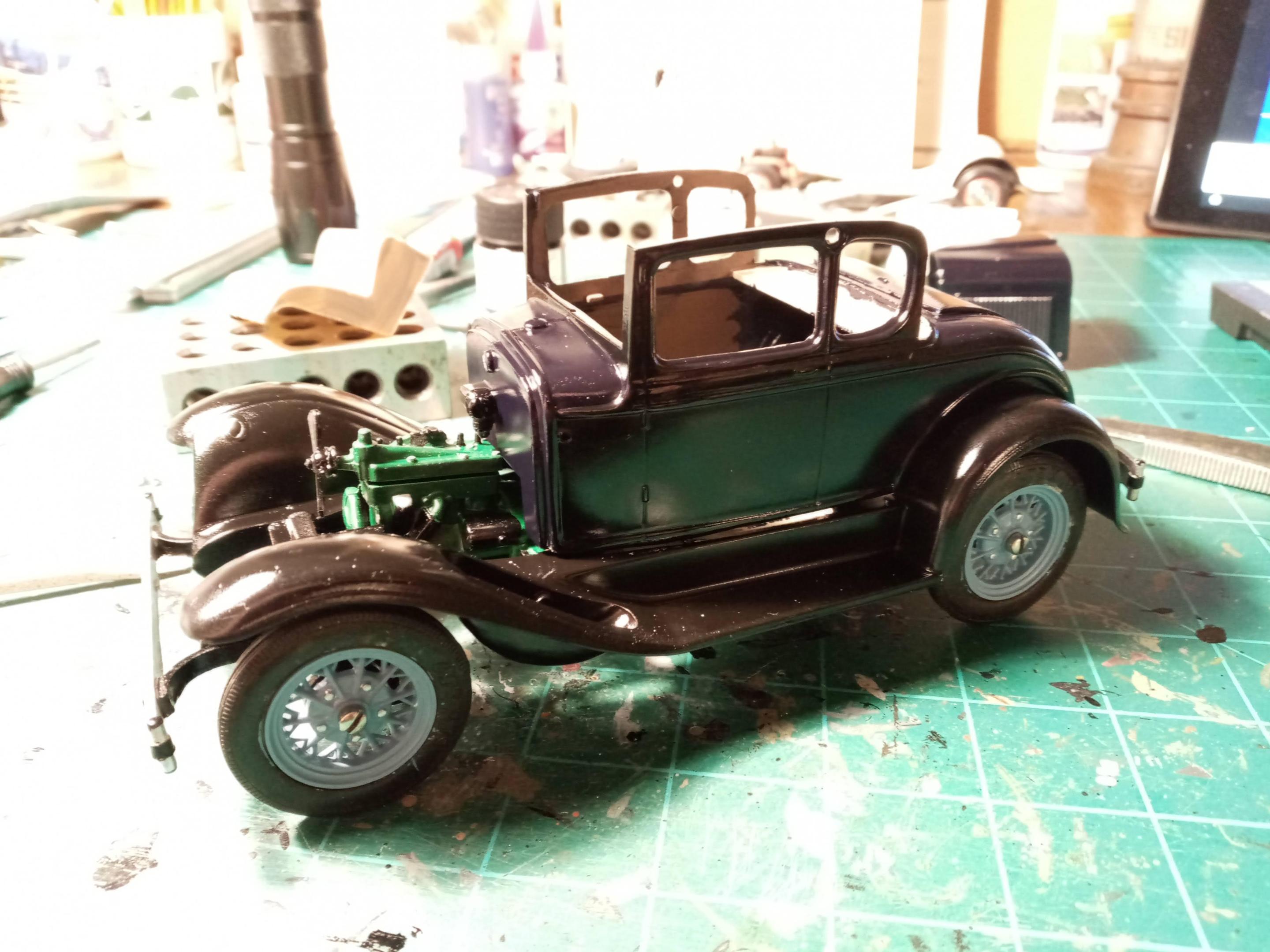 After an hour or so of trimming the flash and rough sanding/filing, it's starting to look pretty good. Looking at the colors for 1930, I'm going with Andalusite Blue which is a very deep dark blue- almost black until you get in full sun. I've painted a few 1:1 Model A's in this color and it's really a nice deep blue.