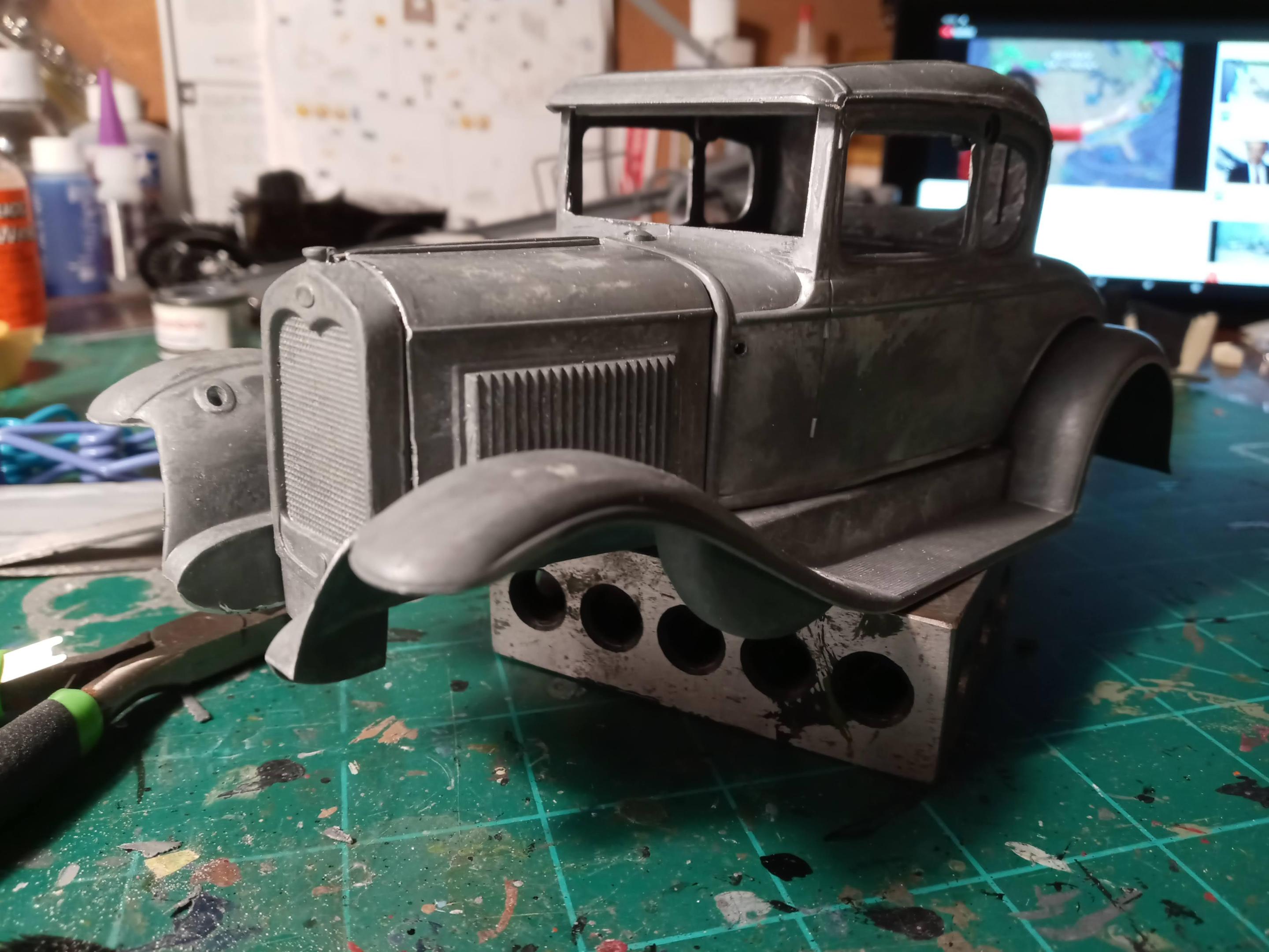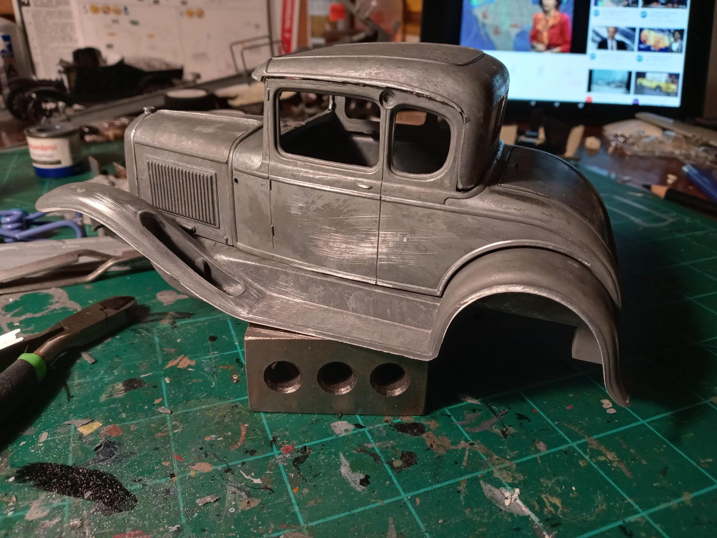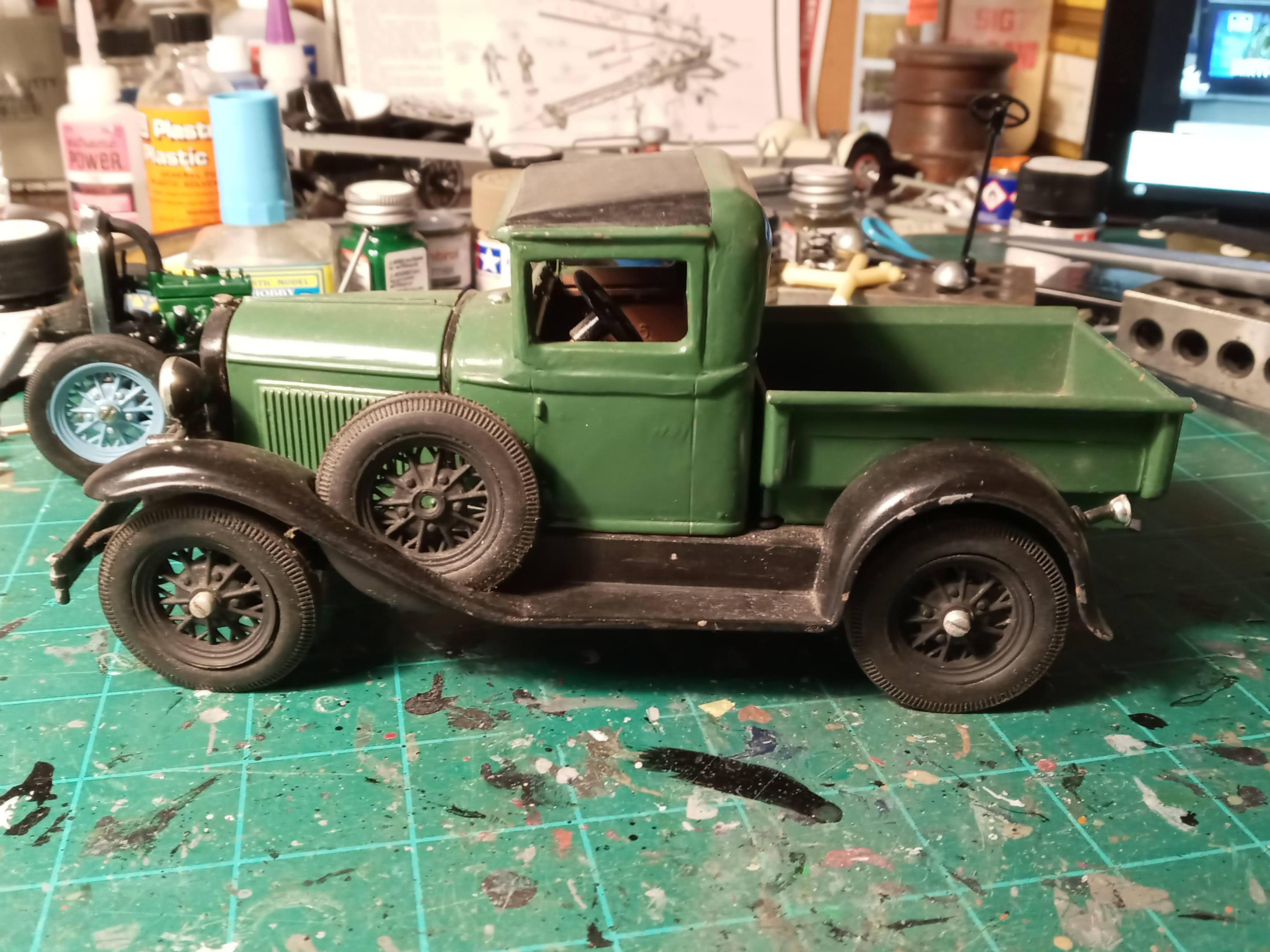 After an hour or so of trimming the flash and rough sanding/filing, it's starting to look pretty good. Looking at the colors for 1930, I'm going with Andalusite Blue which is a very deep dark blue- almost black until you get in full sun. I've painted a few 1:1 Model A's in this color and it's really a nice deep blue.