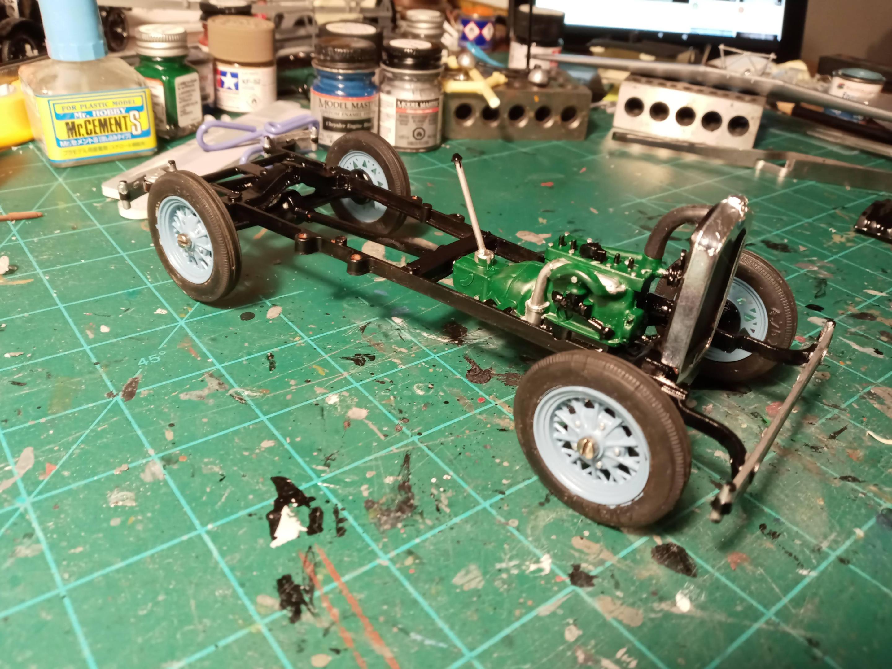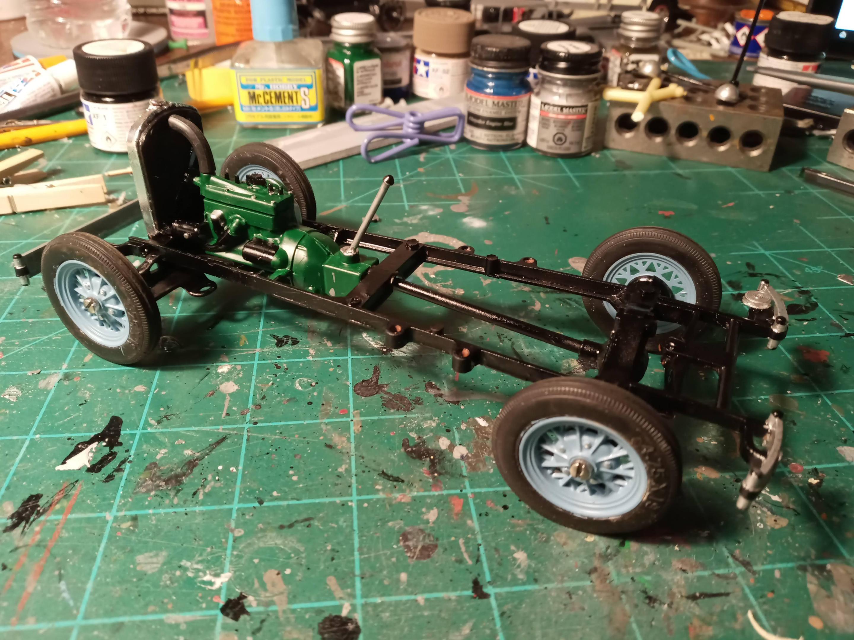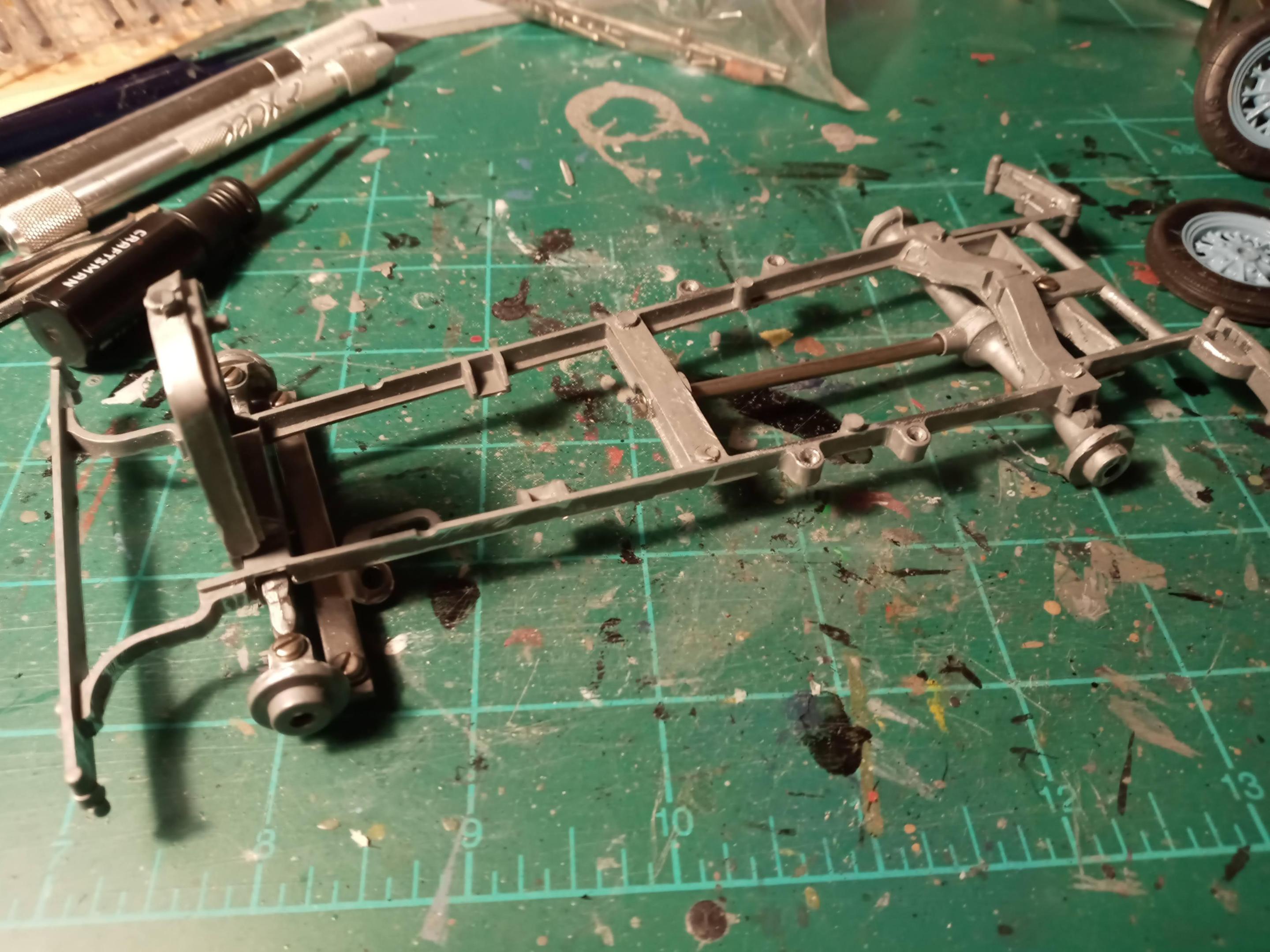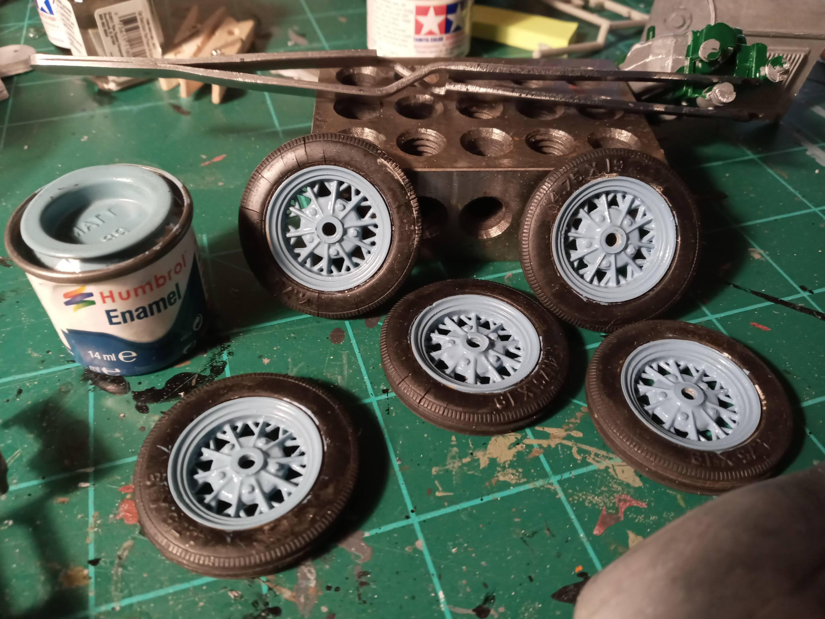 It's cool to see so many others with similar memories as mine! Not much to report, a bit more filing & sanding. Screwed the chassis together and painted the wheels. The tires were rock hard and didn't want to risk breaking them or the wheels so I painted the wheels with the tires still attached. Humbrol 89 is close enough for Hessian Blue for me. May shoot some primer tomorrow and see how everything looks.