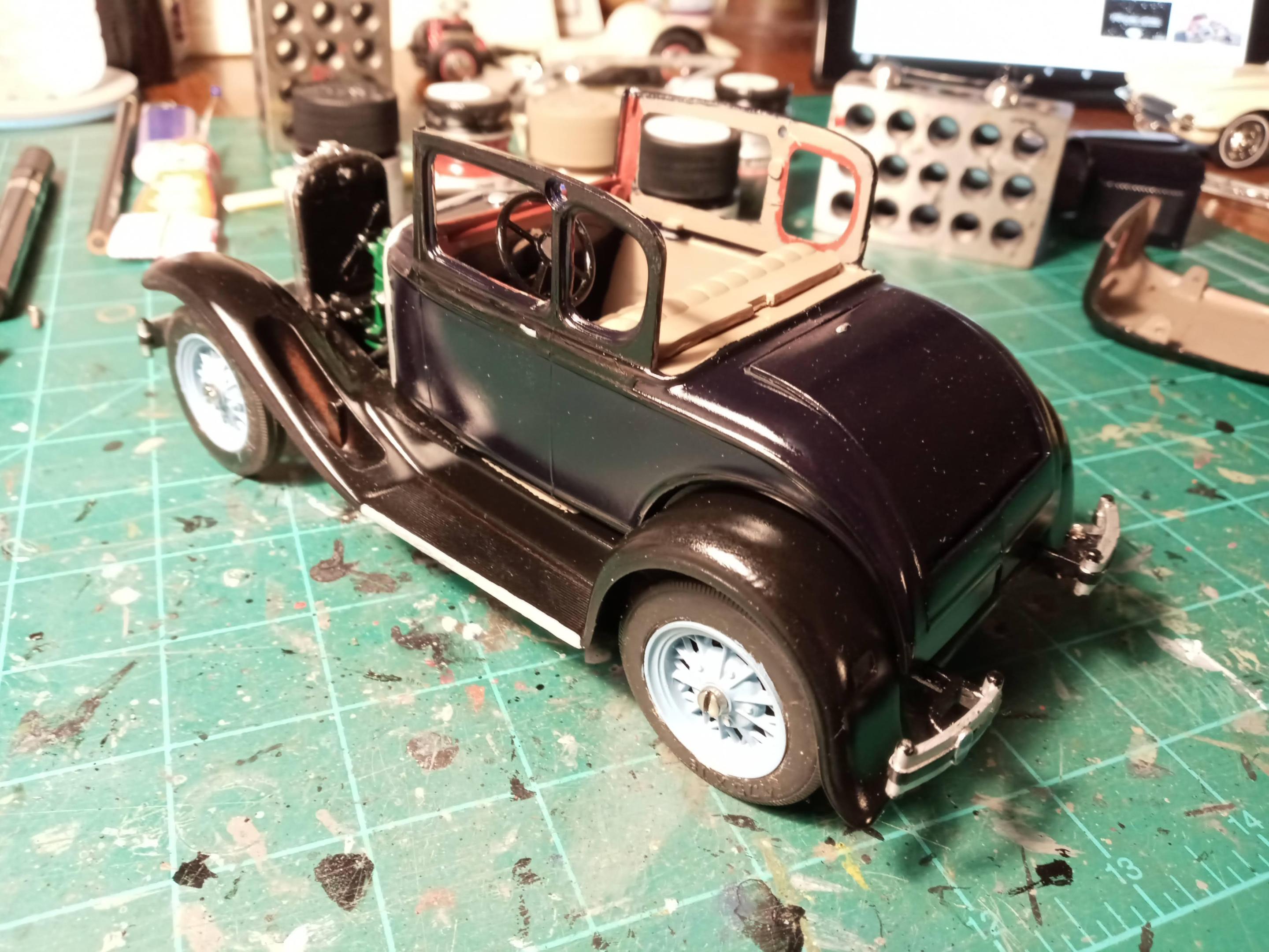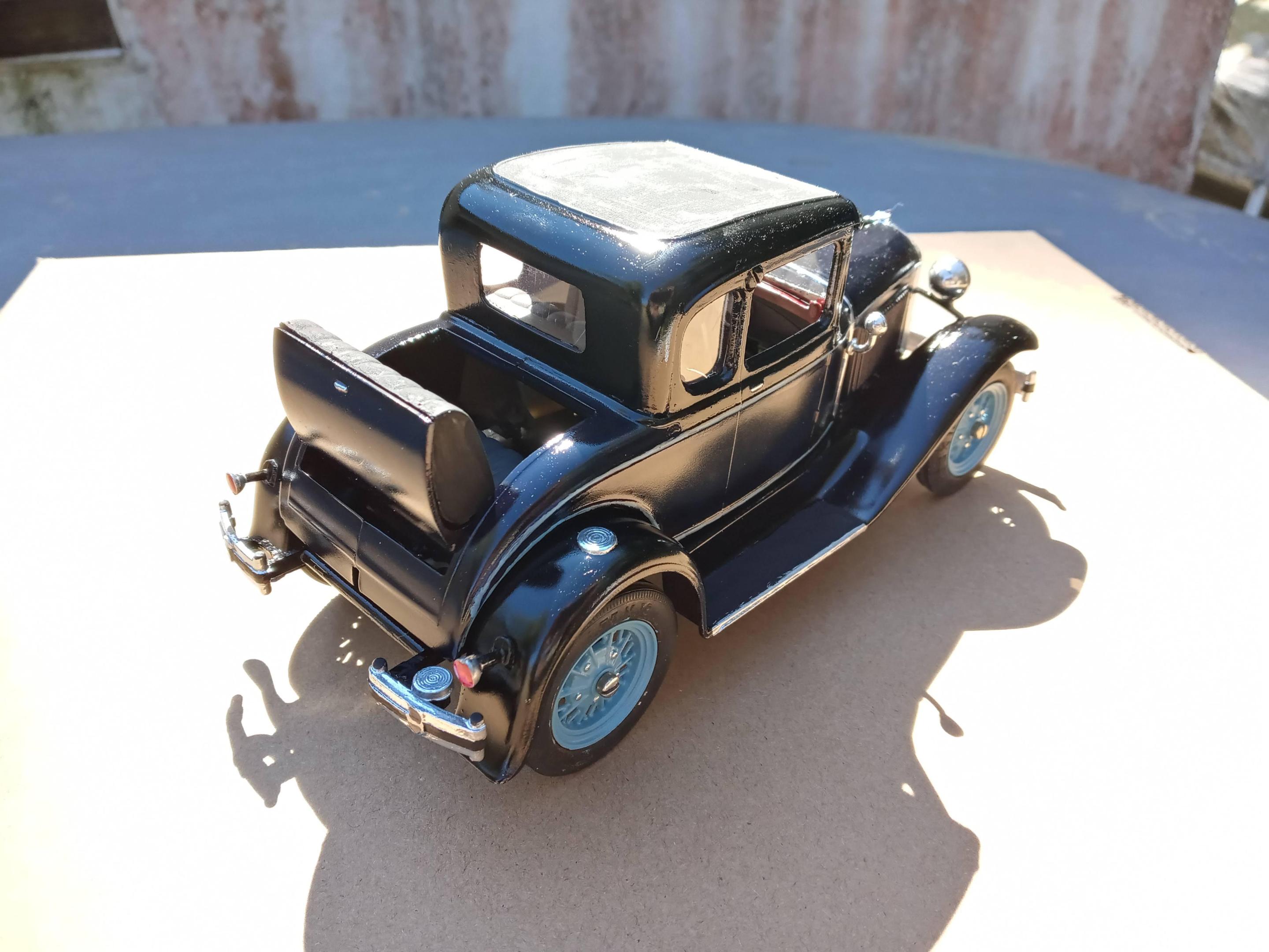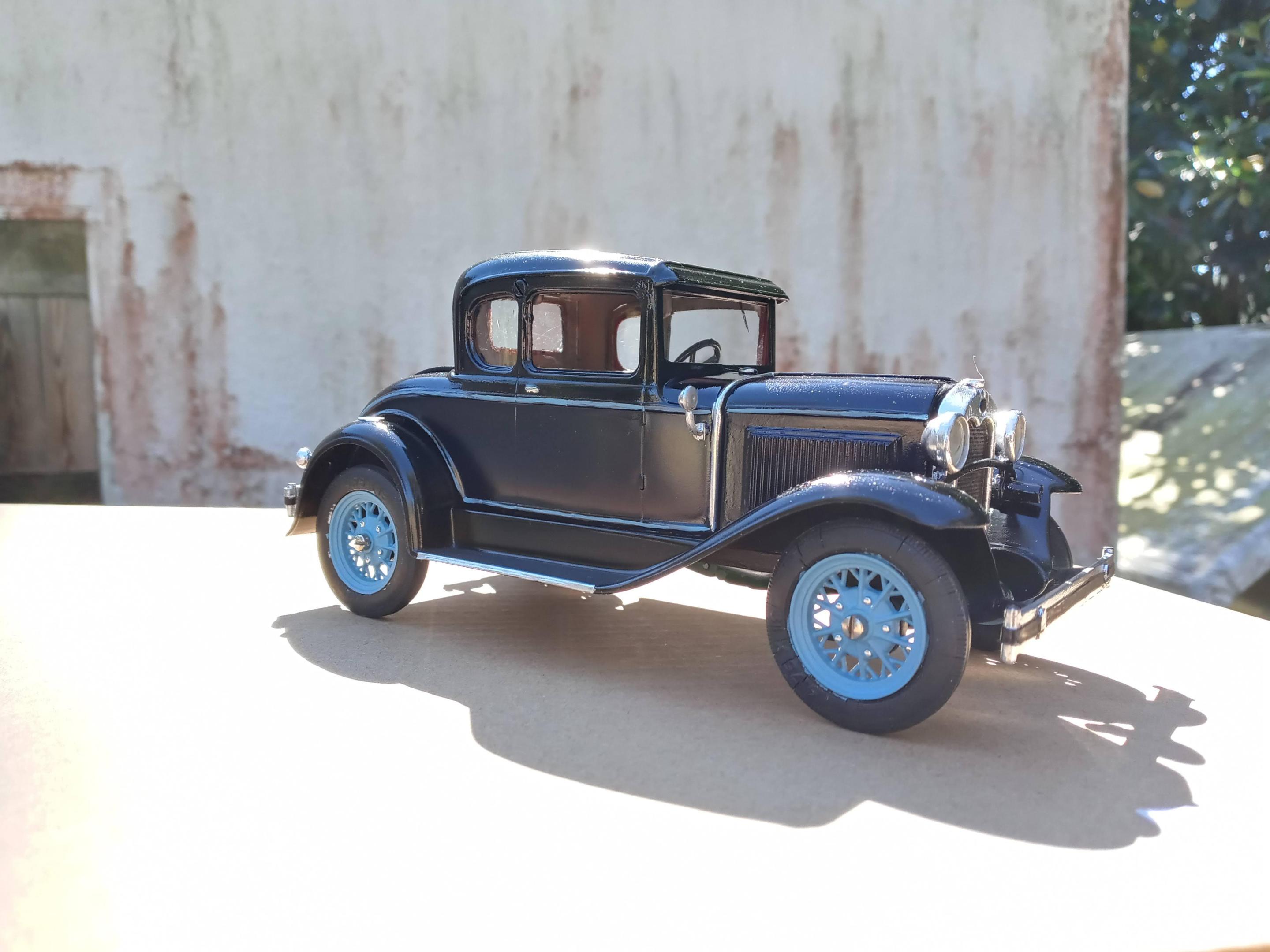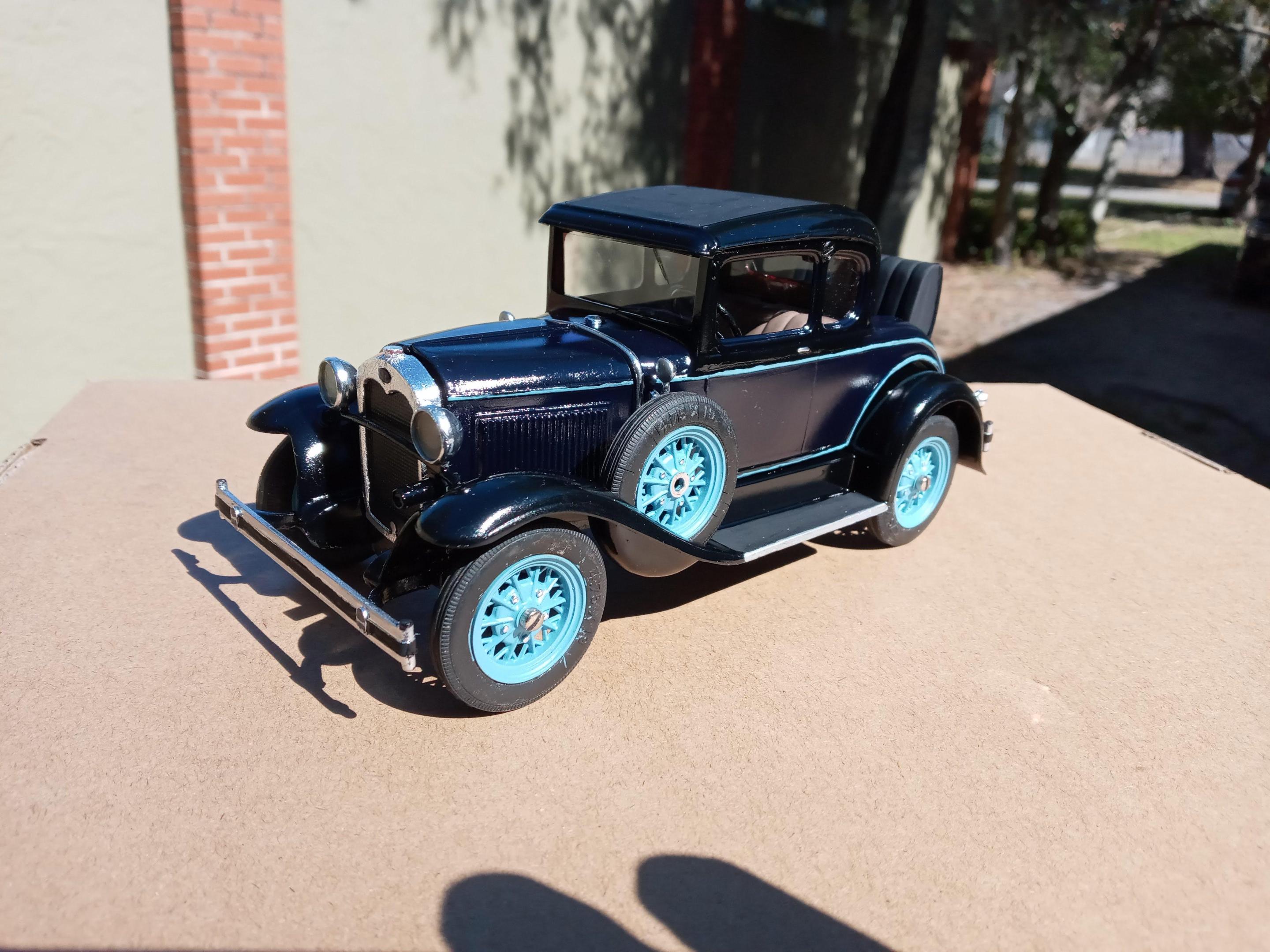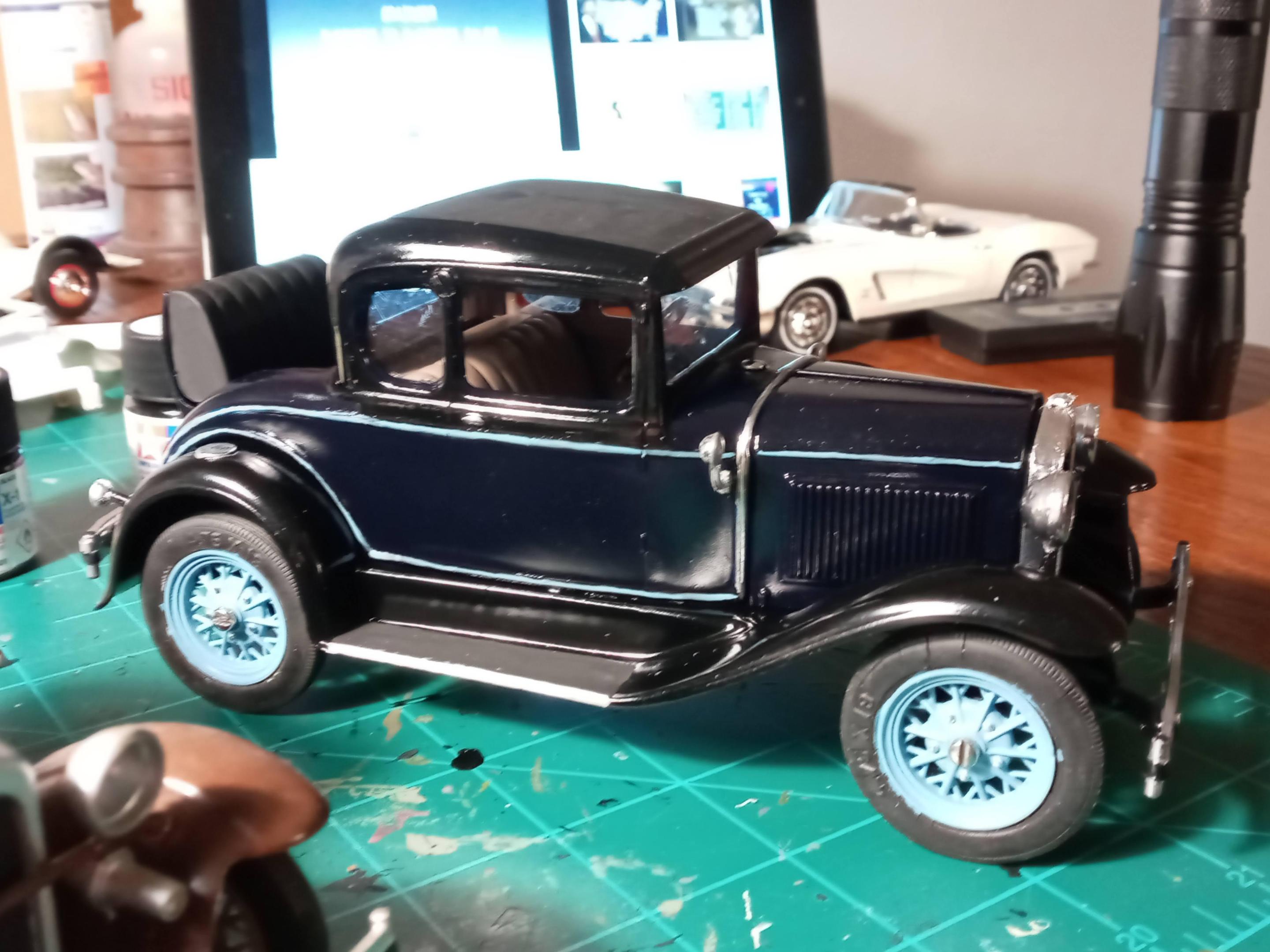 This was my first chance to use a Molotow chrome pen that I picked up the other day. While it won't replace Bare Metal Foil I think it's great for small pieces and touchup where a chrome part gets cut off the sprue. I used the same Humbrol 89(close match to Ford's Hessian Blue) that I painted the wheels with to do the pinstripe. I couldn't find my box of real pinstriping brushes so had to improvise, but for a car that is going to sit on the shelf with the rest of Hubley Model A's in my collection it will be just fine. The brown Coupe is one my grandfather built in 70s. You can always spot a 70s restoration of an early 30s car-it seems 90% of that era cars were painted in two tone brown/tan with orange or red wheels when they were restored! After some cleanup and touchup I'll post the finished build in the Under Glass section.