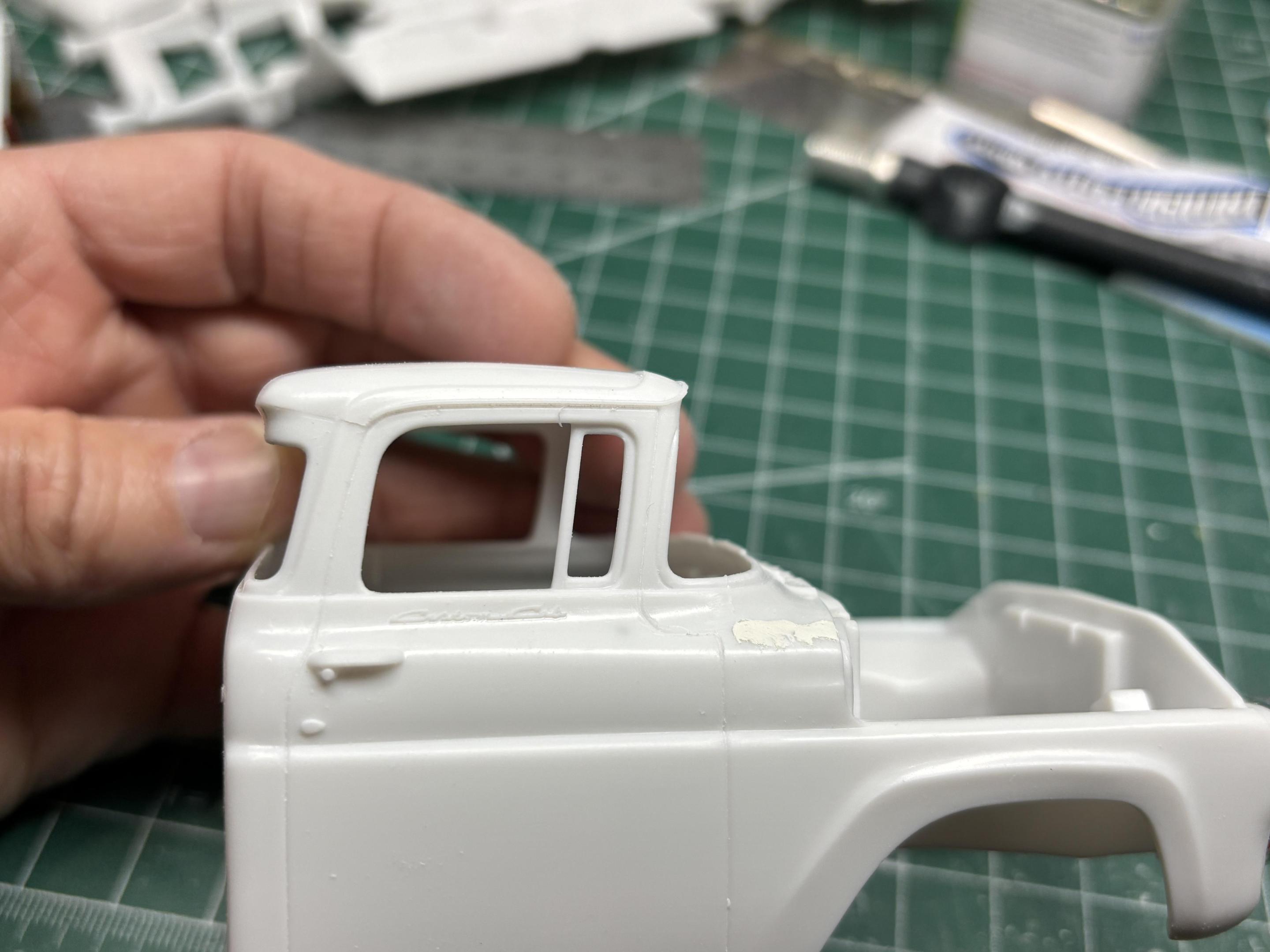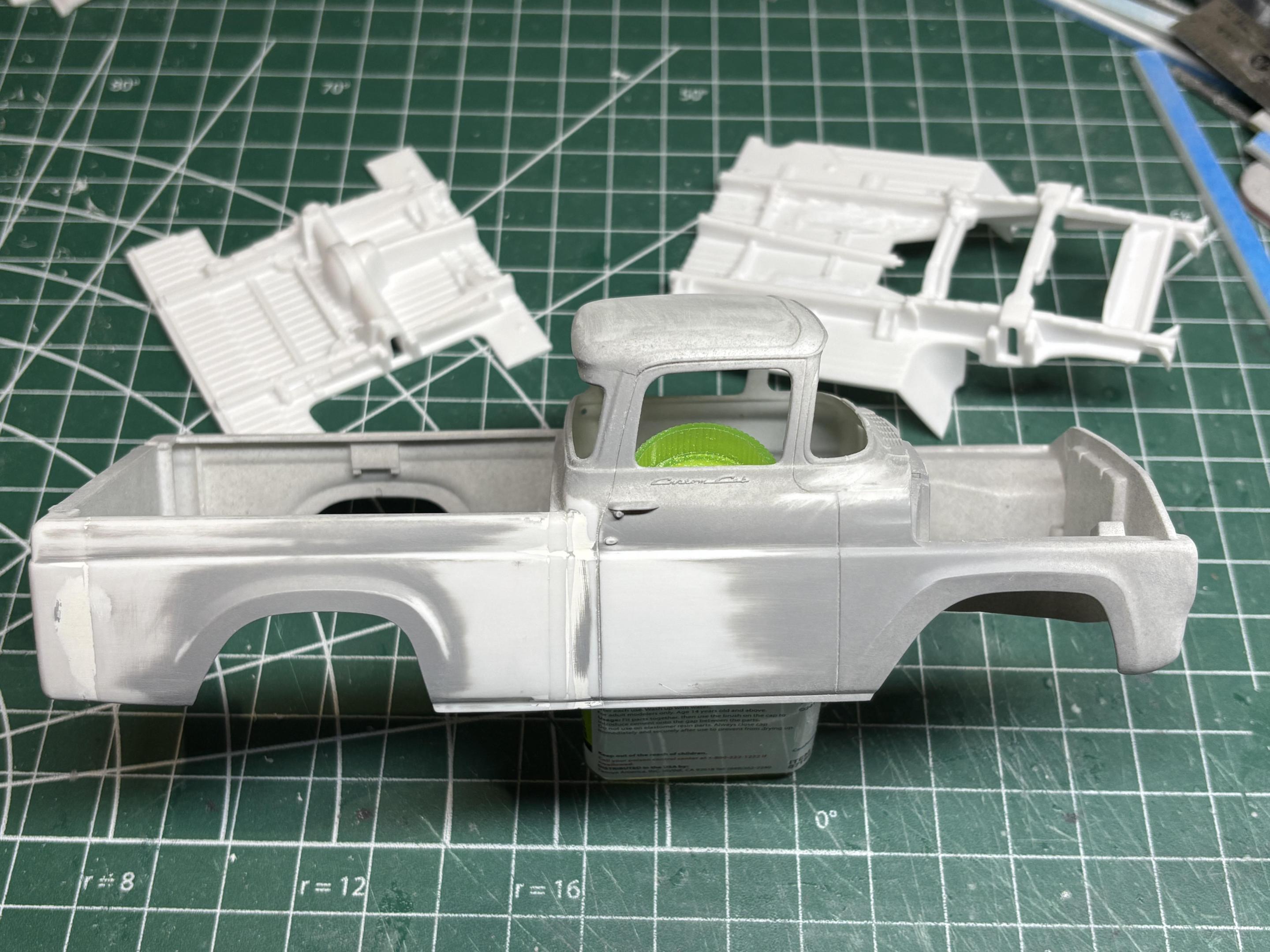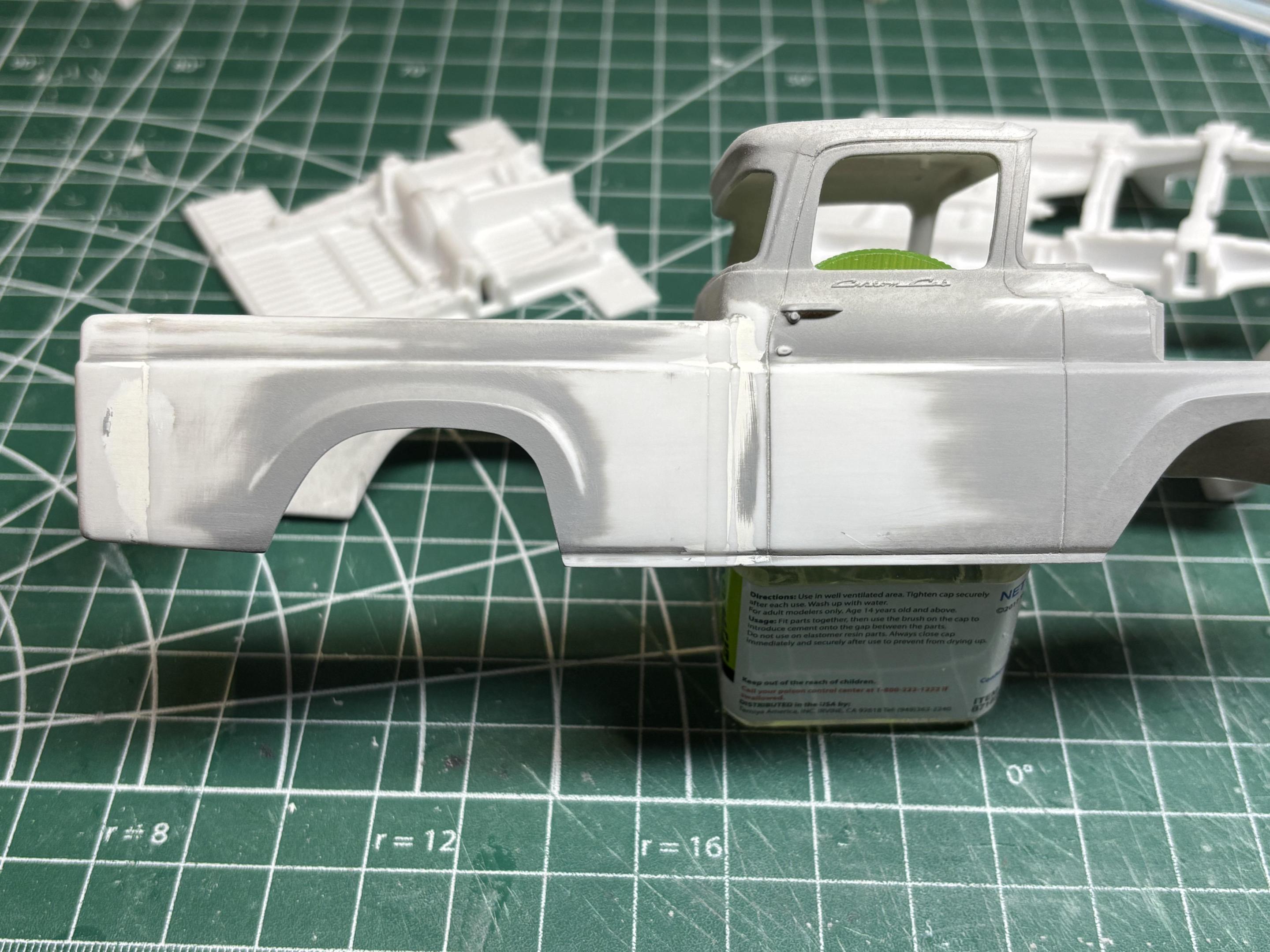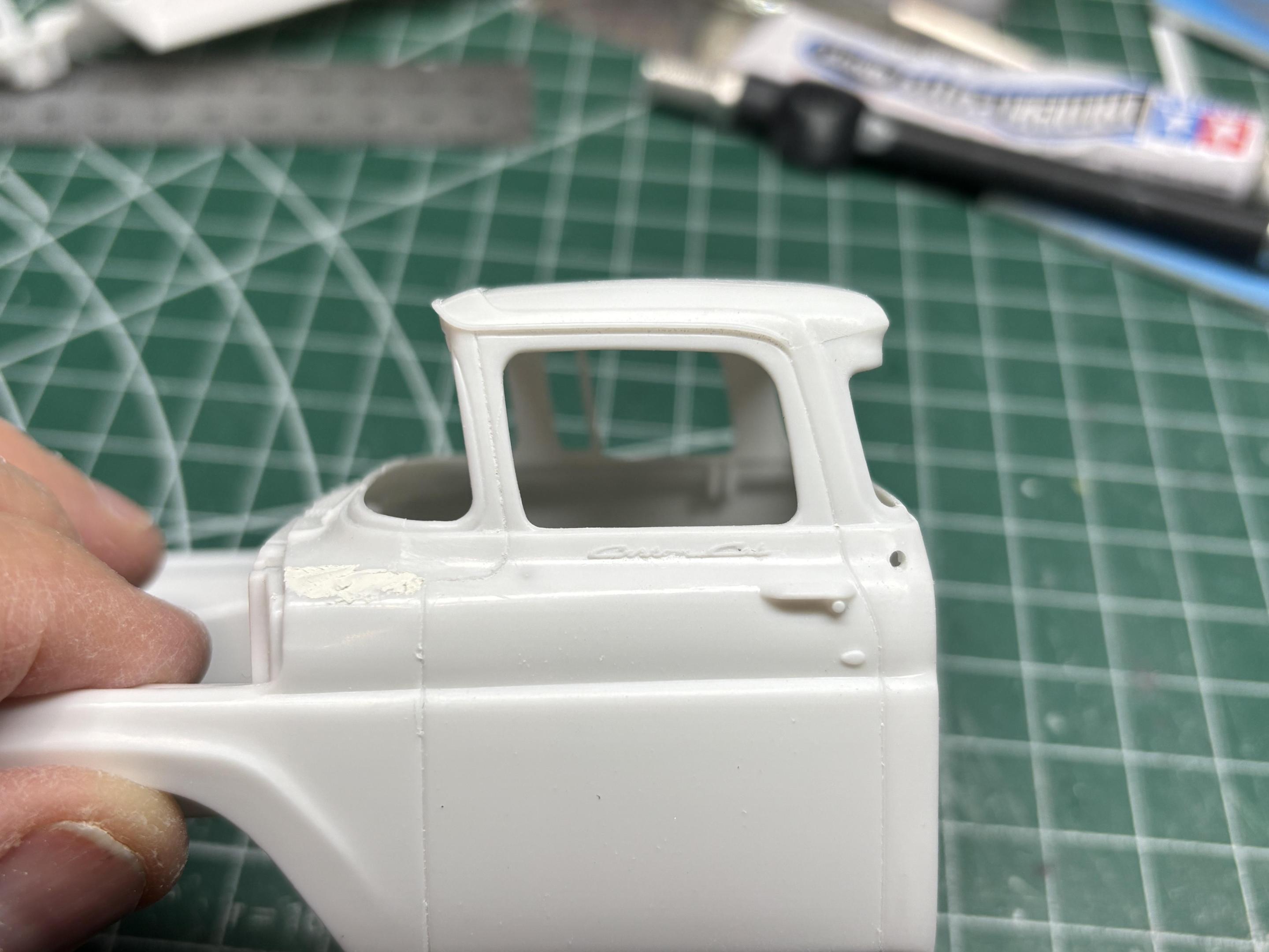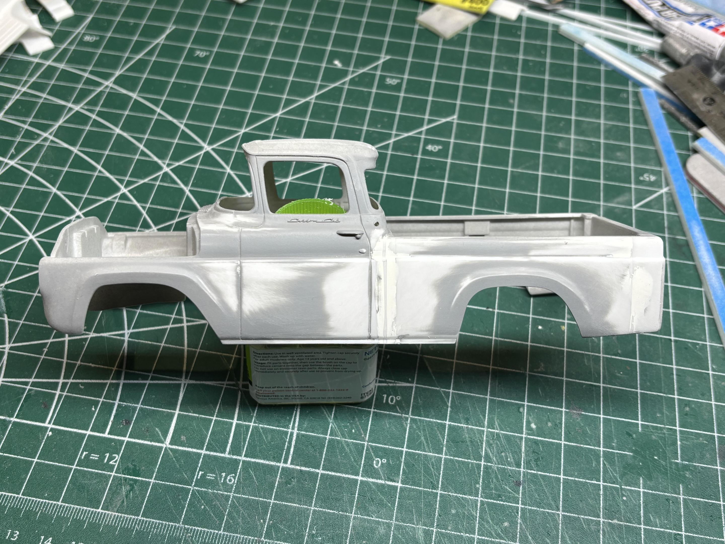 Ok, some actual progress on the truck! As mentioned it will be a short box/unibody. I also removed the quarter windows. Partly to be different, but also in an effort to âclean it up a bitâ. Before⌠After⌠The Custom Cab script will be removed too. Door handles will be replaced also. For the box, I removed 9mm from the front, and 9mm from the back. I used a piece of styrene as guide to keep all cuts consistent. Box is now short, and mated to the cab. I reshaped the top portion of the box front to conform with the back of the cab. I then used quarter round styrene strips to fill the gap along the joint vertically . This strengthened the joint, and also minimized the amount of putty used. So hereâs where we are now, after one round of putty, prime, sand.đobviously still more to do, but everything lines up nicely. Most of the grey primer will be sanded off, white primer for the rest. Thanks for looking.