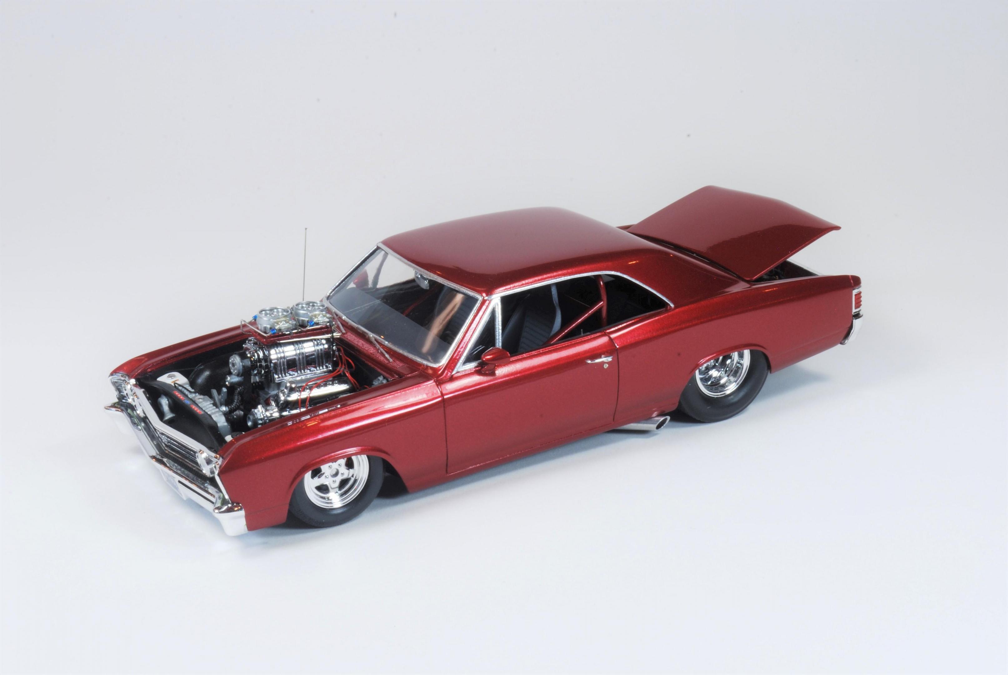This build started with the Revell kit. I swapped out the custom rear lights for the stock unit from the AMT kit, then added carbon fibre decal on rear facia and PE 396 SS logo. Molded door handles were shaved off and my spares box provided new handles along with PE locks. Trunk was cut open and hinged. Inside of trunk is flocked, and has fuel cell, battery, sub woofer and NOS bottle. Antenna is guitar string, BMF trim, body is painted GM medium Garnett red. (I own a 1:1 ‘67 Beaumont in the same colour)