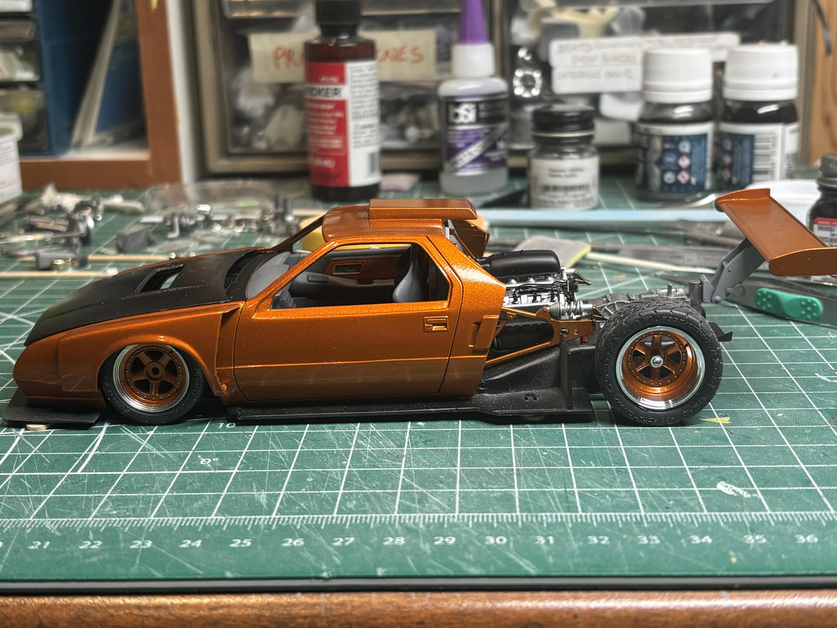 Hi all, time for an update. I felt the need to get some paint on this beast. Most of the test fitting etc is done, and the major components are almost sorted out. Of coarse, if itâs painted, itâs time for a quick mock!! Base coat of silver, metallic orange, and clear orange, all Tamiya. No clear yet. Nothing is glued together yet, and LOTS of detail painting to do yet, just a quick mock to see where Iâm at. One thing I will almost certainly change is the rear wing. Itâs a bit too far back in my eye, so I will tinker with that. You can see I have started the engine, but still work to do on that as well. I fully realize that this type of build isnât everyoneâs âcup of teaâ but it is fun doing something a bit different. I also have realized that this is an â85 (?) Daytona, not an 88. I donât have the original box⌠As always, thanks for looking!! -