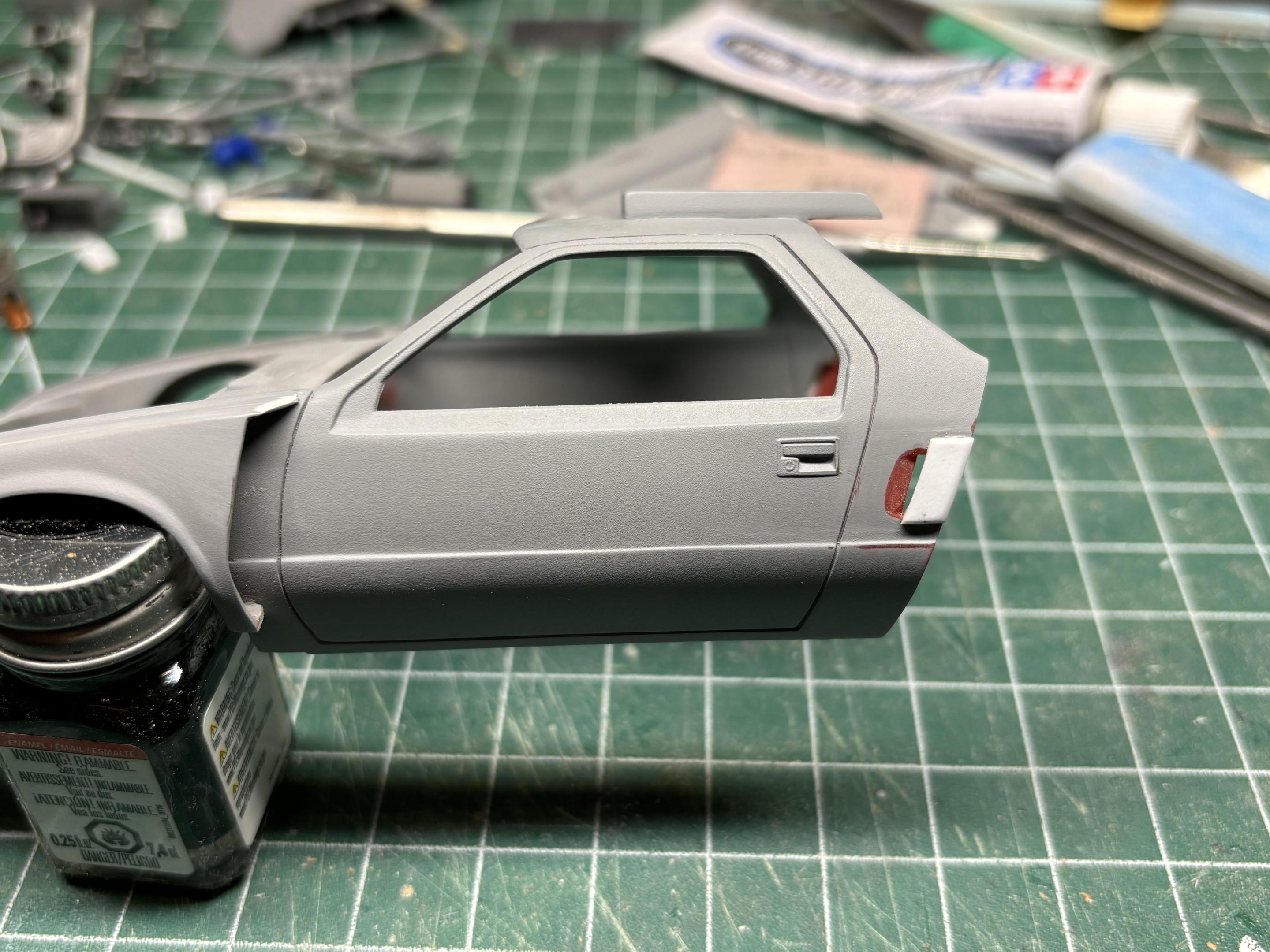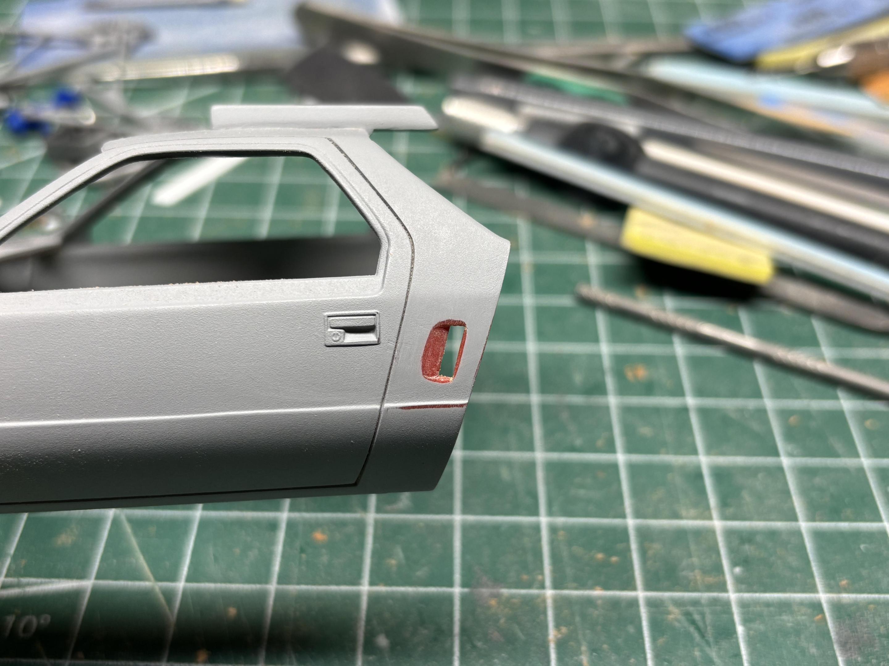 Hi guys, I had a reasonably productive weekend at the bench. Not a lot to show for photos, but I have a majority of the main components sorted out for fitment. The interior door cards took more time than they should have, but it was constant sand/file/test fit, repeat…. I also needed to figure out where I could relocate the inter coolers. With that task sorted out, I could now add air scoops to direct air for them. I used tape to layout the cuts and act as a guide for the rough cuts. After opening them up, I added some shape to the inlets. I made a couple of “scoops” from sheet styrene and attached them to finalize the intake. still some minor clean up, and refining, but close. The inter coolers will be mounted on the rear firewall behind these inlets. I have most of the interior in primer, so hoping to get some colour on those parts this week. Door cards need some detail, and a bit left to do on the dash. The biggest tasks left to do are fabricating a “trunk” under the hood, and figure out the turbo piping. Thanks for having a look! -