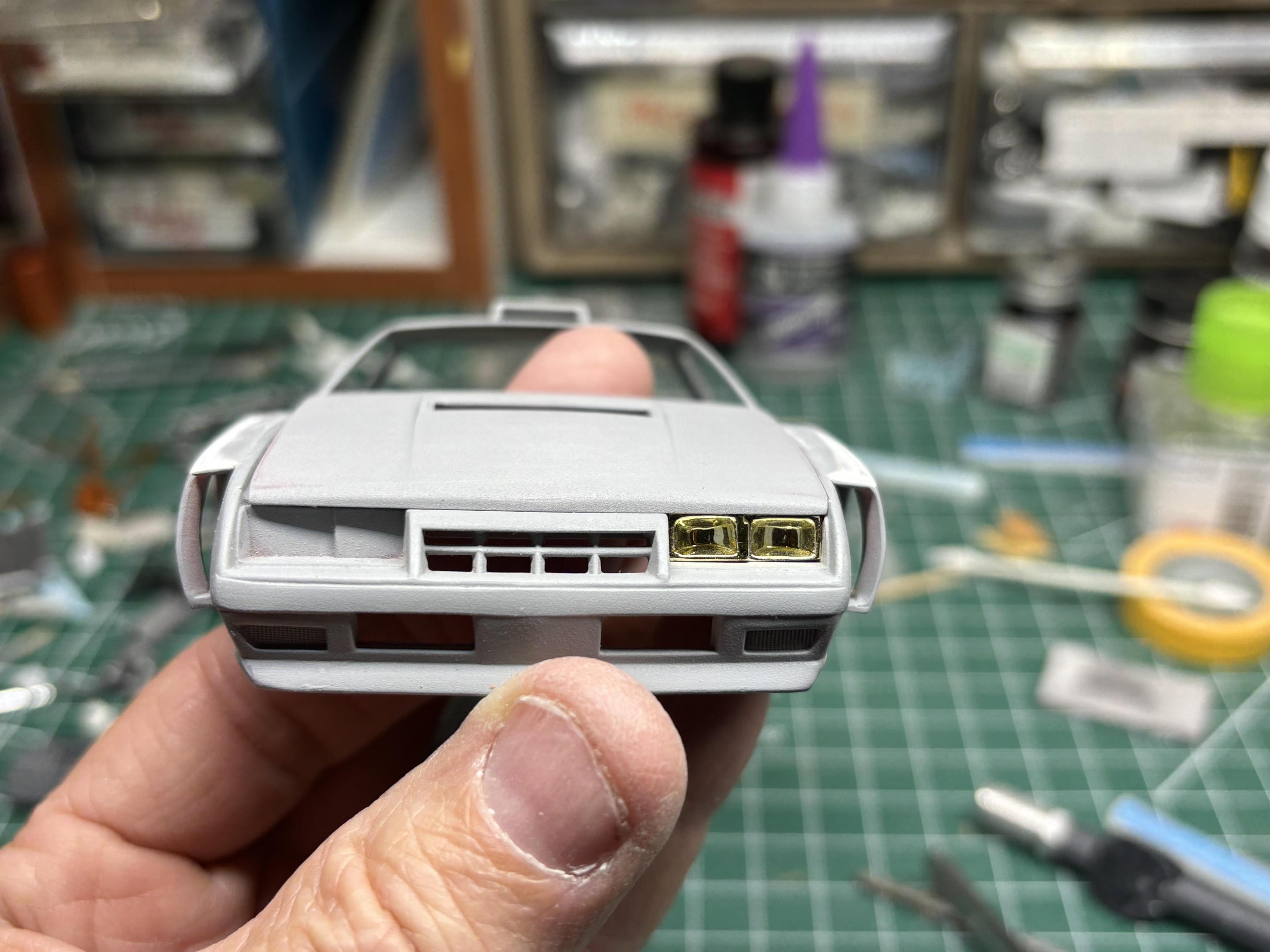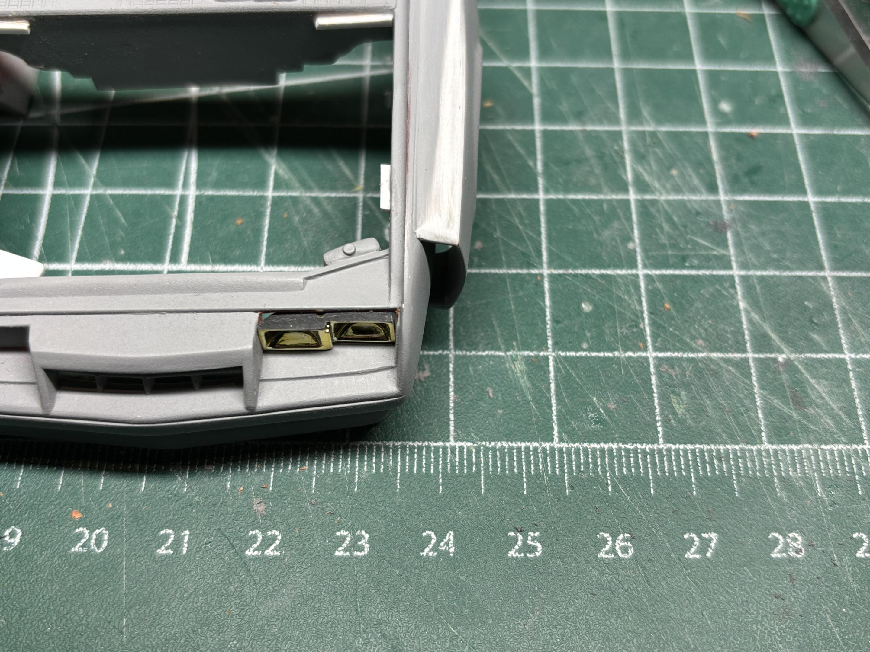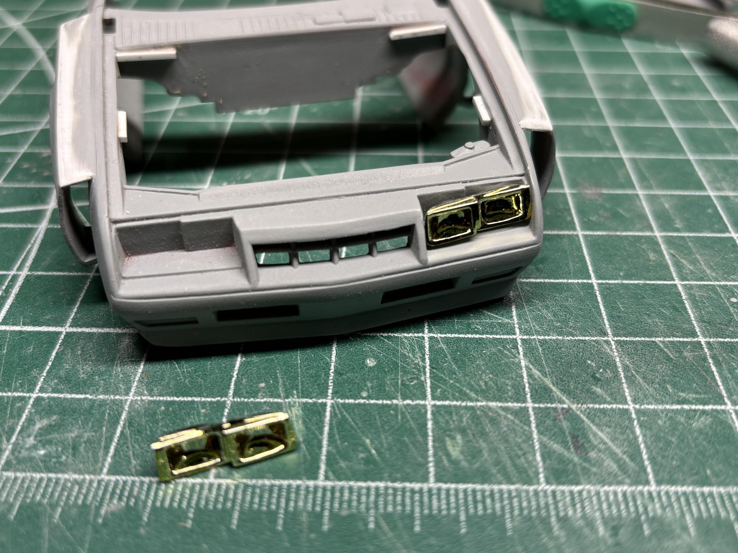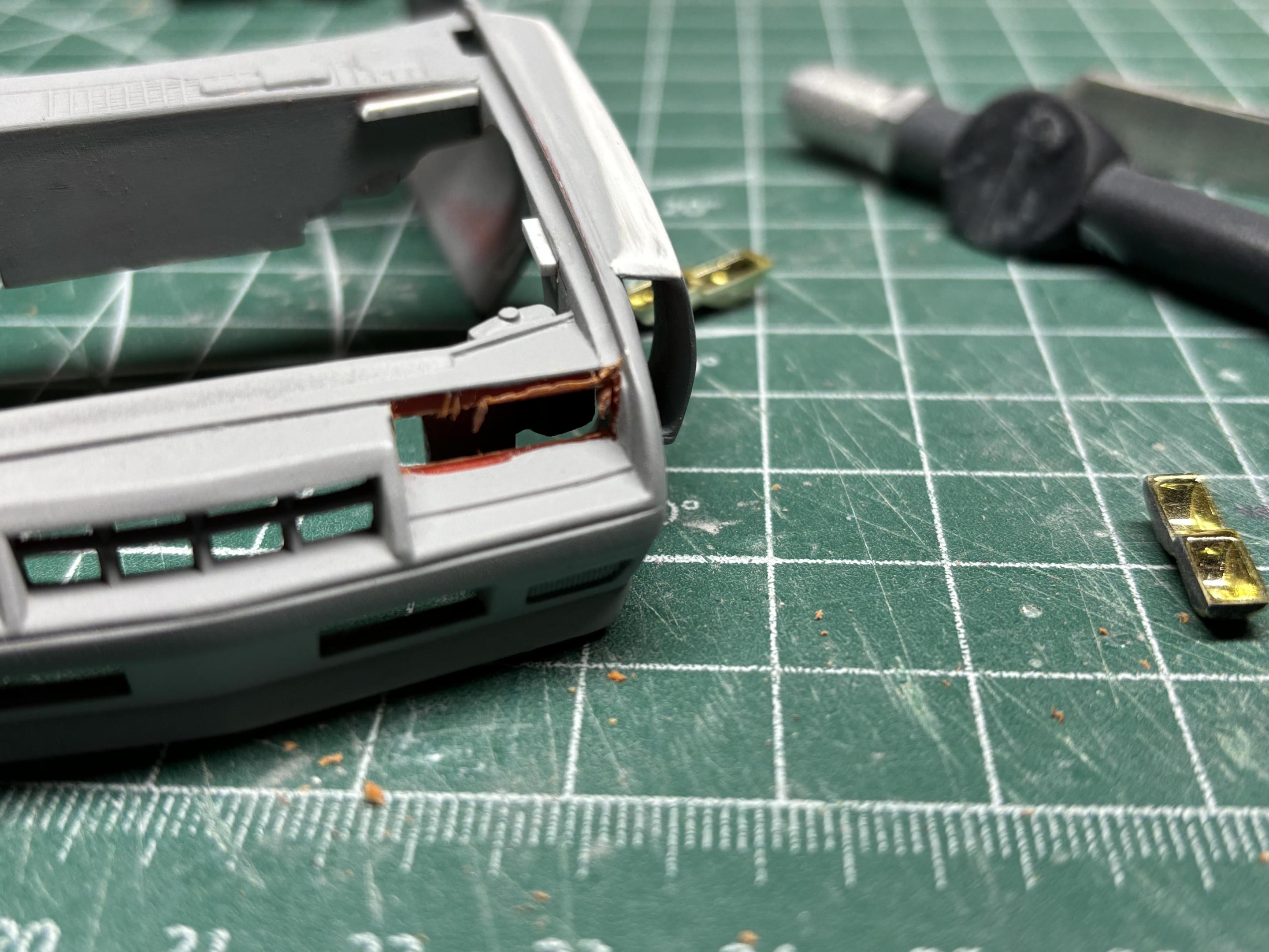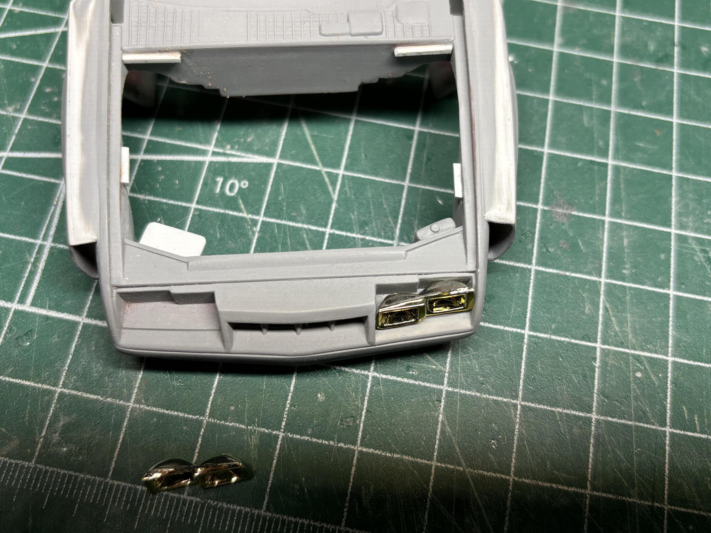 I made a fair bit of progress on this over the last couple of days. Not a lot to show YET… but soon. One of the issues I hadn’t dealt with was the missing headlights. So today was the day. Did a little digging thru one of my parts bins, and arrived at a solution I’m happy with. I found a pair of GOLD ? plated headlights from the old Monogram “mean and nasty” pro street Camaro. Now… I didn’t see this coming, but… the gold plating actually is going to work well. I am going to paint the outer edge in silver, but the gold “reflectors” for the lights will replicate amber lights perfectly, and, also be a good fit with the metallic orange paint. I will let the photos speak… I will add a piece of styrene sheet across the top to blend it in to the rad support and that should have my headlight issue resolved! I did get a bunch of painting done, but I need to do a bit of work before I show that. Soon… -