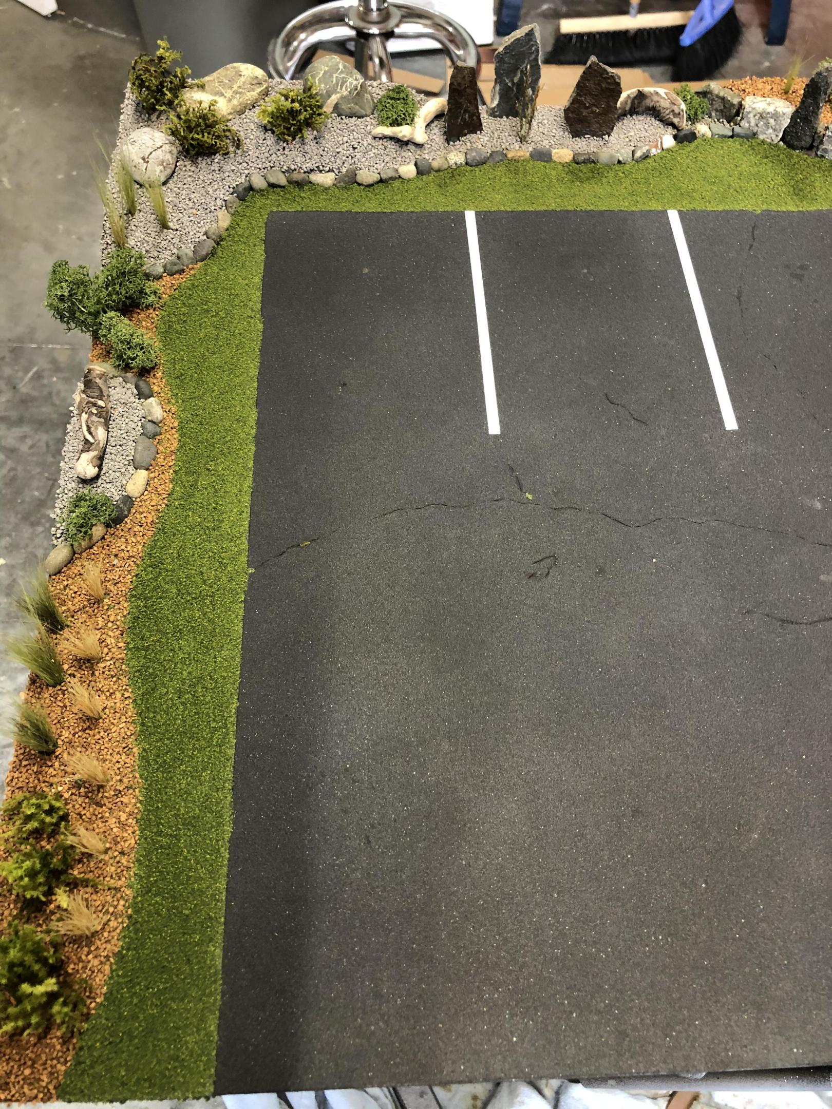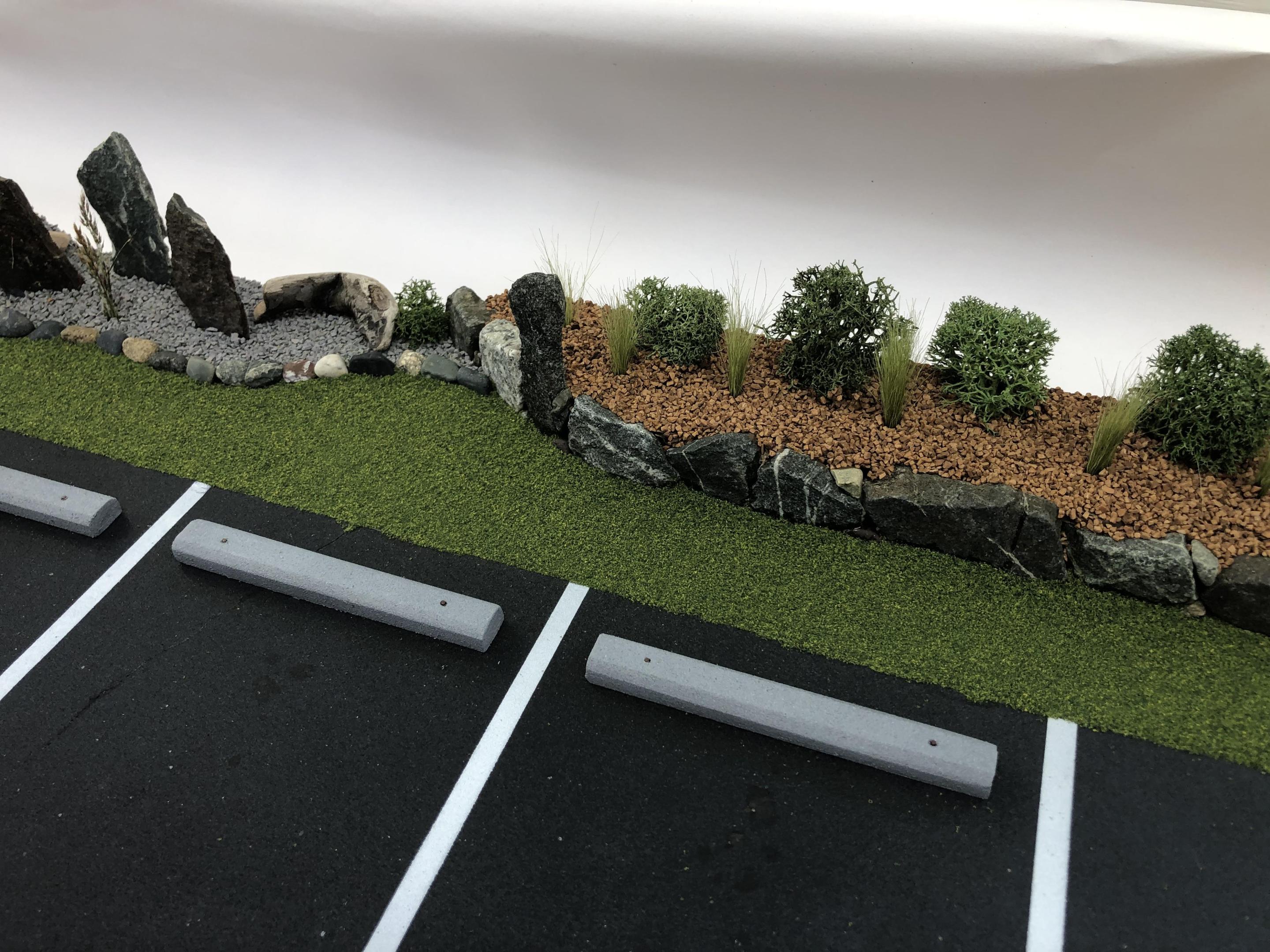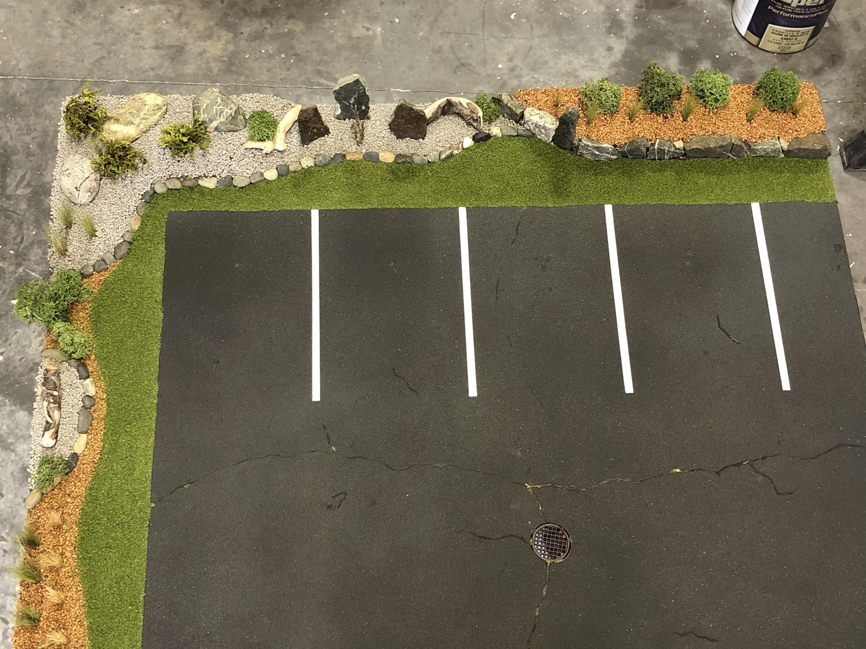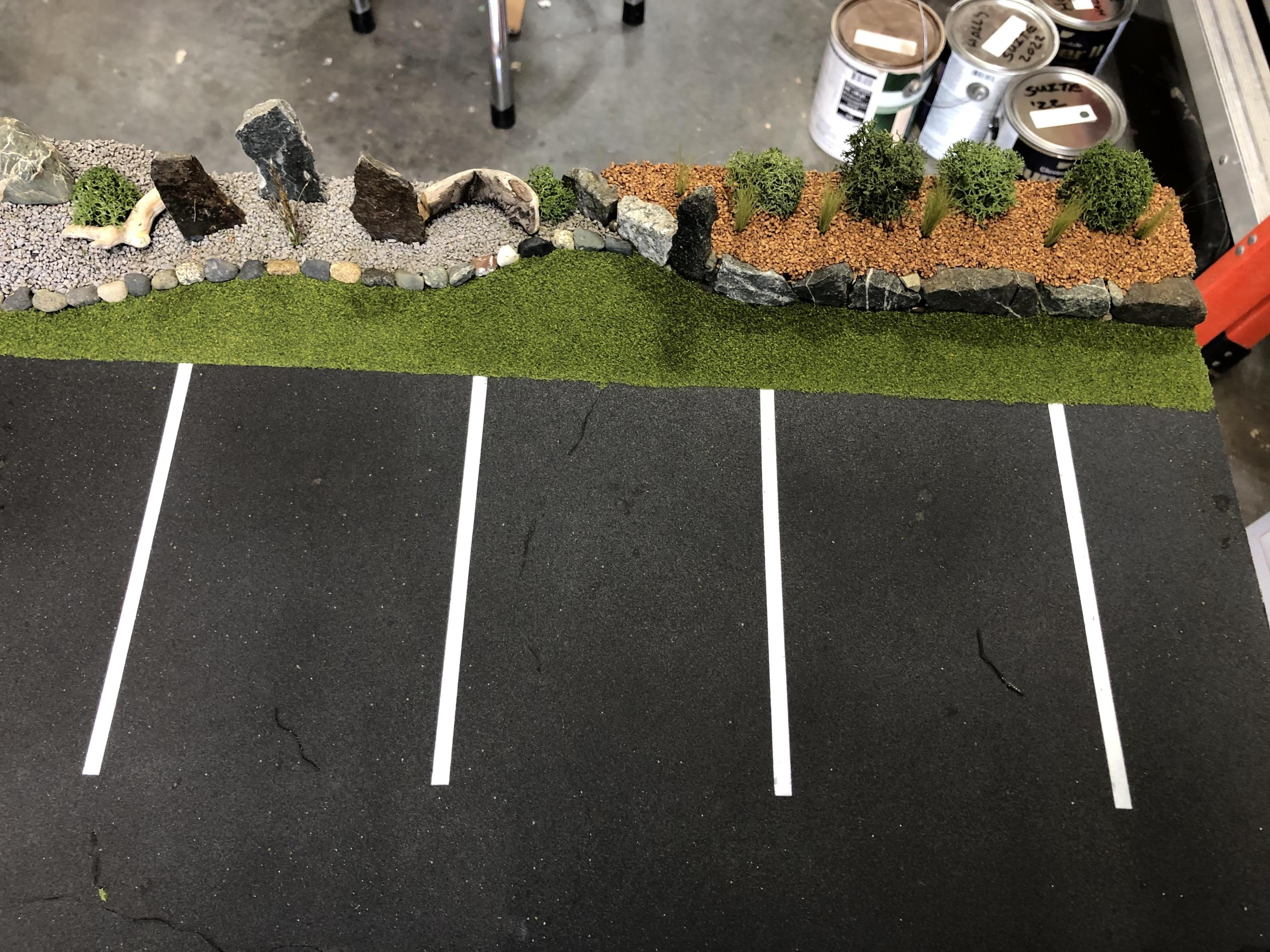 Ok, on the home stretch here. I wanted some variation in the landscape, but tried also to keep it from looking TOO hodge podge. Here I have added the driftwood and grass. For some added texture and colour I cut up a disposable paint brush for ornamental grass. Next up, the curb stops in the parking spaces. As Greg mentioned above, without these people tend to drive in the grass, or bump into whatever landscape there is. So I decided to modify a couple of carpenters pencils. They were slimmed down in height and width and reshaped. I then shot them with some textured paint, then a few shades of grey to resemble concrete. Holes were drilled to receive the “rebar” pins to hold them in place. “Rebar” is short pieces cut from a paper clip, then painted a rust colour. I was hoping to get this outside this afternoon to get some better photos, but it’s yet another windy day here and I didn’t want any bushes to blow away! So hopefully tomorrow I will get some decent outdoor pics and get it under glass. Looking forward to parking a few cars on it! Thanks for following along and taking the time to contribute your comments, much appreciated. Cheers, Steve