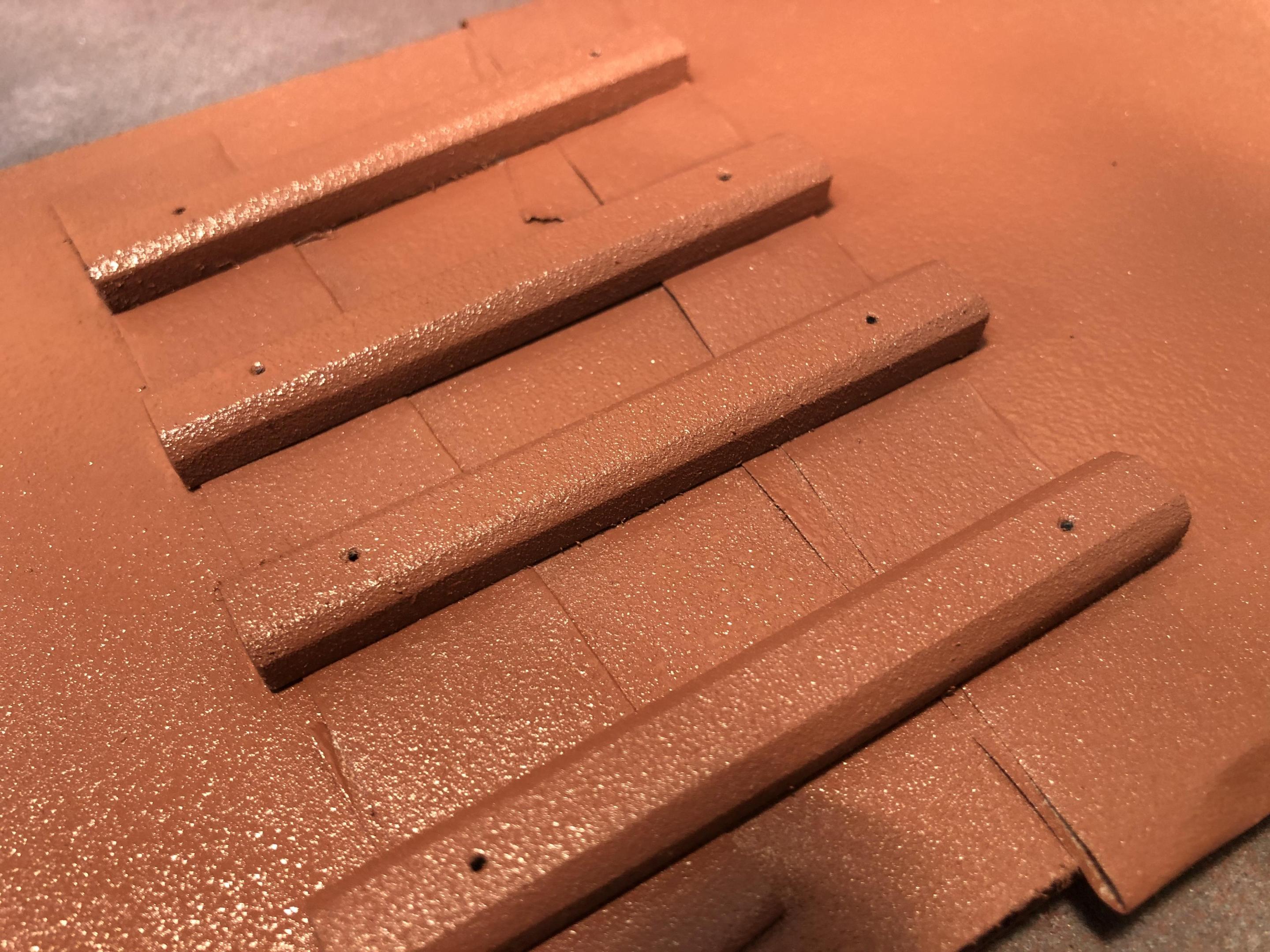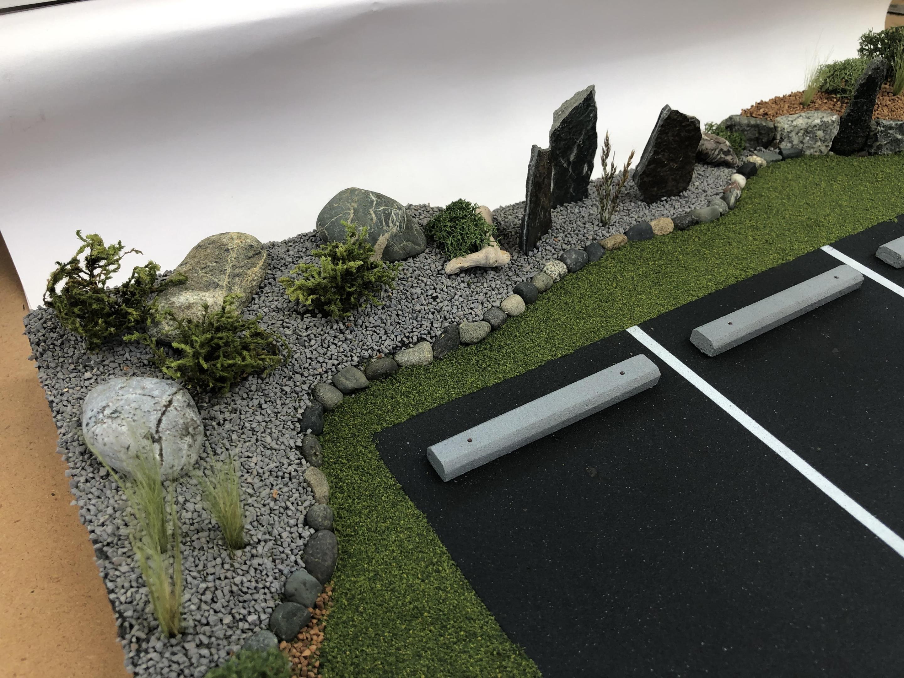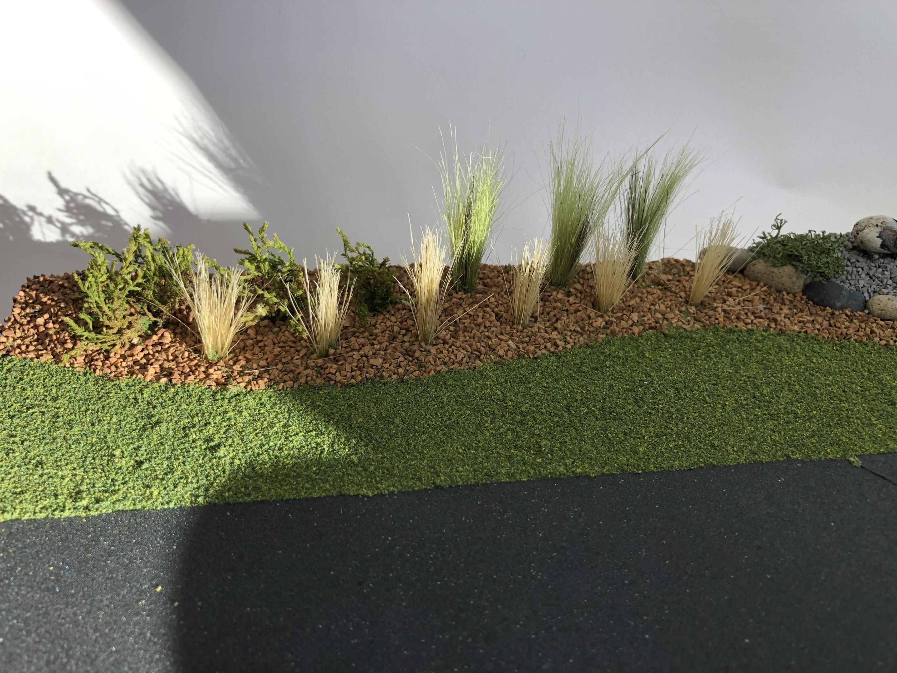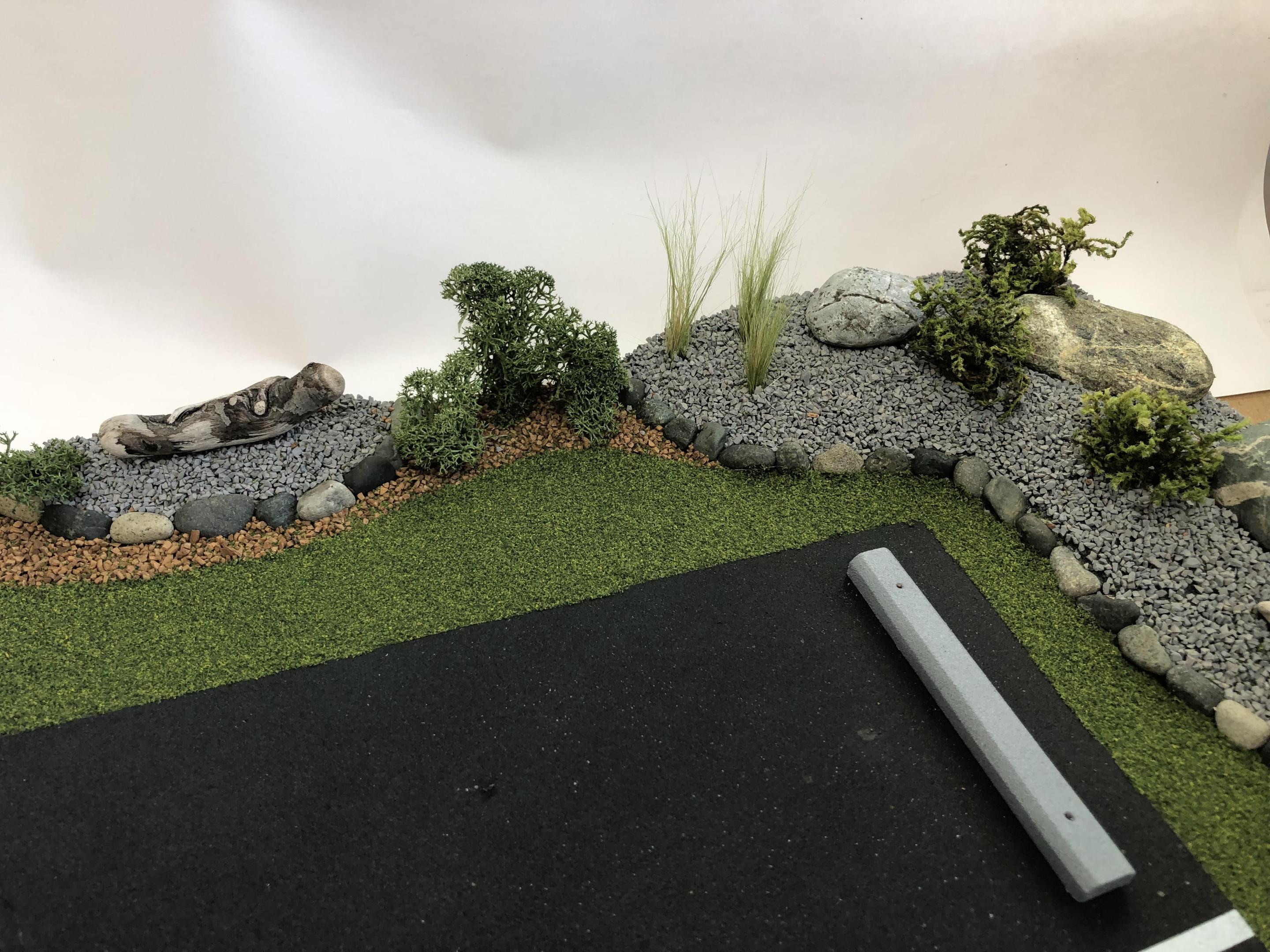 Ok, on the home stretch here. I wanted some variation in the landscape, but tried also to keep it from looking TOO hodge podge. Here I have added the driftwood and grass. For some added texture and colour I cut up a disposable paint brush for ornamental grass. Next up, the curb stops in the parking spaces. As Greg mentioned above, without these people tend to drive in the grass, or bump into whatever landscape there is. So I decided to modify a couple of carpenters pencils. They were slimmed down in height and width and reshaped. I then shot them with some textured paint, then a few shades of grey to resemble concrete. Holes were drilled to receive the “rebar” pins to hold them in place. “Rebar” is short pieces cut from a paper clip, then painted a rust colour. I was hoping to get this outside this afternoon to get some better photos, but it’s yet another windy day here and I didn’t want any bushes to blow away! So hopefully tomorrow I will get some decent outdoor pics and get it under glass. Looking forward to parking a few cars on it! Thanks for following along and taking the time to contribute your comments, much appreciated. Cheers, Steve