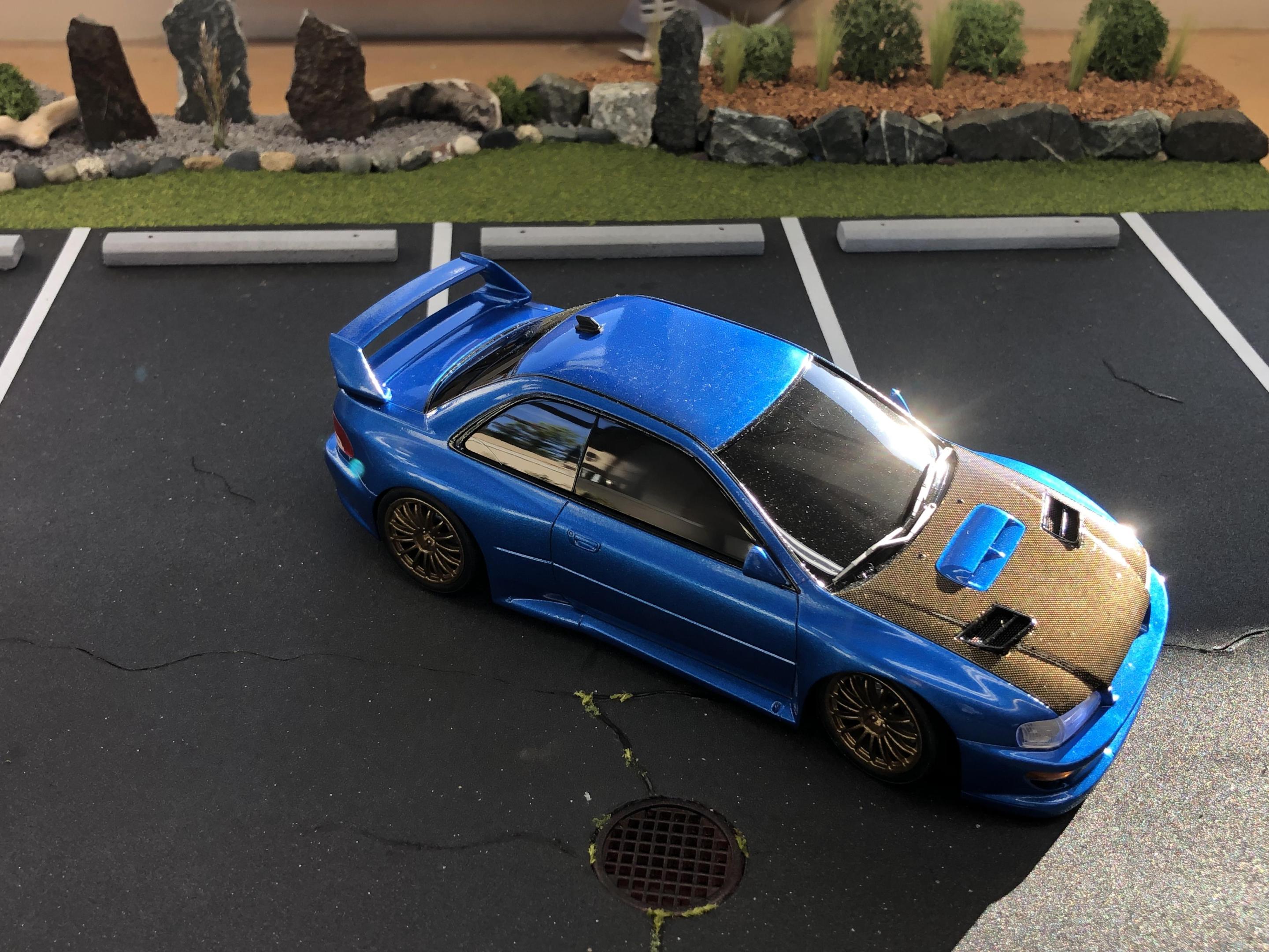 Hi all, I have been wanting to build a “setting” for photographing my completed builds. The idea here that it is the corner of a parking lot, with the surrounding area being landscaped. I did a quick WIP on this if you are interested in more details. This is something I have not tried before, but it was fun combining my career in civil construction/road building, my love of gardening and landscaping, and the passion I have for this awesome hobby of ours. Yes, I did try to simulate oil stains in the appropriate places. I might add more to that, but don’t want to overdo it. Couldn’t resist “parking” a few of my favourites to see how things look… And Jim, if you stop by for a look there’s some “shiny”!! Overall I’m quite pleased with the final look. The scale look of the asphalt is pretty close by my eye. I will definitely play around with where I set the base to try and get a better flow in the background. Eventually I would like a photographed backdrop, in the meantime this is much better than nothing. Thanks a lot for having a look. Hope yo like it, and always, all comments welcome. Cheers, Steve