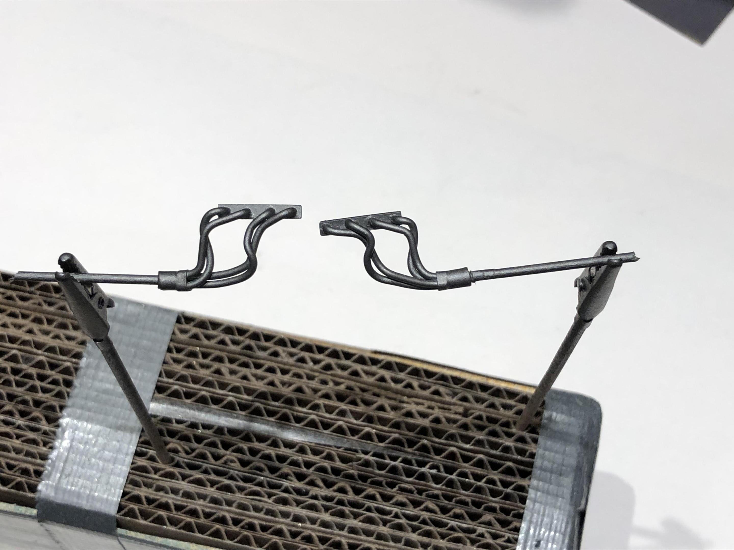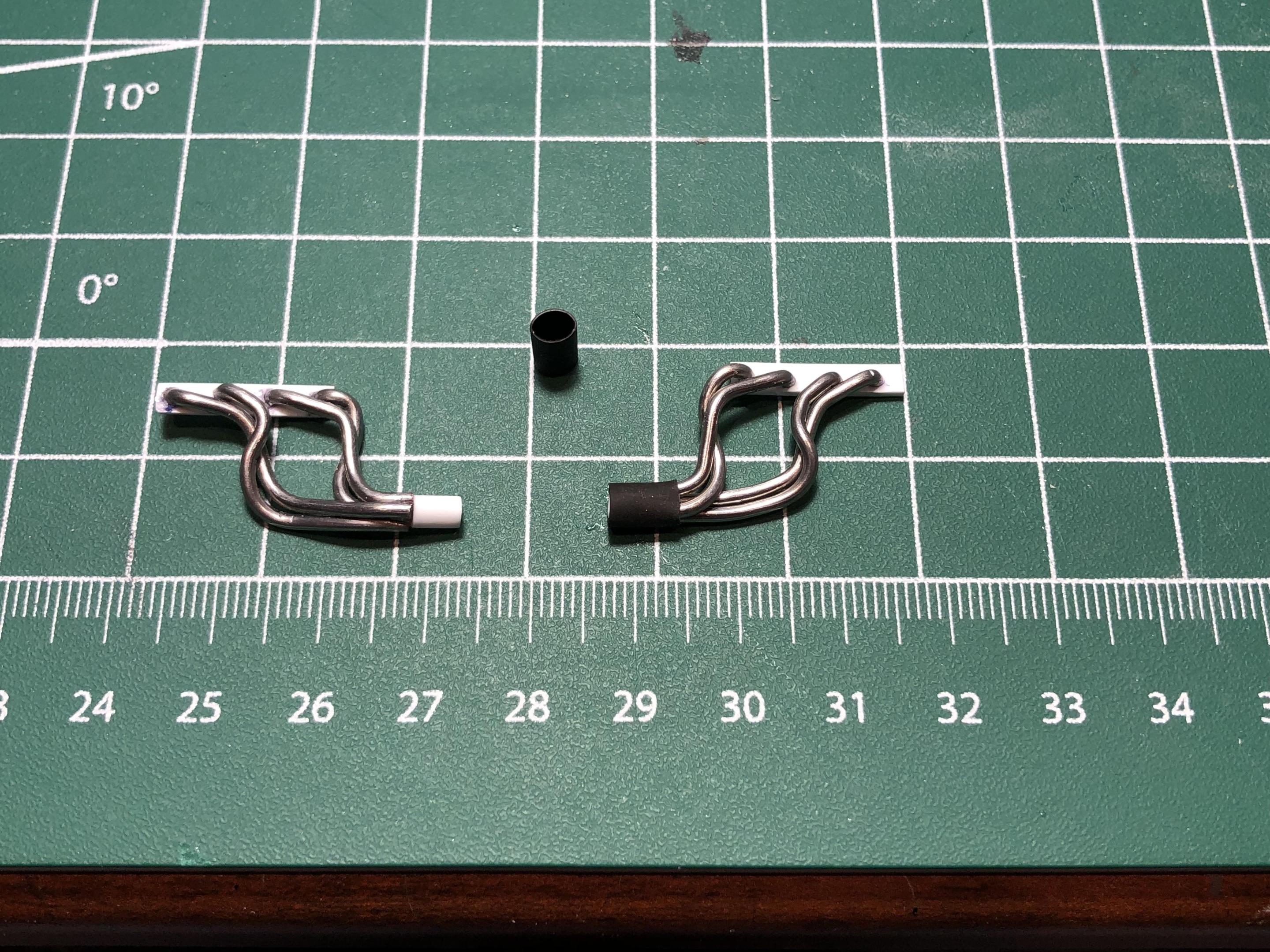 Managed a bit of desk time this evening. This is my first try at making exhaust headers. Lots to learn yet, but for a first try I’m satisfied with the finished product. Here you can see they have been cut to length, styrene rod for collector pipe, heat shrink tubing for the transition. I went back and forth on colour choice for them, decided on some old Modelmaster titanium. I know that to be “mechanically correct” all the tubes should be the same length, that wasn’t going to happen…. Maybe next time.