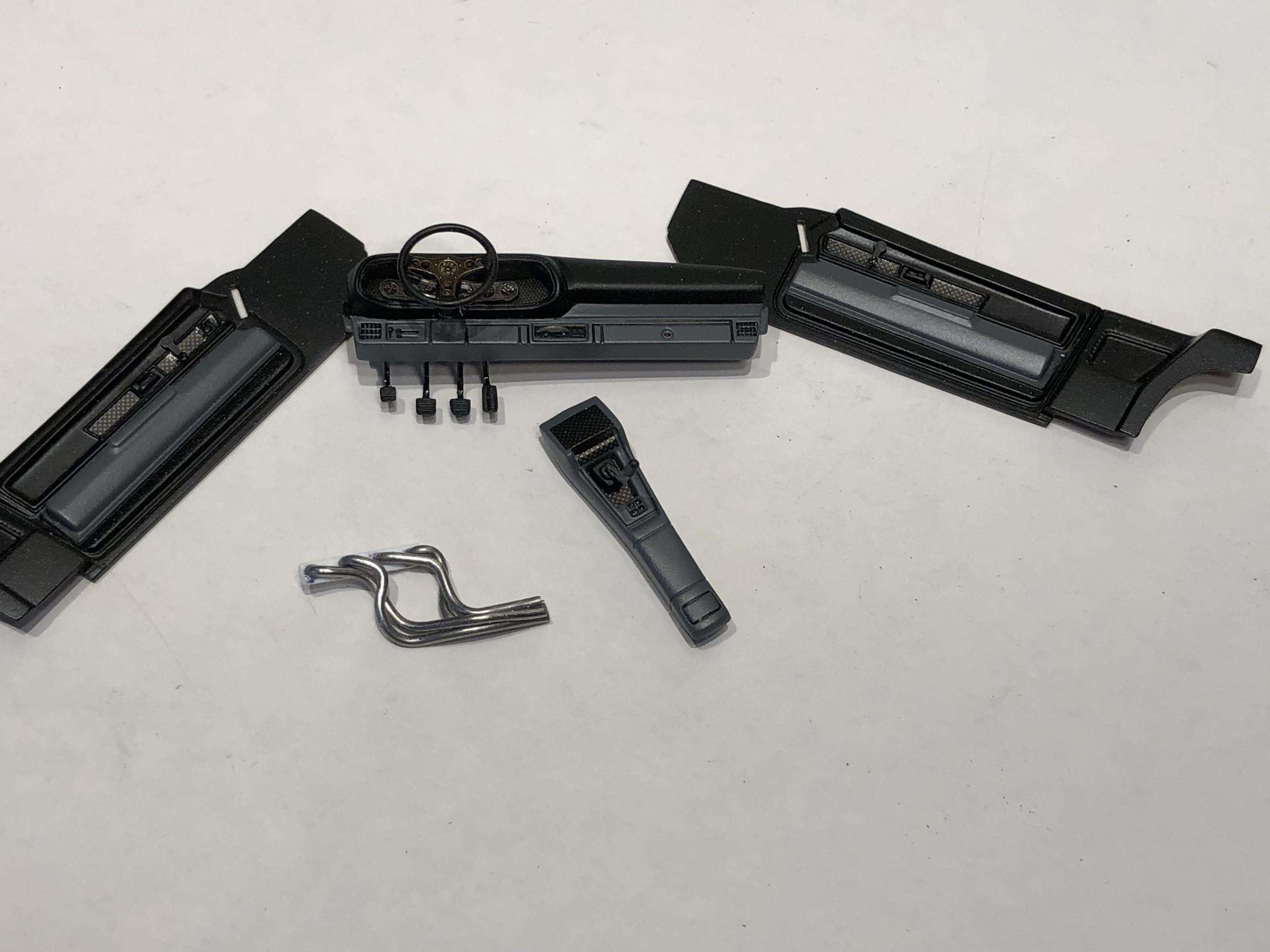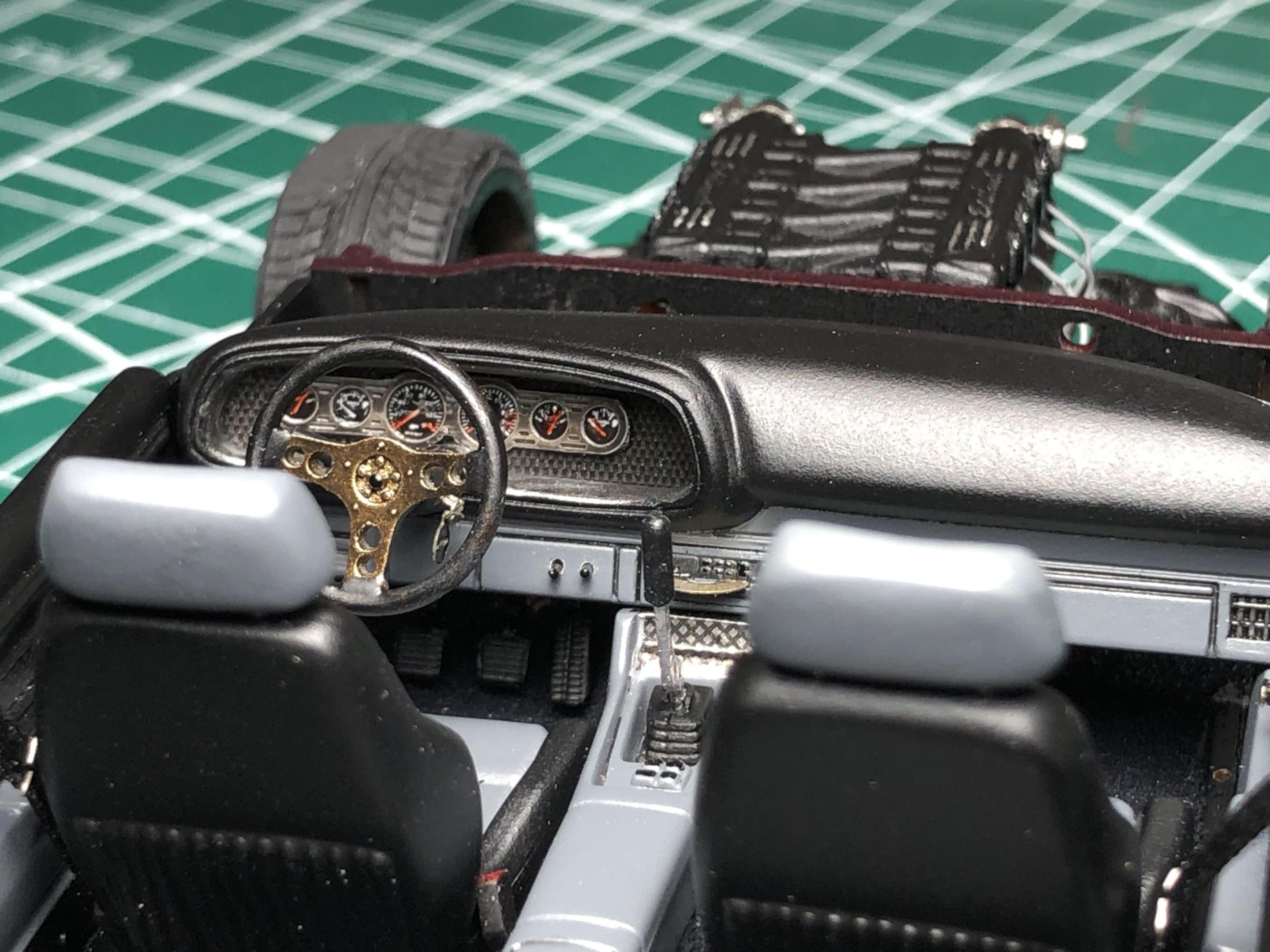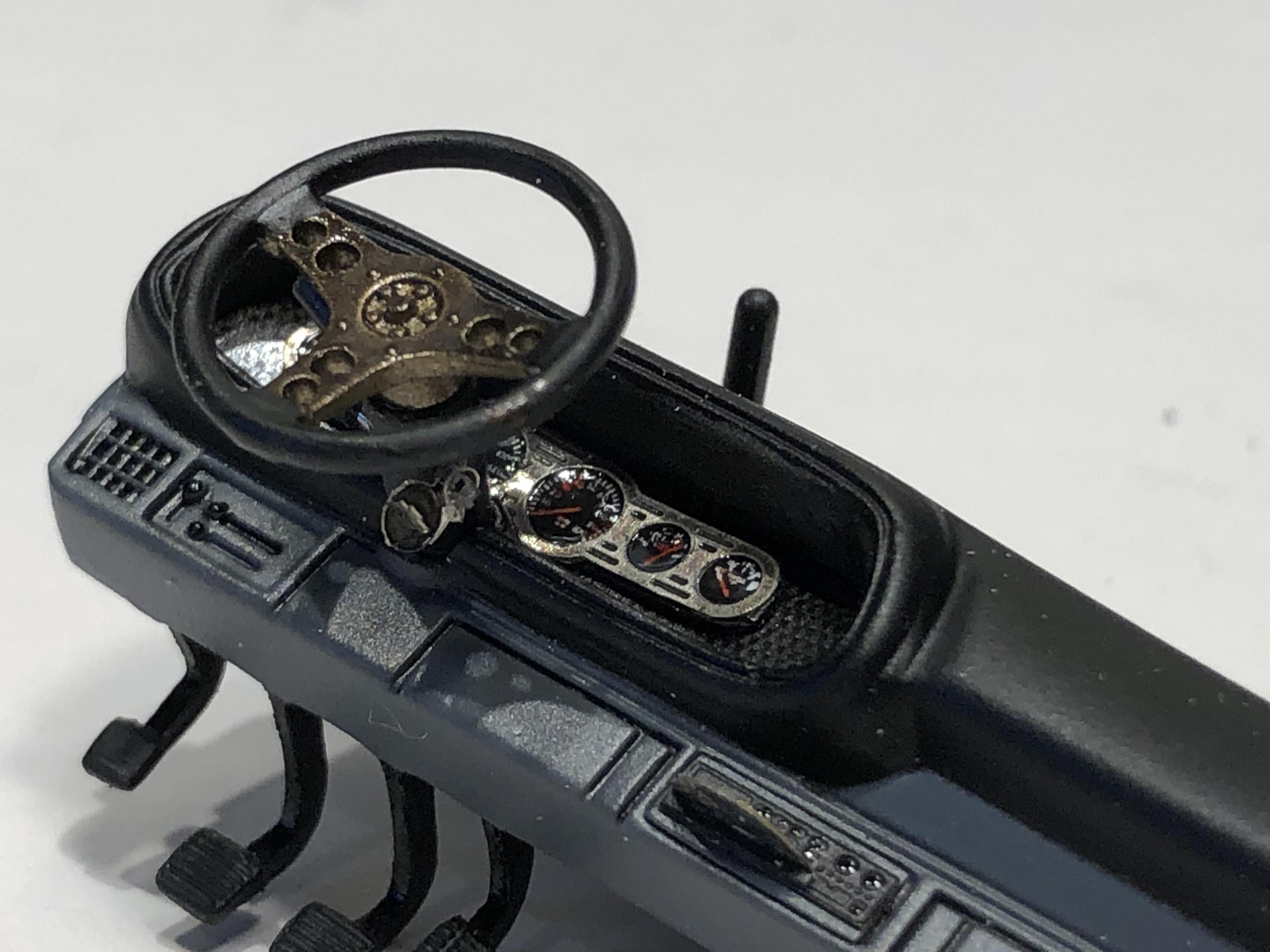 Hi guys, I’ve made a bit of progress over the last couple of days. Interior parts are pretty close now. Dash is complete, added a photo etch CD to the player, keys in the ignition, “window maker” for gauge faces. I will probably do a little more detail painting on the steering wheel. Door panels are done, carbon fibre decals, photo etch window cranks. Console has carbon fibre decals, scratch built shifter attached to the boot from the kit. I gave up trying to get a pair of headers to work. I had three that were all “close” but didn’t work for various reasons. So…. You can see I started building my own using 1.5mm solder. Still a ways to go yet, but so far I’m happy with them. I will cut them shorter and add collectors, then paint them. One of my better dashes… As always, thanks for looking and all comments welcomed.