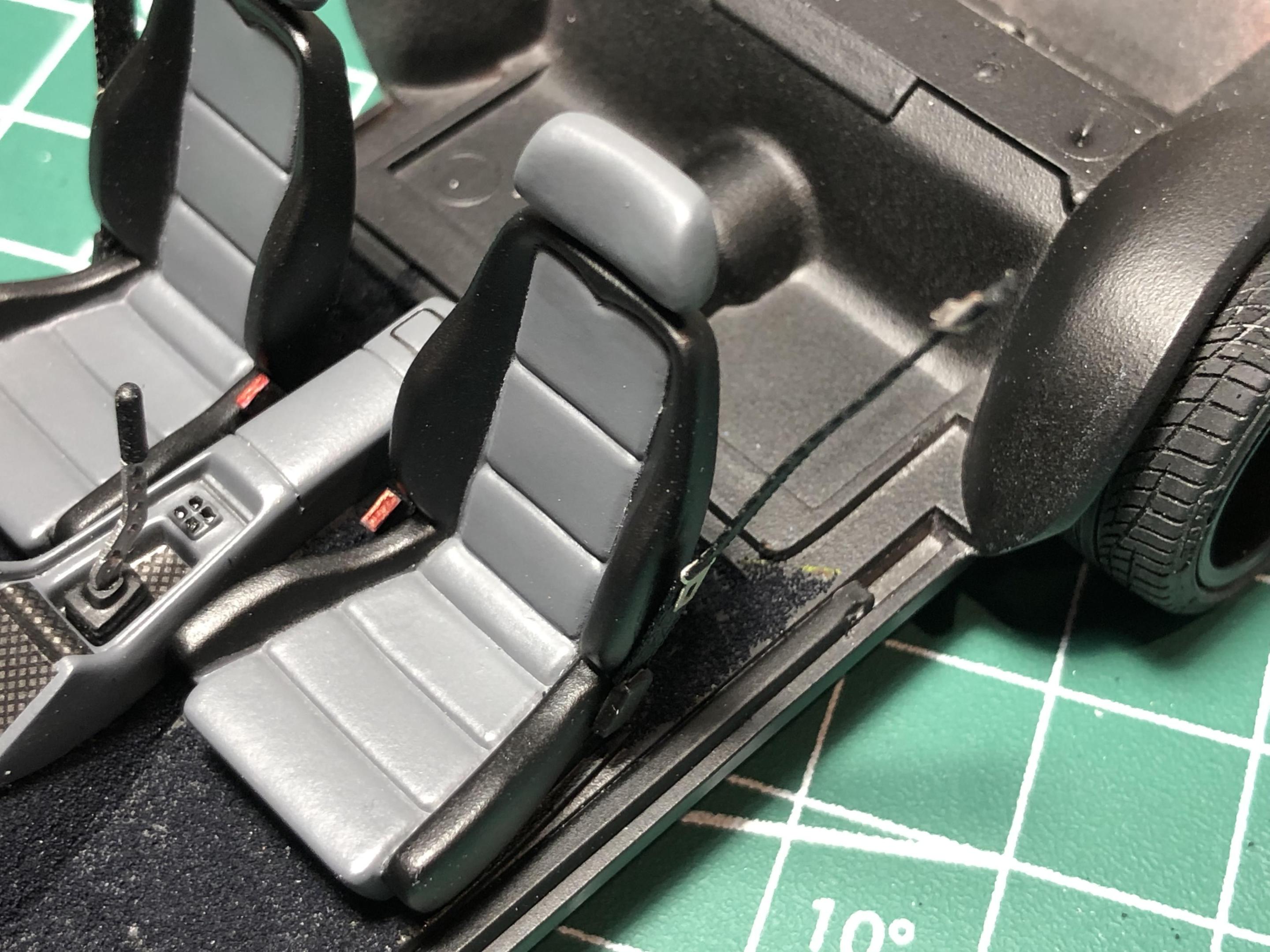 For seat belts, I didn’t want the full 5 point racing belts, however, lap belts seamed a bit too old school. So I decided to have a try at shoulder belts. I made the receivers out of styrene, with solder to attach it to chassis. The red “release button” was coloured with a red sharpie. With the belts installed it was time to assemble the interior. I still have to add the roll bar, and a few speakers, but it’s almost there. The plan is to attach the shoulder belts to an attachment point on the inside roof after body is installed. My first attempt at doing this type of seat belt so wish me luck. cheers, Steve