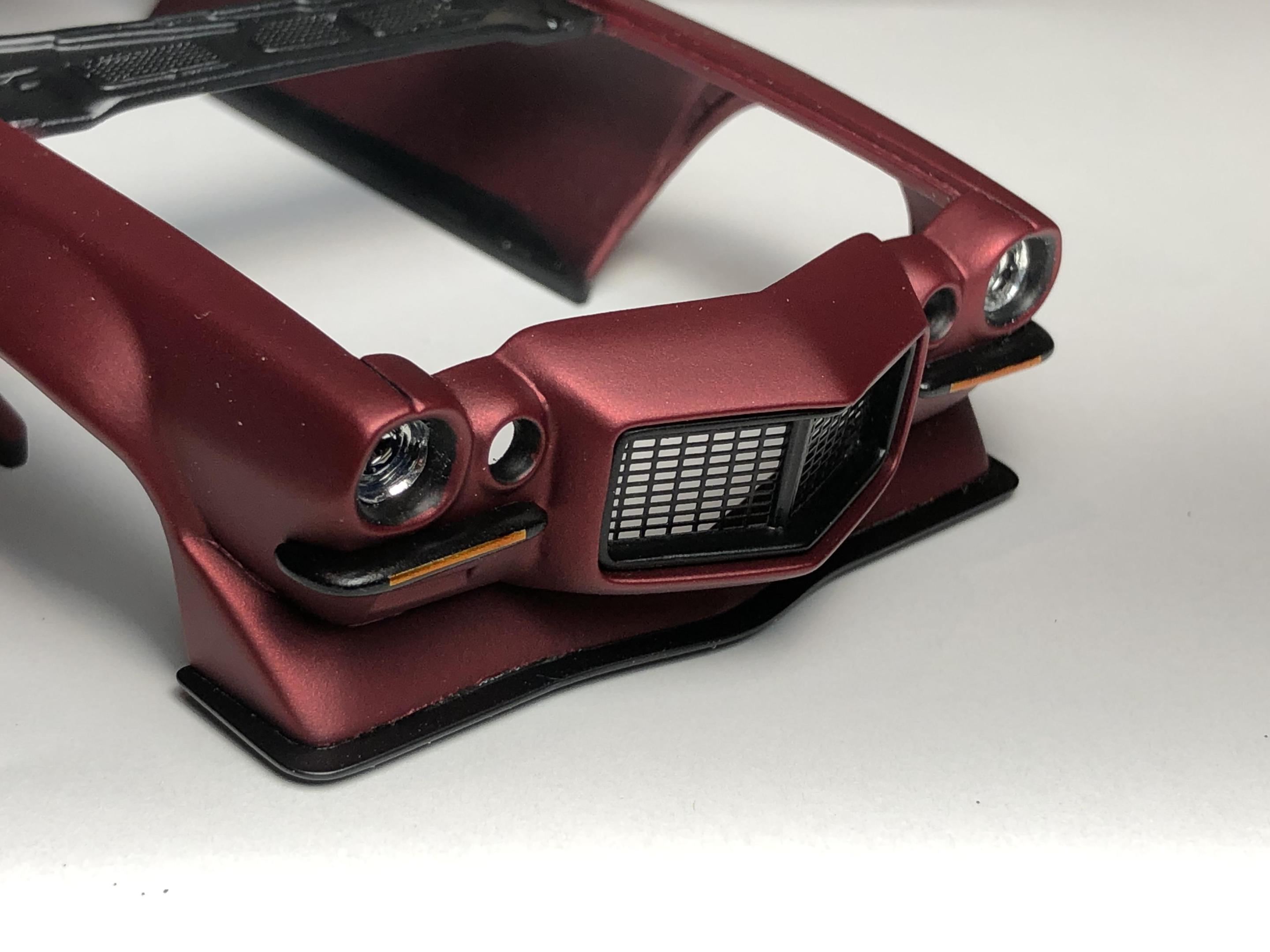 Hi guys, I’m still plugging away at this one. I realized last night that I’m getting close…. The engine is now nestled in the frame, and chassis is close to complete. The chassis is a bit “light”, I should have adapted a NASCAR chassis, and made it a bit more racey. (Is that a word?!?) Anyway, I am happy with it, and it looks reasonable. I might do some throttle linkage, and I still need to make the intake tubes. I have added the grill, headlight buckets, (lenses later), turn signals added to bumpers. The bumpers aren’t glued in theses photos but I have since glued them. I had considered using a clear lens recessed in the bumper, but in the end used a thin piece of BMF with clear orange. I then shot the whole works with semi gloss clear to hold it in place. Taillights are in. I’m happy with how the rear turned out. A couple of photos of the real car for comparison… A couple of things I did different consciously. I chose to leave the front spoiler body colour, and only do the splitter in black. Also on the real car, the top portion of the bumper is black, my bumper is all body colour. As always, thanks for taking the time to look, all comments are welcome.