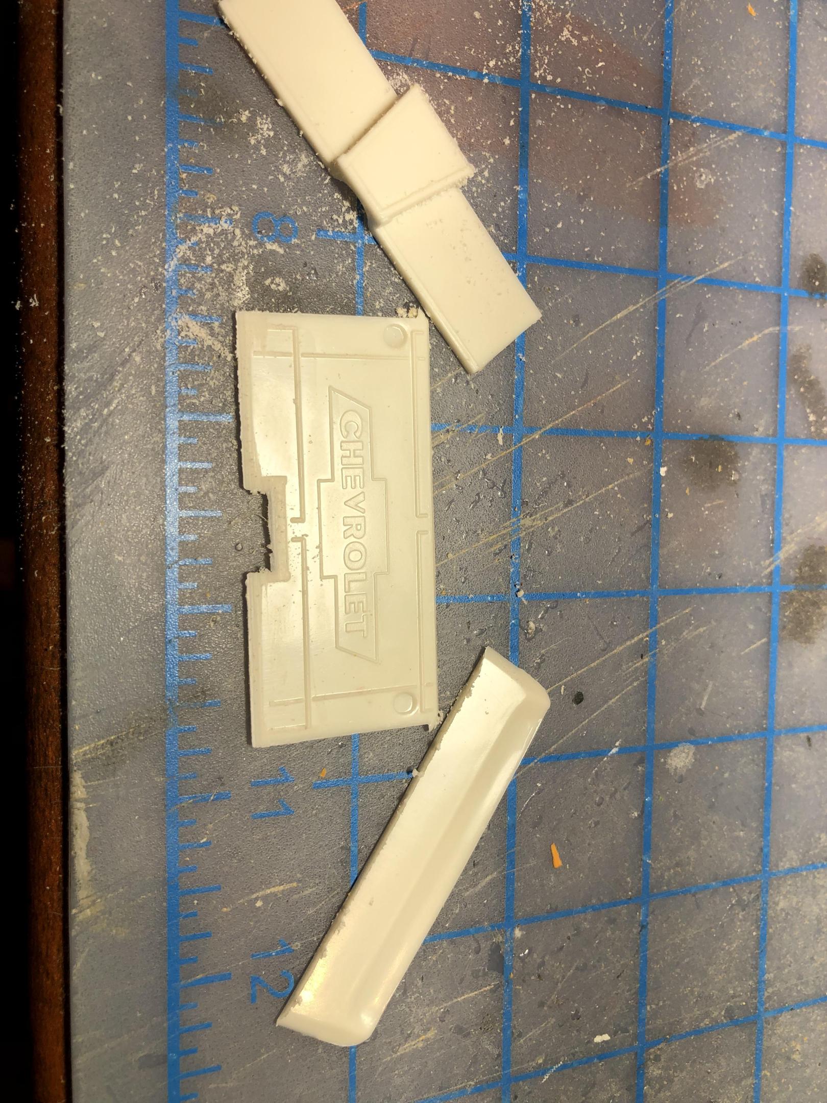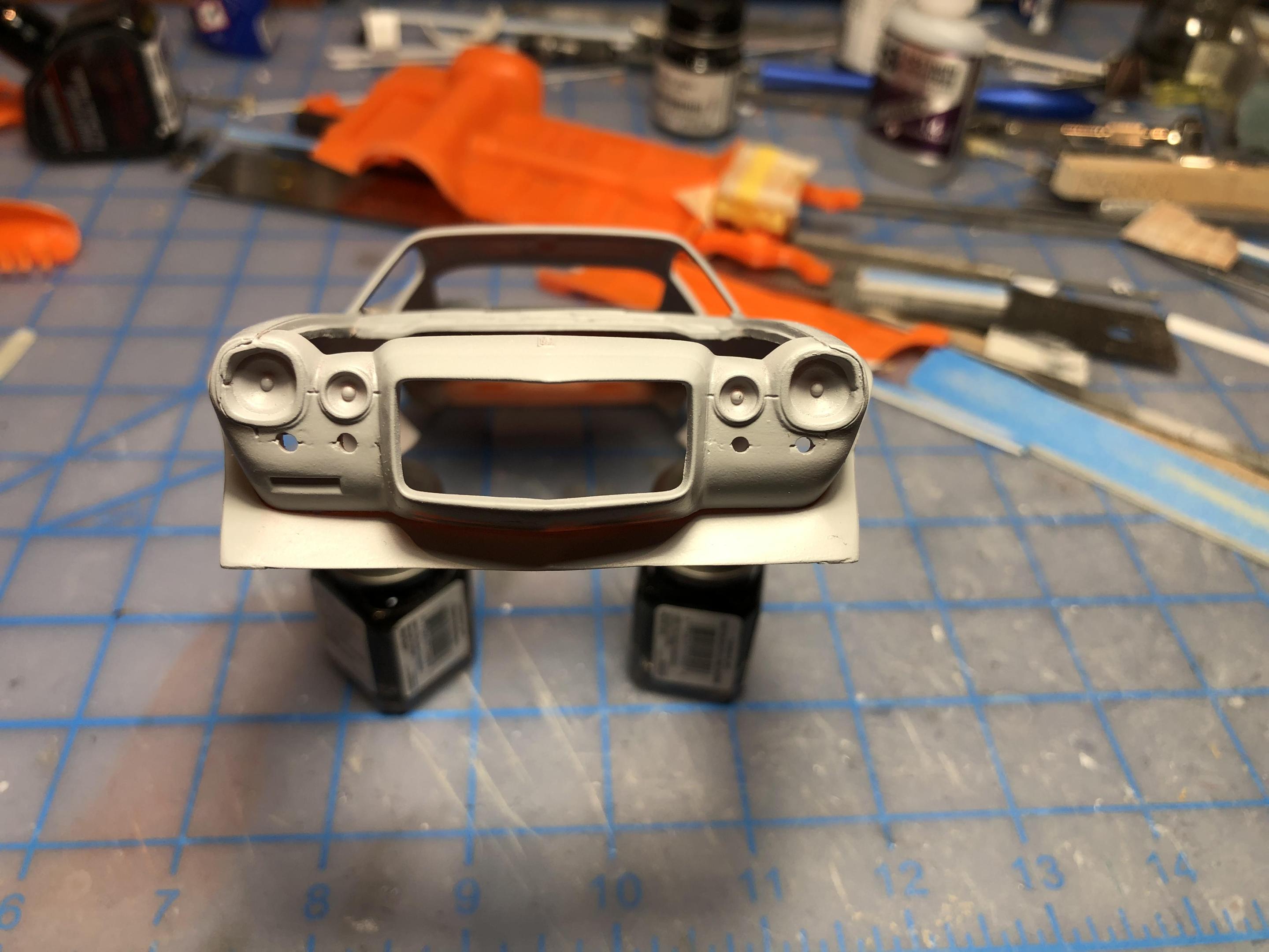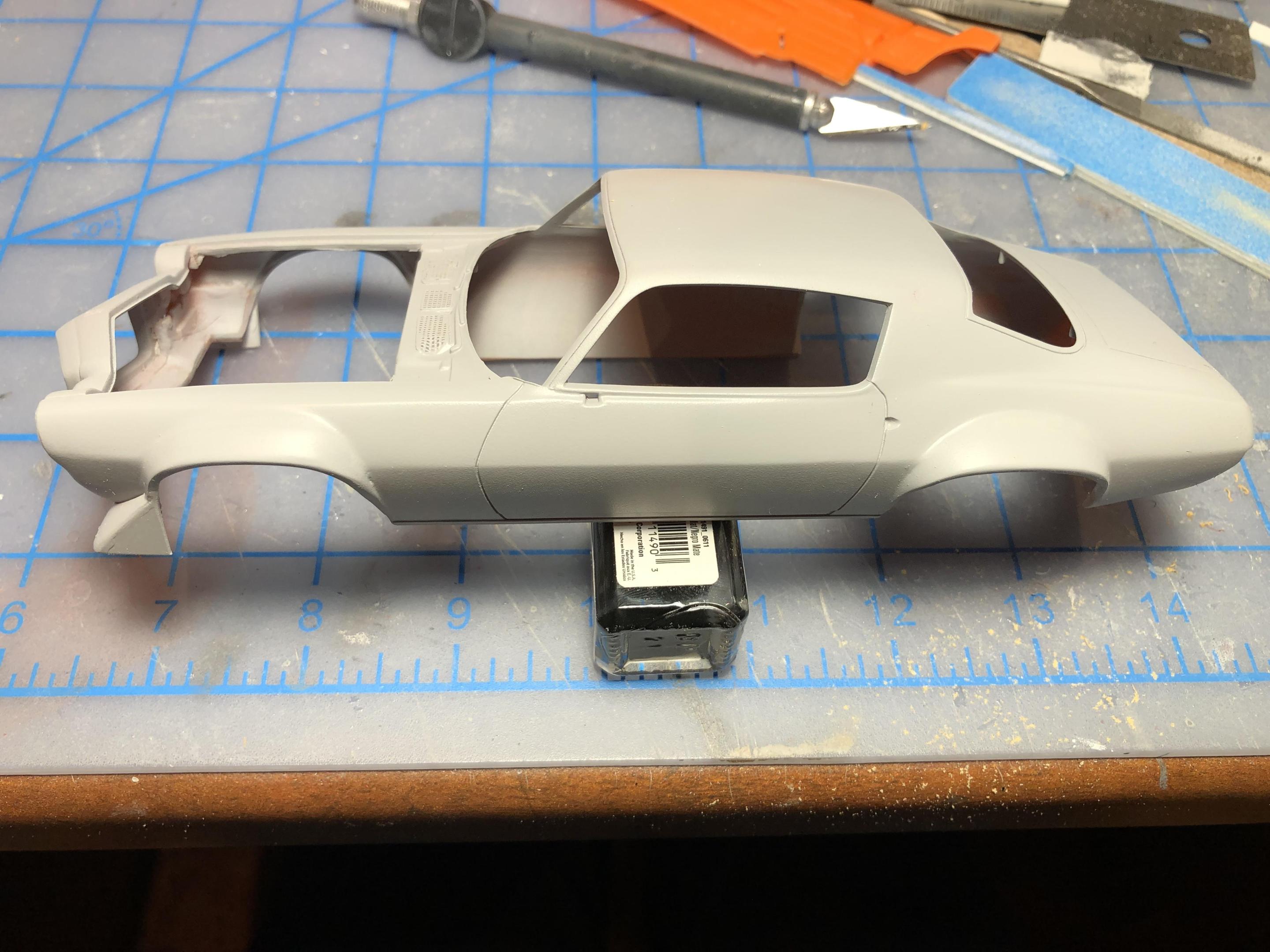 So, with the bodywork getting “close”, I’m bouncing around a bit with various other parts. One of the last pieces of bodywork is the splitter. I haven’t built the splitter yet, but here’s where I’m at. Traced the spoiler outline on tape and transferred that to styrene. I have since cut and shaped the leading edge. On the real car, they added returns the the corners of the spoiler First I added material to flatten the bottom of the spoiler, then added similar returns at the corners. I will still round the corners a bit, and do a bit more fine tuning on the shape at wheel wells, then add the splitter. As you can see, I managed to put off the work on the headlights, not looking forward to that. Started tinkering with the engine… I’m not a fan of molded in oil filters, so that has been cut free. I have a complete 3d printed LS3 with Edelbrock cross ram intake. However, to simplify one part of the build, I am going to use the block/trans from the kit, and the printed heads and intake. I’m sure it won’t be “technically” correct, but it saves some messing around. Besides, they fit like a glove! If you have seen my builds, you already know I like LOW. So… started planning the ride height. To achieve 1” of drop at the front I modified the front sub frame. Cut off the two blocks at the mounting point, thinned the trans crossmember, and notched the rear part of the frame. To keep things lined up, I added mounting pins in the existing locations. I pre-drilled small pilot holes in the old pins before removing so I had an accurate location for new ones. I will also lower it more at the spindles, haven’t got there yet. Sorry for the blurry photos before… after… The interior will get some reworking. To channel the body over the frame the inner door panels need about 2” removed from the bottom. First I cut off the “L” shape where they mount. Then cut off and reshaped the lower edge of the door card. Quite a bit of grinding and sanding needed to be done where the panel meets the rear inner fender. The end result, you can see the amount removed compared to the rear package shelf. The next job will be fitting this where the rear seats are/were. No back seat drivers in this one! You may have noticed that I removed the factory dash face. I have some aftermarket items to use there. That will be down the road a bit… Thats it for now fellas, more soon.