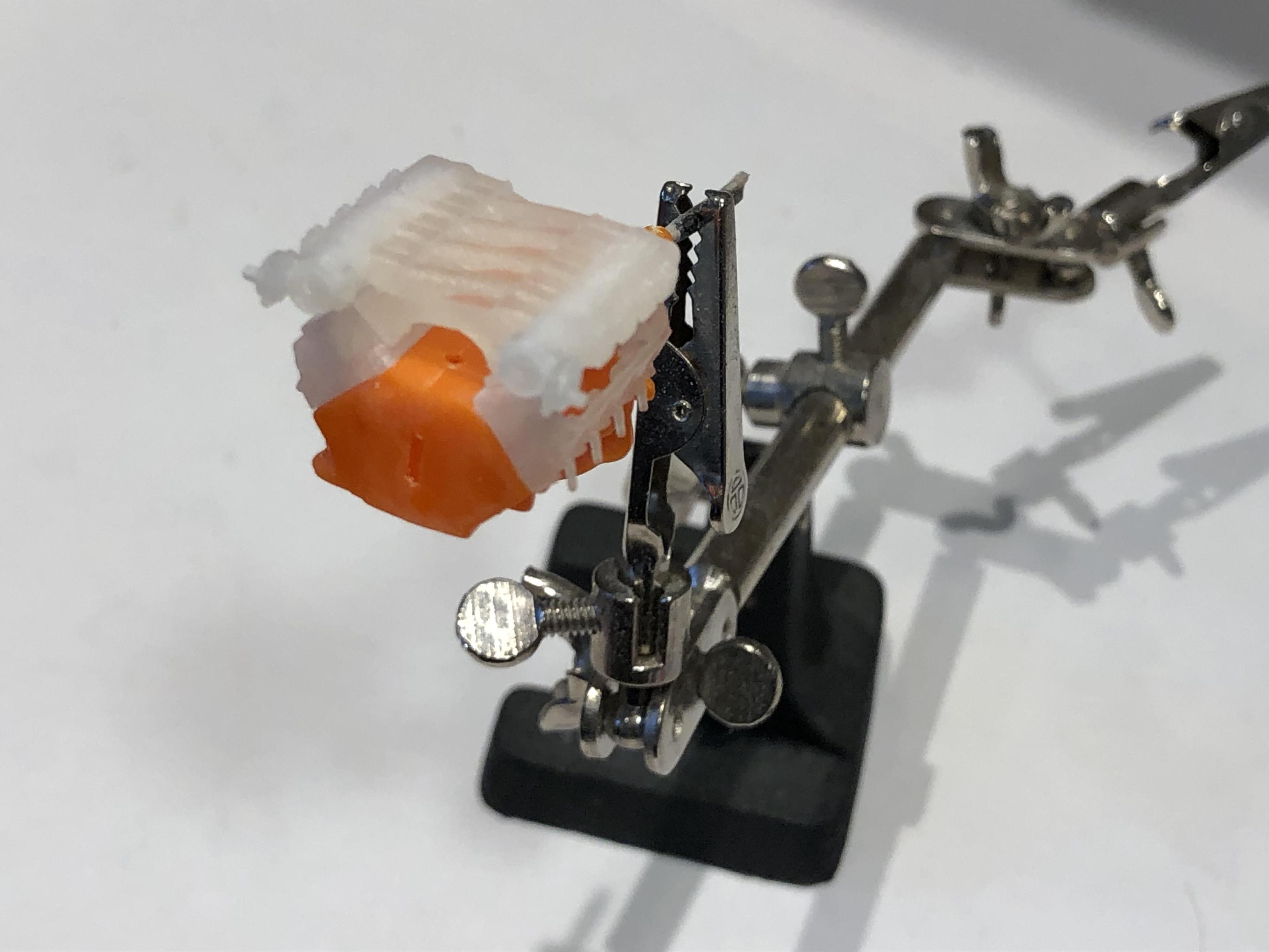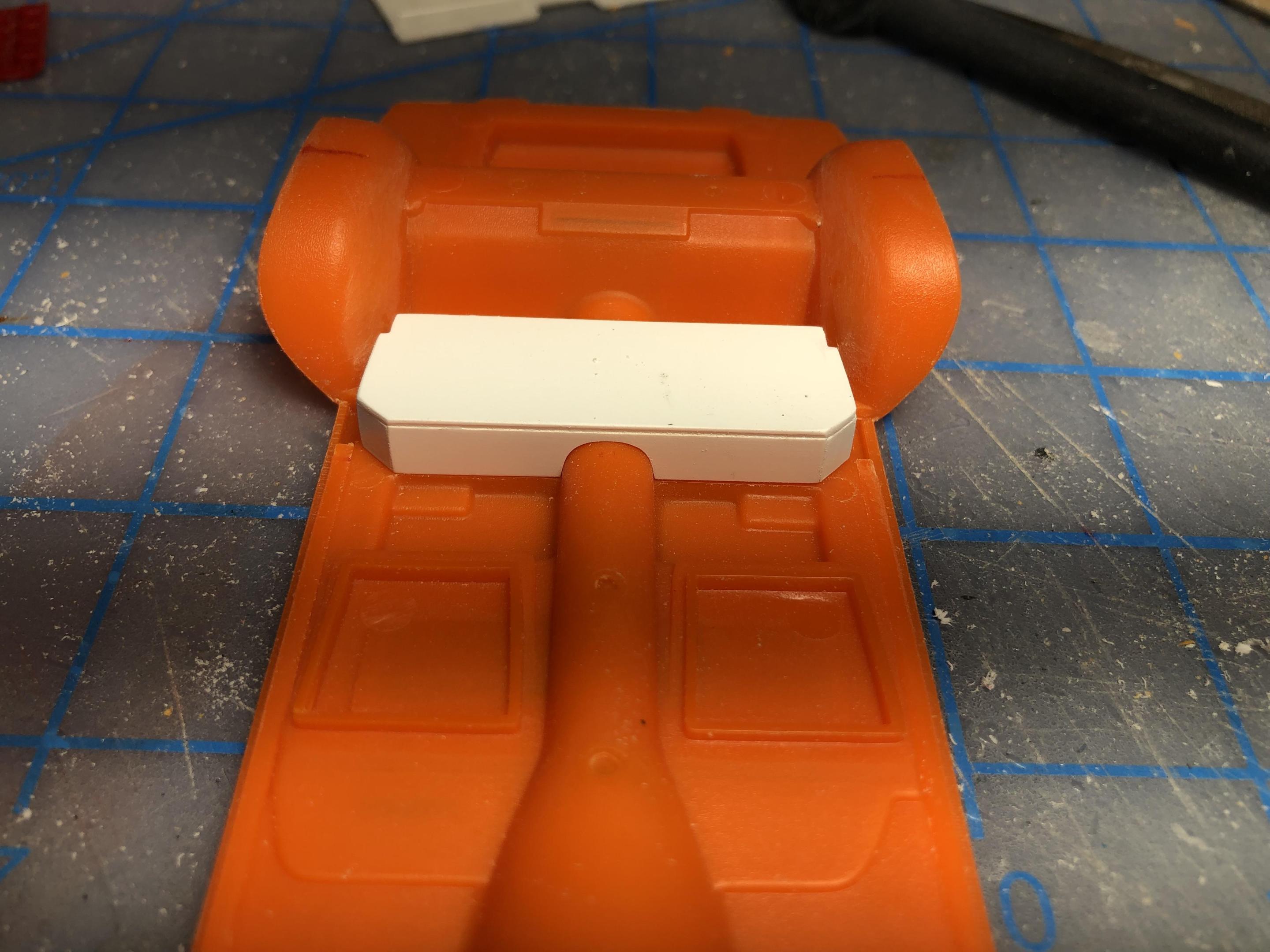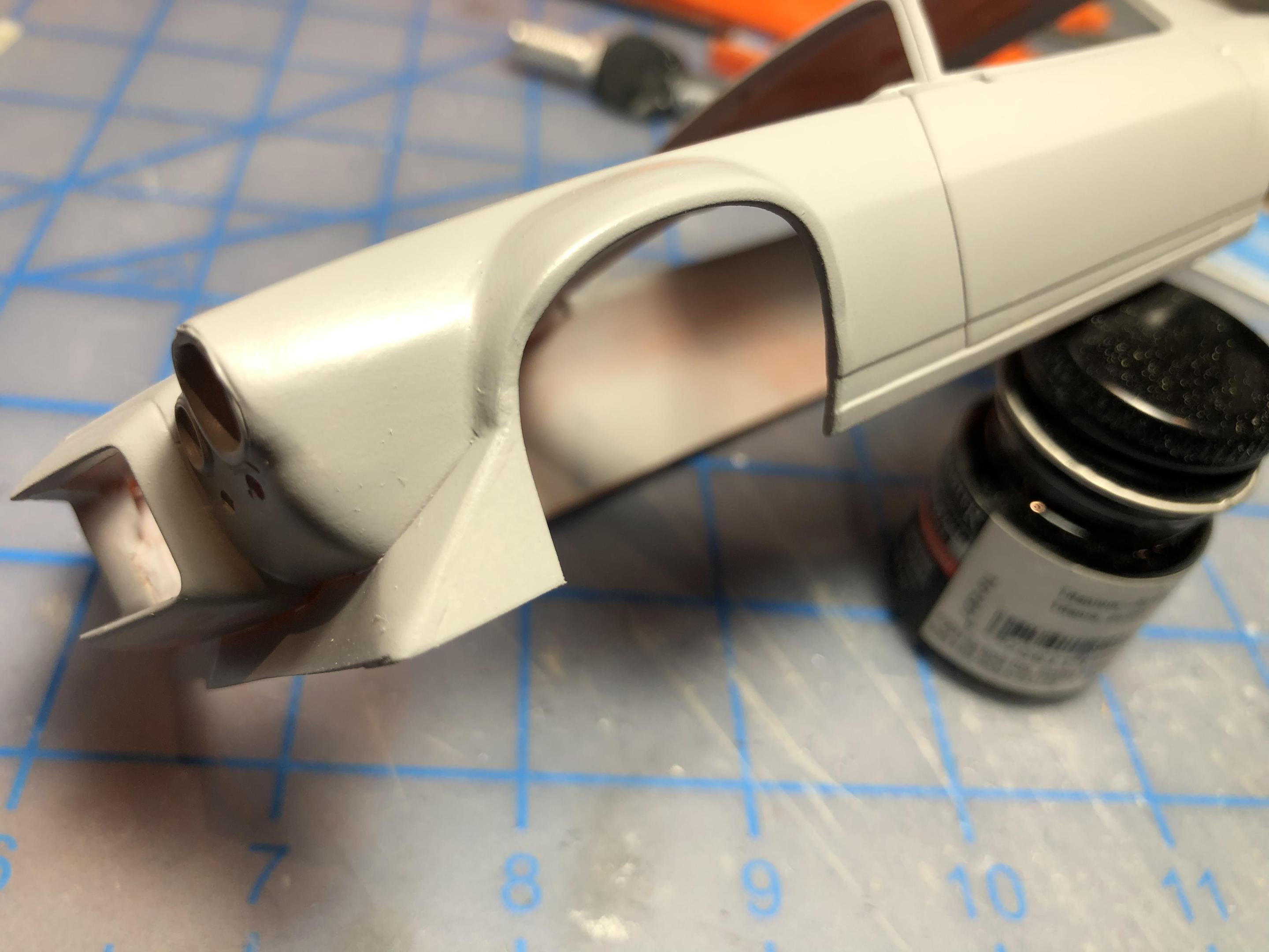 So, with the bodywork getting “close”, I’m bouncing around a bit with various other parts. One of the last pieces of bodywork is the splitter. I haven’t built the splitter yet, but here’s where I’m at. Traced the spoiler outline on tape and transferred that to styrene. I have since cut and shaped the leading edge. On the real car, they added returns the the corners of the spoiler First I added material to flatten the bottom of the spoiler, then added similar returns at the corners. I will still round the corners a bit, and do a bit more fine tuning on the shape at wheel wells, then add the splitter. As you can see, I managed to put off the work on the headlights, not looking forward to that. Started tinkering with the engine… I’m not a fan of molded in oil filters, so that has been cut free. I have a complete 3d printed LS3 with Edelbrock cross ram intake. However, to simplify one part of the build, I am going to use the block/trans from the kit, and the printed heads and intake. I’m sure it won’t be “technically” correct, but it saves some messing around. Besides, they fit like a glove! If you have seen my builds, you already know I like LOW. So… started planning the ride height. To achieve 1” of drop at the front I modified the front sub frame. Cut off the two blocks at the mounting point, thinned the trans crossmember, and notched the rear part of the frame. To keep things lined up, I added mounting pins in the existing locations. I pre-drilled small pilot holes in the old pins before removing so I had an accurate location for new ones. I will also lower it more at the spindles, haven’t got there yet. Sorry for the blurry photos before… after… The interior will get some reworking. To channel the body over the frame the inner door panels need about 2” removed from the bottom. First I cut off the “L” shape where they mount. Then cut off and reshaped the lower edge of the door card. Quite a bit of grinding and sanding needed to be done where the panel meets the rear inner fender. The end result, you can see the amount removed compared to the rear package shelf. The next job will be fitting this where the rear seats are/were. No back seat drivers in this one! You may have noticed that I removed the factory dash face. I have some aftermarket items to use there. That will be down the road a bit… Thats it for now fellas, more soon.