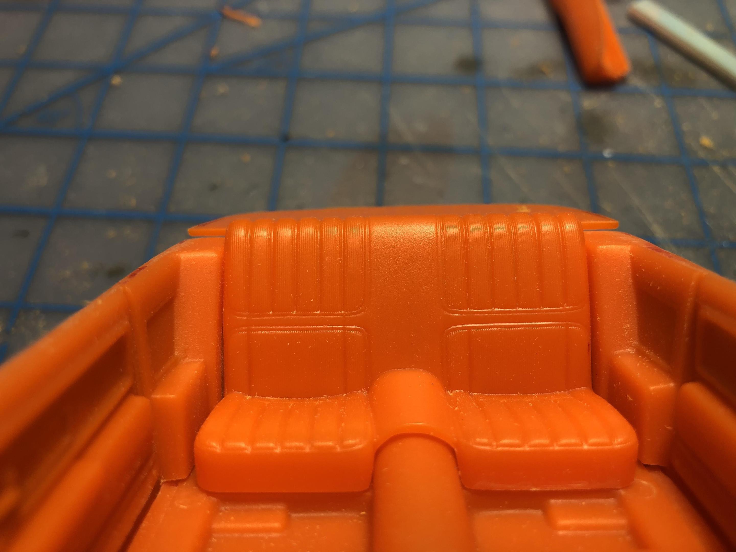 On to the rear of the interior, here’s the rabbit hole I went down… Here’s how I got there. First I cut apart the New replacement piece, and made a raised “bench” to replace the seat bottom. Next up, a hole for a subwoofer, add the back and re-attach the kit package tray. The sub is from a diecast car, it will get stripped and painted. Next photo shows that package shelf is now at the correct height. Seats that I will use mocked up. Thats it for now