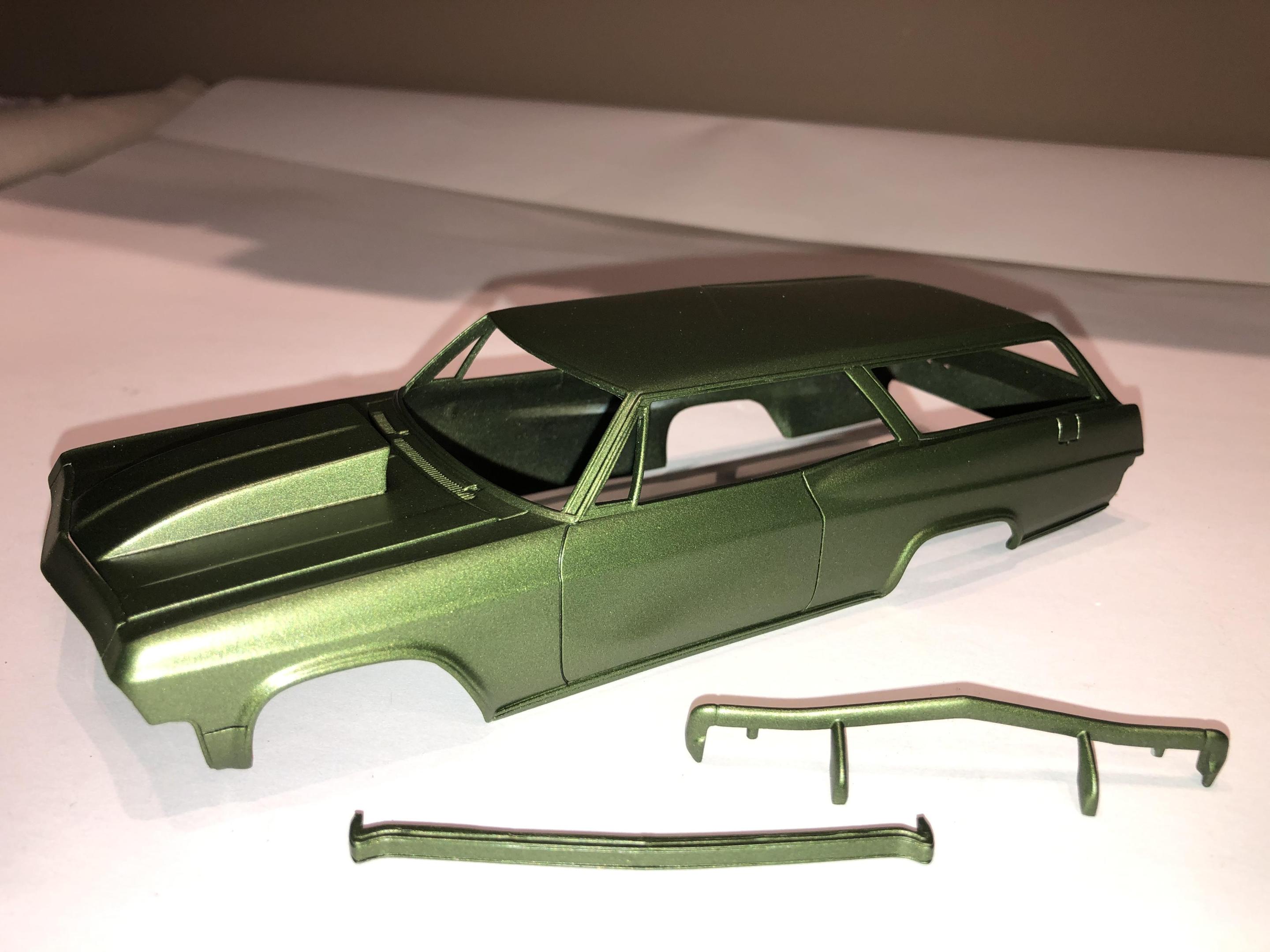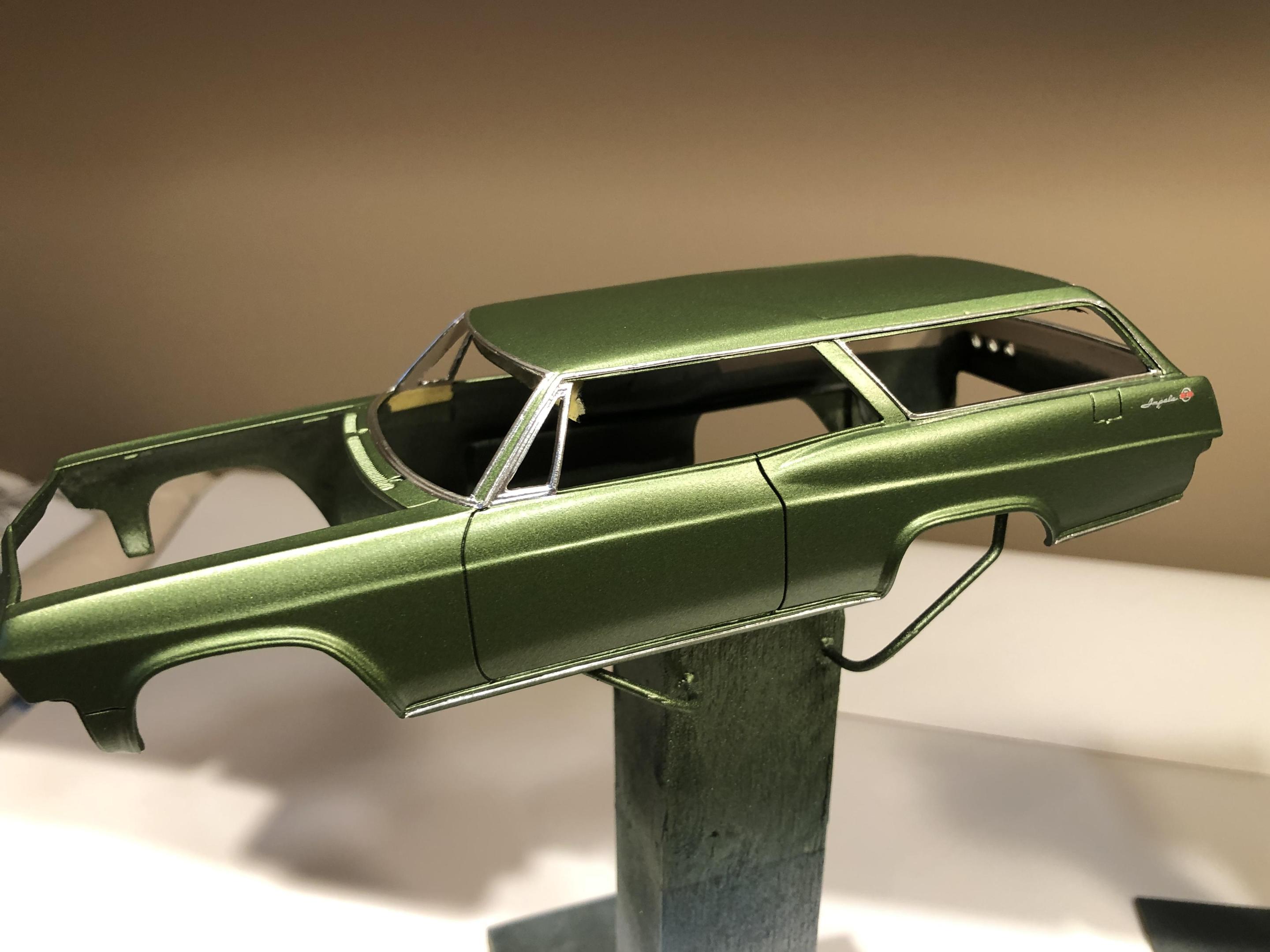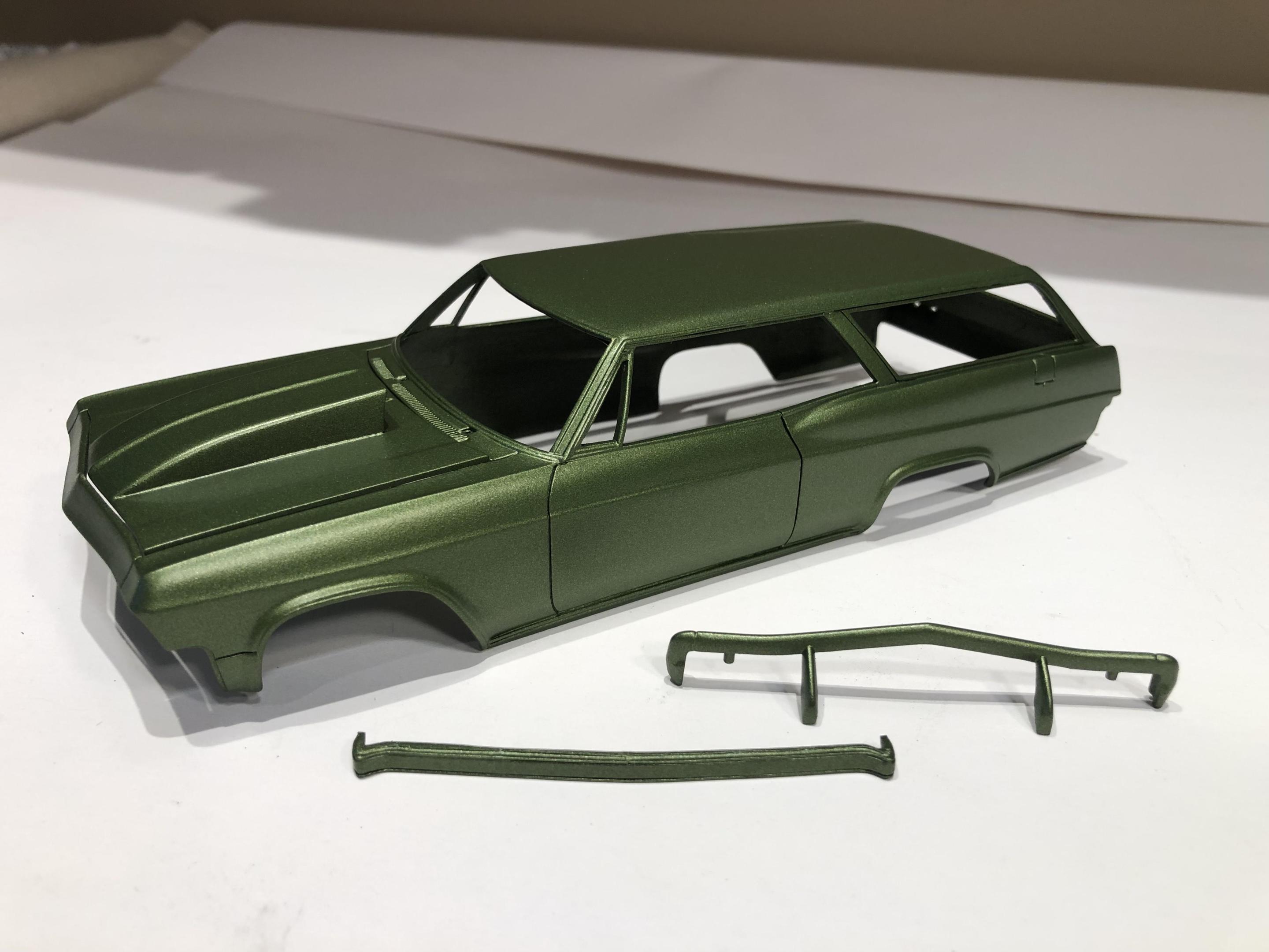 Well, finally a bit of progress on the wagon… she’s green !!!!!! First photo without flash, second one with flash. The paint already has some depth, Clear should really give some nice depth. I’m very happy with the colour choice, hope you guys like it too. Going to let paint cure overnight, hoping to start foiling etc. tomorrow. My goal is to have it cleared, polished and ready for final assembly by end of this week. Weather has turned, work has slowed down, so more bench time ahead!! Thanks for having a look. Cheers, Steve