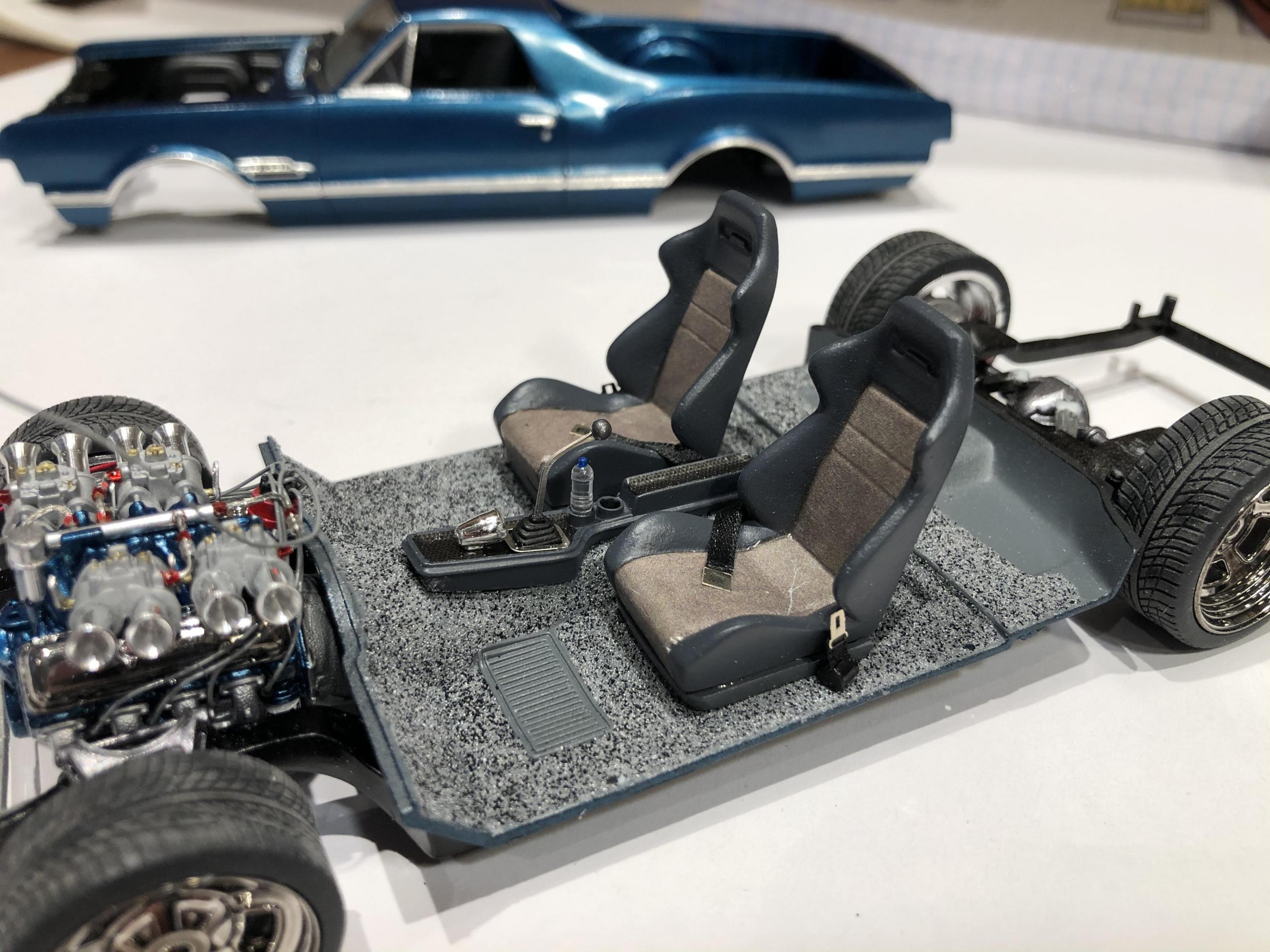 Small update, I added the seat belts, used a small and slightly re-shaped piece of styrene rod with a slot to accept the belt. The interior door panels , dash, sub-woofer, and glass are now installed. I added a hood prop, as previously mentioned, I realize it is not factory correct but it will keep the hood open to show underhood details. I received the parts I was waiting for this afternoon, so full speed ahead. Cheers, Steve