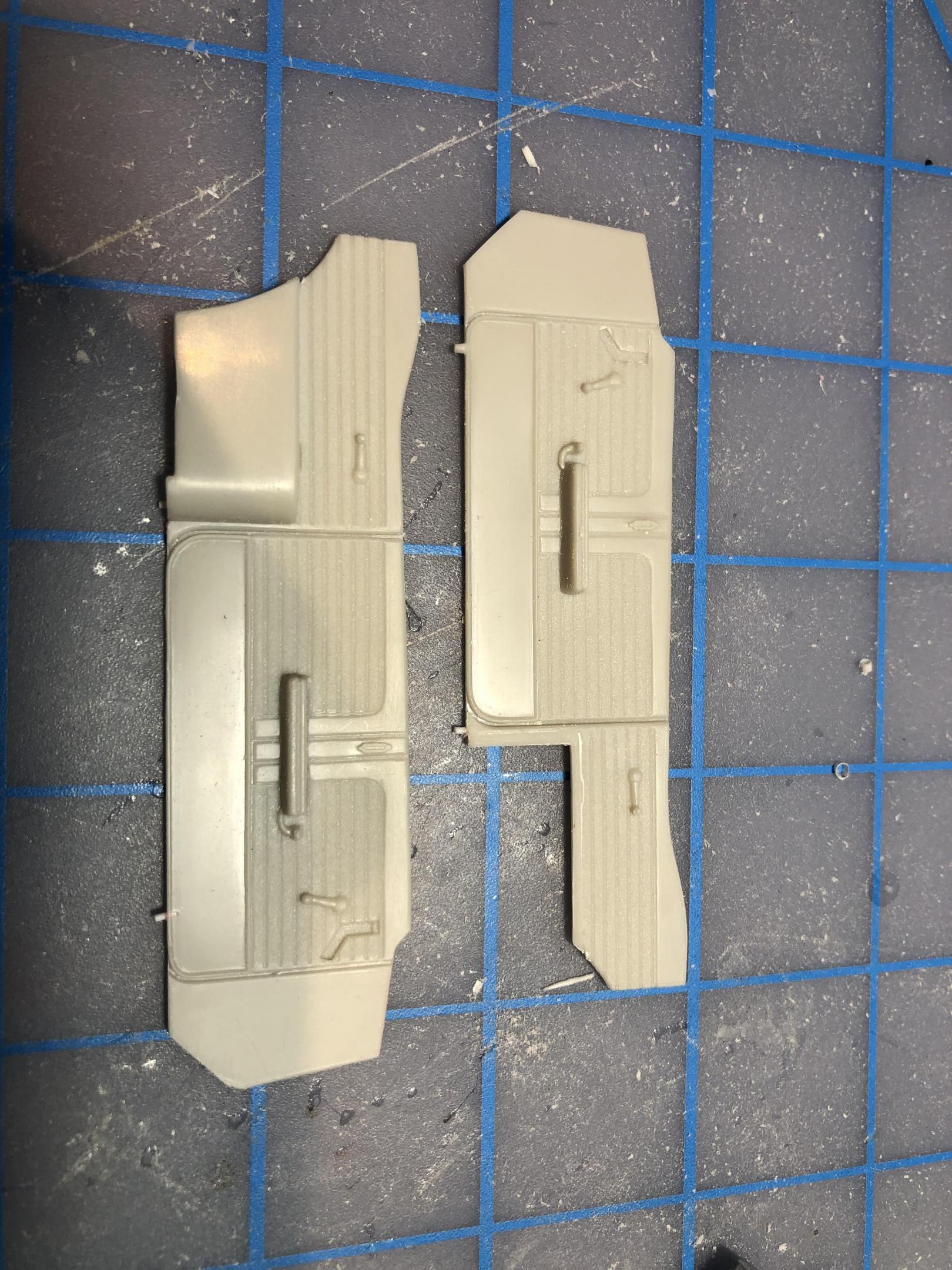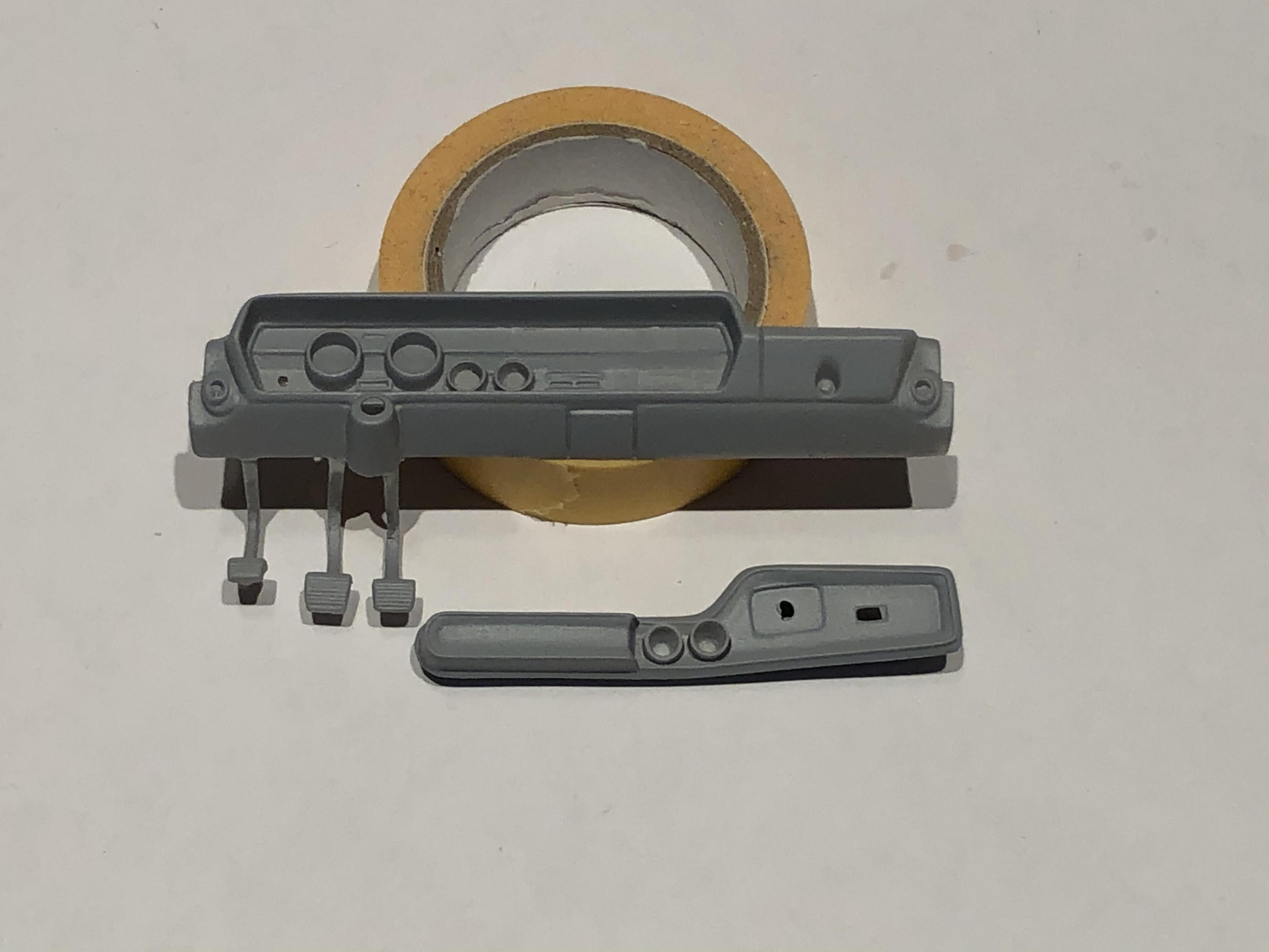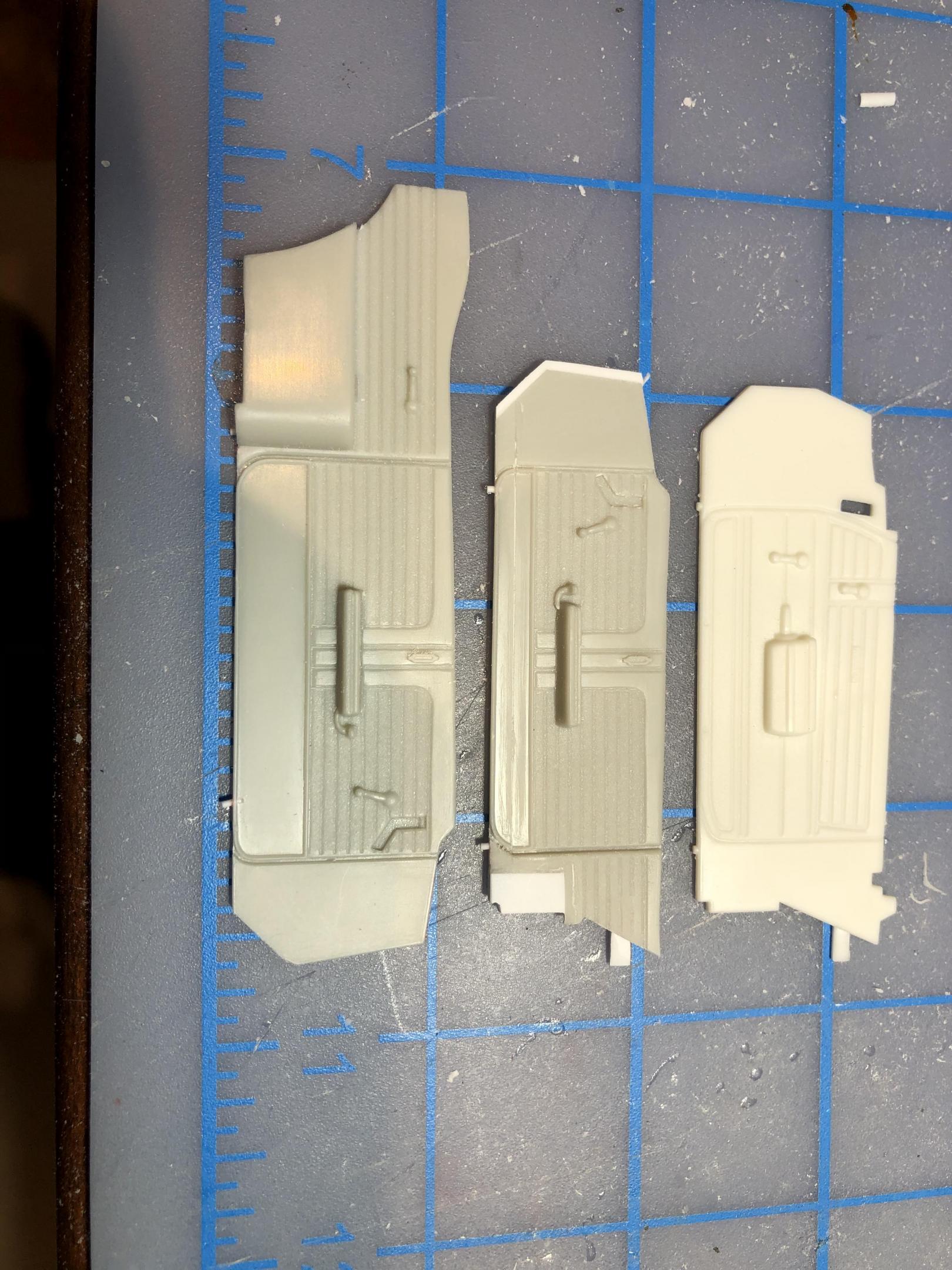 A bit more desk time this afternoon. Door panels are complete, and resin seats modified. I removed the bottom of the ‘68 Elky seats, those will get glued to bottom of resin seats to give them a bit more height. I was considering using the black leather (from a wallet) as an insert for the middle of the seats, but after playing with it for a bit, it just didn’t look right. I have some leather decals, I may use those...