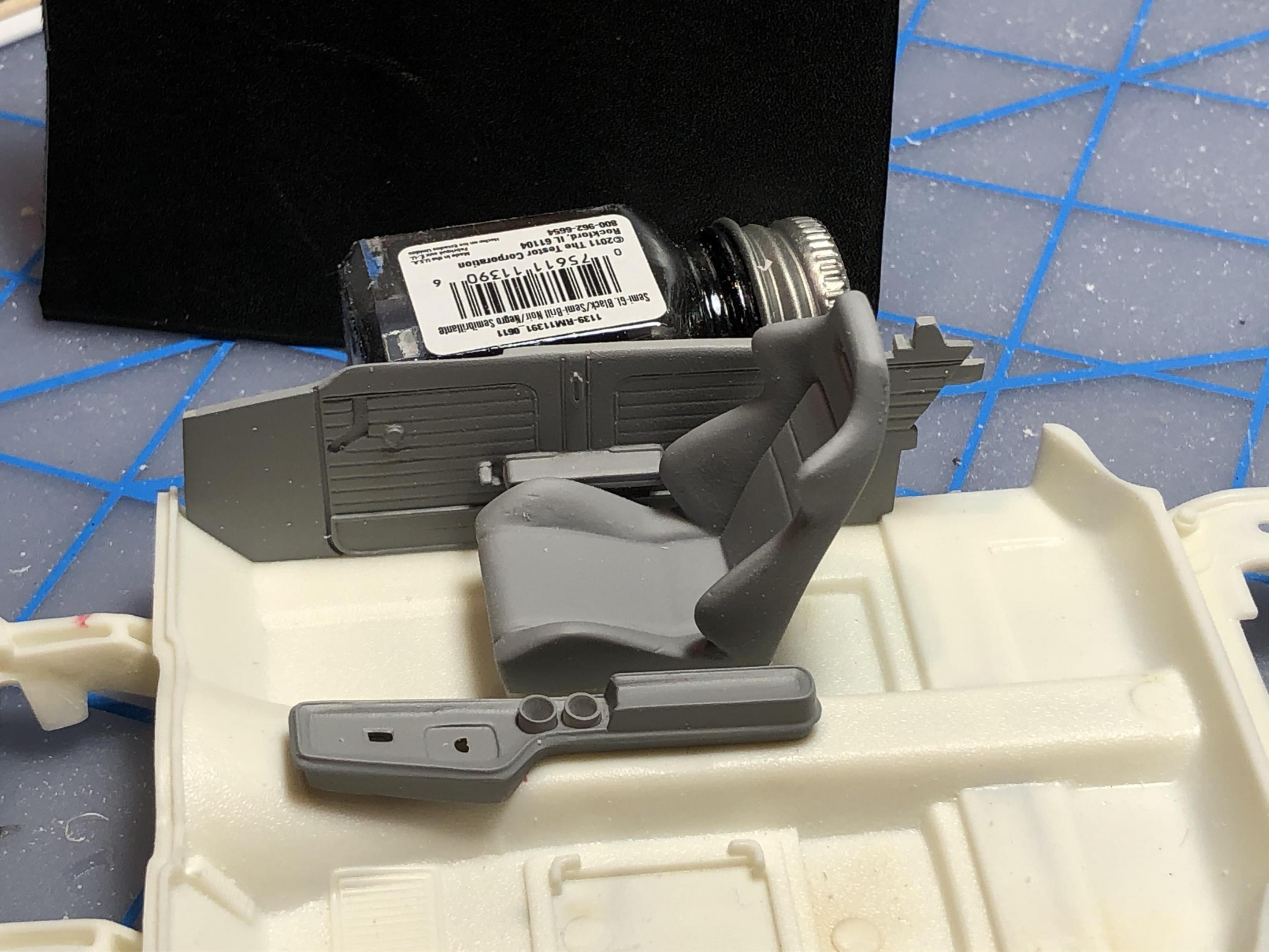 6. A bit more desk time this afternoon. Door panels are complete, and resin seats modified. I removed the bottom of the ‘68 Elky seats, those will get glued to bottom of resin seats to give them a bit more height. I was considering using the black leather (from a wallet) as an insert for the middle of the seats, but after playing with it for a bit, it just didn’t look right. I have some leather decals, I may use those...